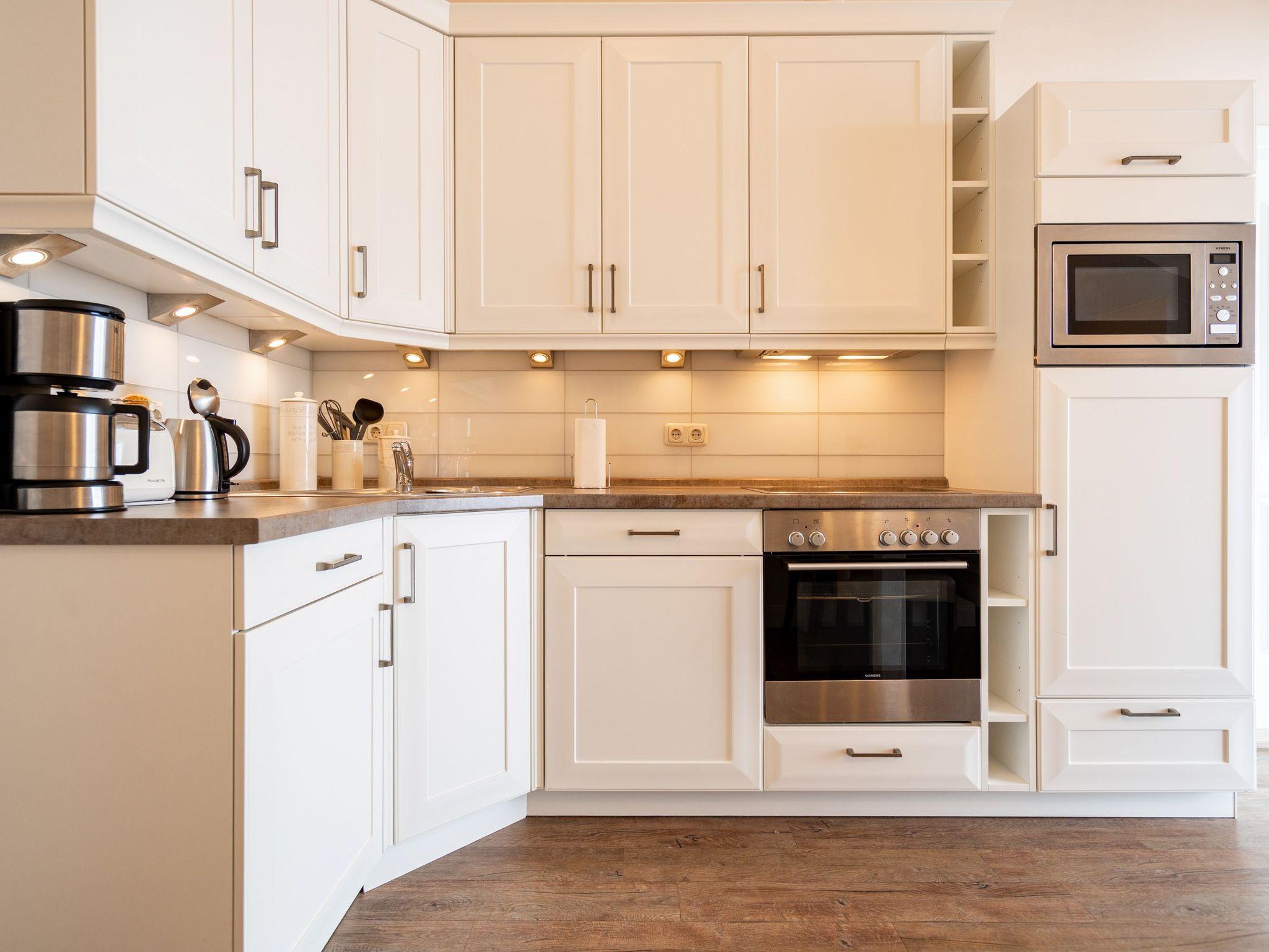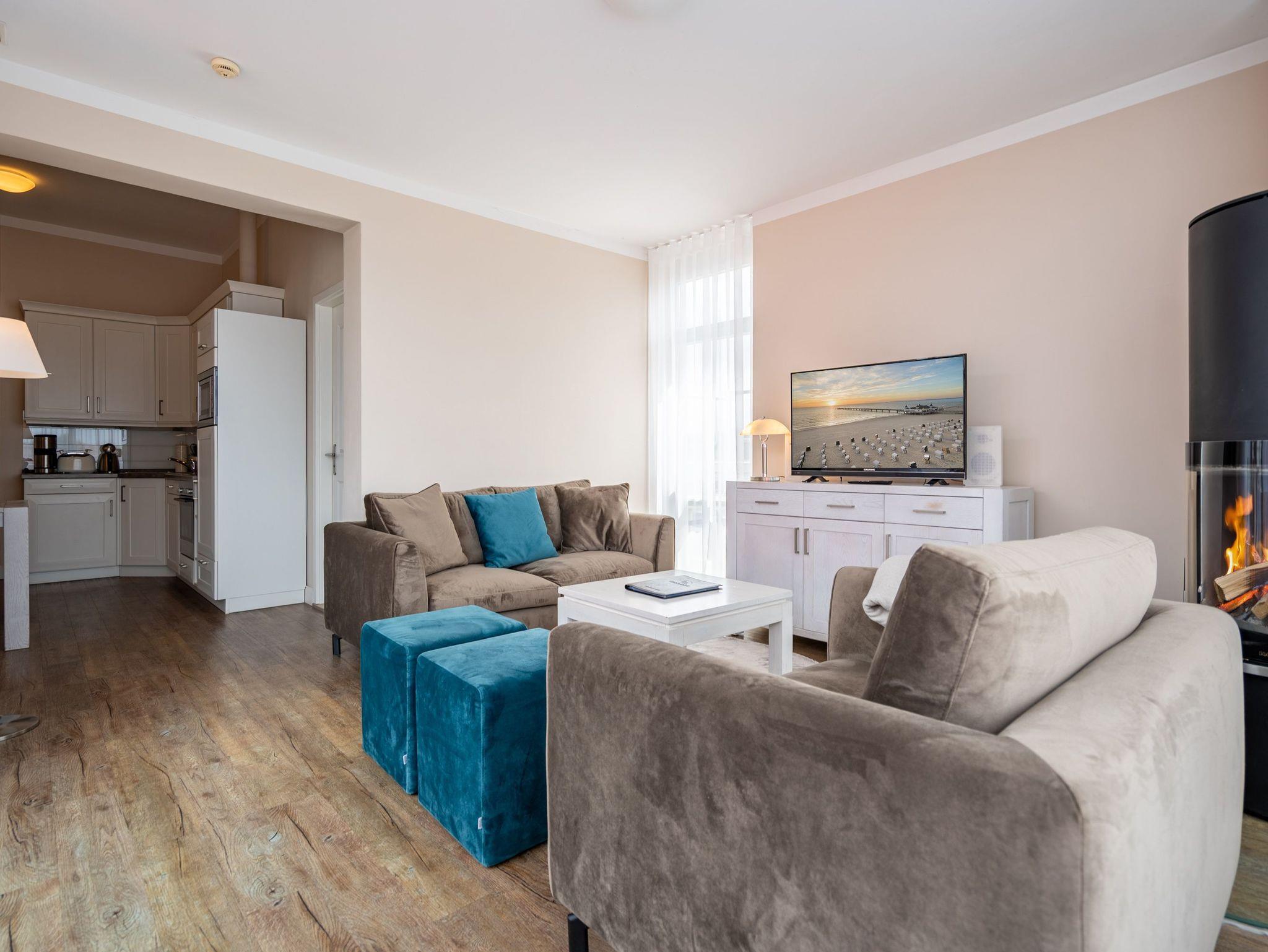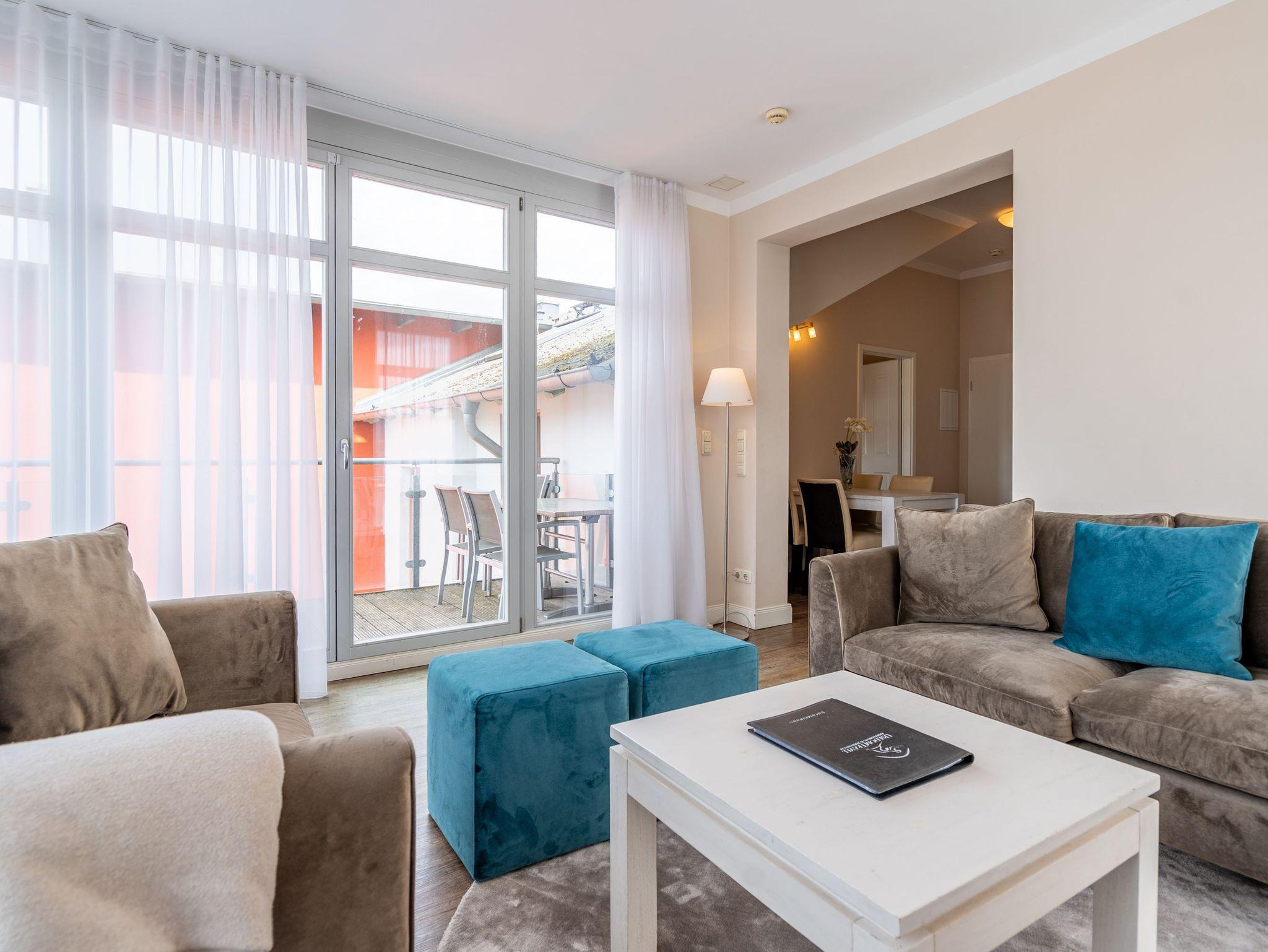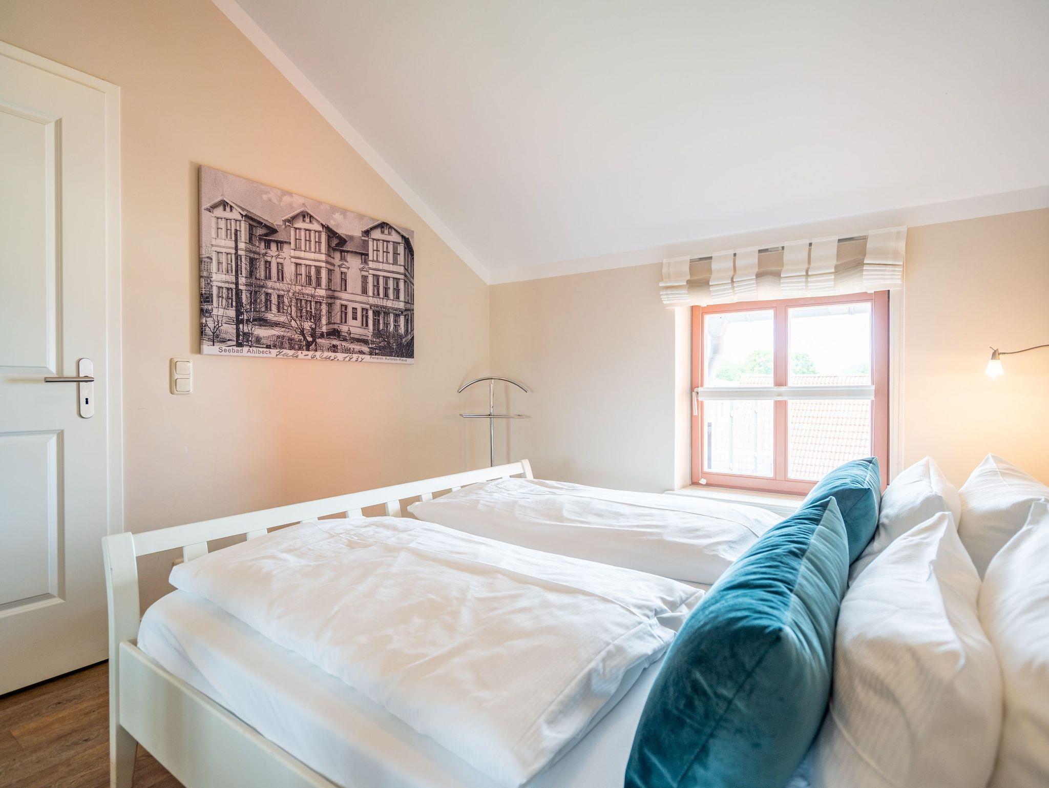 Moderner Landhausstil, stilvolle Dekorationen und ein lichtdurchfluteter Wohnbereich - herzlich Willkommen in der Ferienwohnung 13 des Autorenhauses. Hier werden Sie sich von Beginn an, wie zu Hause fühlen. Im Wohnbereich relaxt man vor dem Kamin, von hier hat man Zugang zum umlaufenden, großzügigen Balkon, der ab mittags Sonne verspricht. Das Schlafzimmer ist mit einem Doppelbett (1,80m x 2m) eingerichtet und bietet Platz für 2 Erwachsene und 1 Kleinkind (bis 3 Jahre) im Reisebett. Und die integrierte Küche ist komplett ausgestattet. Ergänzt wird die Wohnung durch ein modernes Bad mit Dusche. Auf Wunsch stellen wir für unsere kleinen Gäste ein Kinderreisebett (ohne zusätzliche Matratze [&] Bettzeug) und einen Kinderhochstuhl ( gegen einen Aufpreis) zur Verfügung. Für Ihren Komfort sind die Betten bei der Anreise bezogen und Handtücher liegen bereit. Im Keller des Hauses stehen eine Waschmaschine und ein Trockner gegen Gebühr zur Verfügung. Bei diesem Appartement besteht die Möglichkeit es mit dem Nachbarappartement 14 zu kombinieren. Durch einen gemeinsam nutzbaren Vorflur entsteht auf Wunsch aus beiden Wohnungen ein großes Urlaubsdomizil mit 2 Schlafzimmern.