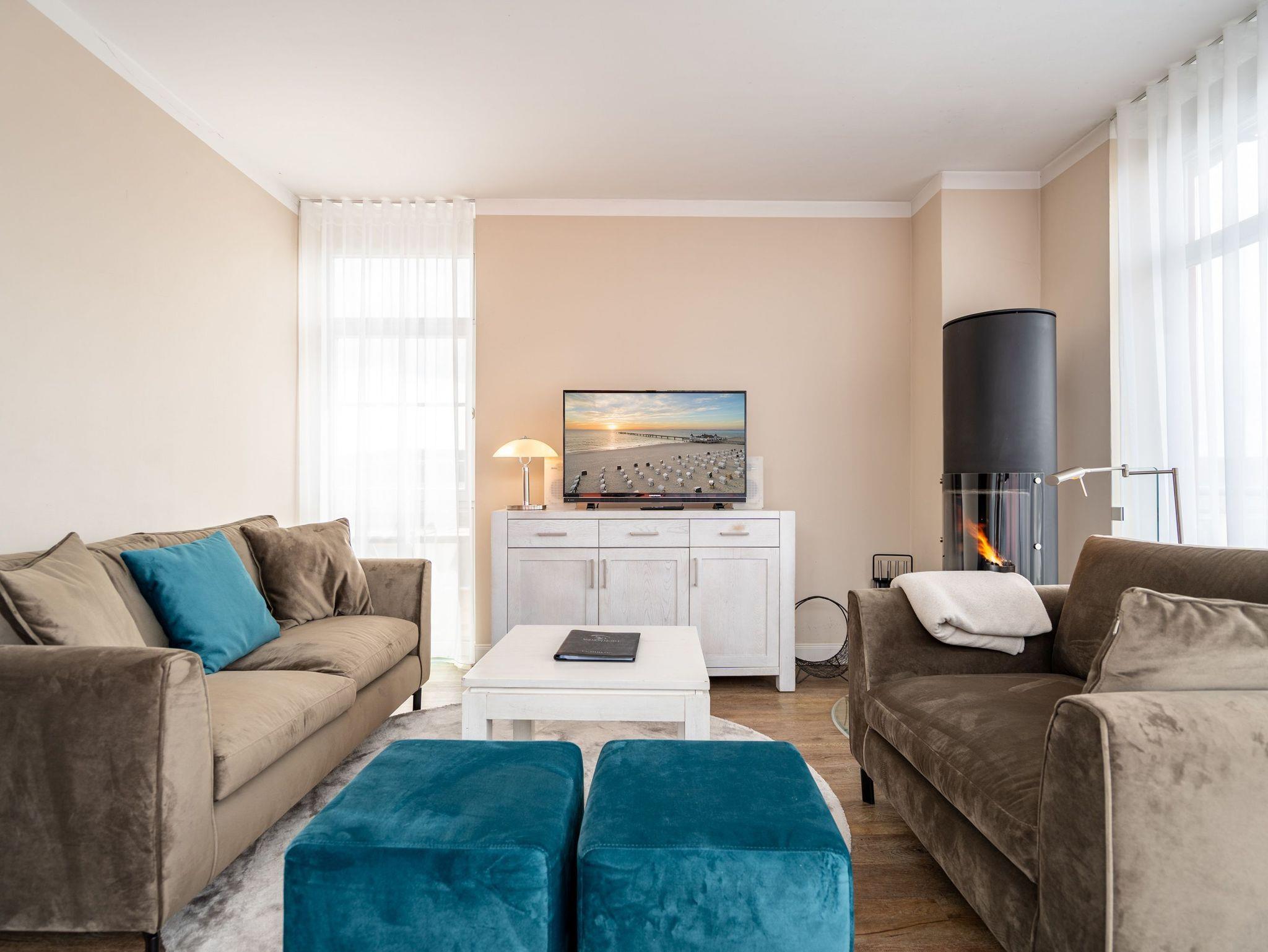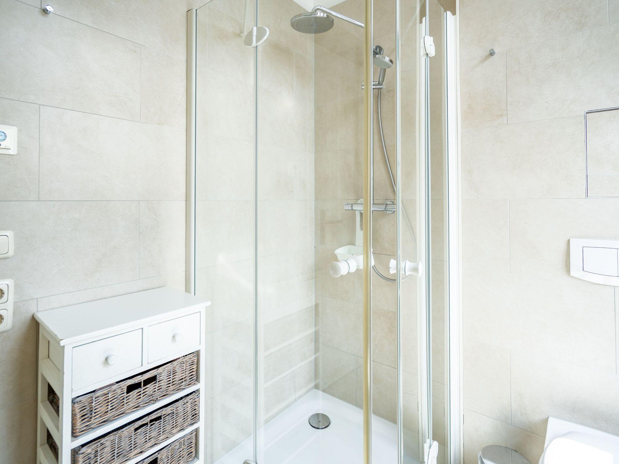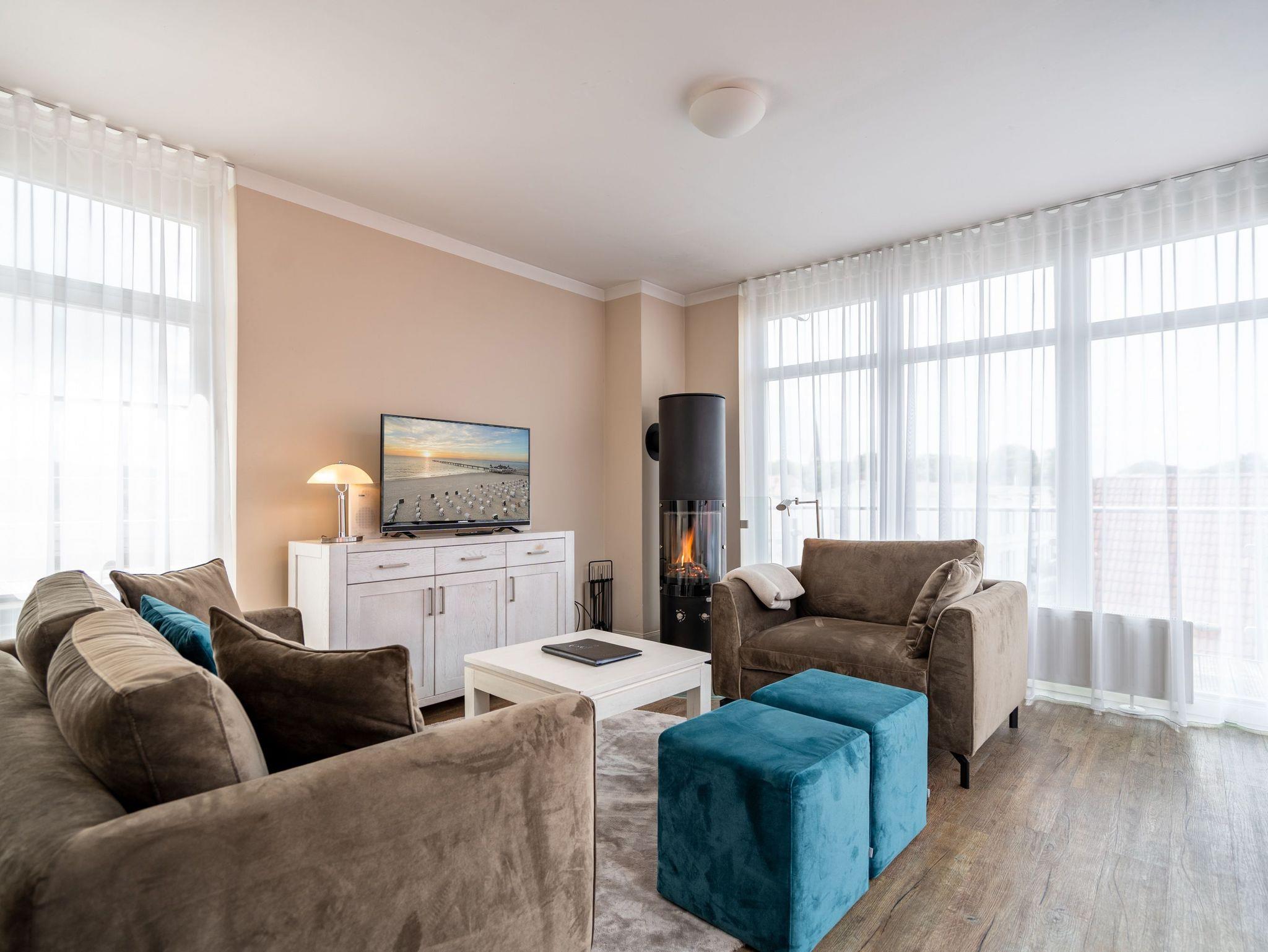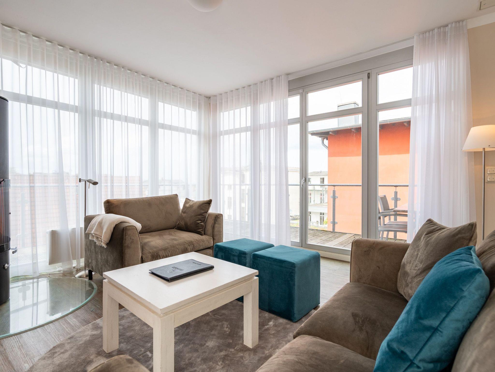 Moderner Landhausstil, stilvolle Dekorationen und ein lichtdurchfluteter Wohnbereich - herzlich Willkommen in der Ferienwohnung 13 des Autorenhauses. Hier werden Sie sich von Beginn an, wie zu Hause fühlen. Im Wohnbereich relaxt man vor dem Kamin, von hier hat man Zugang zum umlaufenden, großzügigen Balkon, der ab mittags Sonne verspricht. Das Schlafzimmer ist mit einem Doppelbett (1,80m x 2m) eingerichtet und bietet Platz für 2 Erwachsene und 1 Kleinkind (bis 3 Jahre) im Reisebett. Und die integrierte Küche ist komplett ausgestattet. Ergänzt wird die Wohnung durch ein modernes Bad mit Dusche. Auf Wunsch stellen wir für unsere kleinen Gäste ein Kinderreisebett (ohne zusätzliche Matratze [&] Bettzeug) und einen Kinderhochstuhl ( gegen einen Aufpreis) zur Verfügung. Für Ihren Komfort sind die Betten bei der Anreise bezogen und Handtücher liegen bereit. Im Keller des Hauses stehen eine Waschmaschine und ein Trockner gegen Gebühr zur Verfügung. Bei diesem Appartement besteht die Möglichkeit es mit dem Nachbarappartement 14 zu kombinieren. Durch einen gemeinsam nutzbaren Vorflur entsteht auf Wunsch aus beiden Wohnungen ein großes Urlaubsdomizil mit 2 Schlafzimmern.