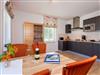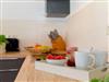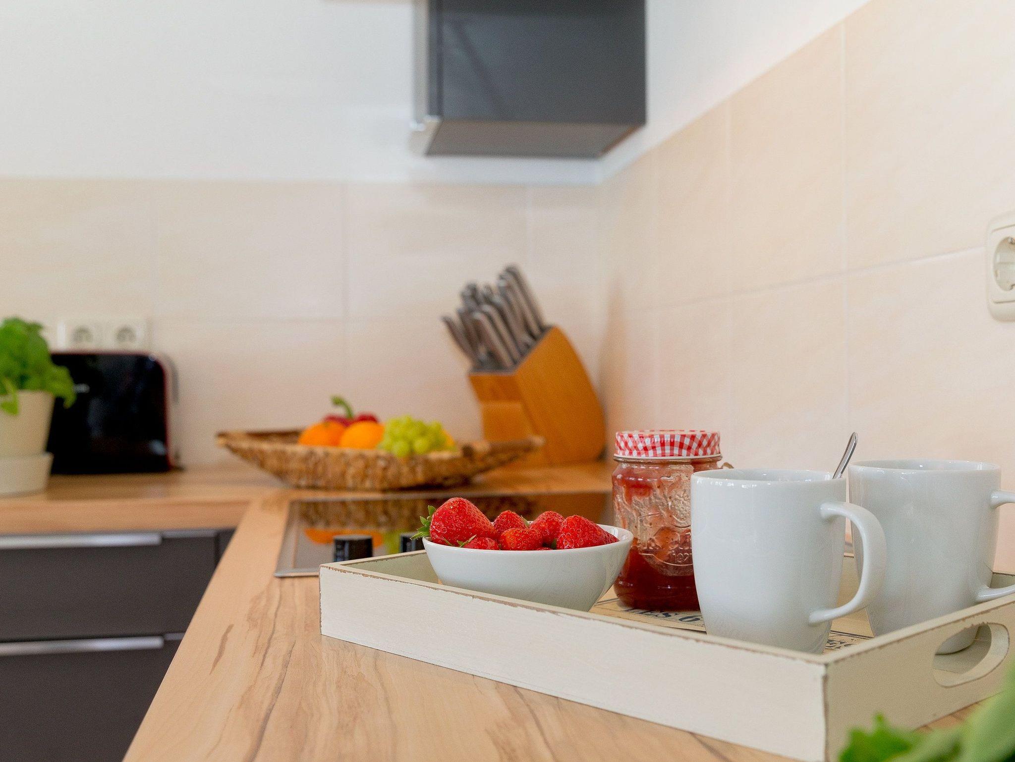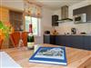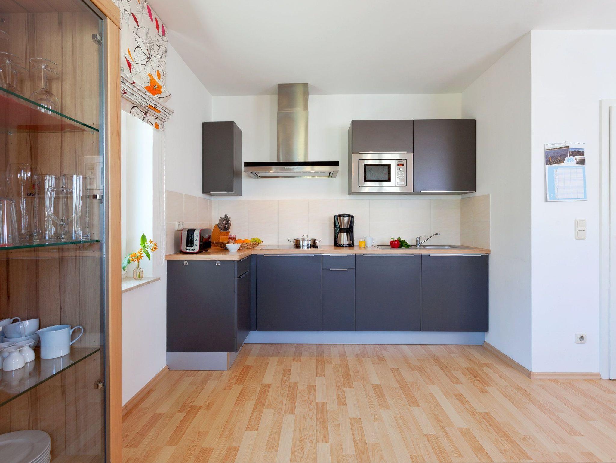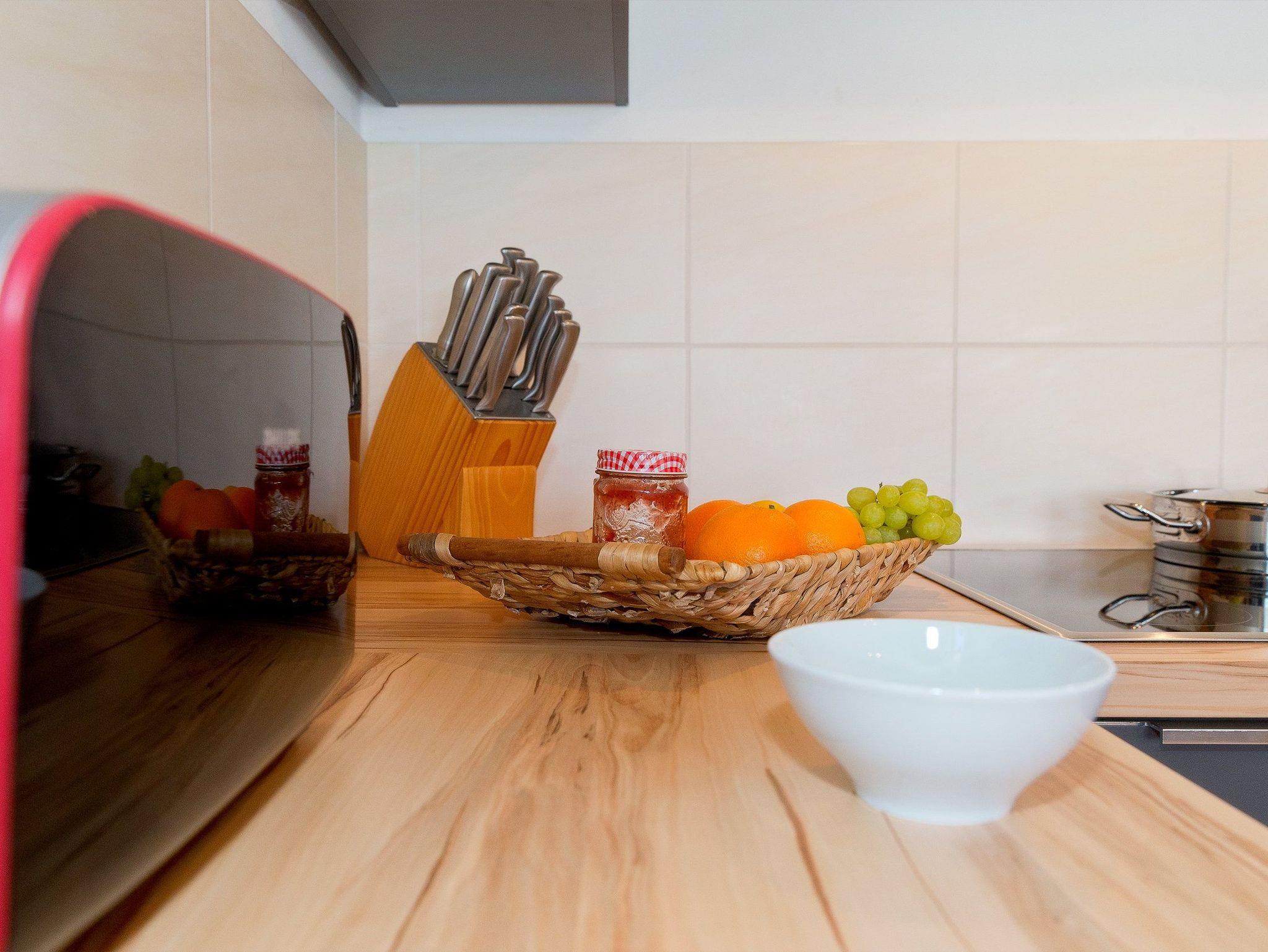 Die im Wohnbereich integrierte komplett ausgestattete Einbauküche verfügt zudem über Kühlschrank, Mikrowelle, Ceran-Kochfeld (4 Platten), Spülmaschine, Wasserkocher, Toaster, Kaffeemaschine (4er Filter), Messerblock. Das Schlafzimmer ist mit hochwertigen Boxspringbett (160 x 200 cm) mit Leselampe ausgestattet.