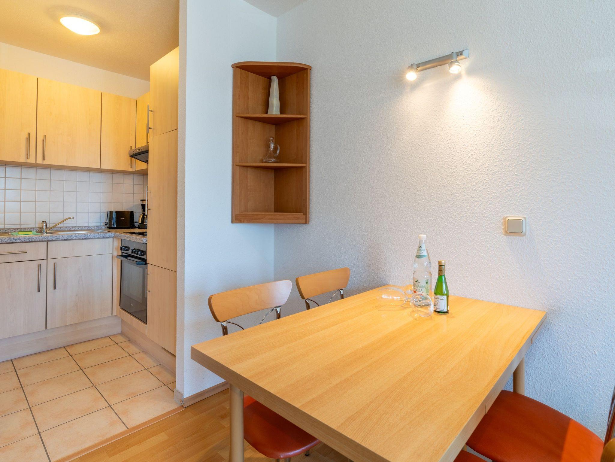 Die Küchenzeile ist mit im Wohnbereich integriert. Im lichtdurchfluteten Wohnzimmer befindet sich eine gemütliche Couchecke mit Flachbildfernseher und ein Esstisch. Das Appartement hat ein Bad mit einer Dusche. Kostenfreies WLAN und Parkplatz sind vorhanden.