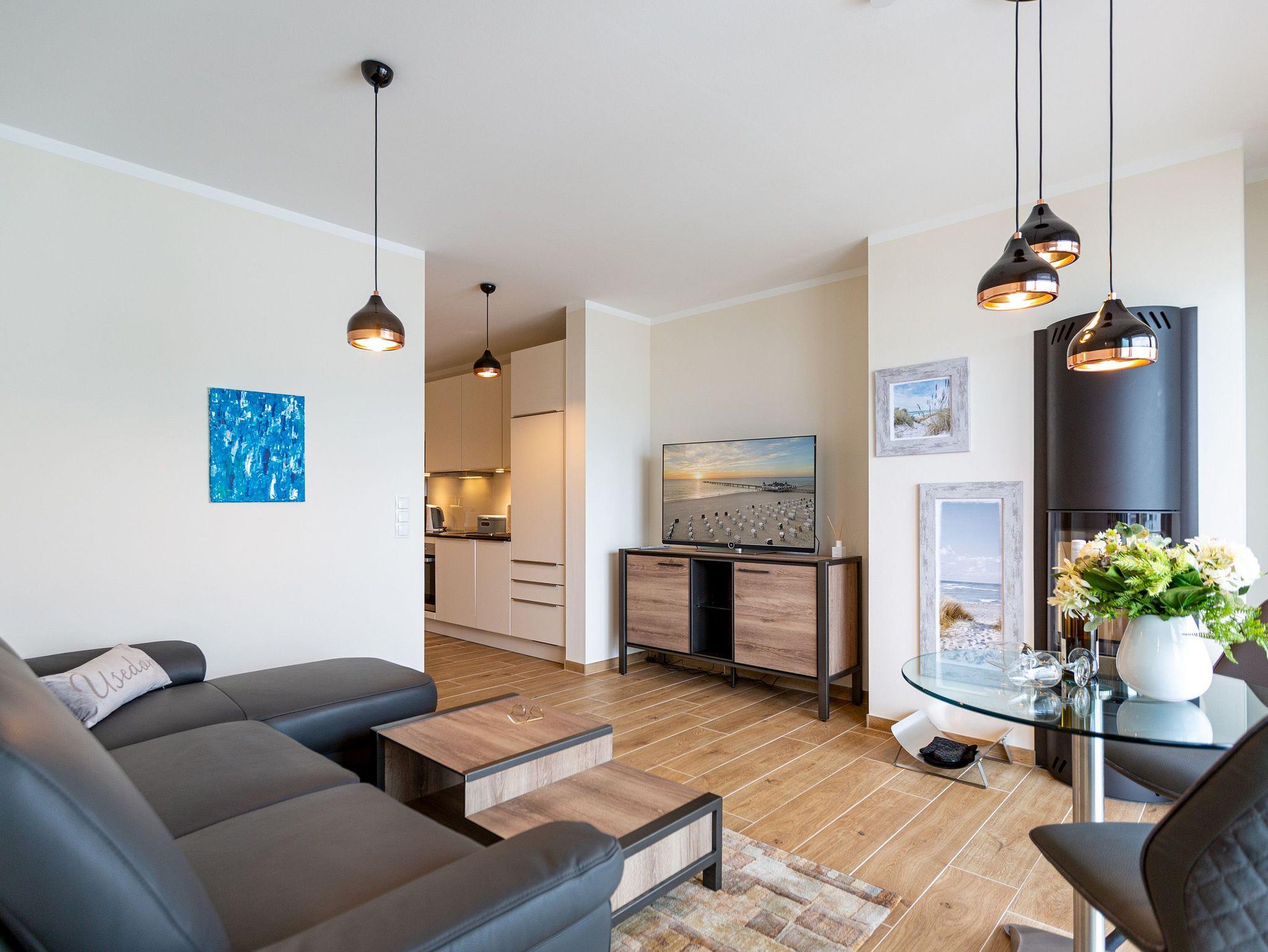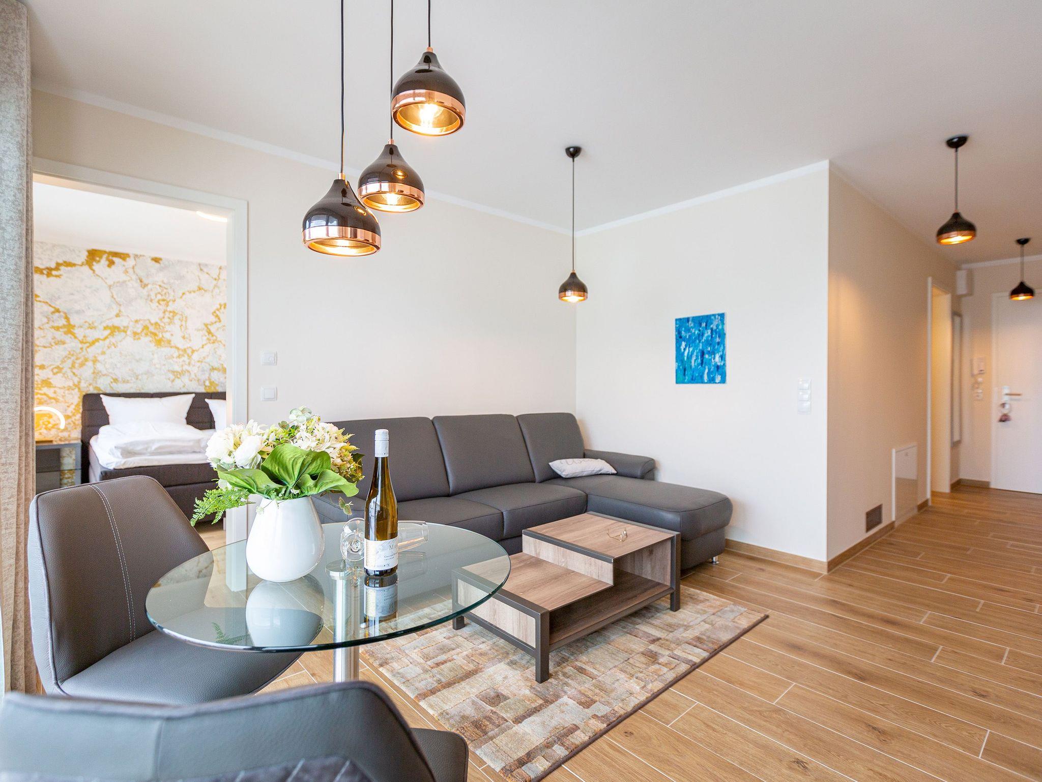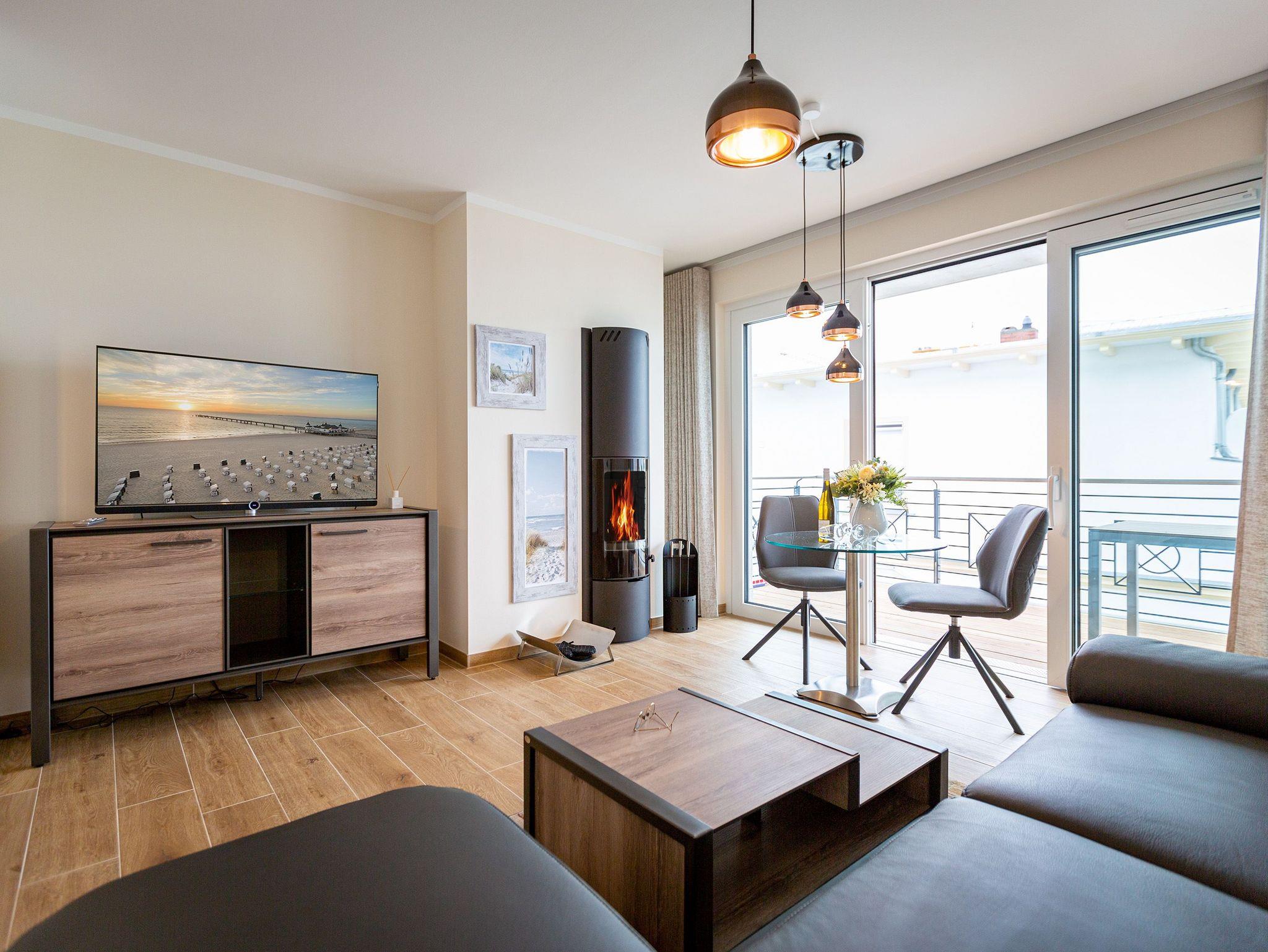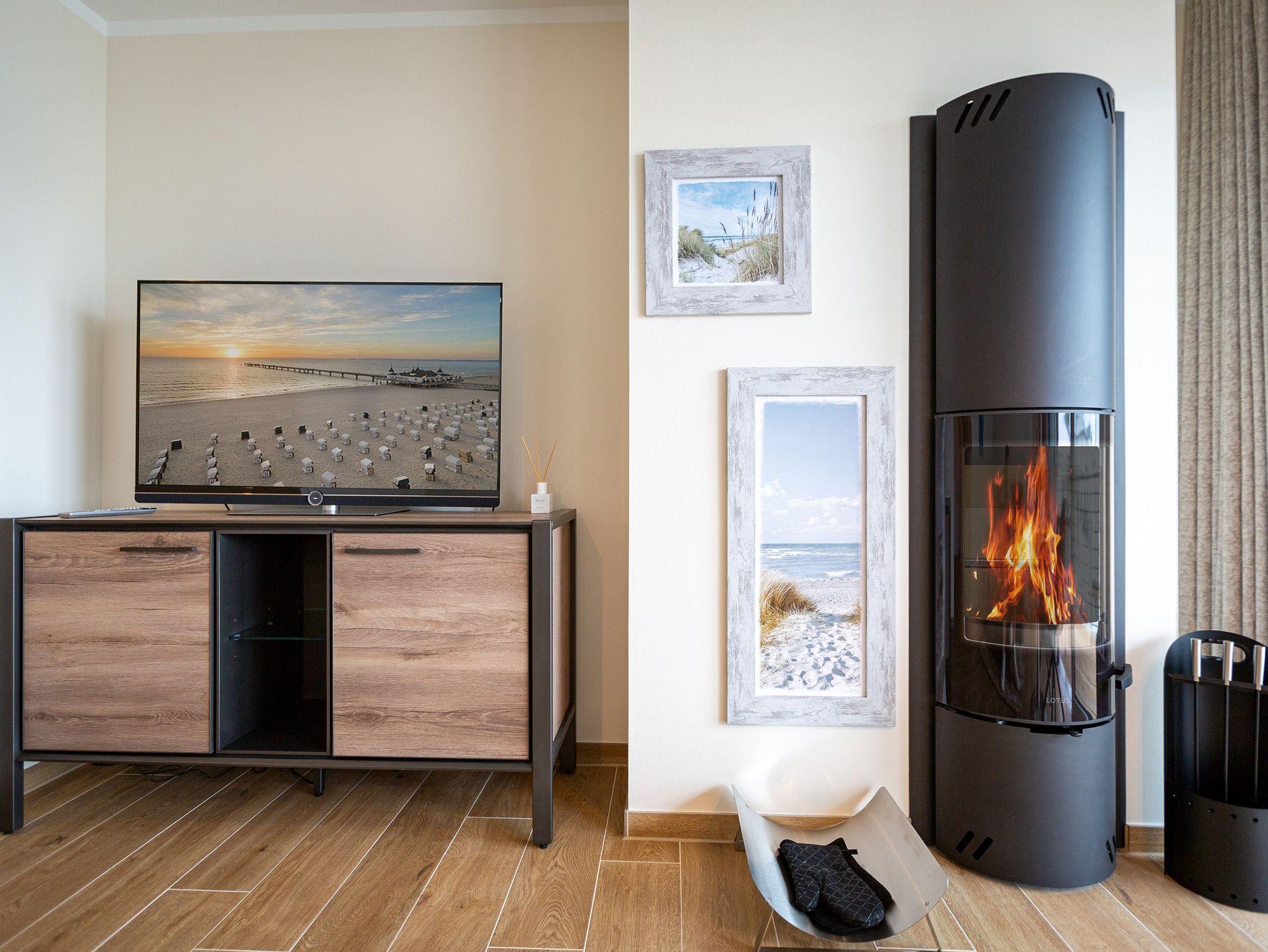 Auf den 45 Quadratmetern dieses eleganten und gemütlichen Feriendomizils im 1. Obergeschoss können Sie es sich zu zweit super kuschelig machen. Ob in der Finnischen Sauna, im komfortablen Boxspringbett (1,80 m x 2,00 m) im Schlafzimmer oder auf dem Sofa vor dem Kaminofen ? dieses Appartement lädt einfach dazu ein, sich pudelwohl zu fühlen. Die beiden Zimmer sind mit viel Gespür fürs Wohlige und viel Geschmack eingerichtet. Vom Wohnzimmer aus haben Sie Zugang auf einen kleinen Nord-Ost-Balkon (8 Quadratmeter) mit Gartenmöbeln. Er ist ideal, um hier in der Sonne zu frühstücken. Das Wohnzimmer selbst ist mit hochwertigen Möbeln, einem Flat-TV und besagtem Kaminofen eine kleine Wohlfühlzone. Am schönen Glastisch direkt vor den bodentiefen Fenstern lässt es sich wunderbar essen. Zubereiten können Sie Ihre Mahlzeiten in der ans Wohnzimmer angrenzenden, offenen Küche. Ob Induktionsherd, Spülmaschine, Toaster, Kaffeemaschine, Wasserkocher oder Geschirr ? alles ist vorhanden. Sogar eine Waschmaschine ist vorhanden und kann genutzt werden. Ein wunderschönes, kleines Paradies ist das Schlafzimmer. Das Bett sorgt für entspannte Träume. Im Badezimmer mit Dusche, WC und Föhn erwartet Sie mit der Finnsichen Sauna ein eigenes SPA. Handtücher liegen schon bereit. Sie können also jederzeit loslegen mit der Schwitzkur. Auch die Betten sind bei Anreise schon bezogen. Das WLAN ist kostenfrei und in der Tiefgarage ist für Sie ein Stellplatz reserviert. Zudem gibt es im Keller einen separaten Fahrradabstellraum.