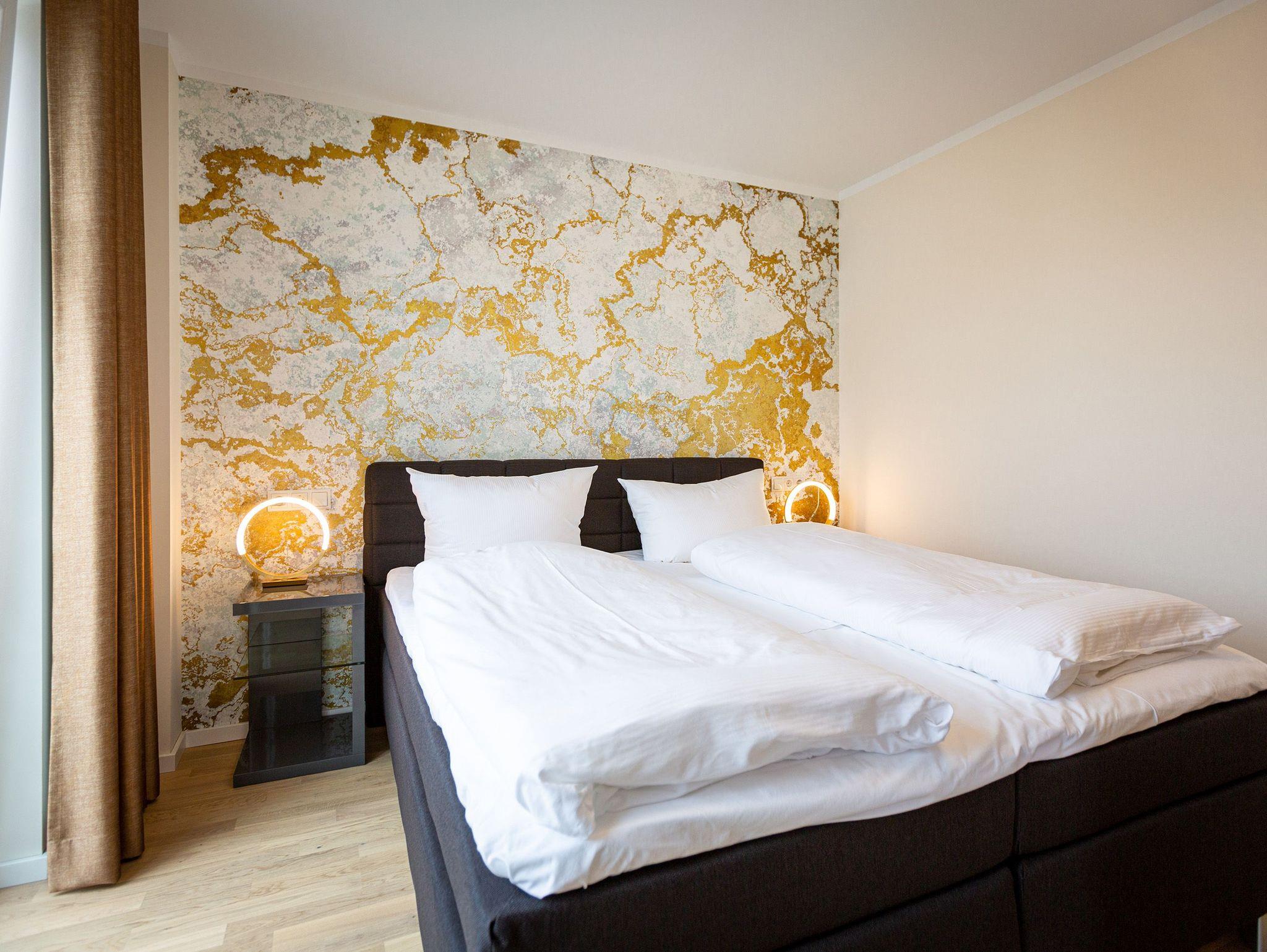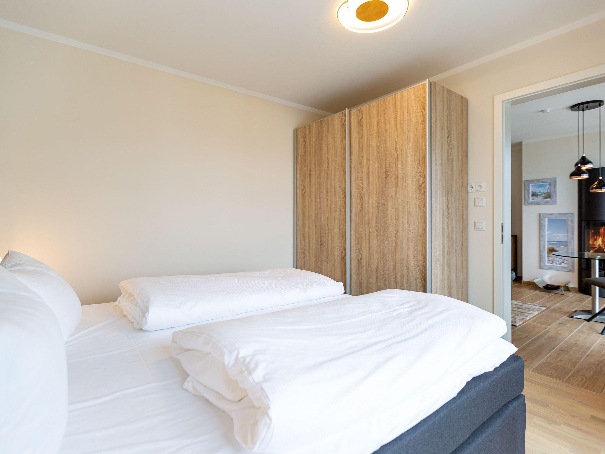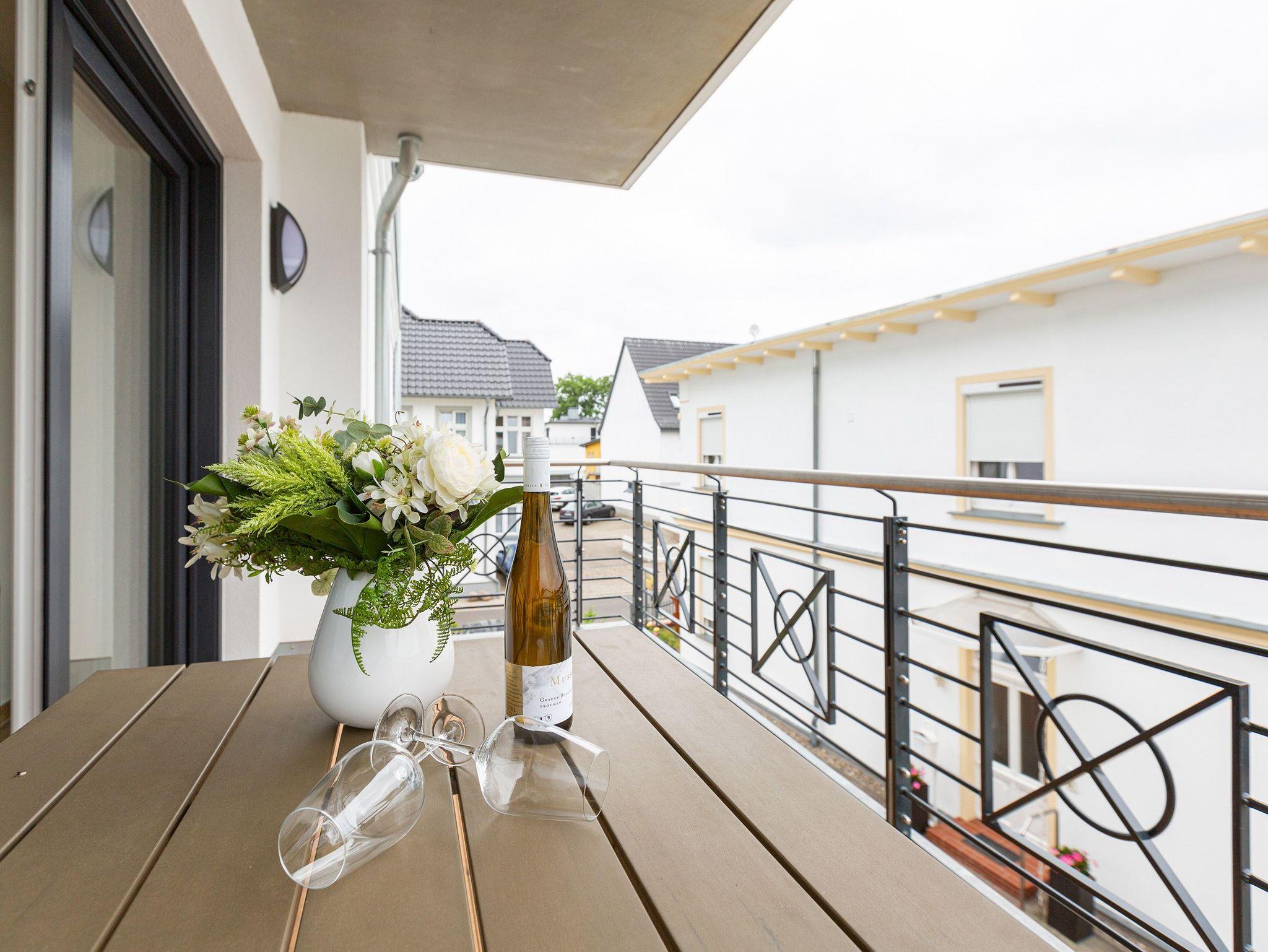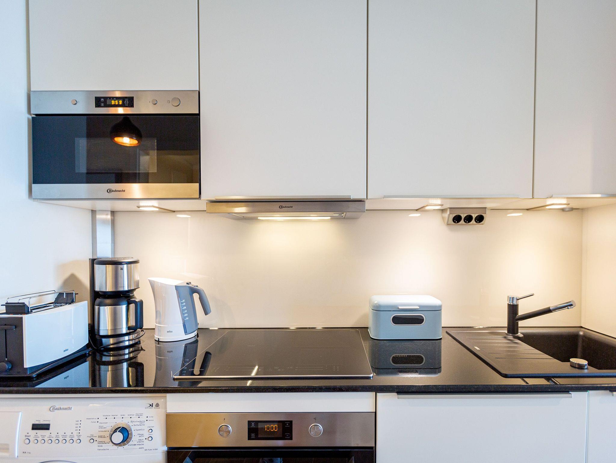 Auf den 45 Quadratmetern dieses eleganten und gemütlichen Feriendomizils im 1. Obergeschoss können Sie es sich zu zweit super kuschelig machen. Ob in der Finnischen Sauna, im komfortablen Boxspringbett (1,80 m x 2,00 m) im Schlafzimmer oder auf dem Sofa vor dem Kaminofen ? dieses Appartement lädt einfach dazu ein, sich pudelwohl zu fühlen. Die beiden Zimmer sind mit viel Gespür fürs Wohlige und viel Geschmack eingerichtet. Vom Wohnzimmer aus haben Sie Zugang auf einen kleinen Nord-Ost-Balkon (8 Quadratmeter) mit Gartenmöbeln. Er ist ideal, um hier in der Sonne zu frühstücken. Das Wohnzimmer selbst ist mit hochwertigen Möbeln, einem Flat-TV und besagtem Kaminofen eine kleine Wohlfühlzone. Am schönen Glastisch direkt vor den bodentiefen Fenstern lässt es sich wunderbar essen. Zubereiten können Sie Ihre Mahlzeiten in der ans Wohnzimmer angrenzenden, offenen Küche. Ob Induktionsherd, Spülmaschine, Toaster, Kaffeemaschine, Wasserkocher oder Geschirr ? alles ist vorhanden. Sogar eine Waschmaschine ist vorhanden und kann genutzt werden. Ein wunderschönes, kleines Paradies ist das Schlafzimmer. Das Bett sorgt für entspannte Träume. Im Badezimmer mit Dusche, WC und Föhn erwartet Sie mit der Finnsichen Sauna ein eigenes SPA. Handtücher liegen schon bereit. Sie können also jederzeit loslegen mit der Schwitzkur. Auch die Betten sind bei Anreise schon bezogen. Das WLAN ist kostenfrei und in der Tiefgarage ist für Sie ein Stellplatz reserviert. Zudem gibt es im Keller einen separaten Fahrradabstellraum.