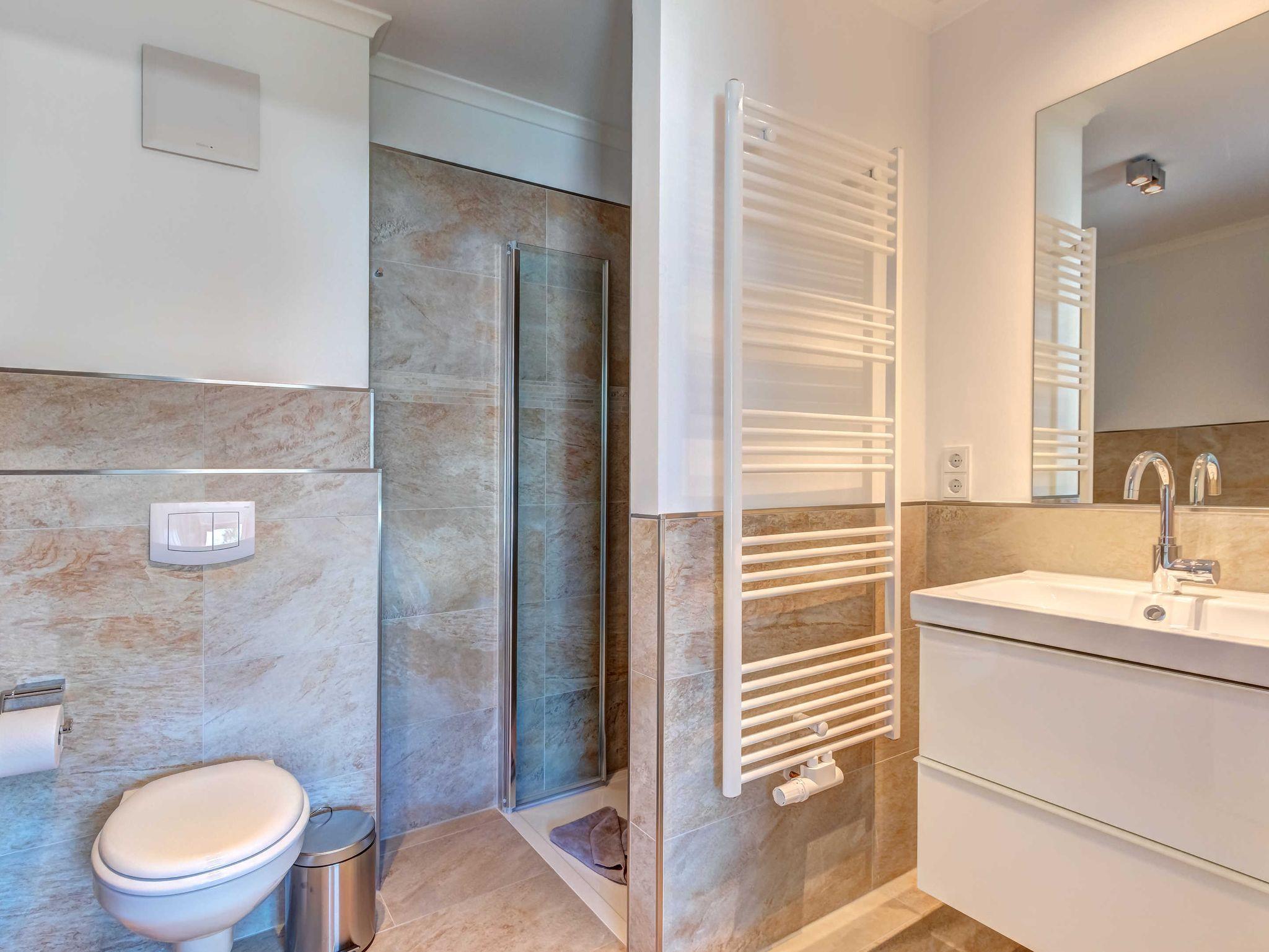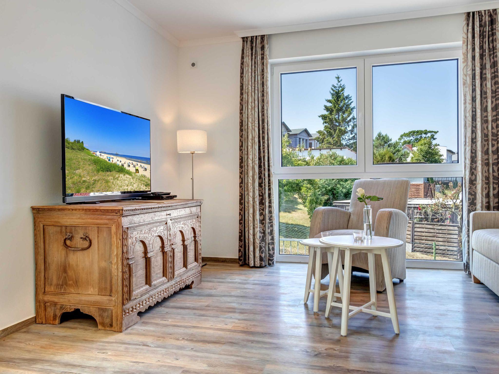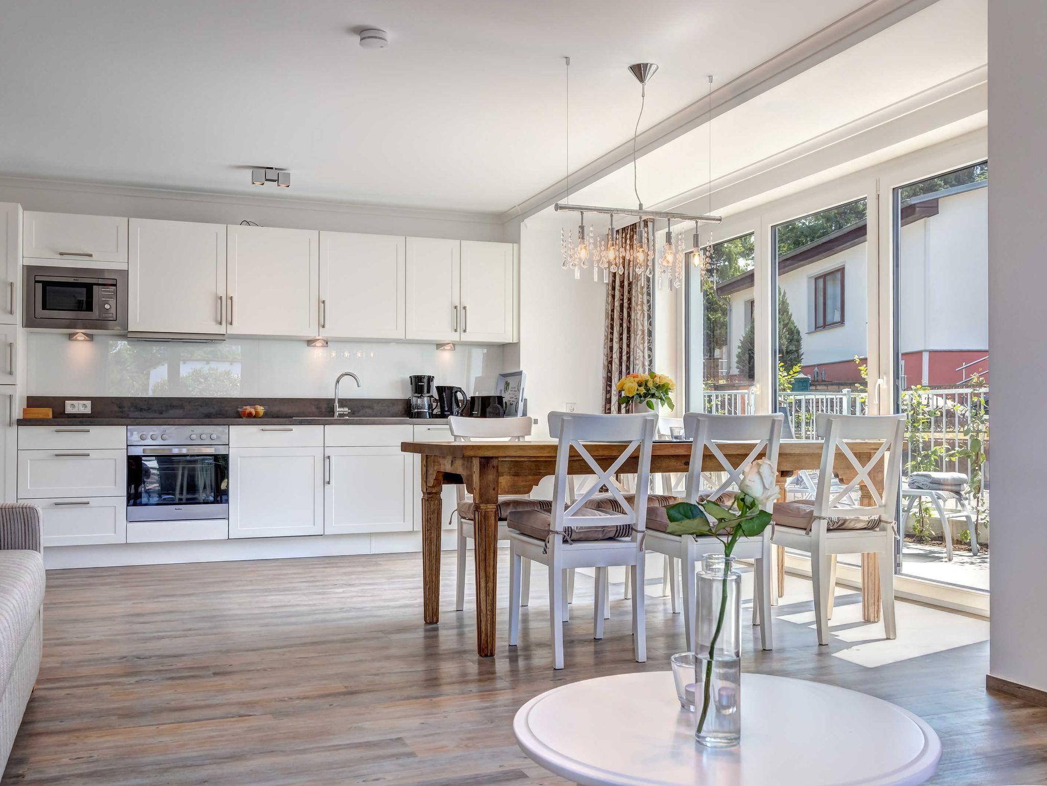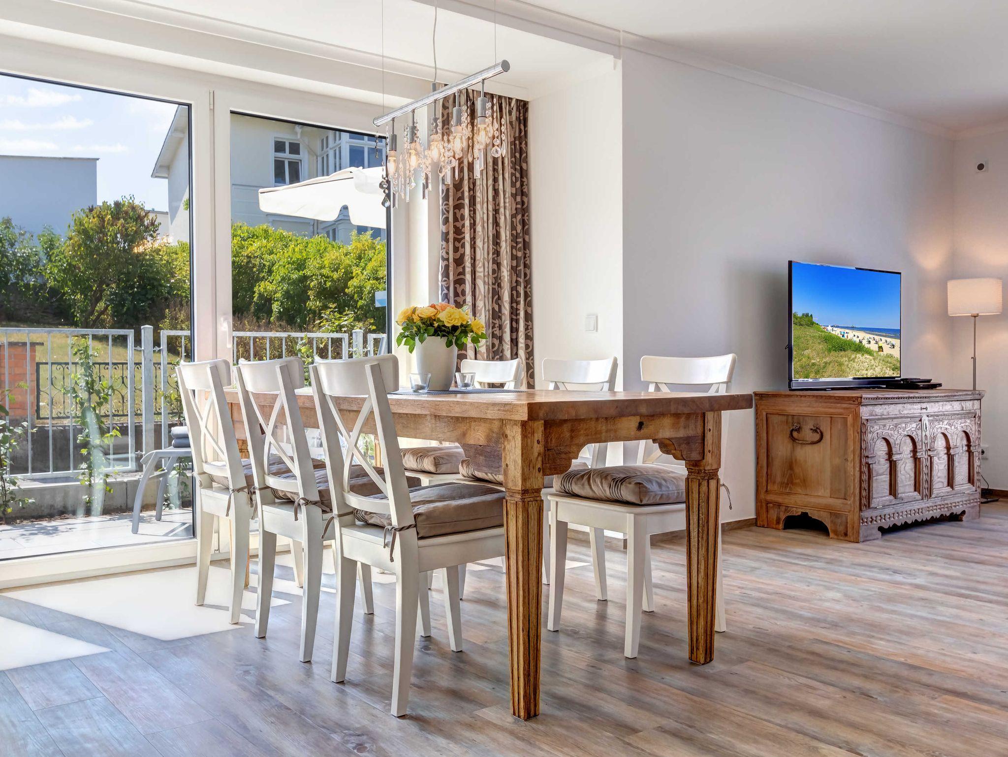 Neubau 2018 mit Fußbodenheizung. Chice und modern eingerichtete 4-Zimmer-Wohnung mit Südterrasse und zus. Westbalkon an einem Schlazimmer! Die sehr komfortable Wohnung verfügt über drei separate Schlafzimmer, jeweils mit zugehörigem ensuite-Bad, großem Wohnzimmer mit Küchenzeile und Essplatz, Vorflur und Abstellraum in der Wohnung. Von den drei Bädern sind zwei Duschbäder und eines mit Wanne und Dusche. Zwei überdachte Pkw-Stellplätze sind inklusive. Die Villa Teutonia liegt etwa 300m von der Strandpromenade entfernt. Zum Ortszentrum und der bekannten Ahlbecker Seebrücke sind es ca. 8-10 Minuten zu Fuß.