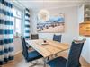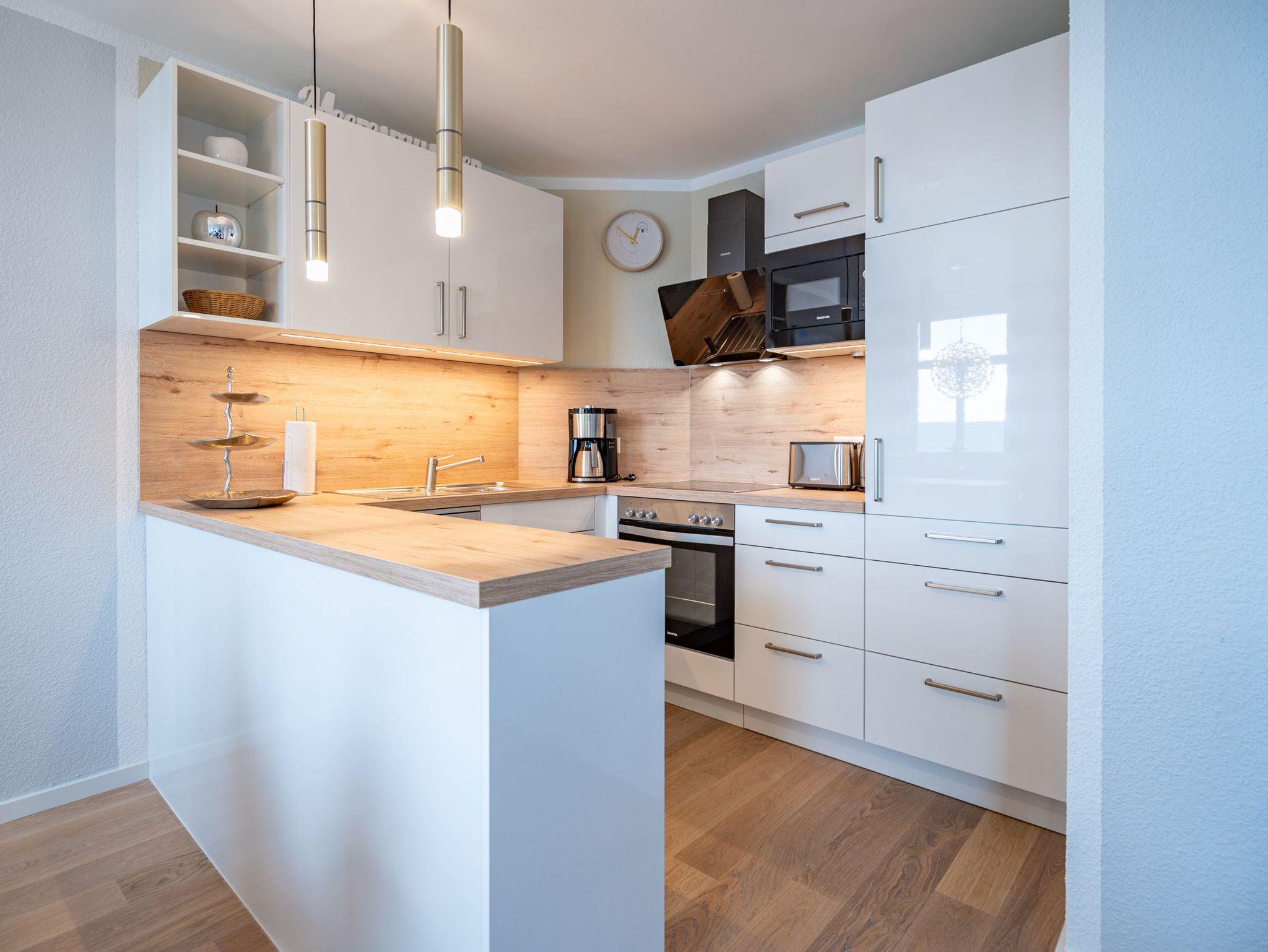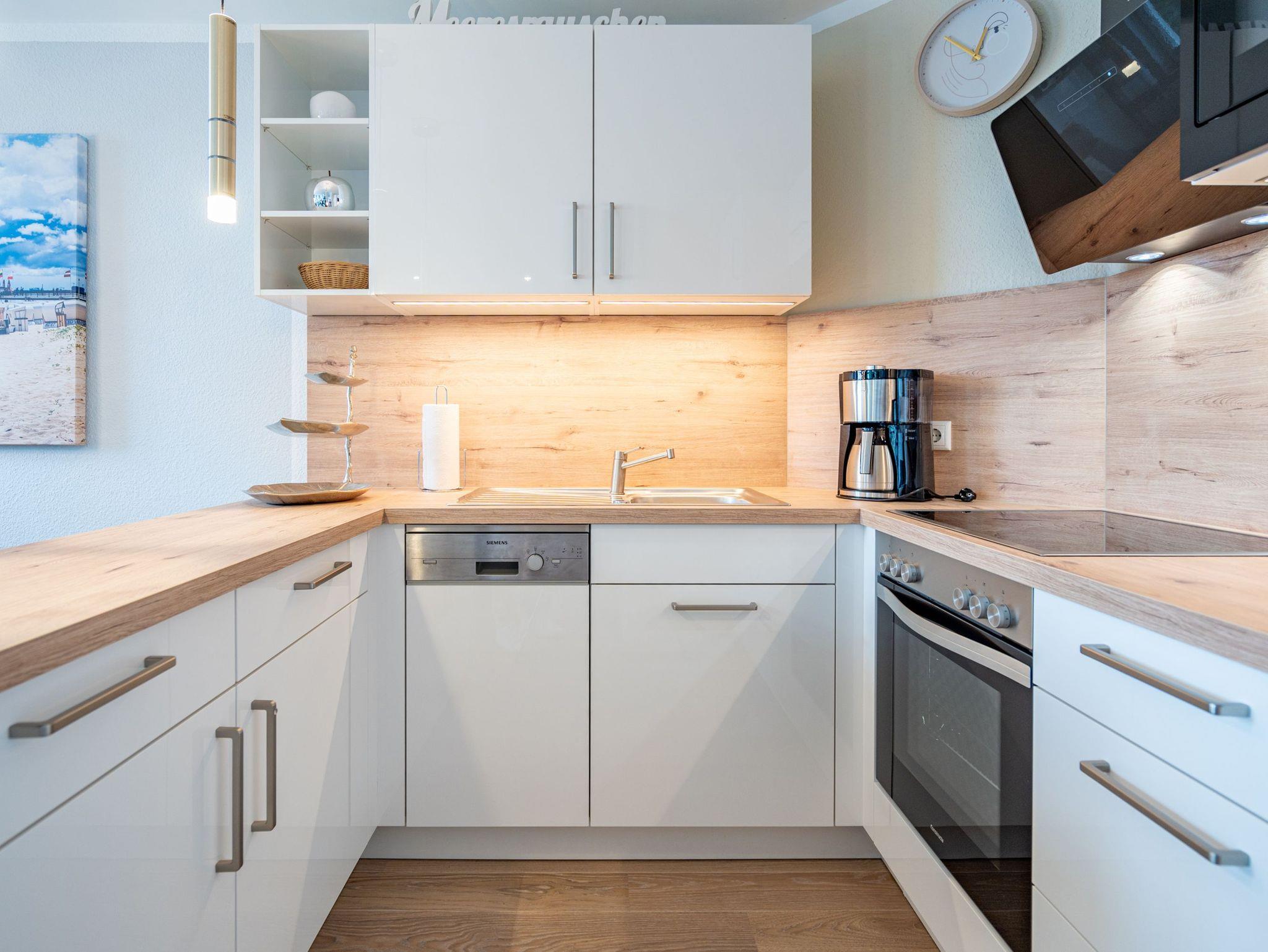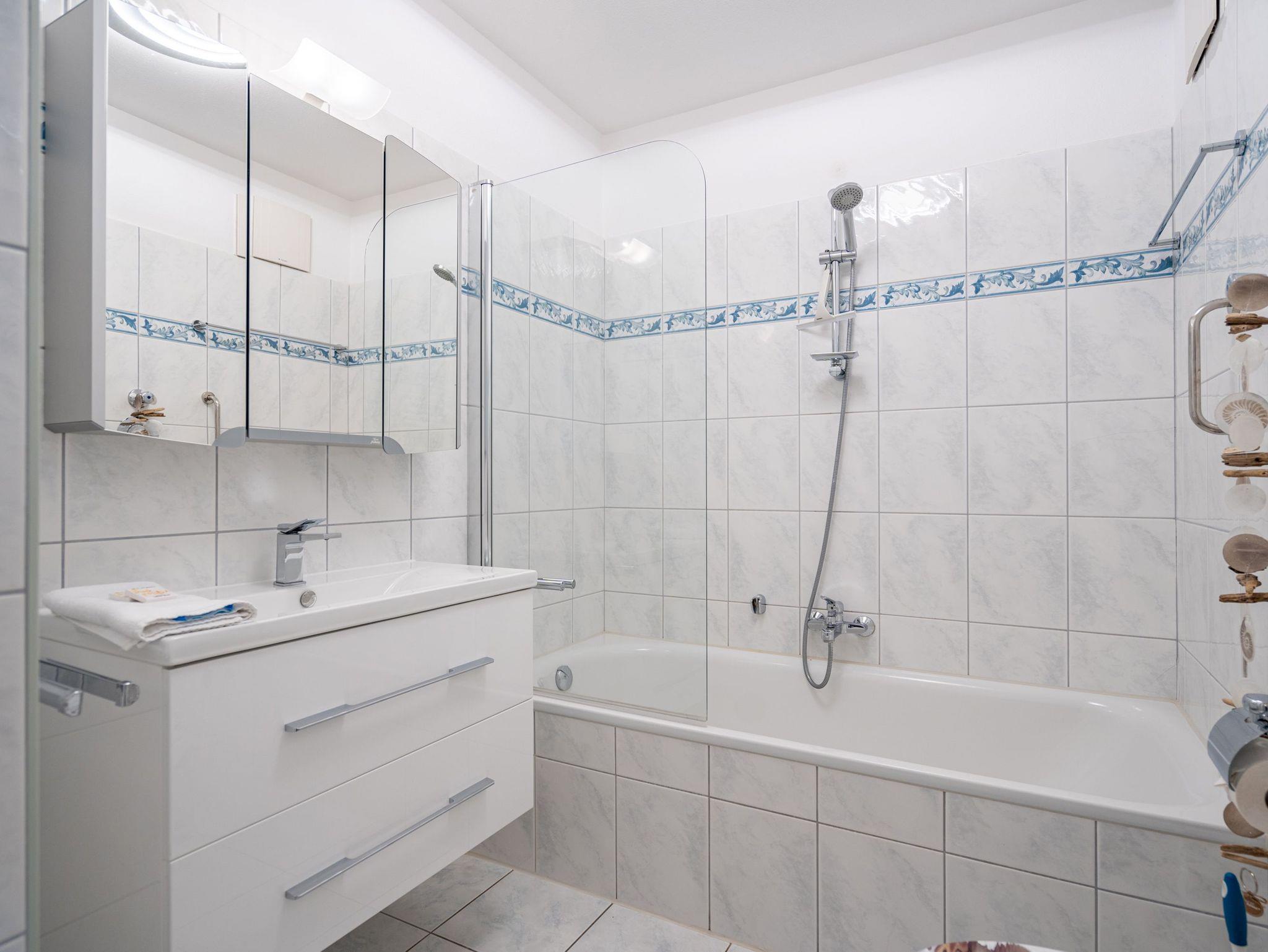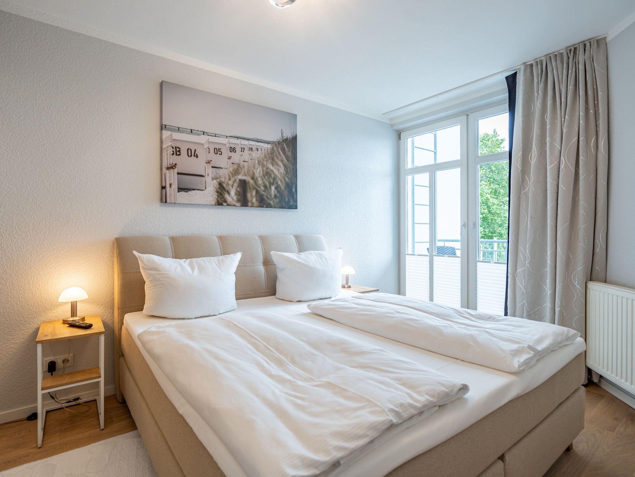 Willkommen in der komfortablen Zwei-Raum-Ferienwohnung (50qm) in der 2. Etage des Haus am Kurpark für 2 Personen. Der helle, offene Wohnbereich ist mit einer voll ausgestatteten Küche versehen, die unter anderem einen Backofen, eine Mikrowelle sowie einen Geschirrspüler umfasst. Ein gemütlicher Essplatz und eine bequeme Sitzgruppe mit Flat-TV laden zum Entspannen ein. Im separaten Schlafzimmer erwartet Sie ein hochwertiges Boxspringdoppelbett (1,80m x 2,00m), ein geräumiger Kleiderschrank sowie ein zusätzlicher Flat-TV. Das innenliegende Badezimmer verfügt über eine Badewanne, einen Waschtisch und ein WC. Der sonnige Süd-West-Balkon bietet mit Tisch und zwei Stühlen einen perfekten Ort, um die frische Luft zu genießen. Während Ihres Aufenthalts steht Ihnen kostenfreies WLAN zur Verfügung. Zudem können Sie den Gemeinschafts-Saunabereich mit Ruheraum im Obergeschoss des Hauses nutzen. Ein fester Stellplatz in der Tiefgarage ist ebenfalls für Sie reserviert.
