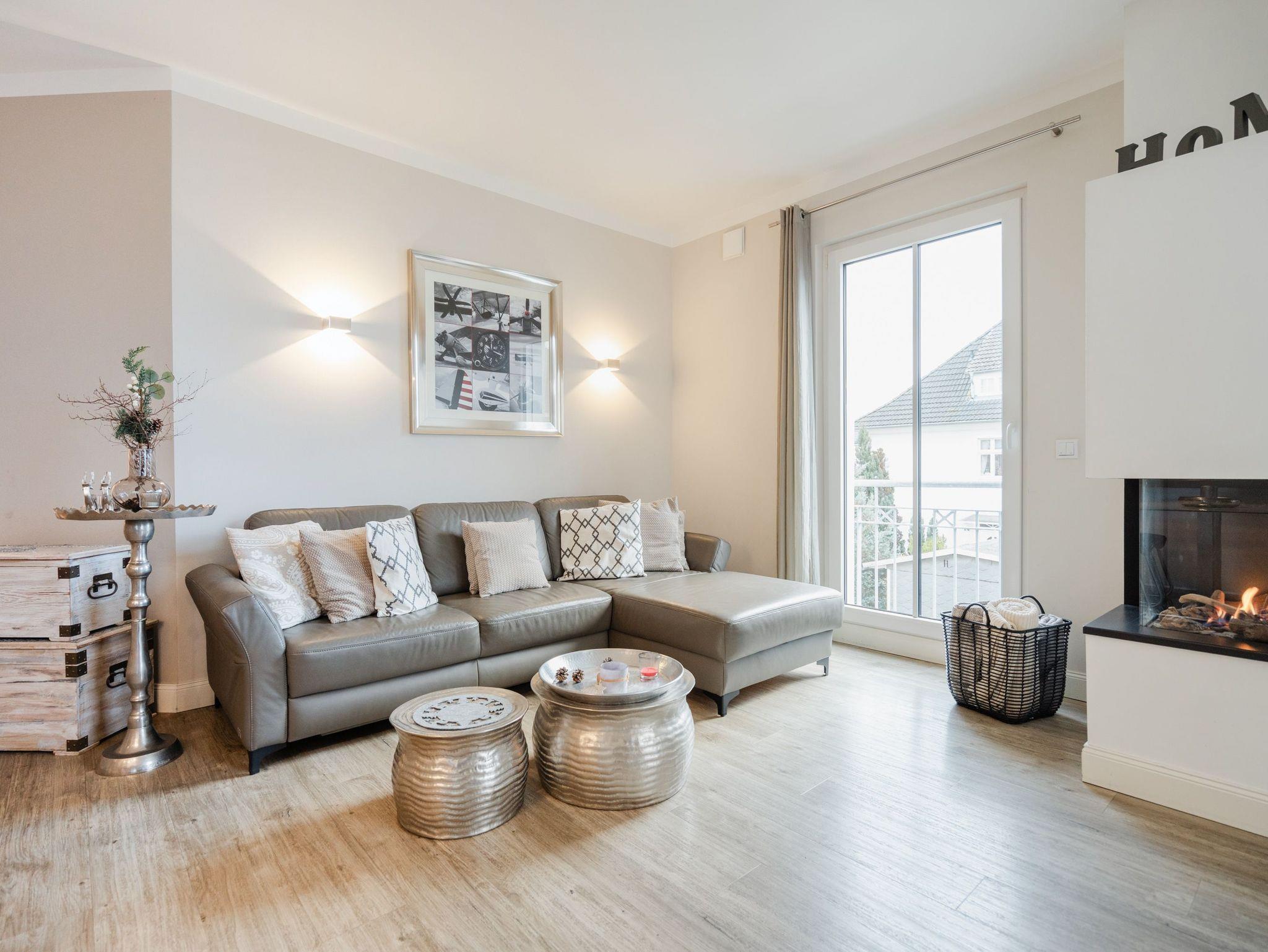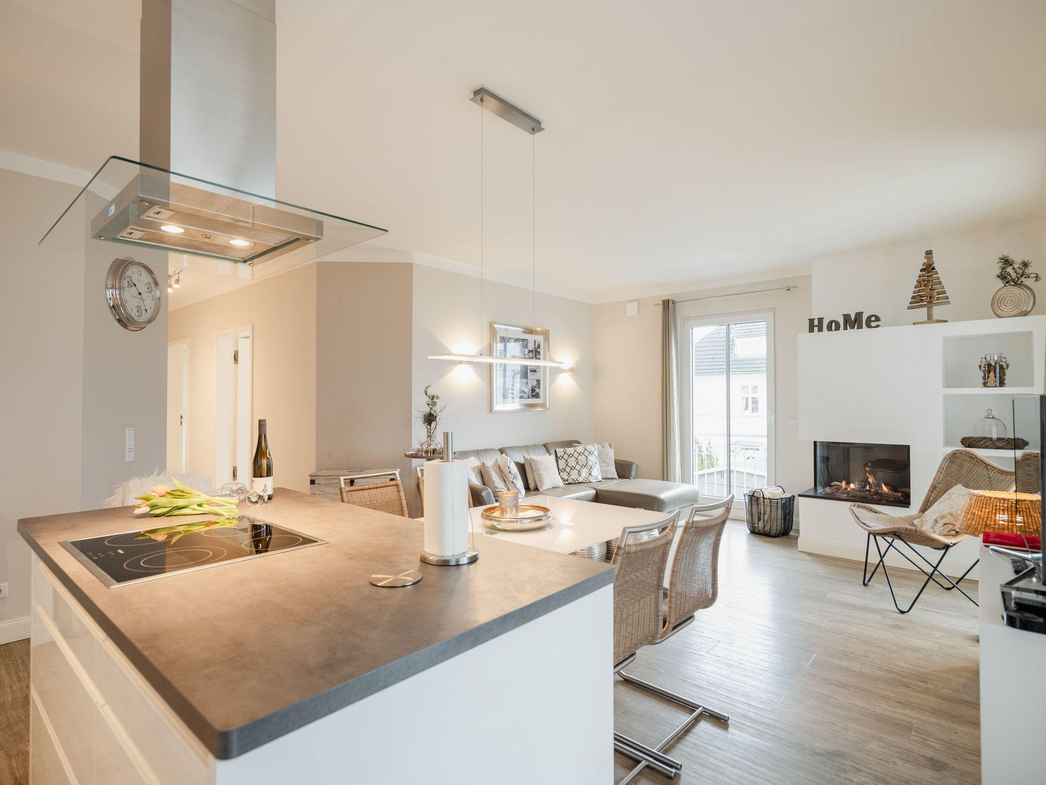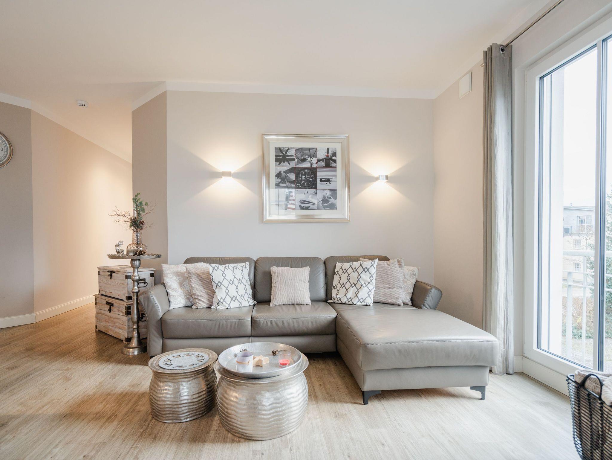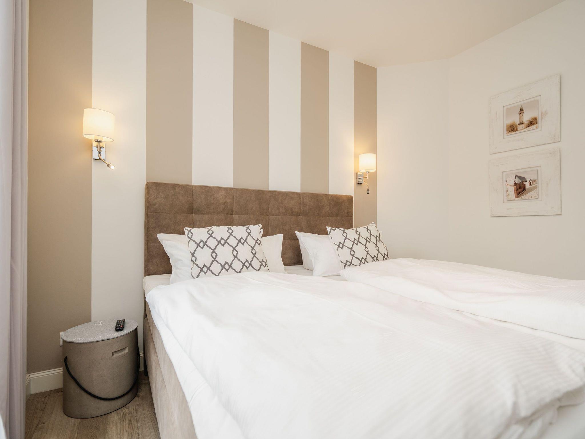 Wunderschön Urlauben! Die neue 3-Raum-Ferienwohnung ( 90 qm) im 1. Obergeschoss des Vorderhauses bietet Platz für 4 Personen und 1 Kleinkind ( bis 3 Jahre im Kinderreisebett). Die zeitlos elegante Möblierung und die klaren Linien und Farben wirken modern und stylisch und dennoch gemütlich und kuschlig - Urlaubsfeeling pur! Der helle Wohnbereich mit gemütlicher Sitzgruppe, Flat-TV und modernem Design-Gaskamin (per Fernbedienung zu nutzen) wird ergänzt durch die offene, komplett ausgestattete Küche mit Essplatz. Zwei Schlafzimmer mit komfortablen Boxspringbetten und Flat-TV (1x mit großzügigem begehbaren Kleiderschrank) sorgen für erholsame Nächte. Ein besonderes Highlight ist die wohnungseigene Sauna, die im schönen Bad mit Echtglasdusche integriert ist. Ein Balkon zur Westseite, Pkw-Stellplatz in der Tiefgarage Nr. 8 , WLAN-Netz kostenfrei nutzbar. Für Ihren Komfort steht die Erstausstattung Wäsche für Sie bereit. Für Kleinkinder können ein Babyreisebett (ohne Matratze und Kinderbettzeug) und ein Kinderhochstuhl gegen einen Aufpreis bestellt werden.