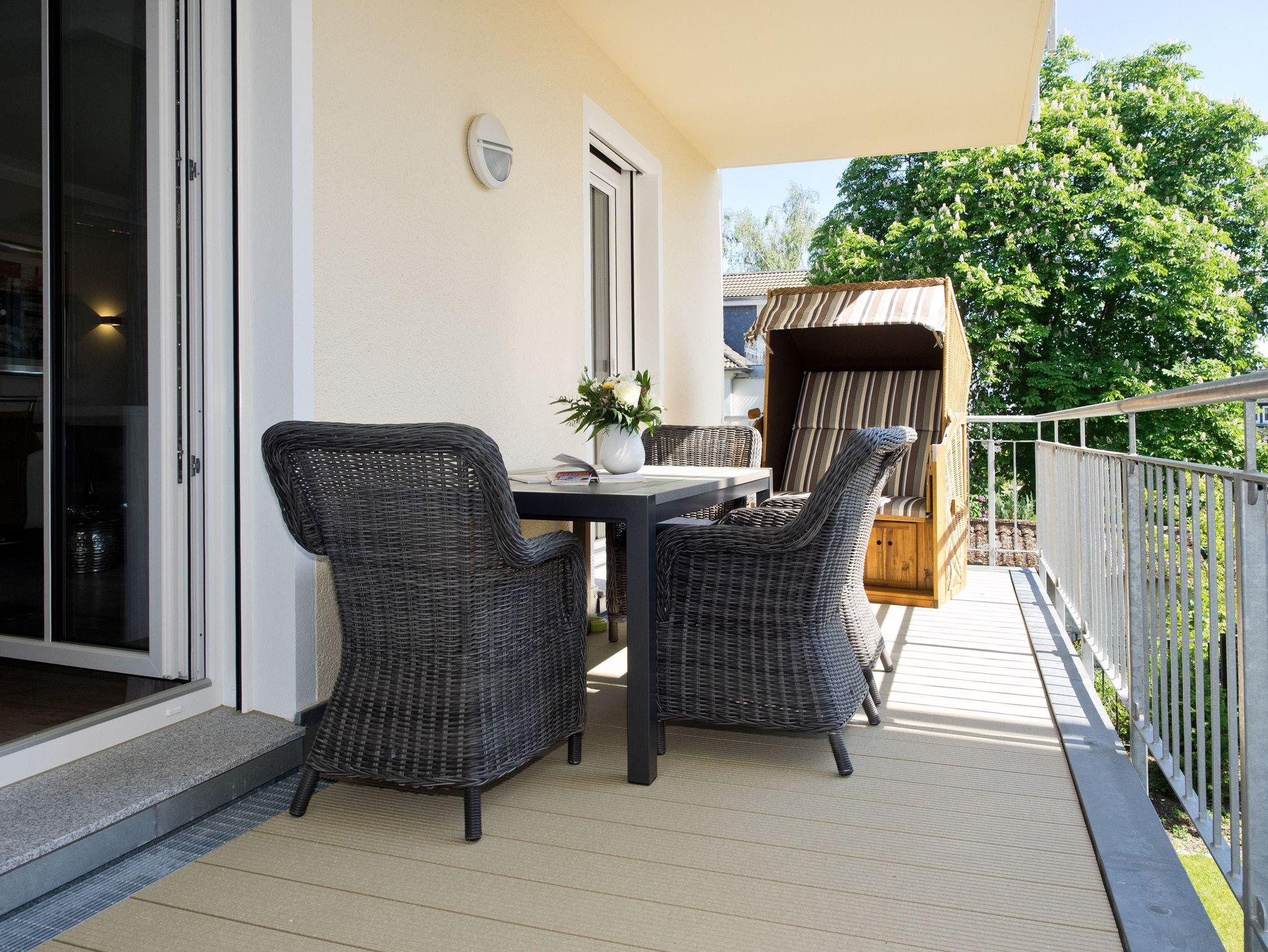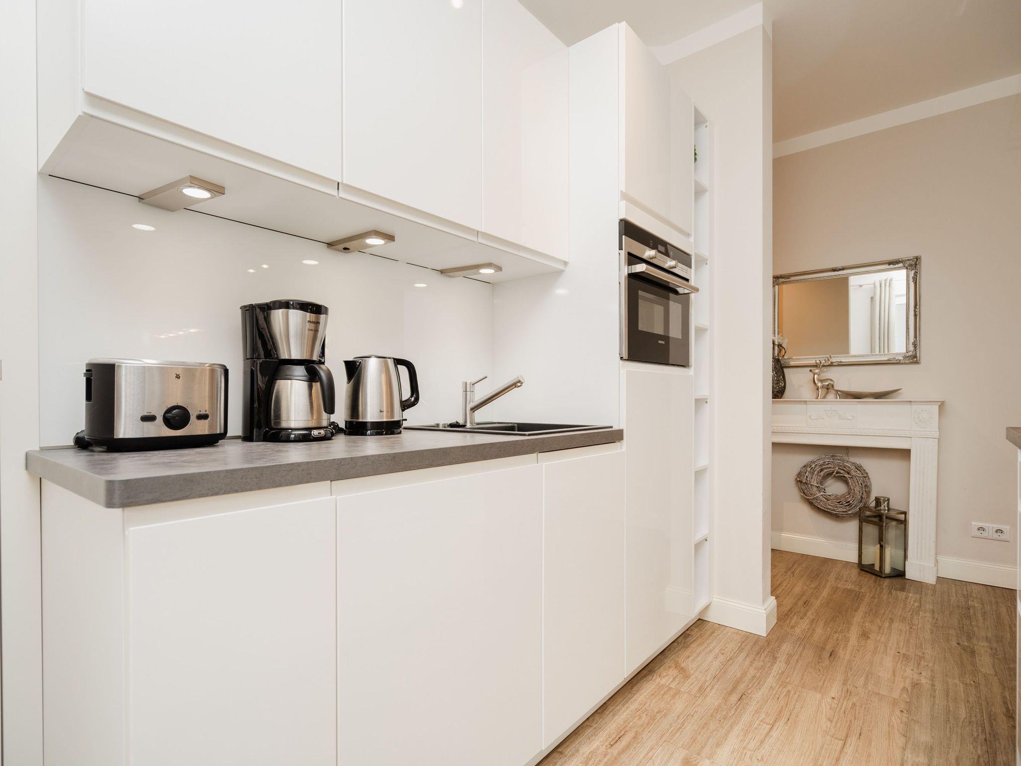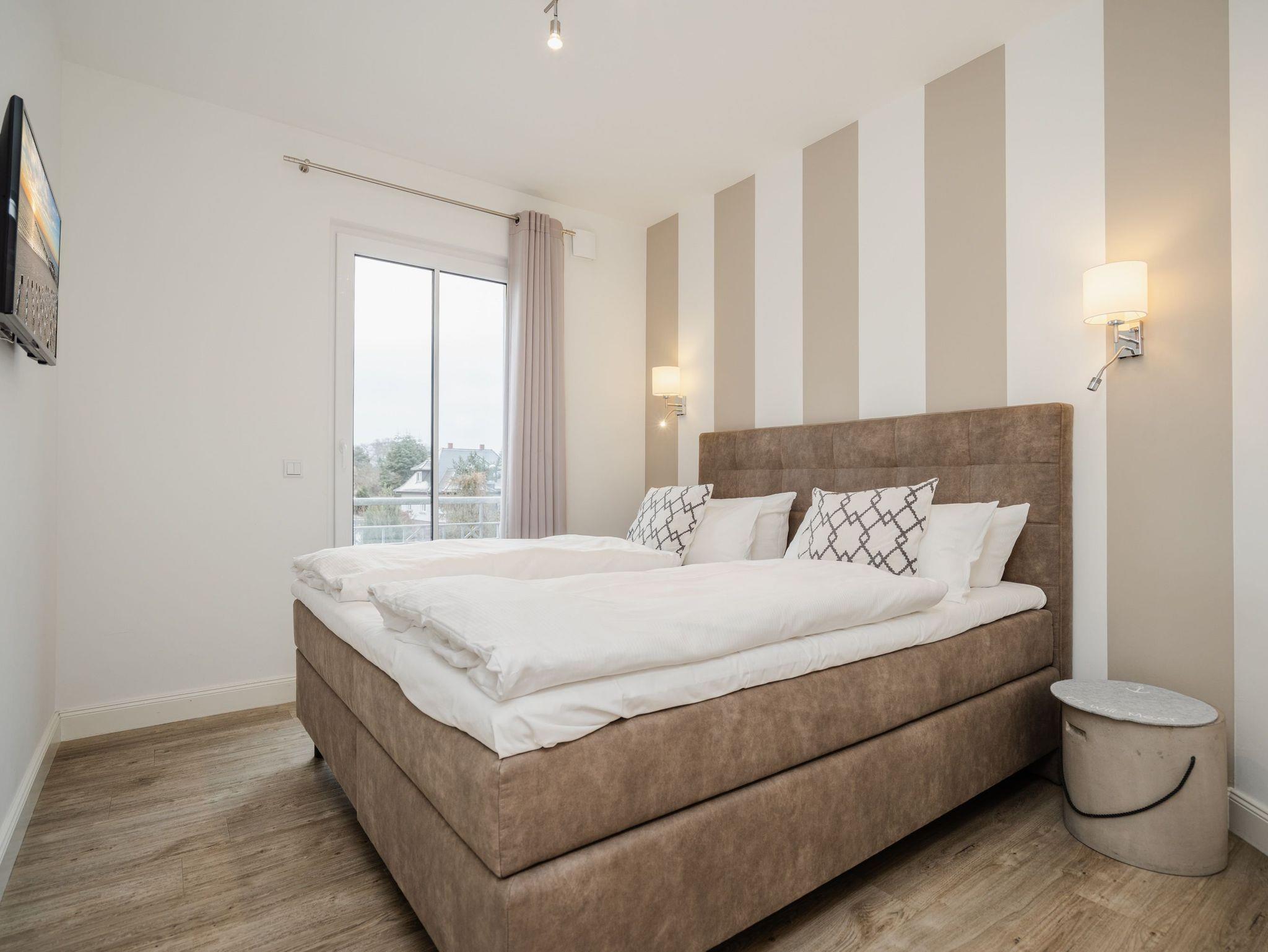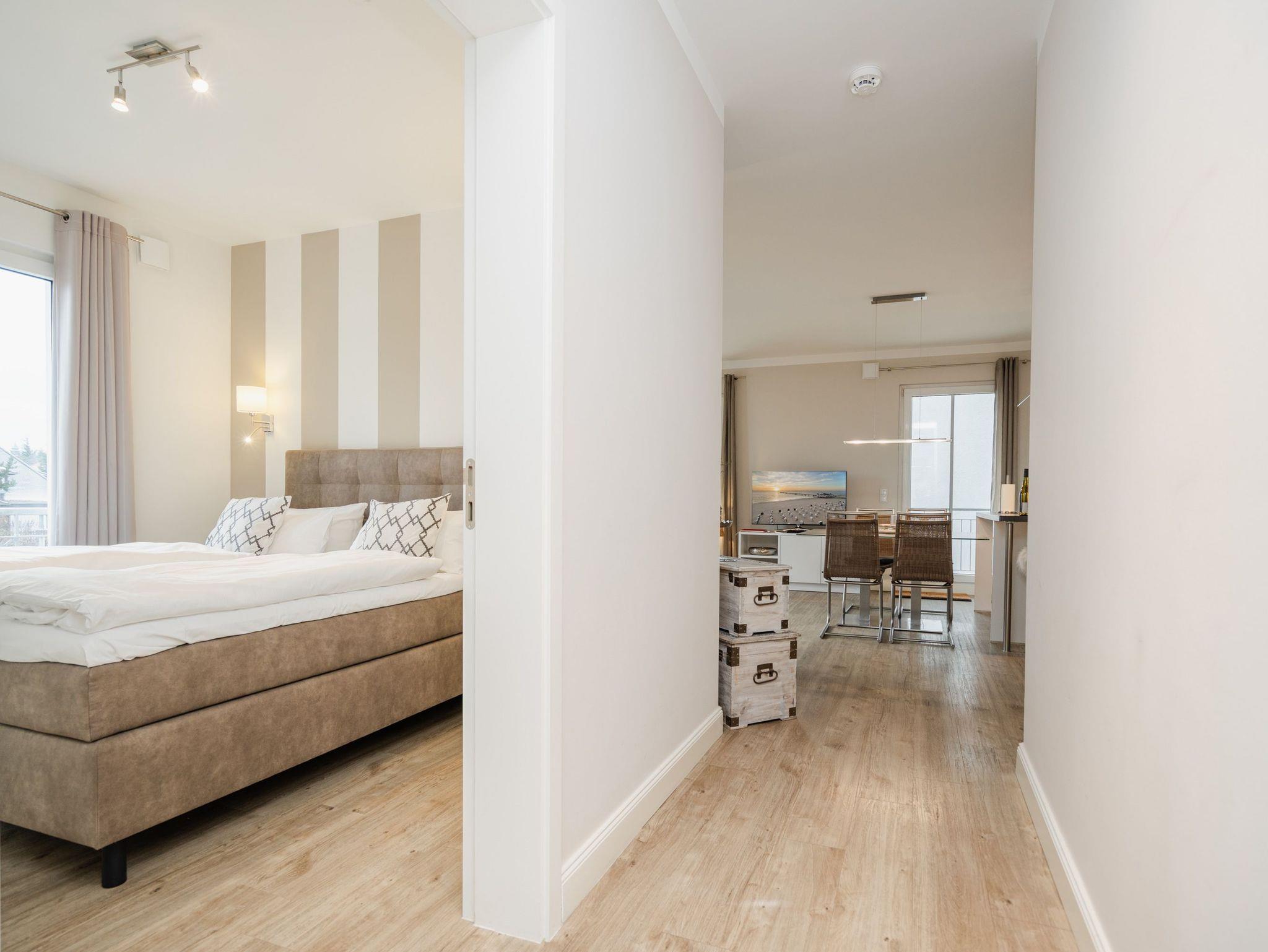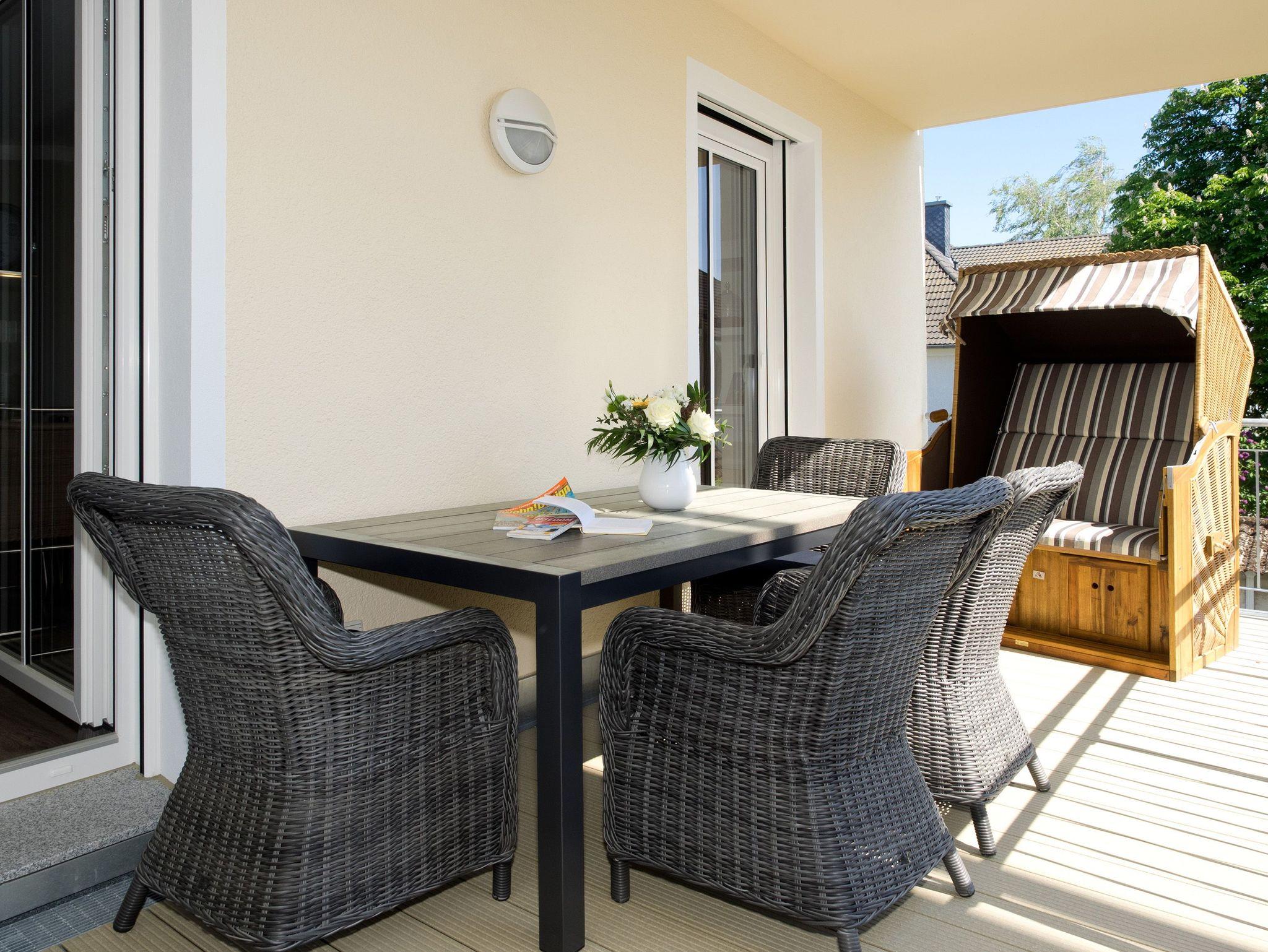 Wunderschön Urlauben! Die neue 3-Raum-Ferienwohnung ( 90 qm) im 1. Obergeschoss des Vorderhauses bietet Platz für 4 Personen und 1 Kleinkind ( bis 3 Jahre im Kinderreisebett). Die zeitlos elegante Möblierung und die klaren Linien und Farben wirken modern und stylisch und dennoch gemütlich und kuschlig - Urlaubsfeeling pur! Der helle Wohnbereich mit gemütlicher Sitzgruppe, Flat-TV und modernem Design-Gaskamin (per Fernbedienung zu nutzen) wird ergänzt durch die offene, komplett ausgestattete Küche mit Essplatz. Zwei Schlafzimmer mit komfortablen Boxspringbetten und Flat-TV (1x mit großzügigem begehbaren Kleiderschrank) sorgen für erholsame Nächte. Ein besonderes Highlight ist die wohnungseigene Sauna, die im schönen Bad mit Echtglasdusche integriert ist. Ein Balkon zur Westseite, Pkw-Stellplatz in der Tiefgarage Nr. 8 , WLAN-Netz kostenfrei nutzbar. Für Ihren Komfort steht die Erstausstattung Wäsche für Sie bereit. Für Kleinkinder können ein Babyreisebett (ohne Matratze und Kinderbettzeug) und ein Kinderhochstuhl gegen einen Aufpreis bestellt werden.