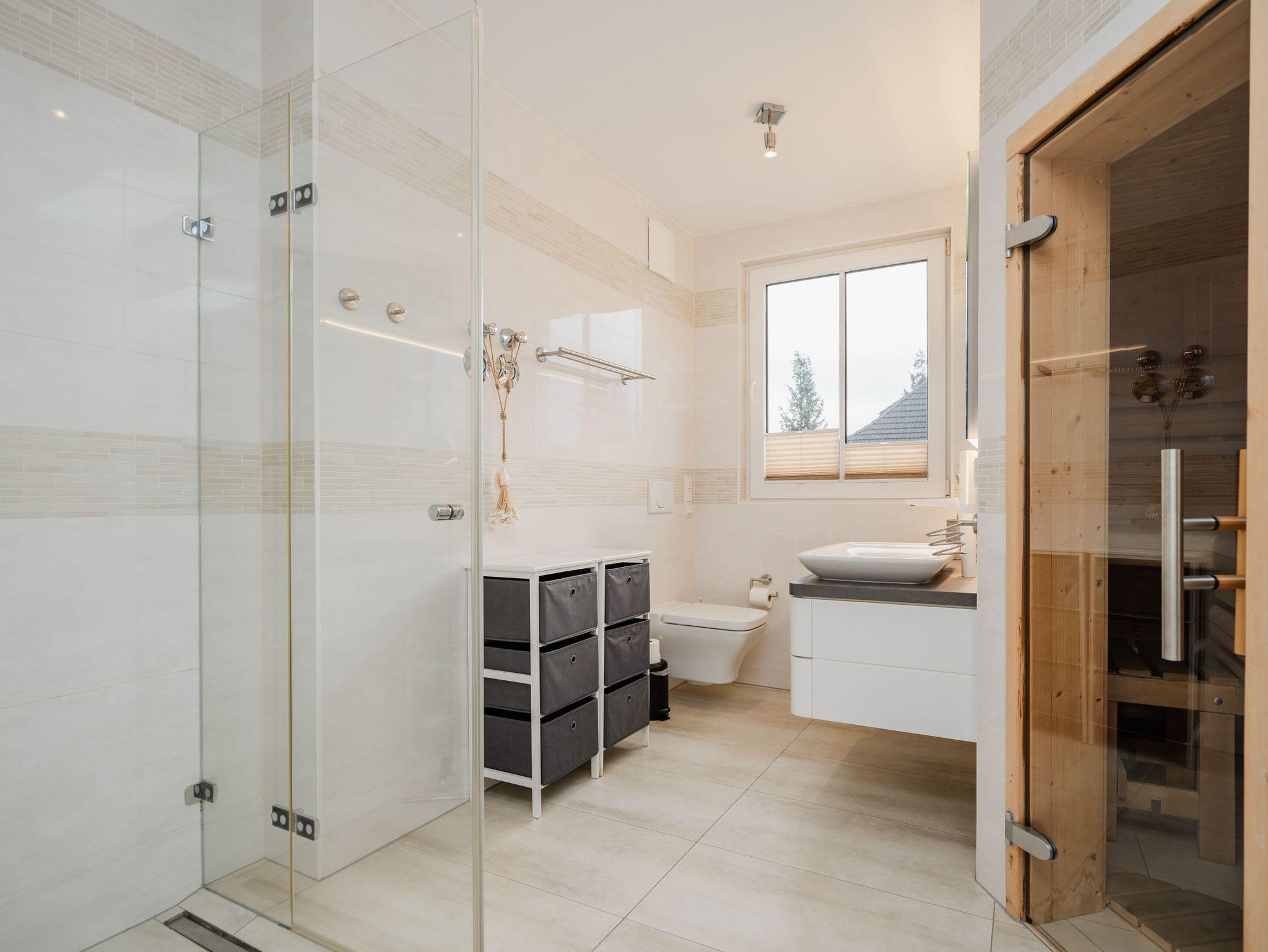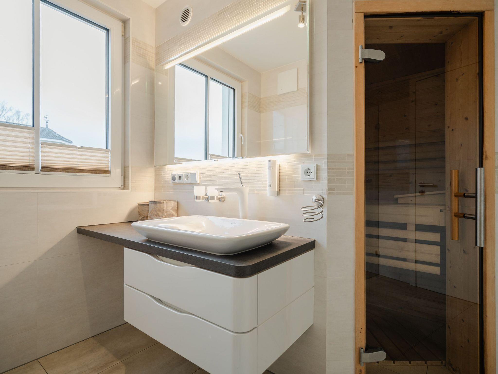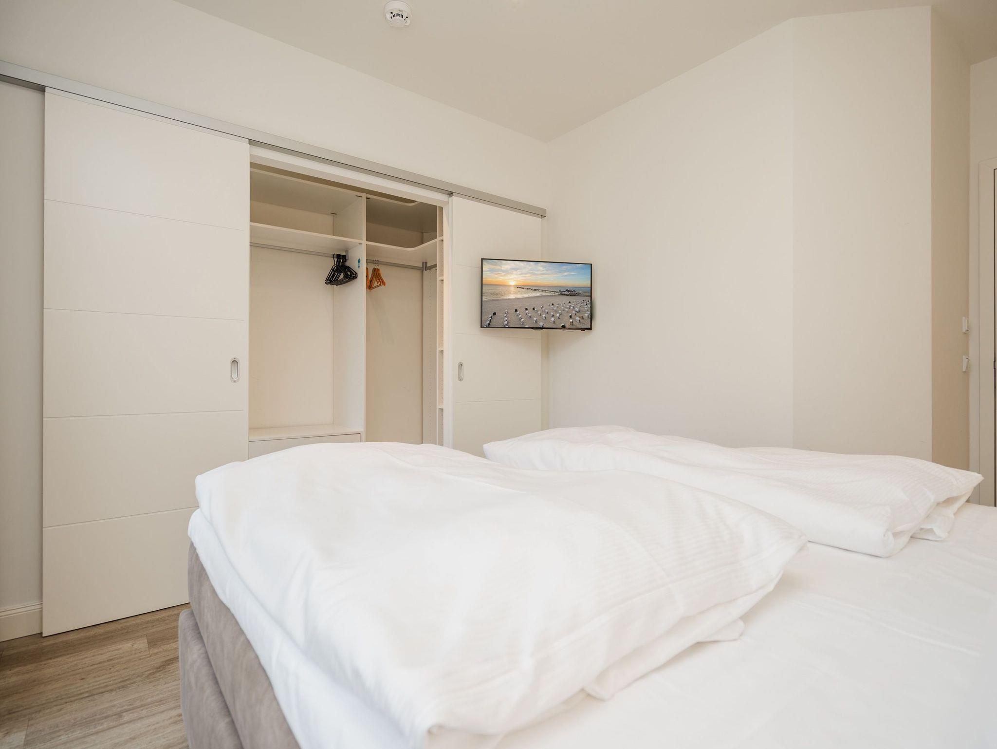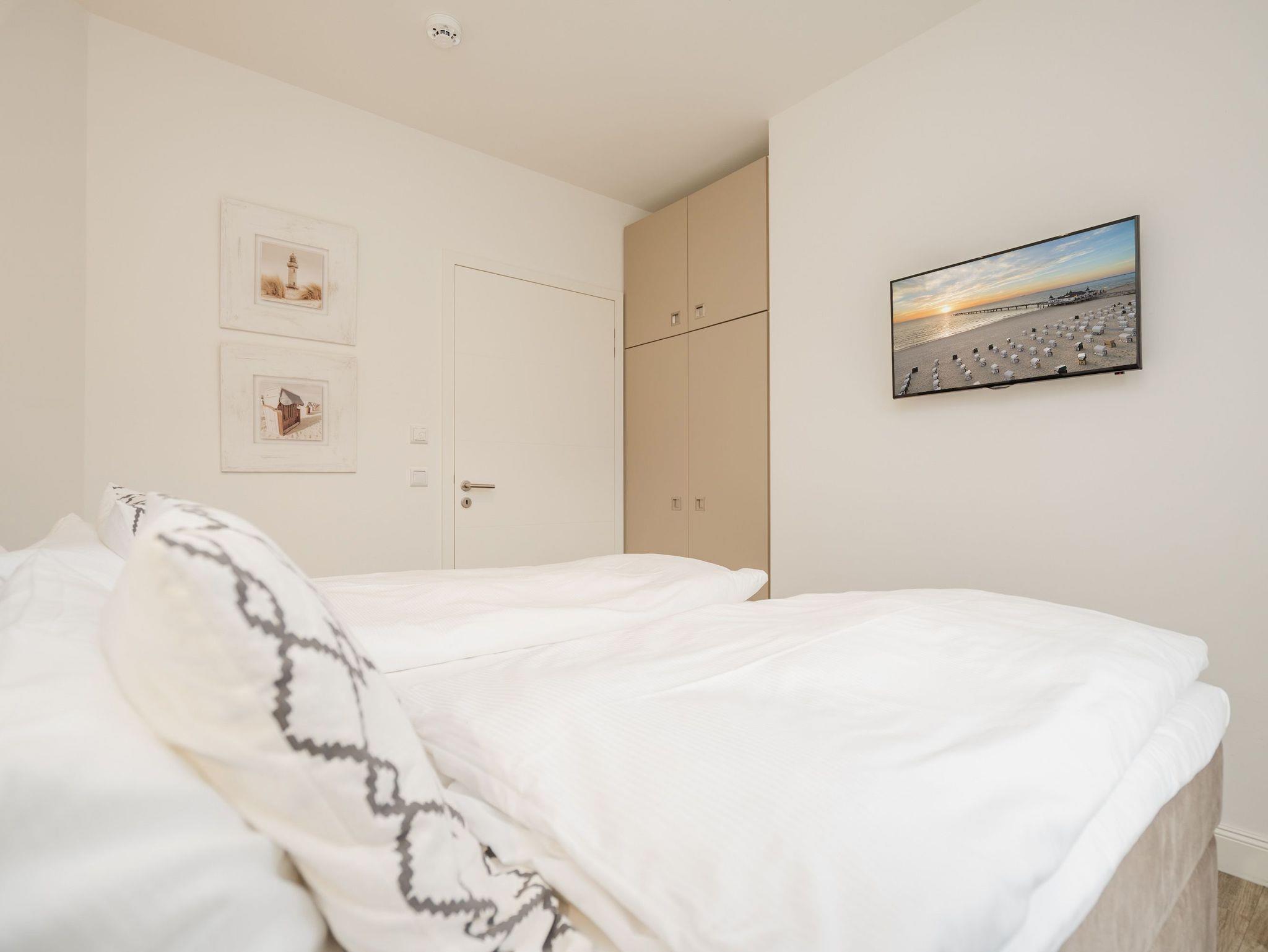 Wunderschön Urlauben! Die neue 3-Raum-Ferienwohnung ( 90 qm) im 1. Obergeschoss des Vorderhauses bietet Platz für 4 Personen und 1 Kleinkind ( bis 3 Jahre im Kinderreisebett). Die zeitlos elegante Möblierung und die klaren Linien und Farben wirken modern und stylisch und dennoch gemütlich und kuschlig - Urlaubsfeeling pur! Der helle Wohnbereich mit gemütlicher Sitzgruppe, Flat-TV und modernem Design-Gaskamin (per Fernbedienung zu nutzen) wird ergänzt durch die offene, komplett ausgestattete Küche mit Essplatz. Zwei Schlafzimmer mit komfortablen Boxspringbetten und Flat-TV (1x mit großzügigem begehbaren Kleiderschrank) sorgen für erholsame Nächte. Ein besonderes Highlight ist die wohnungseigene Sauna, die im schönen Bad mit Echtglasdusche integriert ist. Ein Balkon zur Westseite, Pkw-Stellplatz in der Tiefgarage Nr. 8 , WLAN-Netz kostenfrei nutzbar. Für Ihren Komfort steht die Erstausstattung Wäsche für Sie bereit. Für Kleinkinder können ein Babyreisebett (ohne Matratze und Kinderbettzeug) und ein Kinderhochstuhl gegen einen Aufpreis bestellt werden.