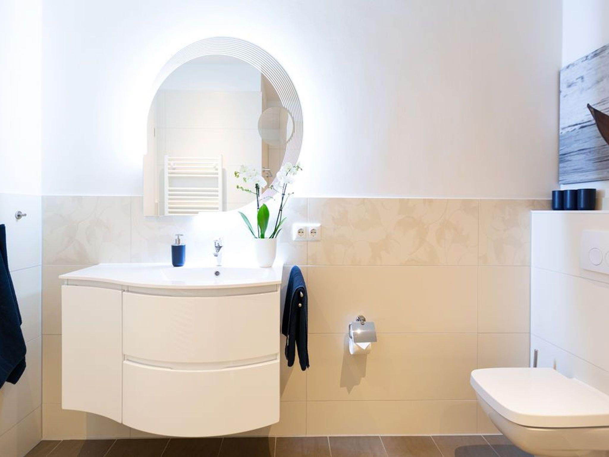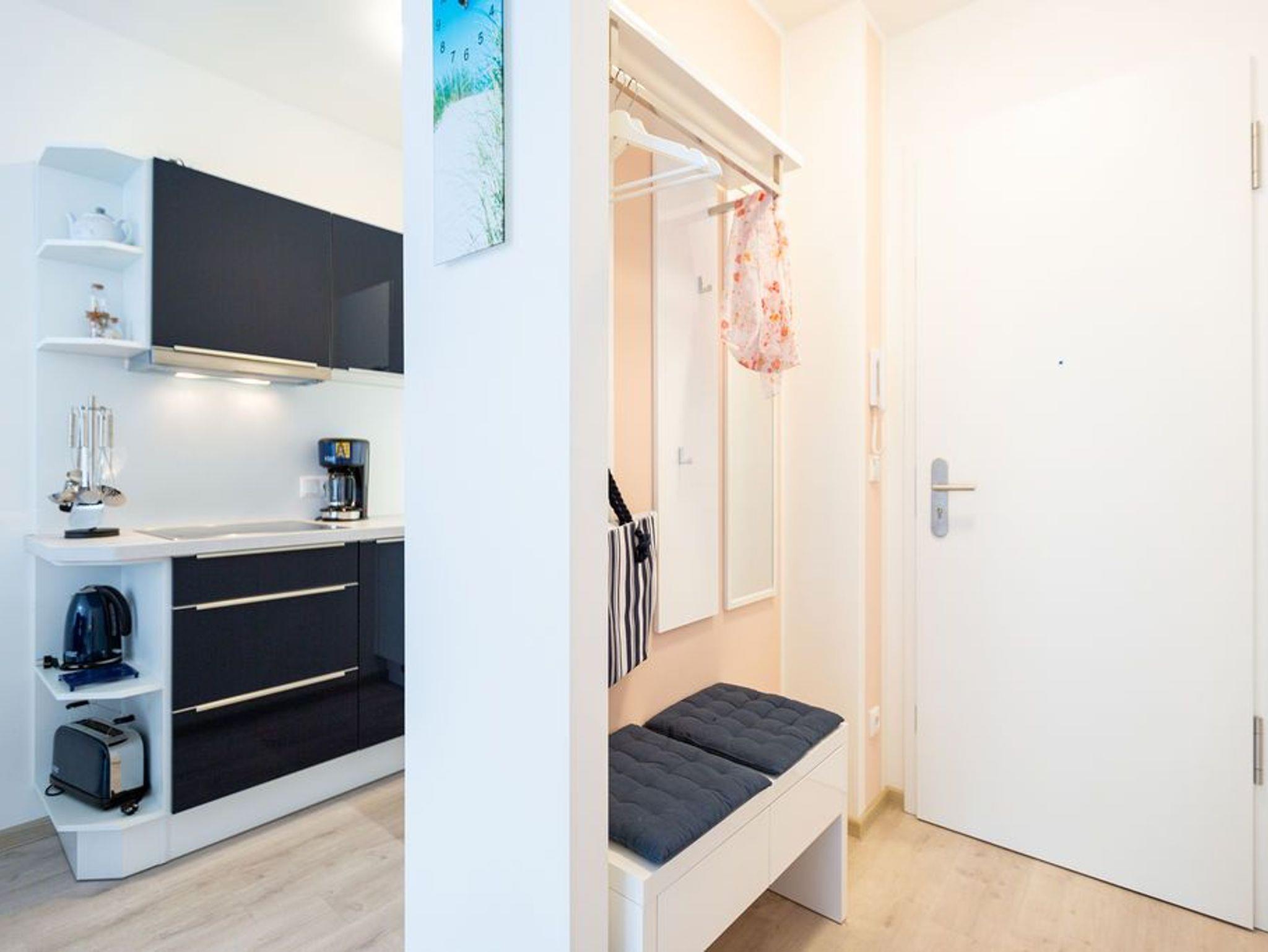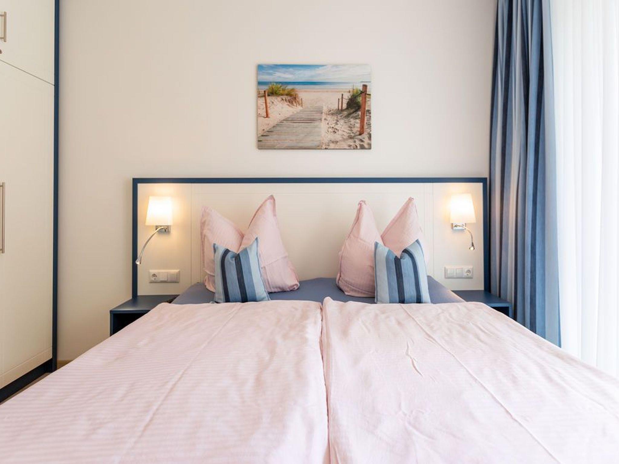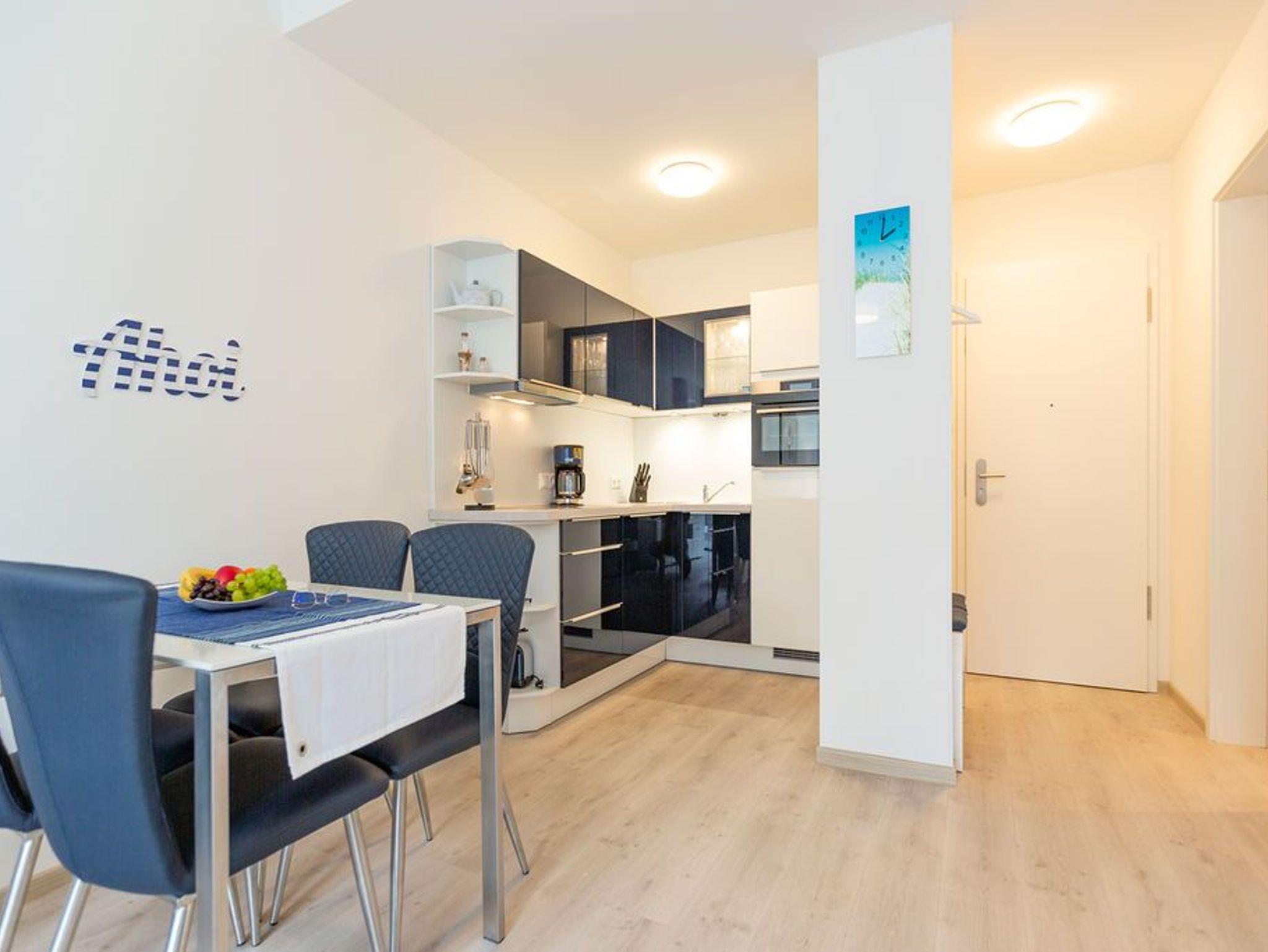 Der Ostsee ganz nah: In diesem schönen Zwei-Zimmer-Appartement in der 2. Etage können zwei Personen eine wunderbar entspannte Auszeit in absoluter Strandnähe genießen. 52 Quadratmeter ist das kleine und kuschlig maritim eingerichtete Urlaubsdomizil groß. Maritim ist auch die Farbgestaltung aus Meerblau und viel Weiß. Hell und geräumig ist das Wohn-Ess-Zimmer mit Zugang zum sonnenüberfluteten Süd-Balkon (6 Quadratmeter). Hier zu frühstücken oder abends ein kühles Getränk in der Hand, in die Weite schauen, lässt die Seele auftanken. Es sich gut gehen lassen, dafür ist das Appartement ideal. Ein Elektro-Kamin im Wohnzimmer zaubert mit Licht und Wasserdampf ein authentisches, dreidimensionales Flammenspiel - Romantik pur - und der große Flat-TV so manch spannenden Film. Wenn der Hunger kommt, bietet die offene Wohnküche alles, was Sie für die Zubereitung einer anständigen Mahlzeit benötigen. Hochwertige Markengeräte wie Herd, Spülmaschine, Kaffeemaschine oder Backofen erleichtern das Kochen und Saubermachen. Im Schlafzimmer, das ebenfalls einen Zugang zum Balkon hat, wartet ein bequemes Doppelbett (1,80 m x 2,00 m) auf die Zeit des Zubettgehens. Denn in ihm schläft es sich herrlich. Auch hier gibt es einen Flat-TV. Ein großer Schrank offeriert viele Ablageflächen für Ihre Kleidung. Auf Wunsch stellen wir für unsere kleinen Gäste ein Kinderreisebett (ohne zusätzliche Matratze [&] Bettzeug) und einen Kinderhochstuhl (gegen einen Aufpreis) zur Verfügung. Das innenliegende Bad verfügt über eine geräumige Dusche, Waschtisch und WC. Im Doppelparker (Fahrzeughöhe max. 1,90 m) in der Tiefgarage ist der Stellplatz 2.8 für Sie reserviert. Die Nutzung des WLAN-Netzes ist kostenfrei. Handtücher liegen für Sie bei Anreise bereit und auch das Bett ist bezogen.