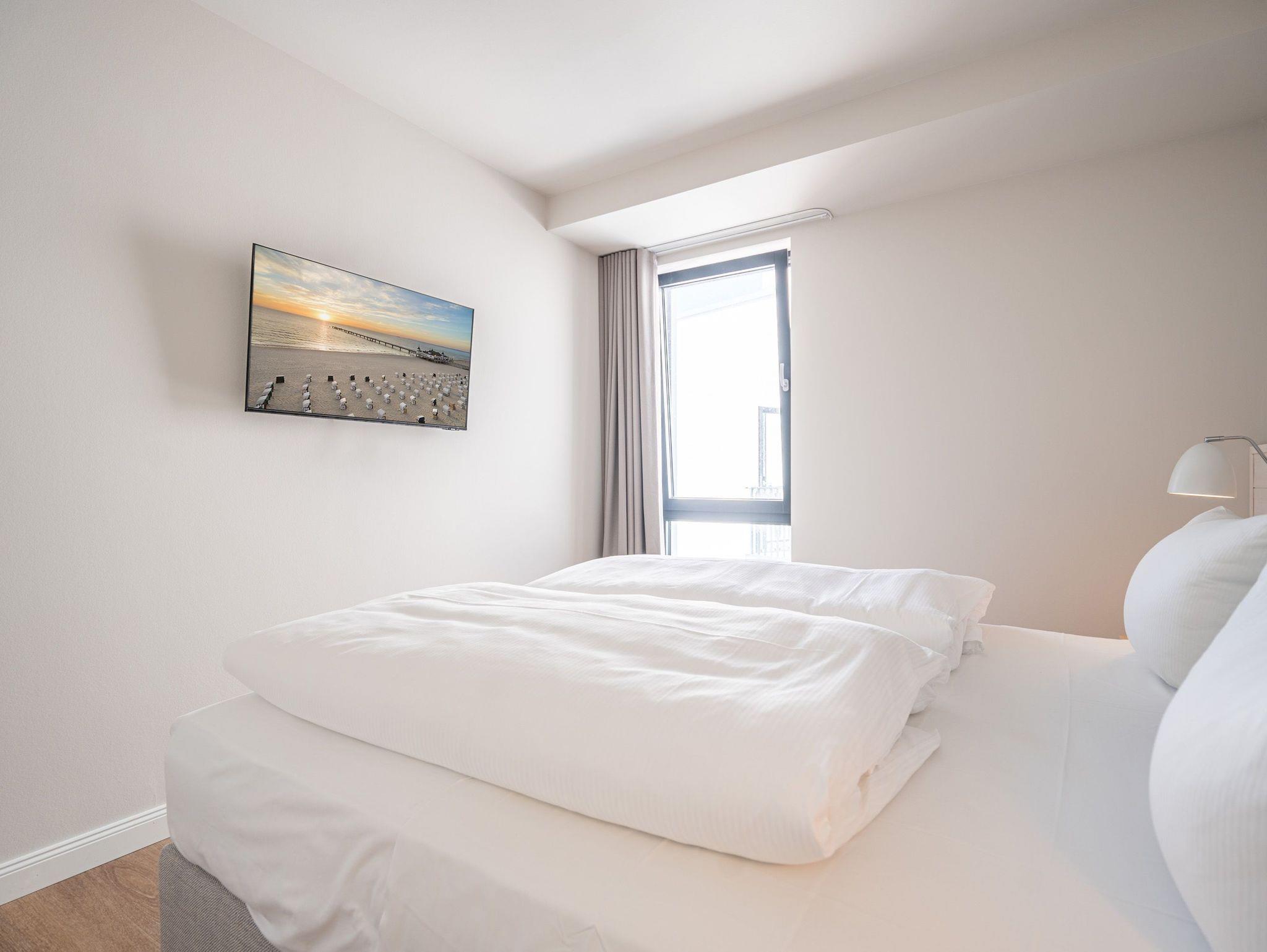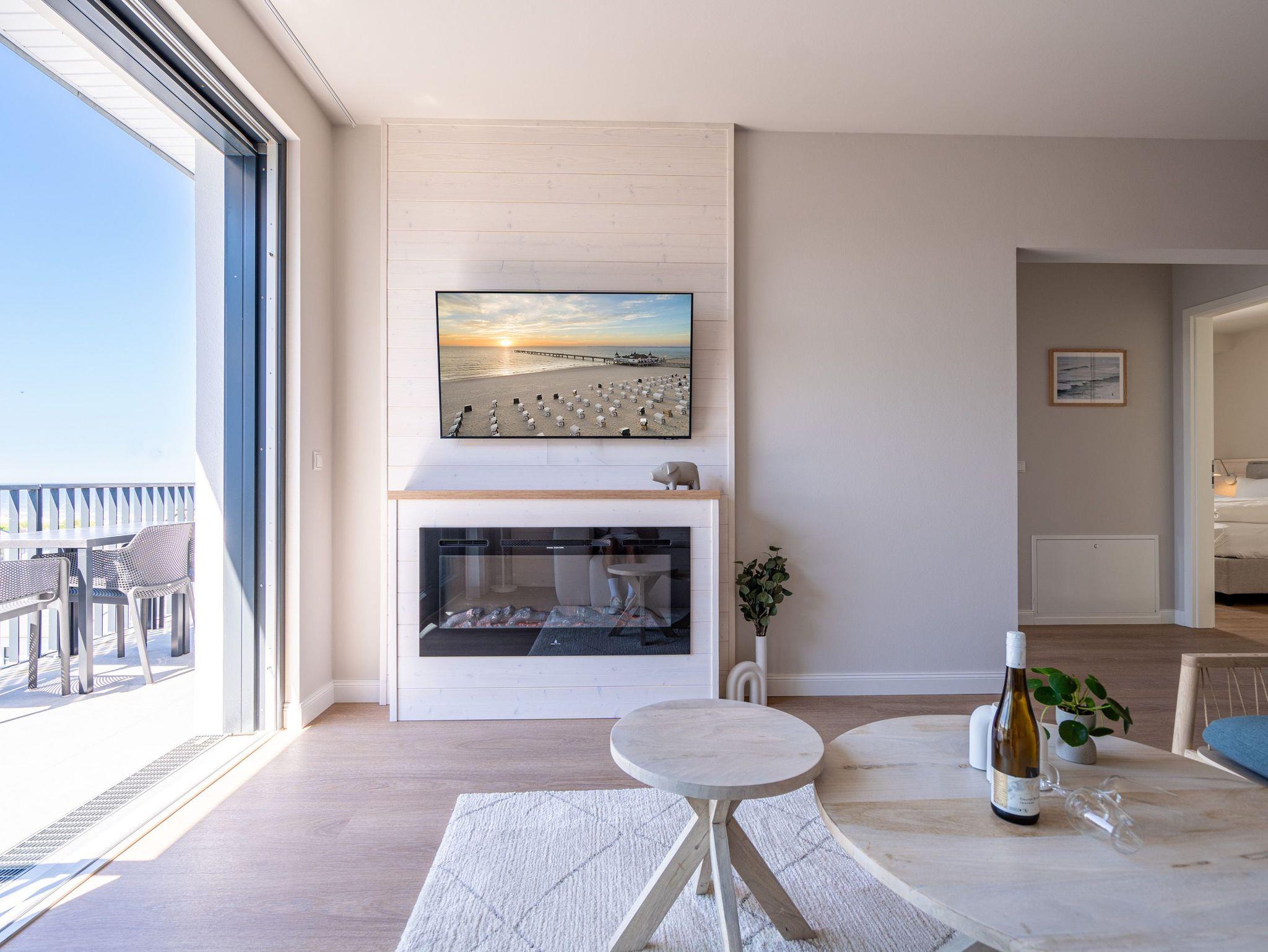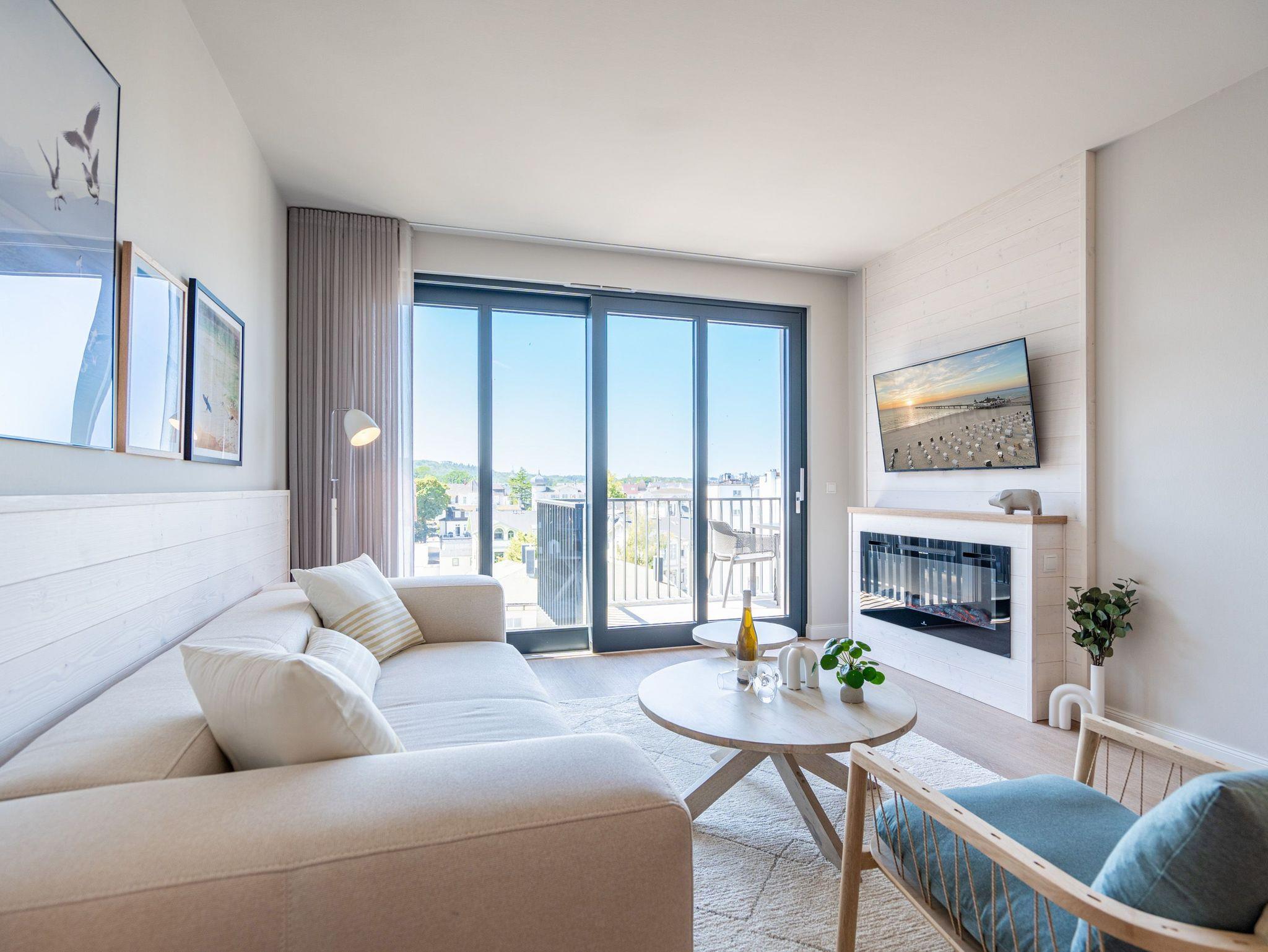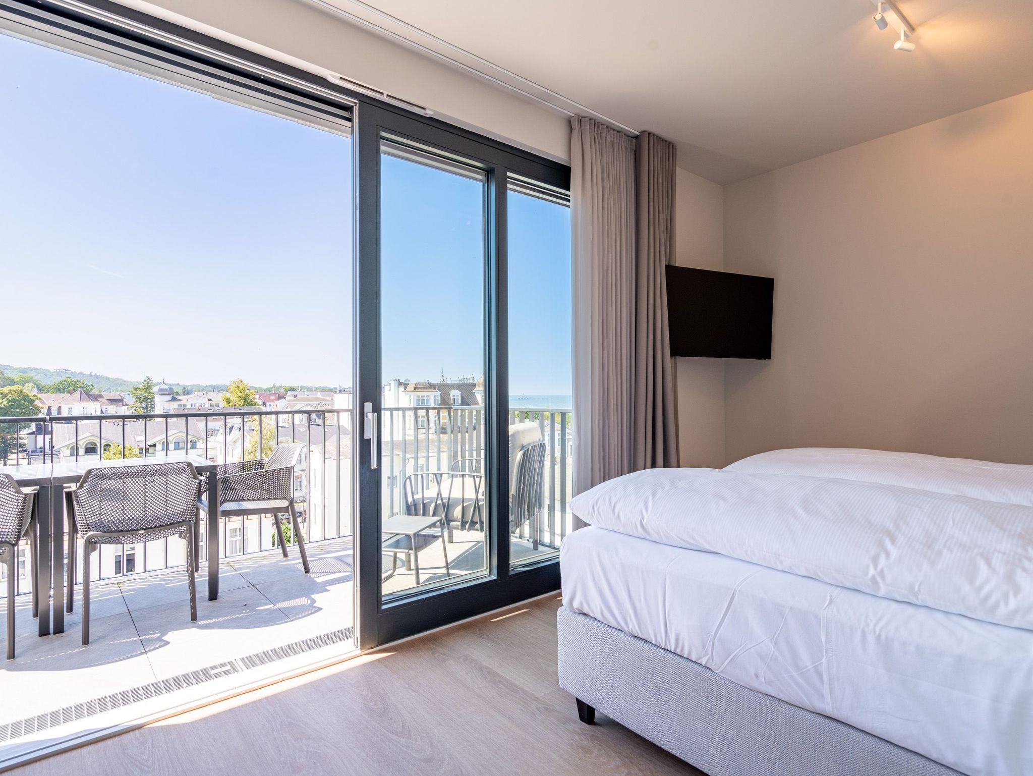 Eine Auszeit mit Aussicht ? das 3-Raum Appartement B 4.1 (Haus B) im 4. Obergeschoss der Strandterrasse bietet einen atemberaubenden Blick über die Dächer des Seebades auf die Ostsee. Viel Platz und eine wundervolle Umgebung finden bis zu 4 Personen in dem 82 Quadratmeter großen Appartement vor. Viel Platz für jede Menge Entspannung, unvergessliche Erlebnisse und gemeinsame Erinnerungen. Nordisch nobel und luxuriös ist dieses Feriendomizil außerdem eingerichtet. Hier bleiben keine Wünsche offen. Ein großzügiges Wohn-Esszimmer ist der ideale Ort für gemeinsame Mußestunden. Das stylische Sofa lädt zum ausgiebigen Relaxen ein. Eine besondere Atmosphäre zaubert der Elektrokamin (ohne Wärmeabgabe). Der 50 Zoll große Flat-TV ist Ihr persönliches Heimkino für spannende Filmabende. Für kleinere Schreibarbeiten eignet sich die ins Wohnzimmer integrierte Workingstation bestens. Am schönen Esstisch lässt es sich nicht nur wunderbar essen, sondern auch spielen oder gemütlich Zusammensitzen. Große, bis auf den Boden reichende Fenster lassen viel Licht ein. Von dem können Sie auf der Sonneninsel Usedom mit ihren knapp 2000 Sonnenstunden im Jahr gar nicht genug bekommen. Zudem schenken sie eine tolle Aussicht auf die umliegenden Villen. Vor dem Wohnzimmerfenster befindet sich ein Nord-West-Balkon. Von hier aus haben Sie einen großartigen Blick bis auf die Ostsee. Er ist mit einem Tisch und 4 Stühlen ausgestattet. Ein ideales Fleckchen zum Essen, die Sonne anbeten, in den Tag hineinleben und träumen. Viel Vergnügen wird Ihnen die offene Küchenzeile bereiten, die über hochwertige Elektrogeräte wie einen Backofen, einen 4-Platten-Induktionsherd und eine Nespresso-Kapselmaschine verfügt. Die Wohnung besitzt zwei komfortable und geräumige Schlafzimmer, die herrliche Ruhezonen sind. Eines von ihnen hat sogar Zugang zum Balkon, so dass Sie schon gleich nach dem Aufstehen eine Brise frischer Seeluft einatmen können. Ob Boxspringdoppelbett (1,80m x 2,00m), großer Kleiderschrank mit integriertem Nachttisch oder ein Flat-TV (43 Zoll) ? in beiden Schlafzimmern fehlt es an nichts. Auch zwei moderne Duschbäder gehören zum Appartement. Ausgestattet mit Dusche, Waschtisch und WC bieten Sie allen Komfort für eine entspannende Privatsphäre. Sie sind Saunagänger und lieben die wohlige Wärme an kühlen Tagen? Dann können Sie sich auf eine Infrarotsaunakabine freuen, die in eines der Bäder eingebaut ist. Hier können Sie erlebnisreiche Tage ausklingen lassen und neue Energie tanken. Auch für Ihr Auto ist gesorgt. Stellen Sie es einfach auf dem zur Wohnung gehörenden Stellplatz in der Tiefgarage ab. Willkommen in diesem traumhaft schönen Urlaubsparadies. Genießen Sie Ihre Zeit hier.