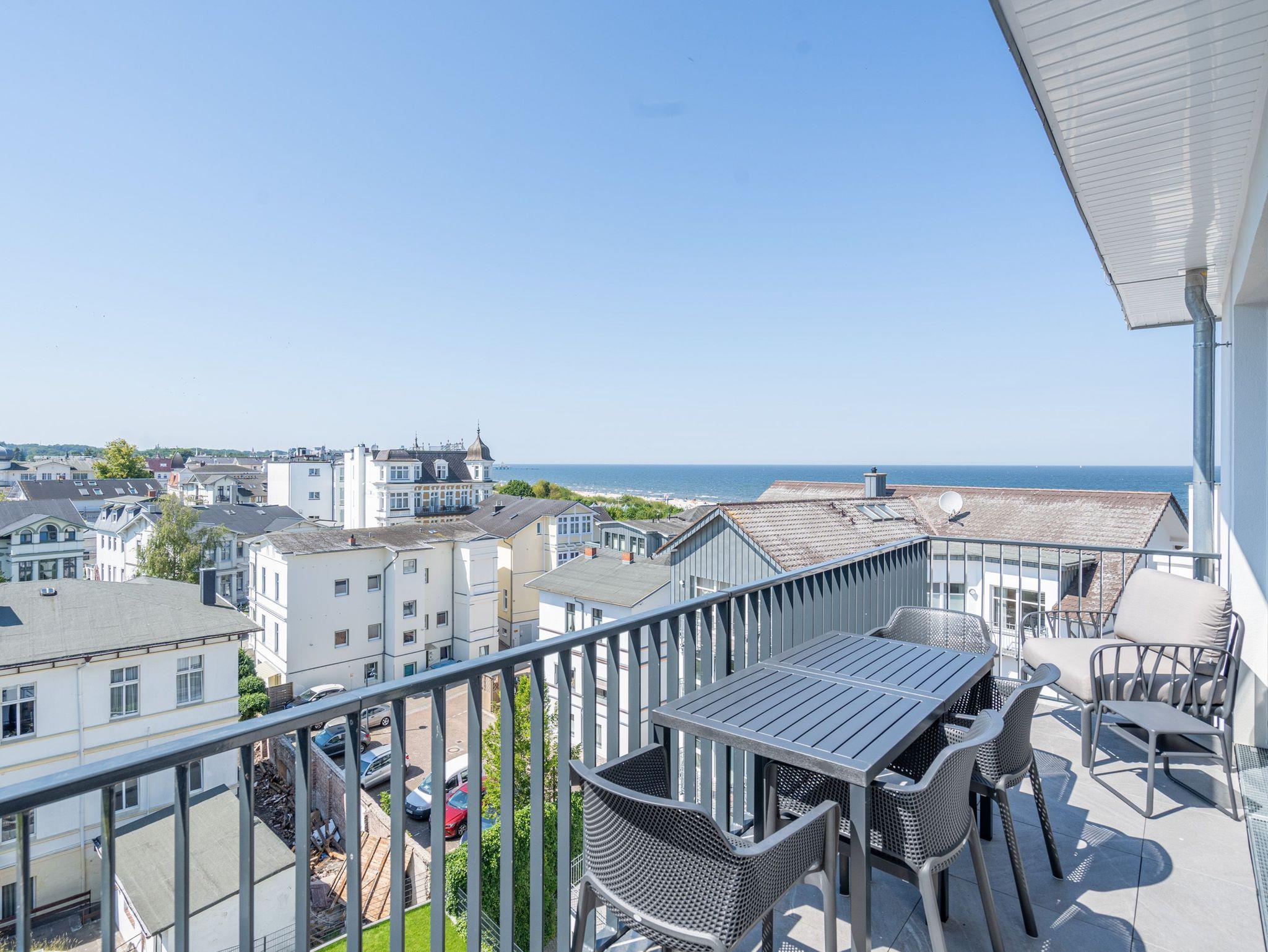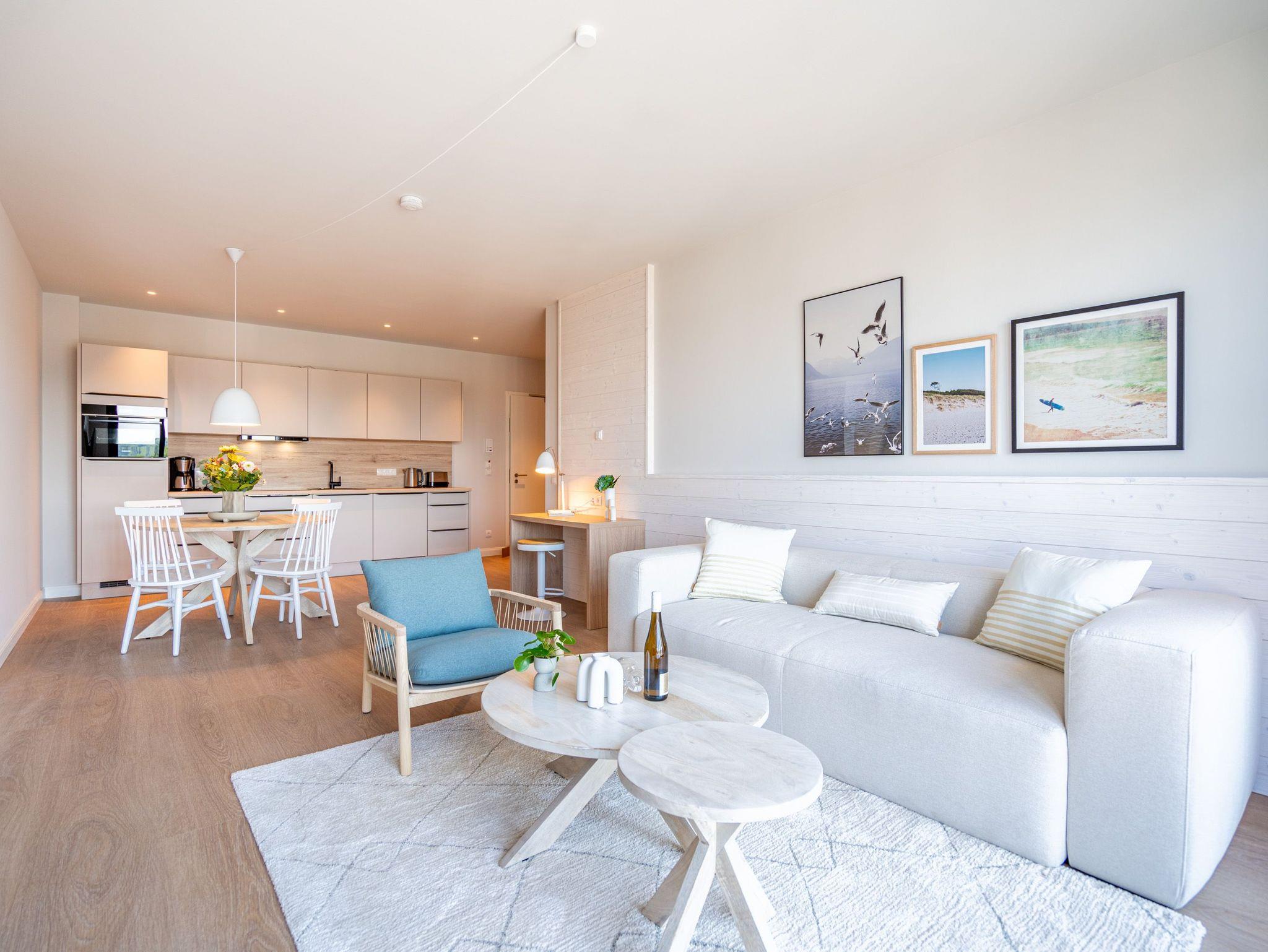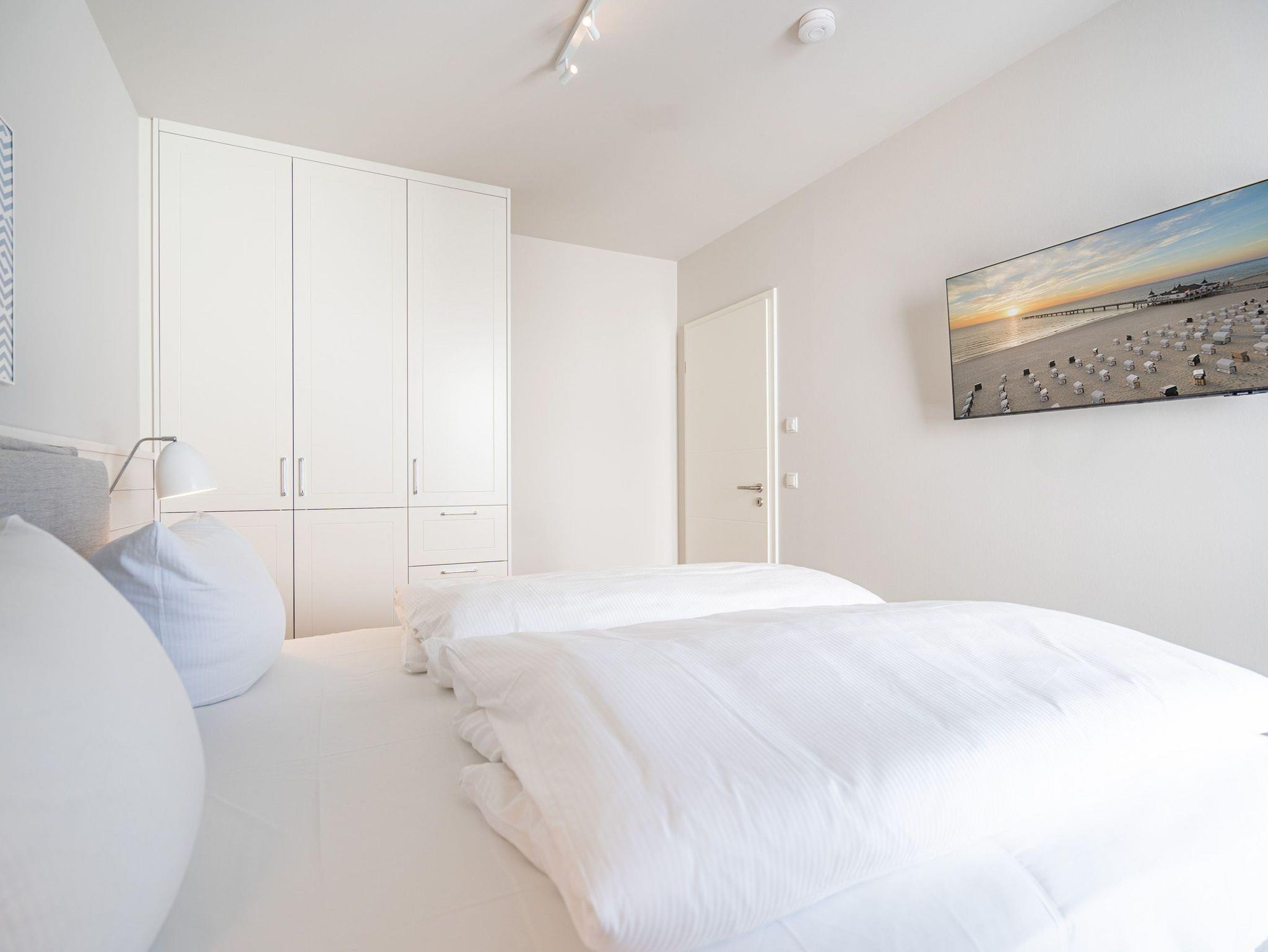 Eine Auszeit mit Aussicht ? das 3-Raum Appartement B 4.1 (Haus B) im 4. Obergeschoss der Strandterrasse bietet einen atemberaubenden Blick über die Dächer des Seebades auf die Ostsee. Viel Platz und eine wundervolle Umgebung finden bis zu 4 Personen in dem 82 Quadratmeter großen Appartement vor. Viel Platz für jede Menge Entspannung, unvergessliche Erlebnisse und gemeinsame Erinnerungen. Nordisch nobel und luxuriös ist dieses Feriendomizil außerdem eingerichtet. Hier bleiben keine Wünsche offen. Ein großzügiges Wohn-Esszimmer ist der ideale Ort für gemeinsame Mußestunden. Das stylische Sofa lädt zum ausgiebigen Relaxen ein. Eine besondere Atmosphäre zaubert der Elektrokamin (ohne Wärmeabgabe). Der 50 Zoll große Flat-TV ist Ihr persönliches Heimkino für spannende Filmabende. Für kleinere Schreibarbeiten eignet sich die ins Wohnzimmer integrierte Workingstation bestens. Am schönen Esstisch lässt es sich nicht nur wunderbar essen, sondern auch spielen oder gemütlich Zusammensitzen. Große, bis auf den Boden reichende Fenster lassen viel Licht ein. Von dem können Sie auf der Sonneninsel Usedom mit ihren knapp 2000 Sonnenstunden im Jahr gar nicht genug bekommen. Zudem schenken sie eine tolle Aussicht auf die umliegenden Villen. Vor dem Wohnzimmerfenster befindet sich ein Nord-West-Balkon. Von hier aus haben Sie einen großartigen Blick bis auf die Ostsee. Er ist mit einem Tisch und 4 Stühlen ausgestattet. Ein ideales Fleckchen zum Essen, die Sonne anbeten, in den Tag hineinleben und träumen. Viel Vergnügen wird Ihnen die offene Küchenzeile bereiten, die über hochwertige Elektrogeräte wie einen Backofen, einen 4-Platten-Induktionsherd und eine Nespresso-Kapselmaschine verfügt. Die Wohnung besitzt zwei komfortable und geräumige Schlafzimmer, die herrliche Ruhezonen sind. Eines von ihnen hat sogar Zugang zum Balkon, so dass Sie schon gleich nach dem Aufstehen eine Brise frischer Seeluft einatmen können. Ob Boxspringdoppelbett (1,80m x 2,00m), großer Kleiderschrank mit integriertem Nachttisch oder ein Flat-TV (43 Zoll) ? in beiden Schlafzimmern fehlt es an nichts. Auch zwei moderne Duschbäder gehören zum Appartement. Ausgestattet mit Dusche, Waschtisch und WC bieten Sie allen Komfort für eine entspannende Privatsphäre. Sie sind Saunagänger und lieben die wohlige Wärme an kühlen Tagen? Dann können Sie sich auf eine Infrarotsaunakabine freuen, die in eines der Bäder eingebaut ist. Hier können Sie erlebnisreiche Tage ausklingen lassen und neue Energie tanken. Auch für Ihr Auto ist gesorgt. Stellen Sie es einfach auf dem zur Wohnung gehörenden Stellplatz in der Tiefgarage ab. Willkommen in diesem traumhaft schönen Urlaubsparadies. Genießen Sie Ihre Zeit hier.