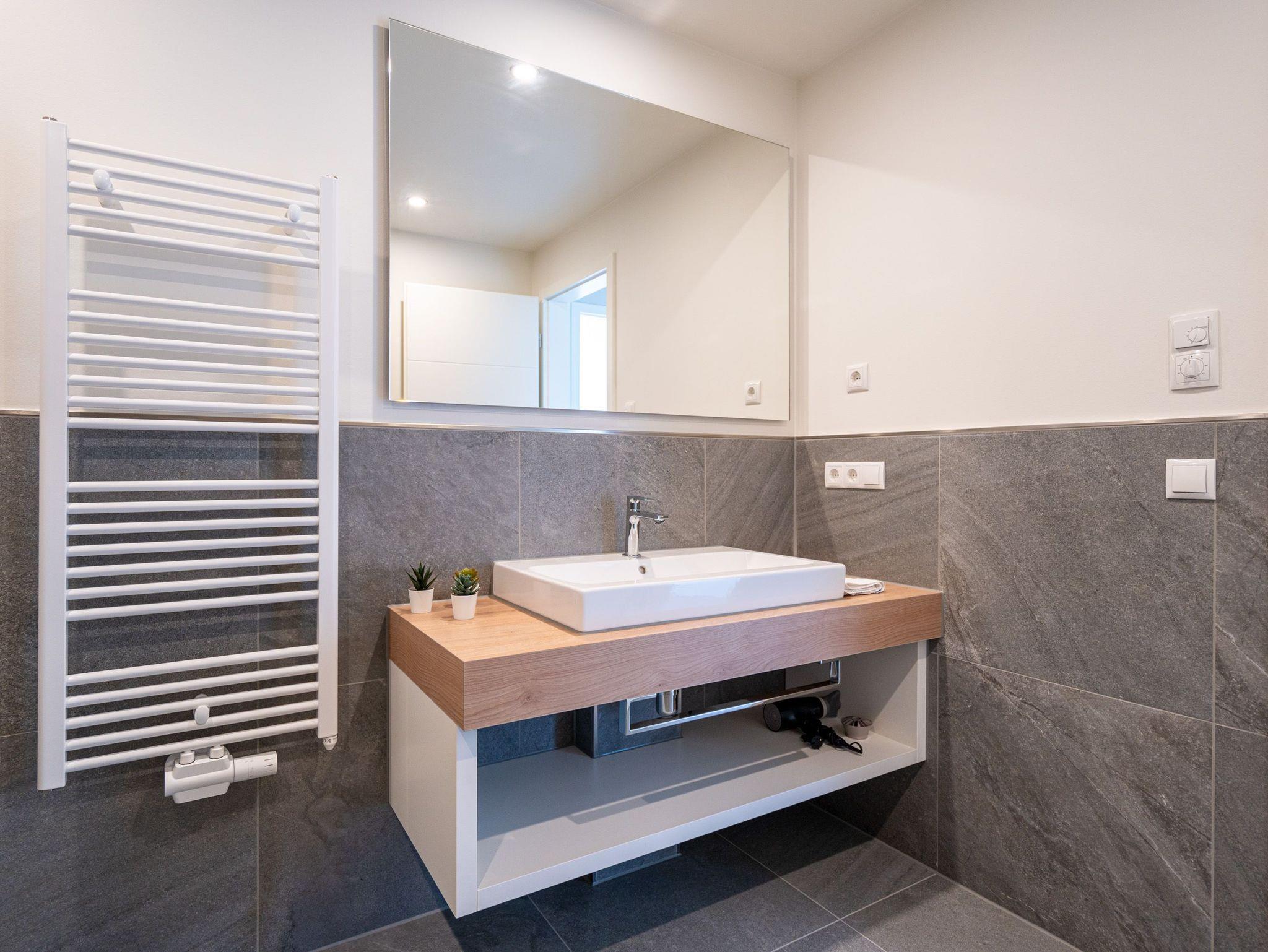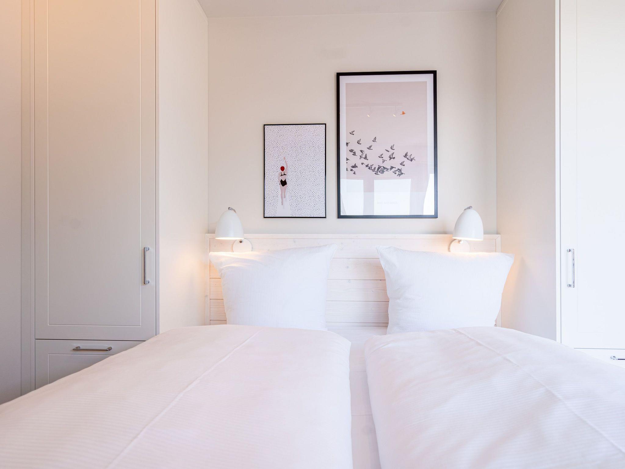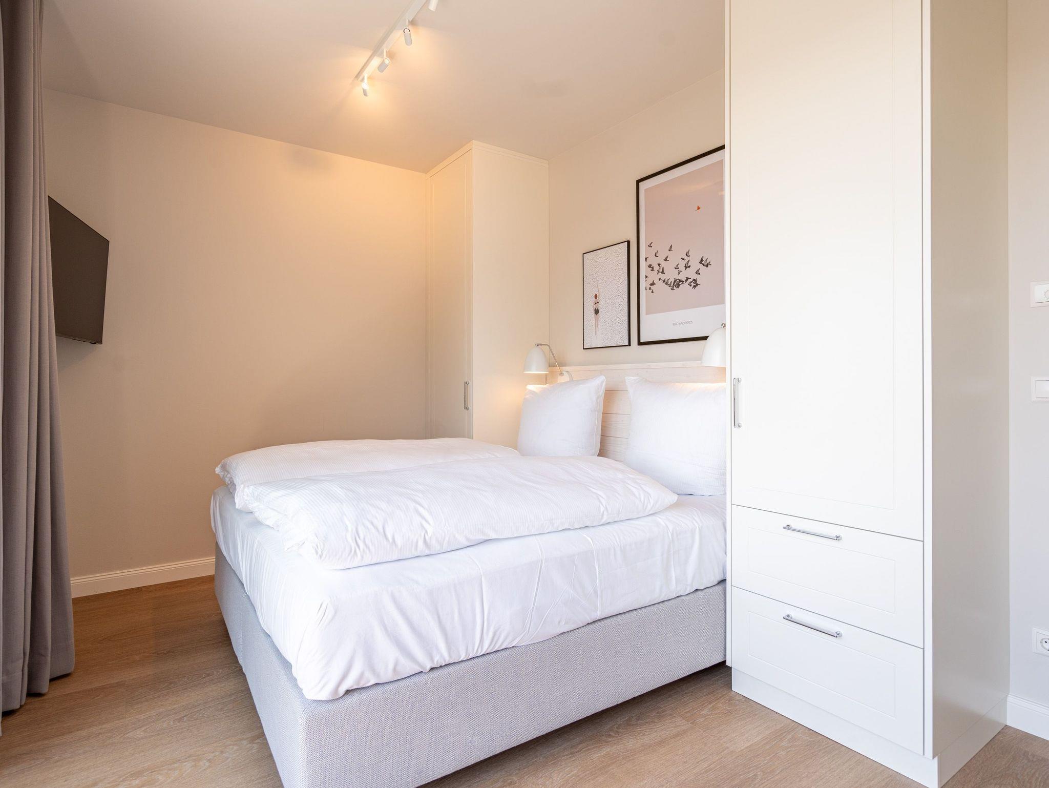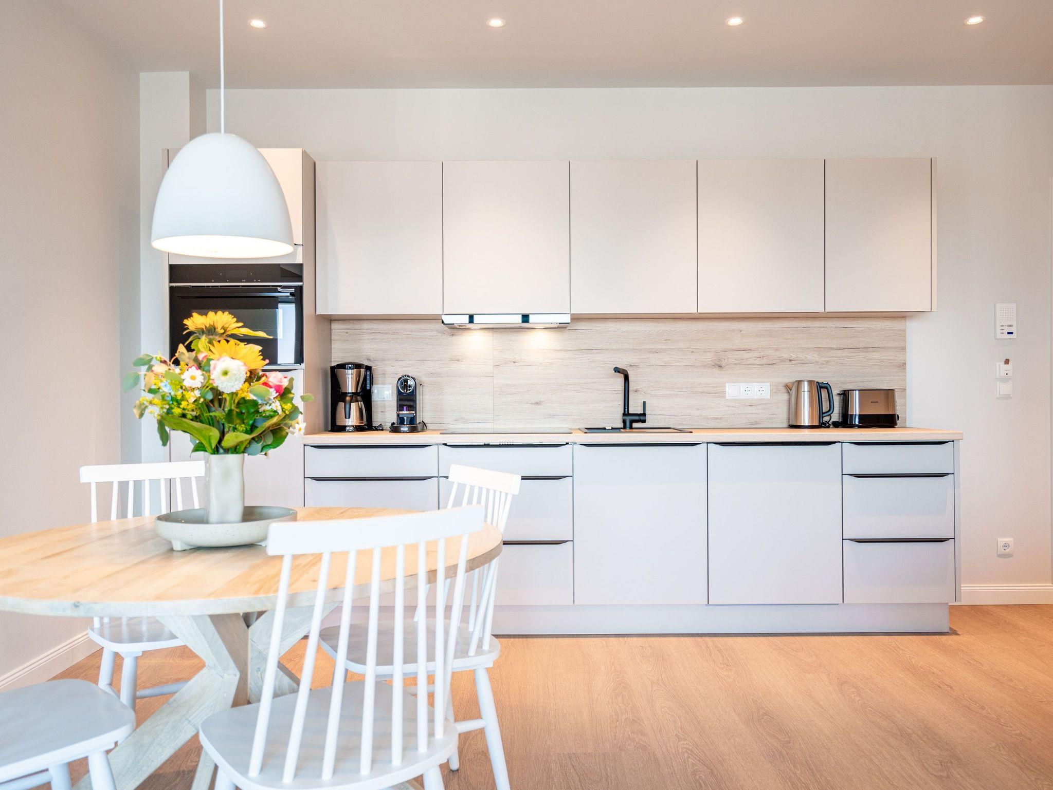 Eine Auszeit mit Aussicht ? das 3-Raum Appartement B 4.1 (Haus B) im 4. Obergeschoss der Strandterrasse bietet einen atemberaubenden Blick über die Dächer des Seebades auf die Ostsee. Viel Platz und eine wundervolle Umgebung finden bis zu 4 Personen in dem 82 Quadratmeter großen Appartement vor. Viel Platz für jede Menge Entspannung, unvergessliche Erlebnisse und gemeinsame Erinnerungen. Nordisch nobel und luxuriös ist dieses Feriendomizil außerdem eingerichtet. Hier bleiben keine Wünsche offen. Ein großzügiges Wohn-Esszimmer ist der ideale Ort für gemeinsame Mußestunden. Das stylische Sofa lädt zum ausgiebigen Relaxen ein. Eine besondere Atmosphäre zaubert der Elektrokamin (ohne Wärmeabgabe). Der 50 Zoll große Flat-TV ist Ihr persönliches Heimkino für spannende Filmabende. Für kleinere Schreibarbeiten eignet sich die ins Wohnzimmer integrierte Workingstation bestens. Am schönen Esstisch lässt es sich nicht nur wunderbar essen, sondern auch spielen oder gemütlich Zusammensitzen. Große, bis auf den Boden reichende Fenster lassen viel Licht ein. Von dem können Sie auf der Sonneninsel Usedom mit ihren knapp 2000 Sonnenstunden im Jahr gar nicht genug bekommen. Zudem schenken sie eine tolle Aussicht auf die umliegenden Villen. Vor dem Wohnzimmerfenster befindet sich ein Nord-West-Balkon. Von hier aus haben Sie einen großartigen Blick bis auf die Ostsee. Er ist mit einem Tisch und 4 Stühlen ausgestattet. Ein ideales Fleckchen zum Essen, die Sonne anbeten, in den Tag hineinleben und träumen. Viel Vergnügen wird Ihnen die offene Küchenzeile bereiten, die über hochwertige Elektrogeräte wie einen Backofen, einen 4-Platten-Induktionsherd und eine Nespresso-Kapselmaschine verfügt. Die Wohnung besitzt zwei komfortable und geräumige Schlafzimmer, die herrliche Ruhezonen sind. Eines von ihnen hat sogar Zugang zum Balkon, so dass Sie schon gleich nach dem Aufstehen eine Brise frischer Seeluft einatmen können. Ob Boxspringdoppelbett (1,80m x 2,00m), großer Kleiderschrank mit integriertem Nachttisch oder ein Flat-TV (43 Zoll) ? in beiden Schlafzimmern fehlt es an nichts. Auch zwei moderne Duschbäder gehören zum Appartement. Ausgestattet mit Dusche, Waschtisch und WC bieten Sie allen Komfort für eine entspannende Privatsphäre. Sie sind Saunagänger und lieben die wohlige Wärme an kühlen Tagen? Dann können Sie sich auf eine Infrarotsaunakabine freuen, die in eines der Bäder eingebaut ist. Hier können Sie erlebnisreiche Tage ausklingen lassen und neue Energie tanken. Auch für Ihr Auto ist gesorgt. Stellen Sie es einfach auf dem zur Wohnung gehörenden Stellplatz in der Tiefgarage ab. Willkommen in diesem traumhaft schönen Urlaubsparadies. Genießen Sie Ihre Zeit hier.