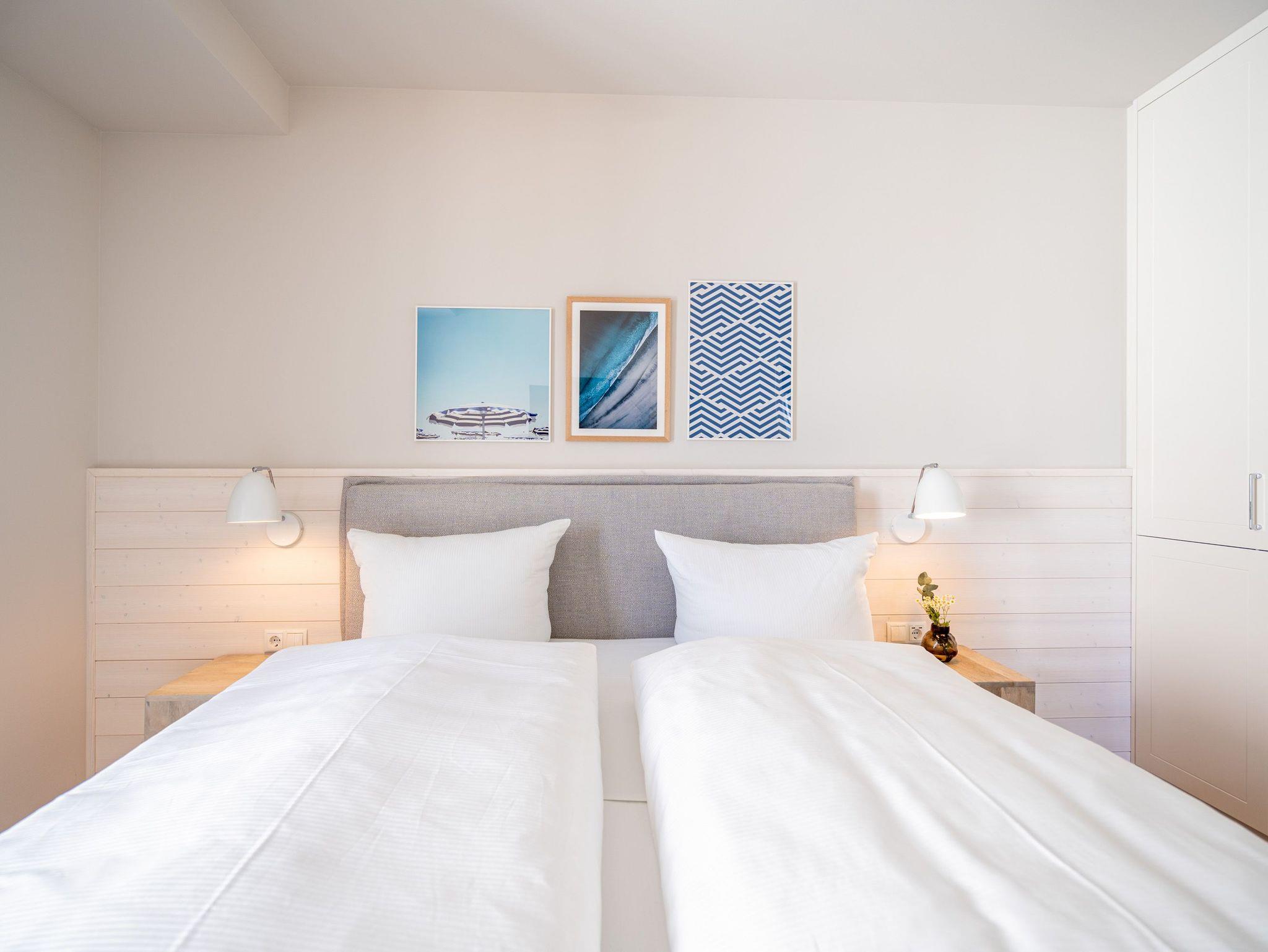Die 2024 fertig gestellte Strandterrasse liegt direkt an der belebten Strandpromenade und bietet einen einzigartigen Ausblick auf die Grand Dame der historischen Seebrücken sowie die historische Konzertmuschel, einem beliebten Treffpunkt für Kunst und Kultur. Dahinter liegt die Ostsee ? ein Panorama, das zu den schönsten in den Kaiserbädern gehört. Es ist wie das Abtauchen in eine andere Zeit. In eine Zeit, in der man mit Stock, Sonnenschirm und Hut fürs „Sehen und gesehen werden“ über die Promenade schlenderte; aber auch in eine Zeit, in der ? damals wie heute ? Zeit einmal für eine kurze Weile keine Rolle spielt. Weil man angekommen ist im Loslassen, Entspannen und Genießen. Es ist dieser besondere Geruch nach Meeresluft und Freiheit, der in Erinnerung bleibt. Dazu die Bilder, die man mitnimmt. Von langen Strandspaziergängen, vom Lachen in fröhlich schäumenden Ostseewellen, von der Zeit in einem wunderschönen Urlaubsdomizil. Denn genau das ist die Strandterrasse mit ihren 56 modernen und exklusiven Ferienappartements direkt gegenüber der Ahlbecker Seebrücke. Die Ein-, Zwei- oder Dreizimmerwohnungen ? zwischen 40 und 70 Quadratmeter groß ? sind von einer Innenarchitektin gemeinsam mit unserem Erfahrungsschatz an Gästewünschen mit viel Liebe zum Detail und ganz individuell konzipiert worden. Entspannung und Wohlfühlen stehen an erster Stelle. Alles ist aufeinander abgestimmt und sorgt für eine gemütliche Atmosphäre. Wählen Sie zwischen einem Domizil in einem hellen, sandfarbenen Designkonzept oder einem Appartement mit anthrazitfarbenen Farbakzenten. Alle Appartements verfügen gleichermaßen über eine stilvolle und komfortable Einrichtung, die passgenau angefertigt worden ist, sowie über moderne Küchen und Bäder. Jedem Schlafzimmer ist ein eigenes Bad mit Dusche zugeordnet (außer App. B4.5). Die Appartements besitzen fast alle einen Balkon ? viele schauen sogar zur Ostsee hinaus. Die meisten Feriendomizile haben einen Elektrokamin und Infrarotsaunen. Im Erdgeschoss befindet sich ein separater Gemeinschaftsraum für Fahrräder. Außerdem besteht die Möglichkeit, im Gemeinschaftswaschraum 2 Waschmaschinen [&] Trockner zu nutzen. Ergänzt wird das Angebot durch eine Gemeinschaftssauna, die täglich von 11:00 bis 22:00 Uhr nutzbar ist. In der Tiefgarage (Einfahrtshöhe 2,03 Meter) steht für jede Wohnung 1 Pkw-Stellplatz zur Verfügung. Ist alles zur Zufriedenheit untergebracht? Dann kann der Urlaub ja beginnen. Und beim Blick vom Balkon über die Ostsee treffen sich zum Sonnenaufgang das Heute und das Damals. Gelassenheit legt sich beim Gang hinunter an den Strand auf die Seele. Jetzt darf die Zeit stehenbleiben.