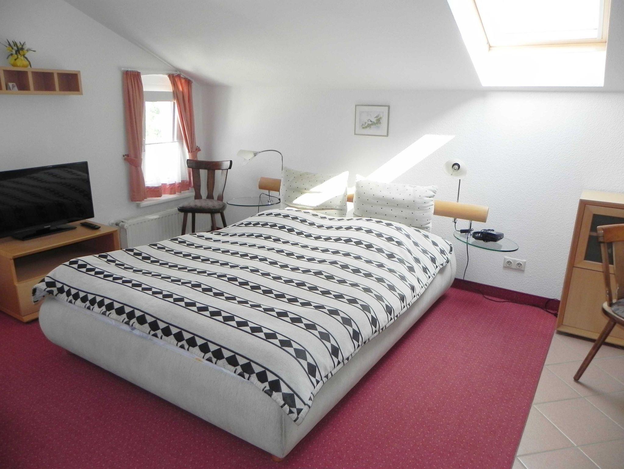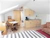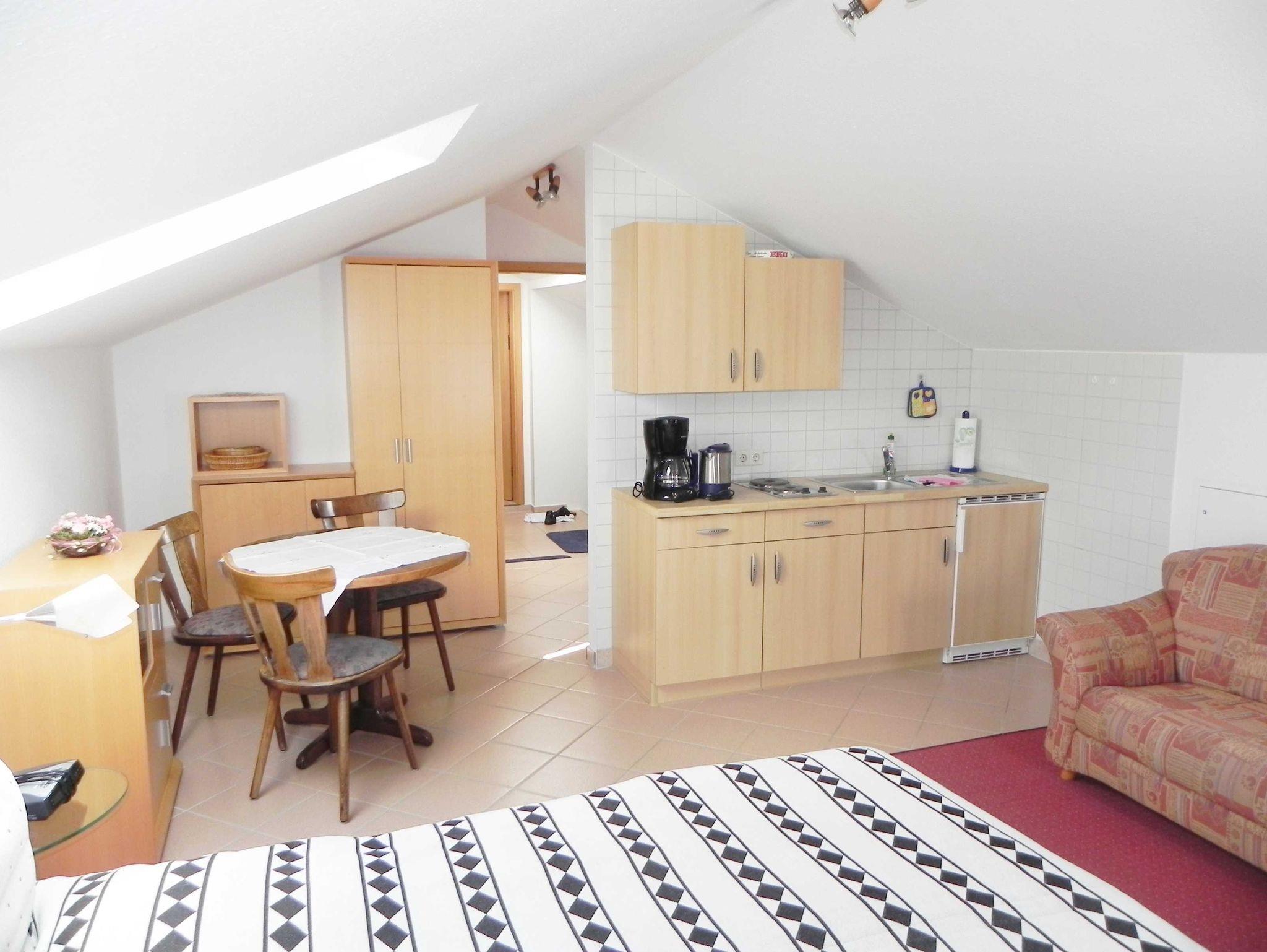 Die 35 qm große Wohnung in der Mansarde (drittes Obergeschoss) bietet komfortabel Platz für zwei Personen. Der helle Wohn-/Schlafraum ist mit einem Doppelbett, einem Sofa, Kabel-TV und einem kleinen Essplatz gemütlich eingerichtet - ideal für entspannte Stunden. Die angrenzende, gut ausgestattete Pantryküche mit 2-Platten-Herd, Kühlschrank, Wasserkocher und Kaffeemaschine ermöglicht eine bequeme Selbstversorgung. Abgerundet wird die Wohnung durch ein freundliches Tageslicht-Bad mit Dusche und WC, das den Komfort Ihres Aufenthalts perfekt ergänzt.Für Urlaubsgrüße in die Heimat steht das WLAN steht kostenfrei zur Verfügung.