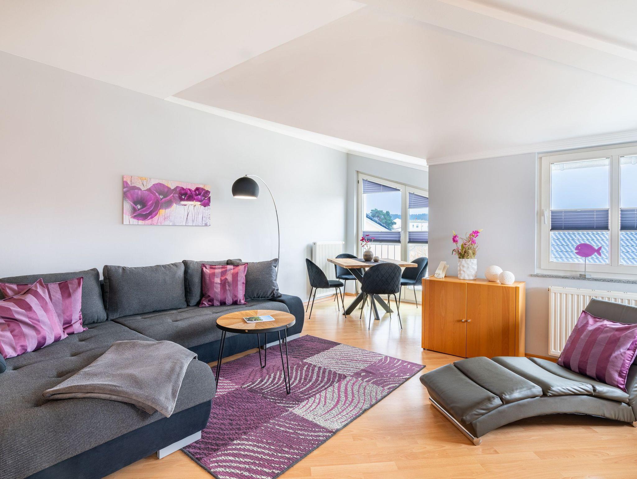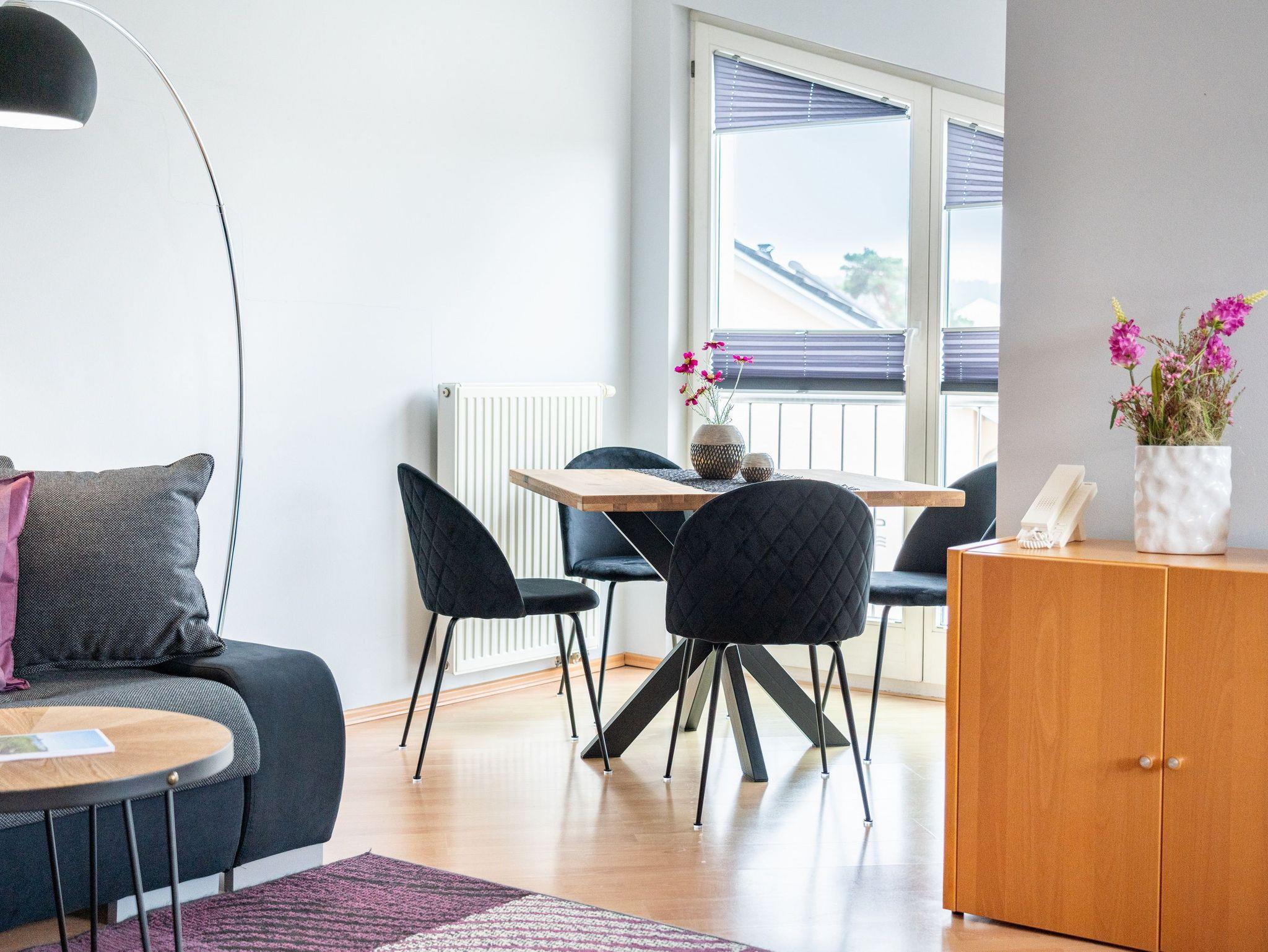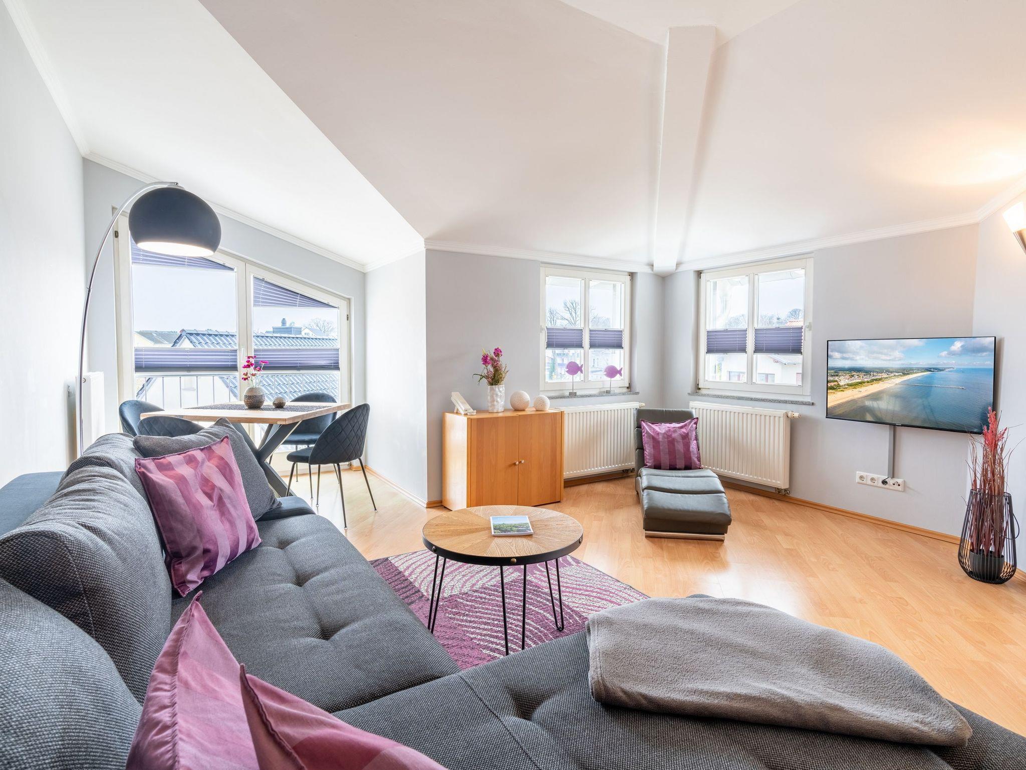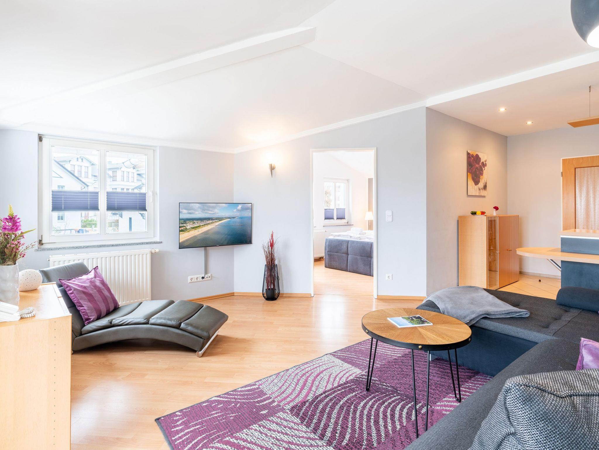 Das Appartement liegt im 2. Obergeschoss des Neubaus und bietet auf 55 m² ein modernes, freundliches Zuhause auf Zeit. Der Wohnraum ist hell gestaltet, mit einem gemütlichen Sofa zum Ankommen, Lesen oder für einen entspannten Serienabend. In den Wohnbereich ist eine hochwertige Küchenzeile integriert, die mit allem ausgestattet ist, was man im Urlaub wirklich braucht Ceranfeld mit vier Kochfeldern, Kühlschrank mit Gefrierfach, Geschirrspüler, Mikrowelle, Mini-Backofen, Wasserkocher, Toaster und Kaffeemaschine.