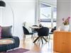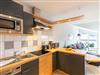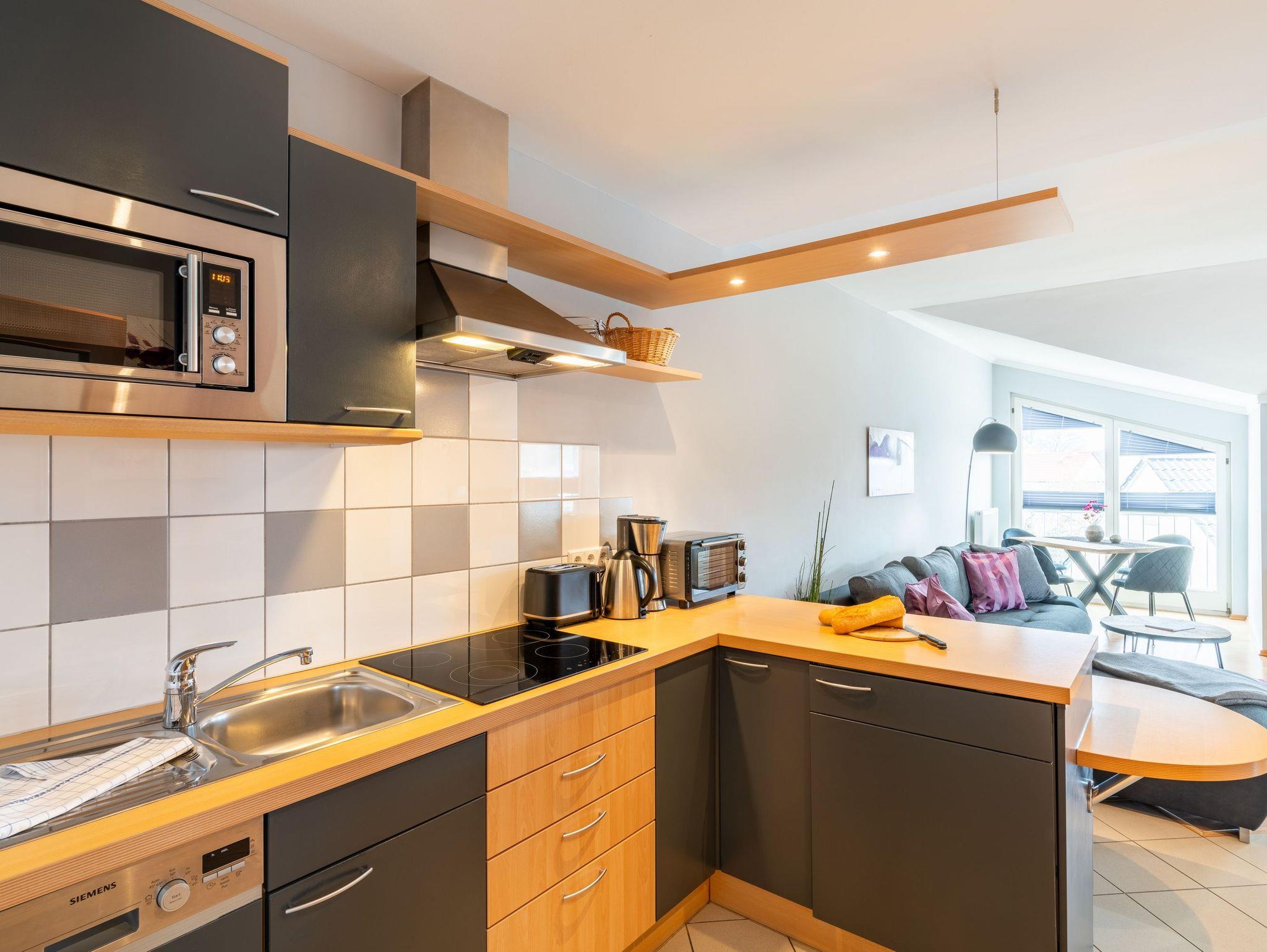 Das Appartement liegt im 2. Obergeschoss des Neubaus und bietet auf 55 m² ein modernes, freundliches Zuhause auf Zeit. Der Wohnraum ist hell gestaltet, mit einem gemütlichen Sofa zum Ankommen, Lesen oder für einen entspannten Serienabend. In den Wohnbereich ist eine hochwertige Küchenzeile integriert, die mit allem ausgestattet ist, was man im Urlaub wirklich braucht ? Ceranfeld mit vier Kochfeldern, Kühlschrank mit Gefrierfach, Geschirrspüler, Mikrowelle, Mini-Backofen, Wasserkocher, Toaster und Kaffeemaschine.