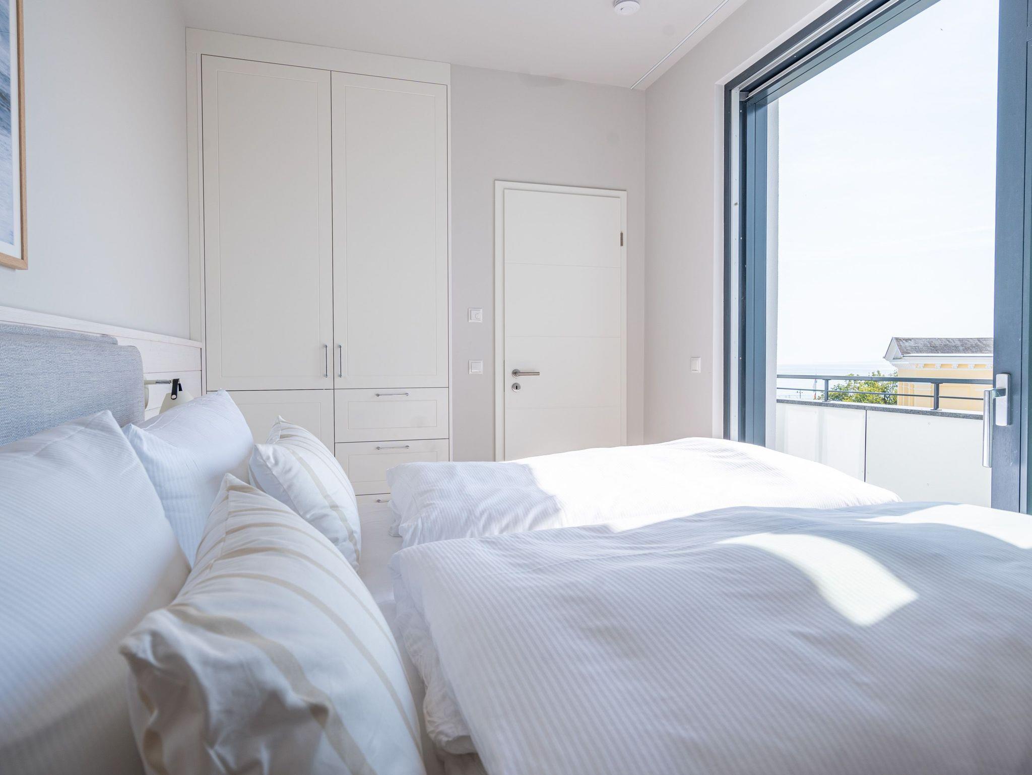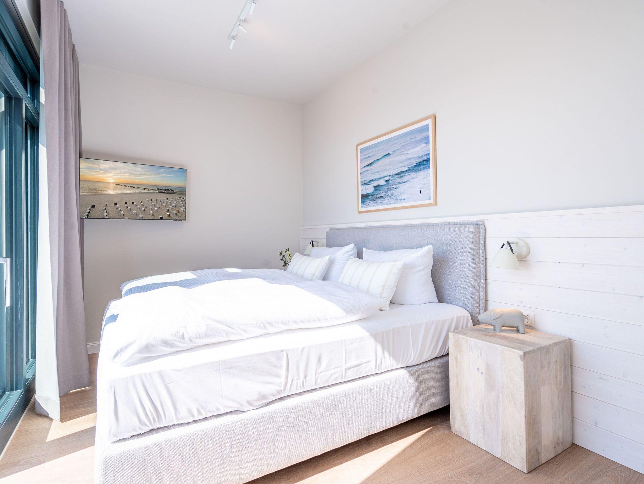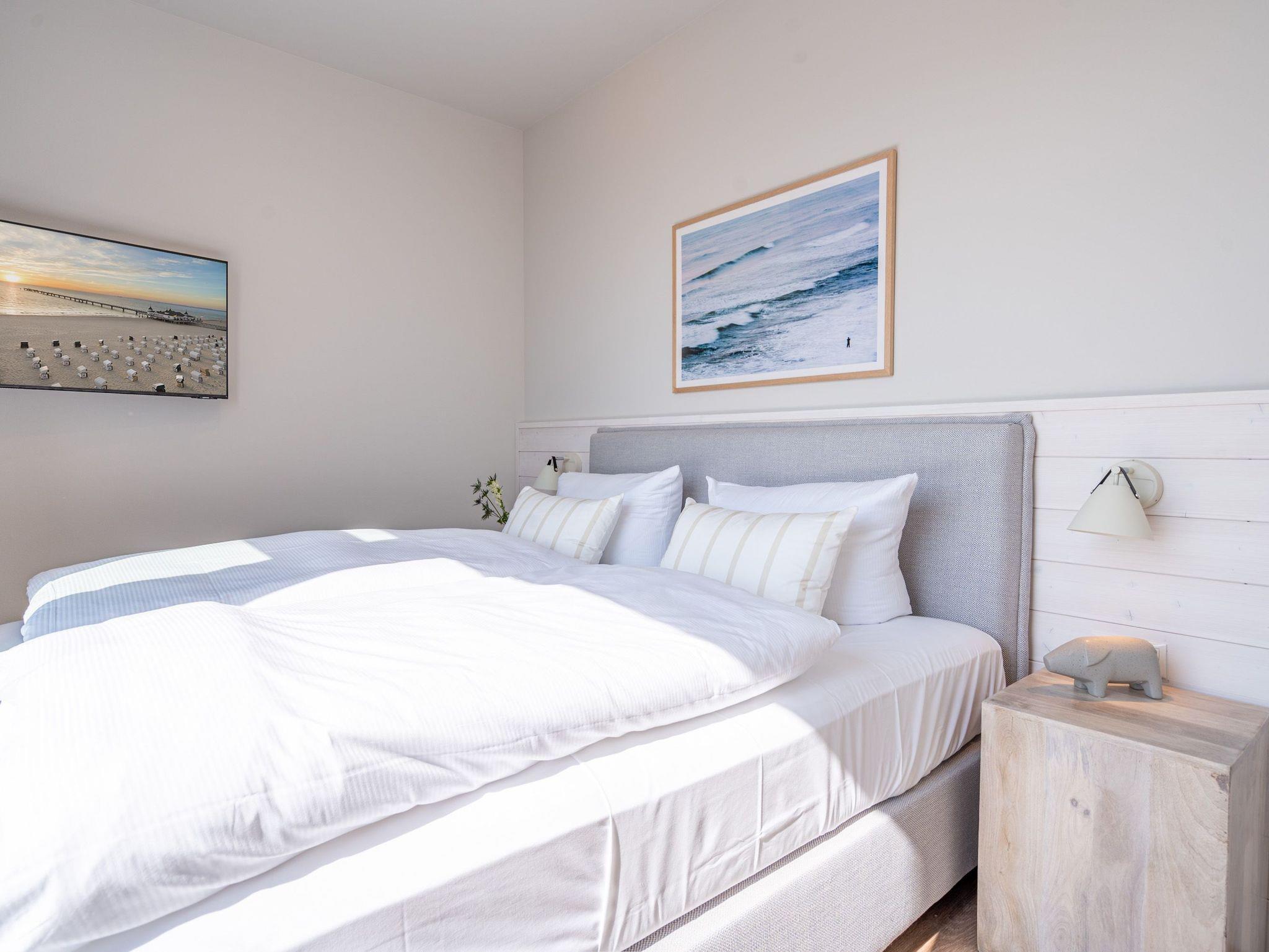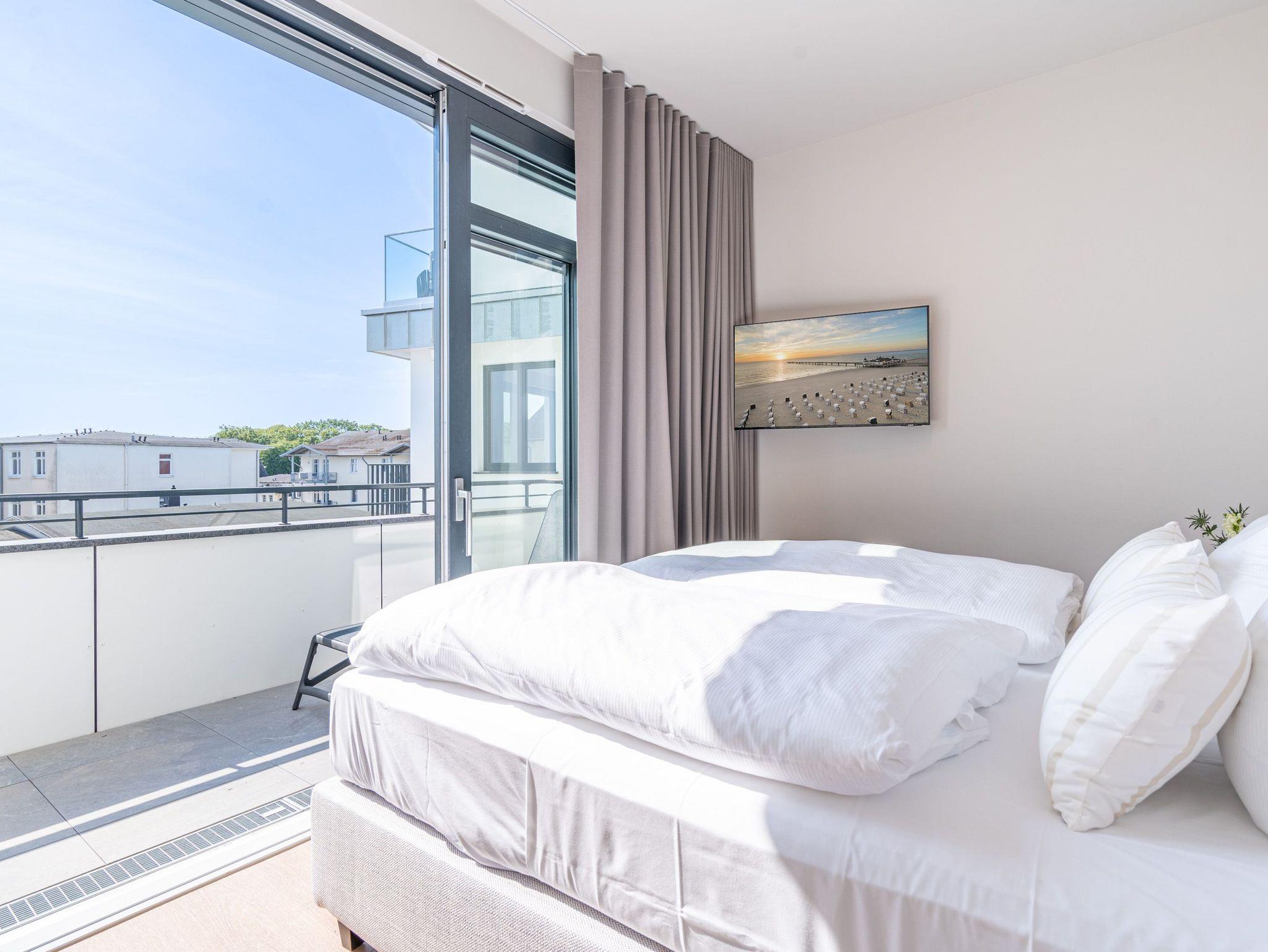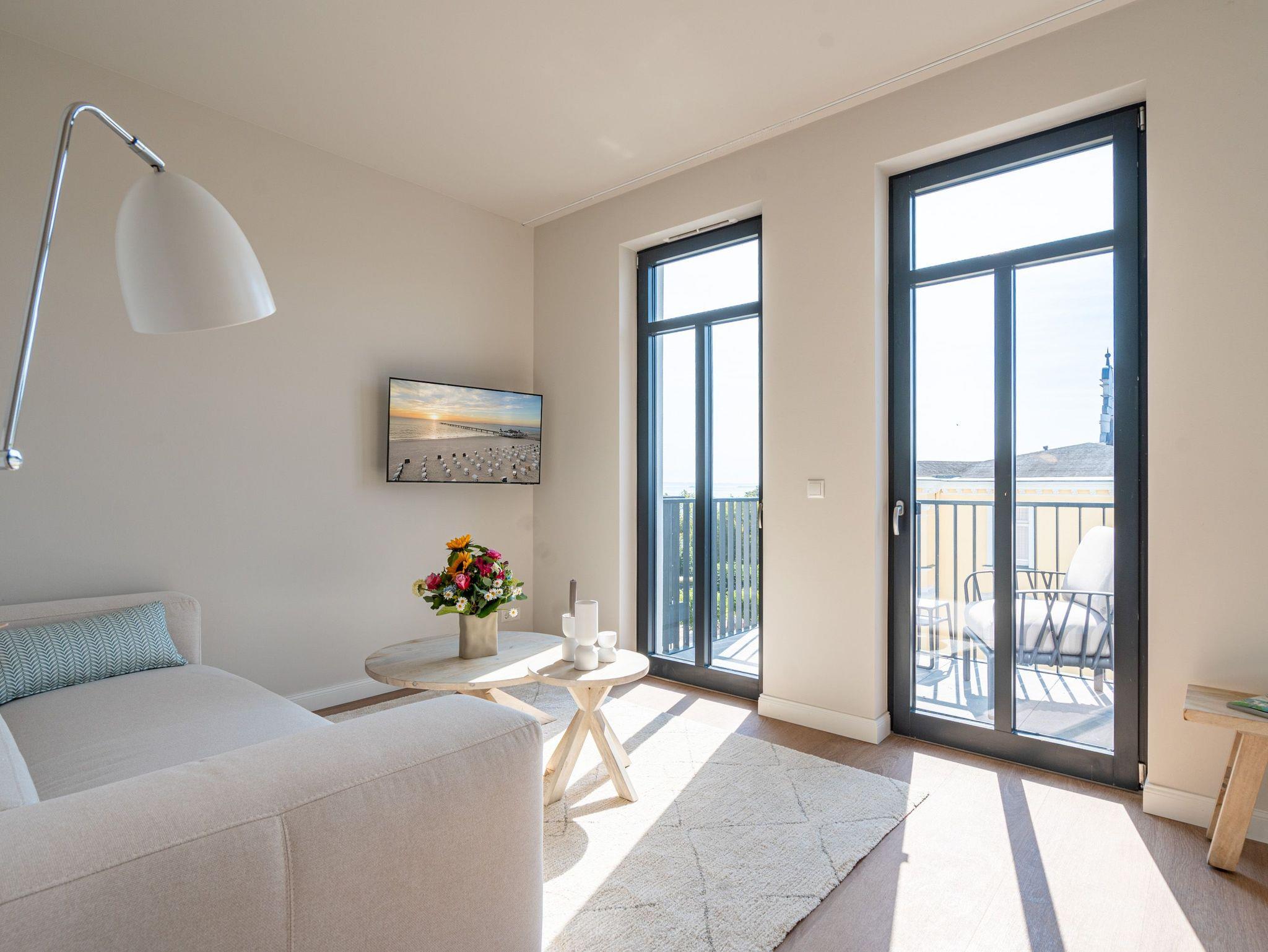 Ein absolutes Urlaubsparadies für zwei Personen mit viel Platz für entspannte Urlaubsträume und Urlaubsaussichten bietet das stilvolle Zwei-Zimmer-Appartement 3.6 (Haus A) im 3. Oberschoss der Strandterrasse. Viel Licht erfüllt die 50 Quadratmeter vom Eingang bis hinaus auf die beiden Balkone. Vom Innenarchitekten konzipiert, strahlt diese kuschelige Wohnung viel Ruhe und Harmonie aus. Kommen Sie runter, schalten Sie ab und genießen Sie von einem der beiden Balkone aus, den wundervoll weiten Blick über die Ostsee. Zum Süd-Osten hin ausgerichtet, können Sie von hier aus die romantischsten Sonnenaufgänge erleben. Durch die bodentiefen Fenster wird das Drinnen zum neuen Draußen ? selbst wenn das Meer einmal stürmisch tost. Die Einrichtung ist stylisch und exklusiv. Von der Stange ist hier nichts. Machen Sie es sich auf dem Sofa bequem. Schalten Sie bei einem spannenden Film auf dem 43-Zoll-Flachbildfernseher ab. Und geben Sie sich der Gelassenheit des süßen Nichtstuns hin. Kochen Sie gemeinsam in der zum Wohnzimmer hin offenen und voll ausgestatteten Küche. 3-Platten-Induktionsherd, Kühlschrank, Kaffeemaschine, Geschirrspülmaschine ? alles steht zu Ihrer Verfügung. Ein gemütlicher Esstisch bietet ausreichend Platz für Ihre Mahlzeiten. Vom Wohnzimmer aus haben Sie Zugang zum ersten Balkon mit einem Loungesessel. Auch die Nächte werden hier zum erholsamen Vergnügen. Dafür sorgt das bequeme Boxspringdoppelbett (1,80 m x 2,00 m). Es gibt einen geräumigen Kleiderschrank und ebenfalls einen 43-Zoll-Flachbildfernseher. Machen Sie die riesigen Schiebefenster weit auf und lassen Sie schon morgens die frische Ostseeluft hinein. Oder treten Sie gleich nach dem Aufstehen auf den zweiten Balkon hinaus und starten mit einem weiten Blick in den neuen Urlaubstag. Das innenliegende Bad ist mit einer Dusche, einem Waschtisch und einer Toilette ausgestattet. Ein reservierter PKW-Stellplatz in der Tiefgarage sorgt dafür, dass Sie Ihr Auto unbeschwert abstellen können. Erleben Sie unvergesslich schöne Tage am Meer in einem Urlaubsdomizil, das unvergleichlich schön ist.