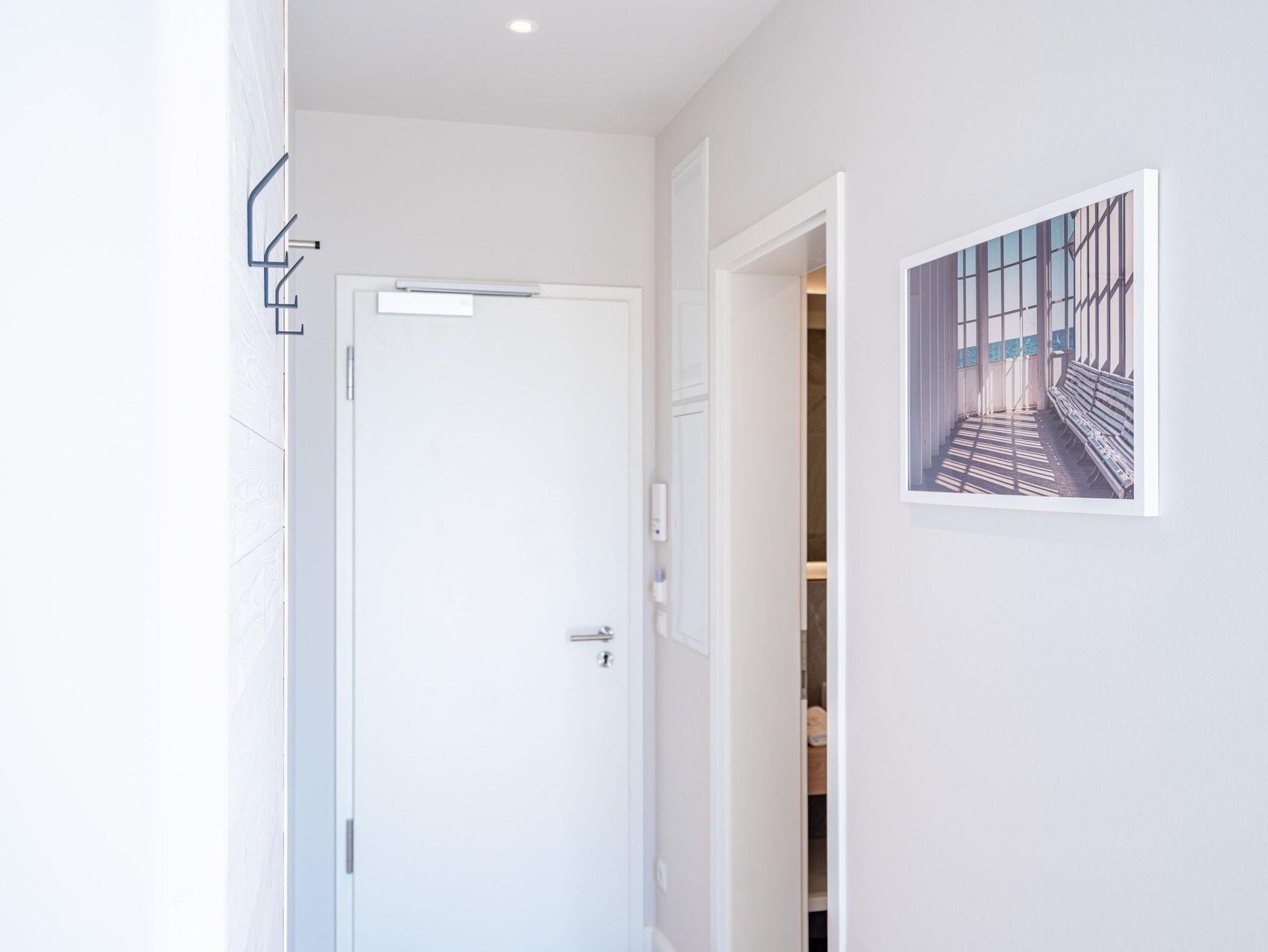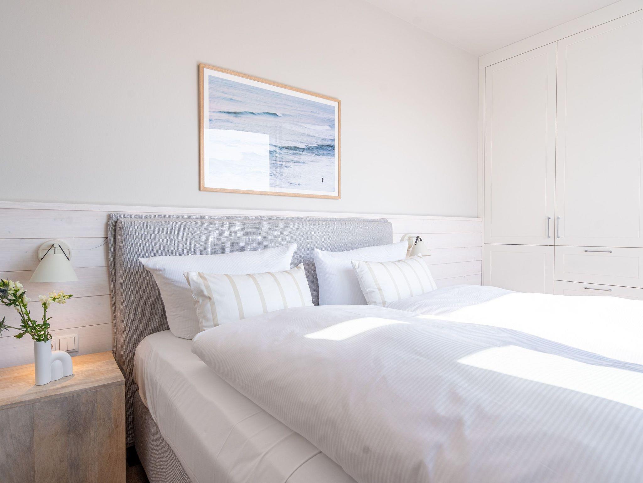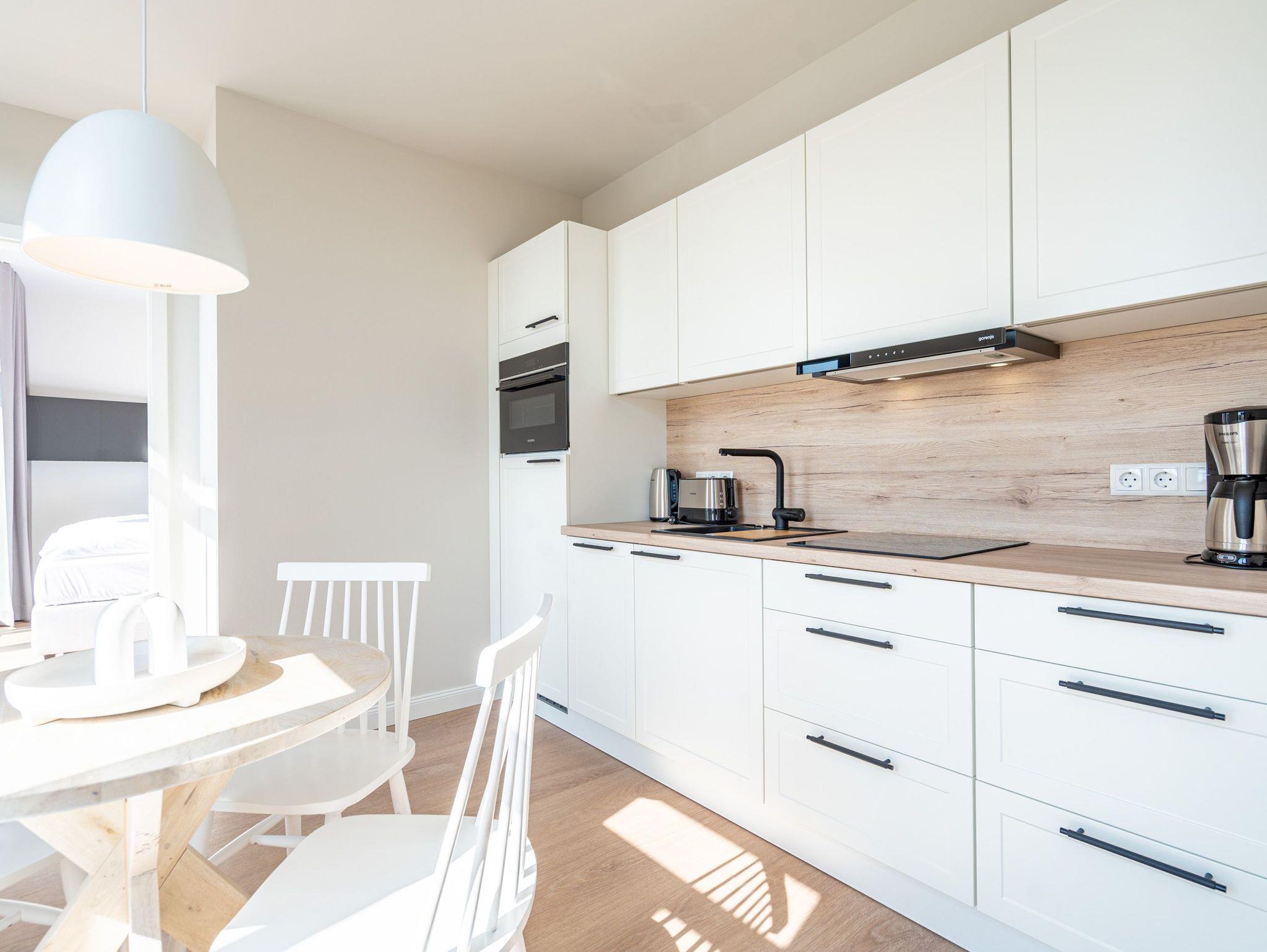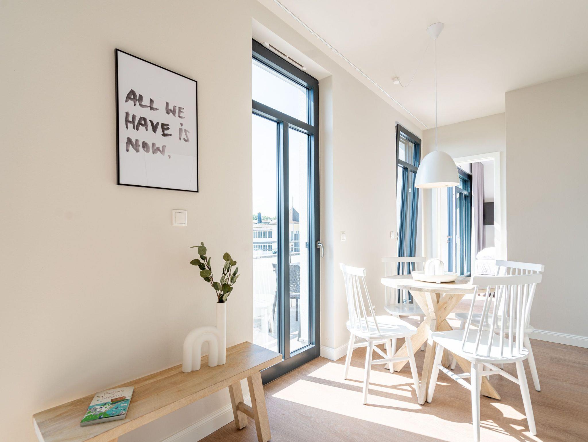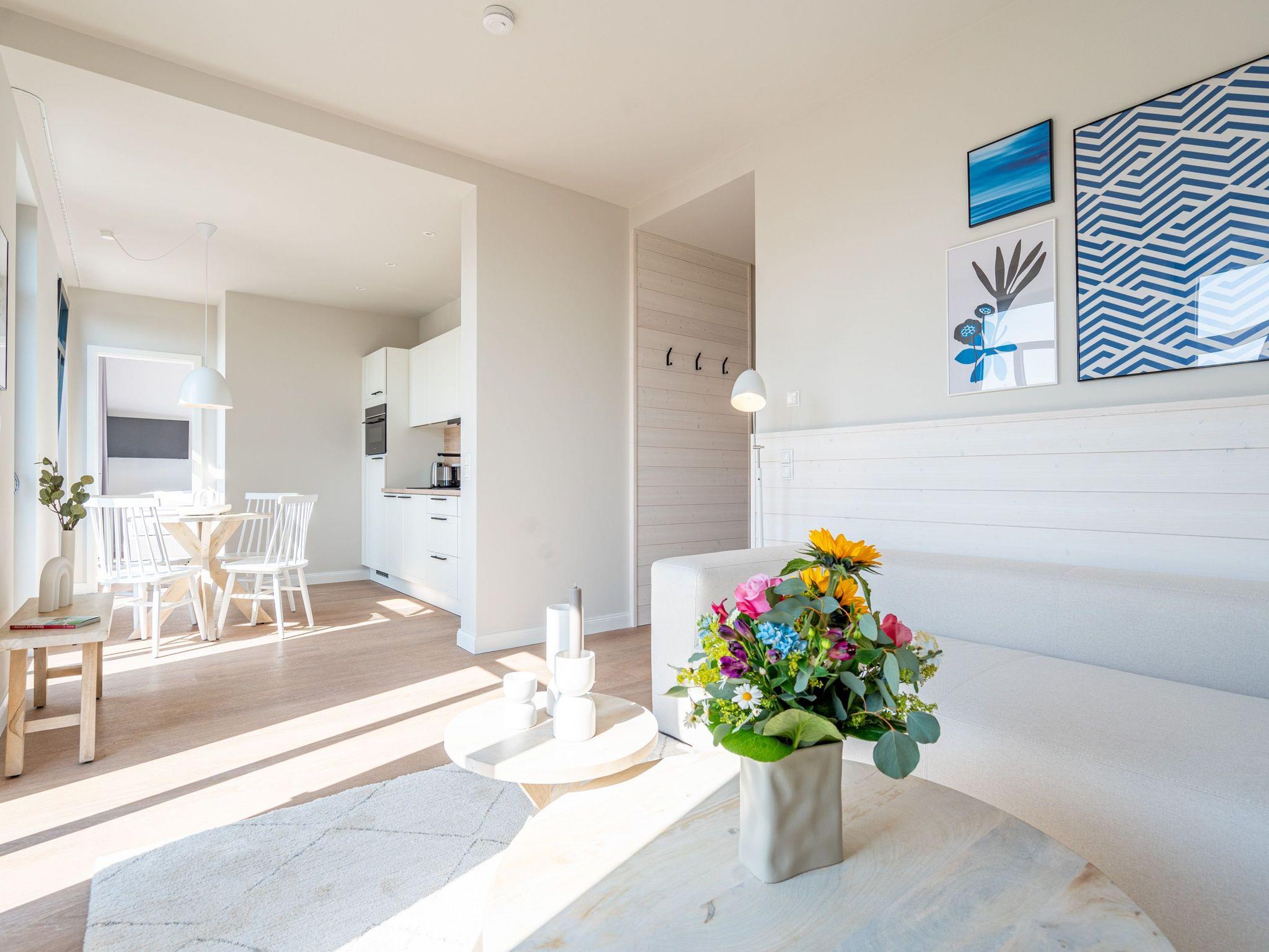 Ein absolutes Urlaubsparadies für zwei Personen mit viel Platz für entspannte Urlaubsträume und Urlaubsaussichten bietet das stilvolle Zwei-Zimmer-Appartement 3.6 (Haus A) im 3. Oberschoss der Strandterrasse. Viel Licht erfüllt die 50 Quadratmeter vom Eingang bis hinaus auf die beiden Balkone. Vom Innenarchitekten konzipiert, strahlt diese kuschelige Wohnung viel Ruhe und Harmonie aus. Kommen Sie runter, schalten Sie ab und genießen Sie von einem der beiden Balkone aus, den wundervoll weiten Blick über die Ostsee. Zum Süd-Osten hin ausgerichtet, können Sie von hier aus die romantischsten Sonnenaufgänge erleben. Durch die bodentiefen Fenster wird das Drinnen zum neuen Draußen ? selbst wenn das Meer einmal stürmisch tost. Die Einrichtung ist stylisch und exklusiv. Von der Stange ist hier nichts. Machen Sie es sich auf dem Sofa bequem. Schalten Sie bei einem spannenden Film auf dem 43-Zoll-Flachbildfernseher ab. Und geben Sie sich der Gelassenheit des süßen Nichtstuns hin. Kochen Sie gemeinsam in der zum Wohnzimmer hin offenen und voll ausgestatteten Küche. 3-Platten-Induktionsherd, Kühlschrank, Kaffeemaschine, Geschirrspülmaschine ? alles steht zu Ihrer Verfügung. Ein gemütlicher Esstisch bietet ausreichend Platz für Ihre Mahlzeiten. Vom Wohnzimmer aus haben Sie Zugang zum ersten Balkon mit einem Loungesessel. Auch die Nächte werden hier zum erholsamen Vergnügen. Dafür sorgt das bequeme Boxspringdoppelbett (1,80 m x 2,00 m). Es gibt einen geräumigen Kleiderschrank und ebenfalls einen 43-Zoll-Flachbildfernseher. Machen Sie die riesigen Schiebefenster weit auf und lassen Sie schon morgens die frische Ostseeluft hinein. Oder treten Sie gleich nach dem Aufstehen auf den zweiten Balkon hinaus und starten mit einem weiten Blick in den neuen Urlaubstag. Das innenliegende Bad ist mit einer Dusche, einem Waschtisch und einer Toilette ausgestattet. Ein reservierter PKW-Stellplatz in der Tiefgarage sorgt dafür, dass Sie Ihr Auto unbeschwert abstellen können. Erleben Sie unvergesslich schöne Tage am Meer in einem Urlaubsdomizil, das unvergleichlich schön ist.