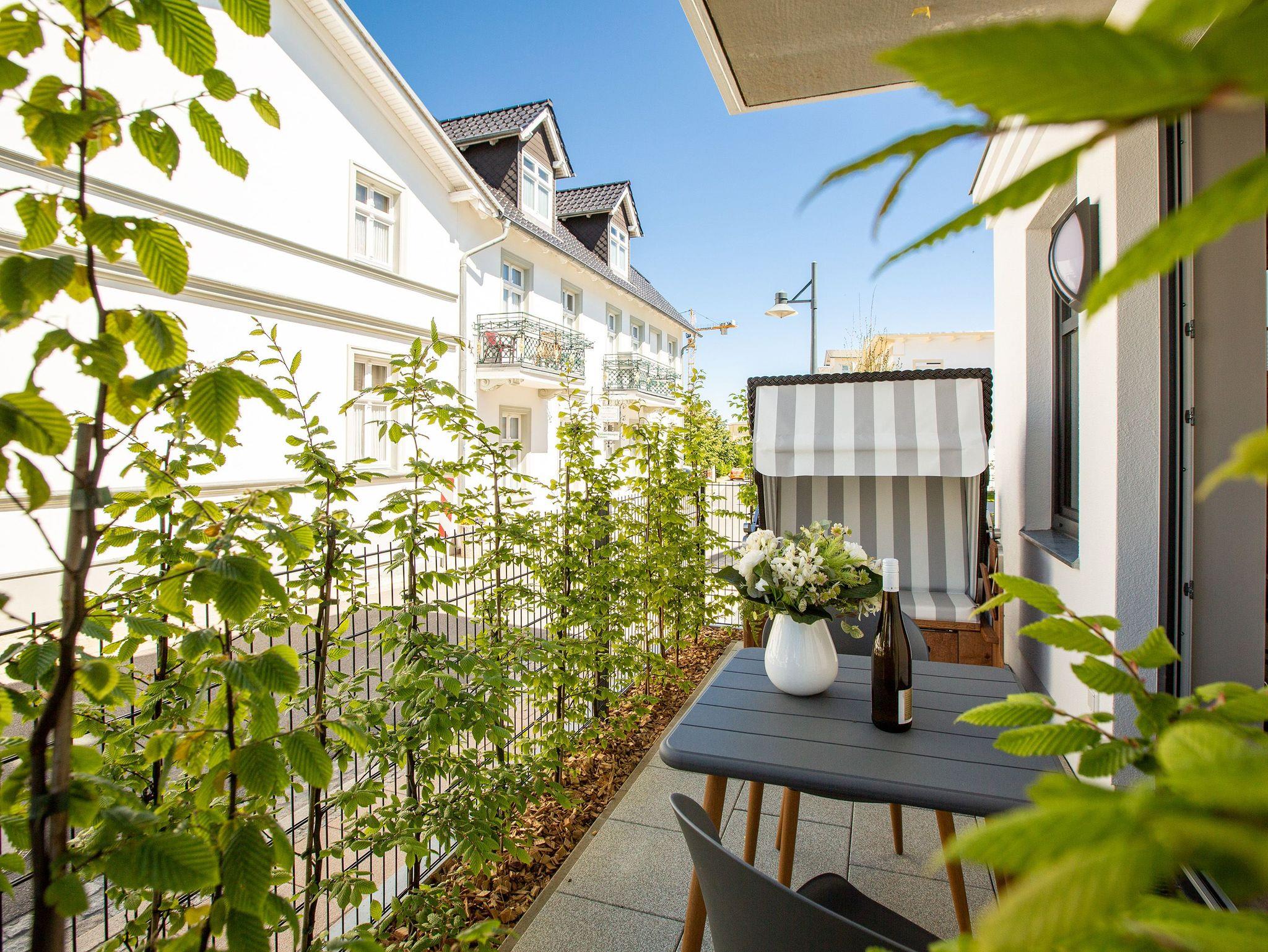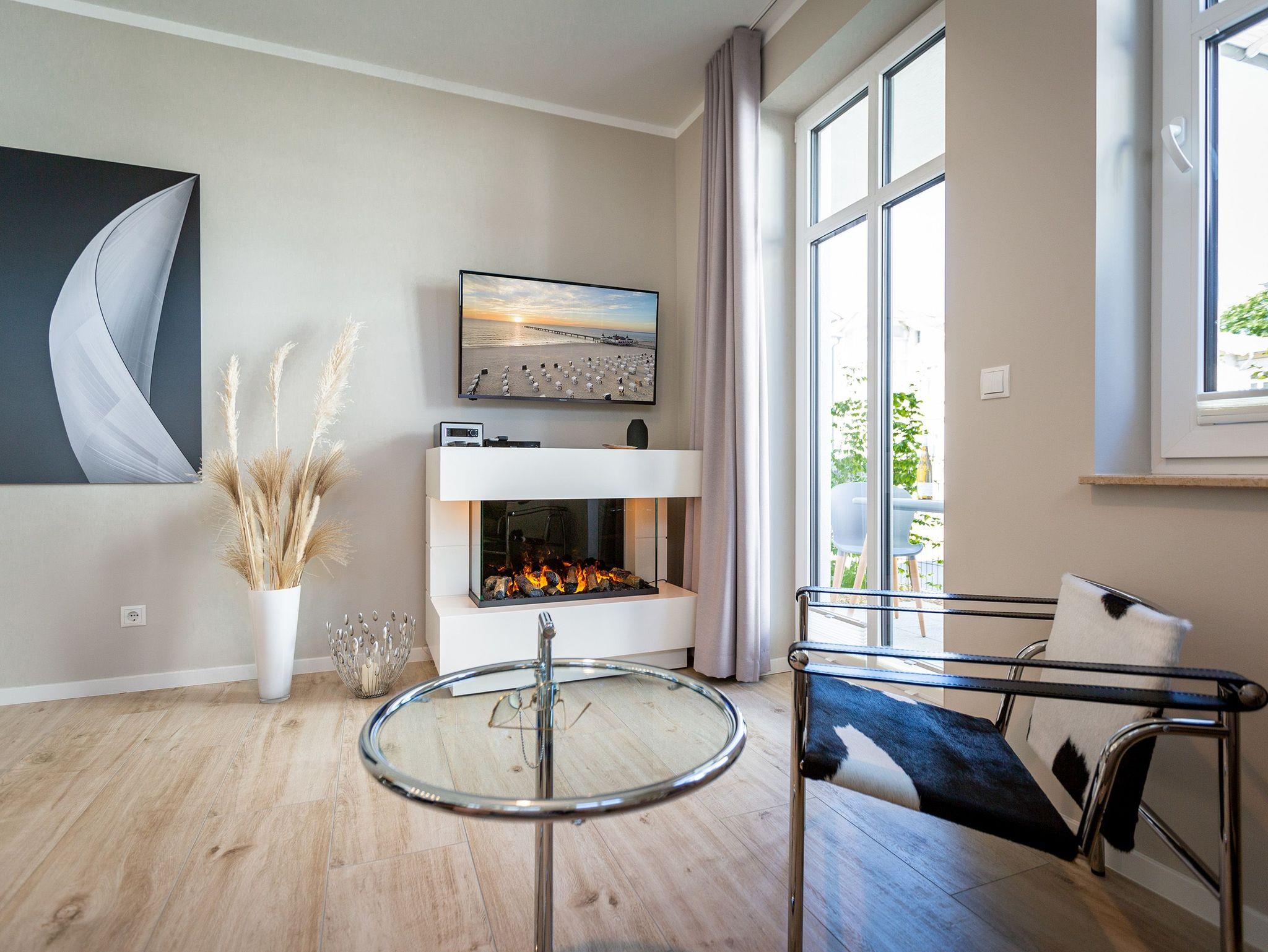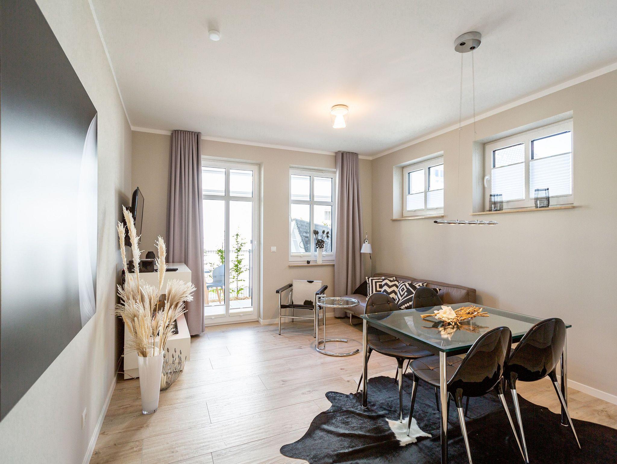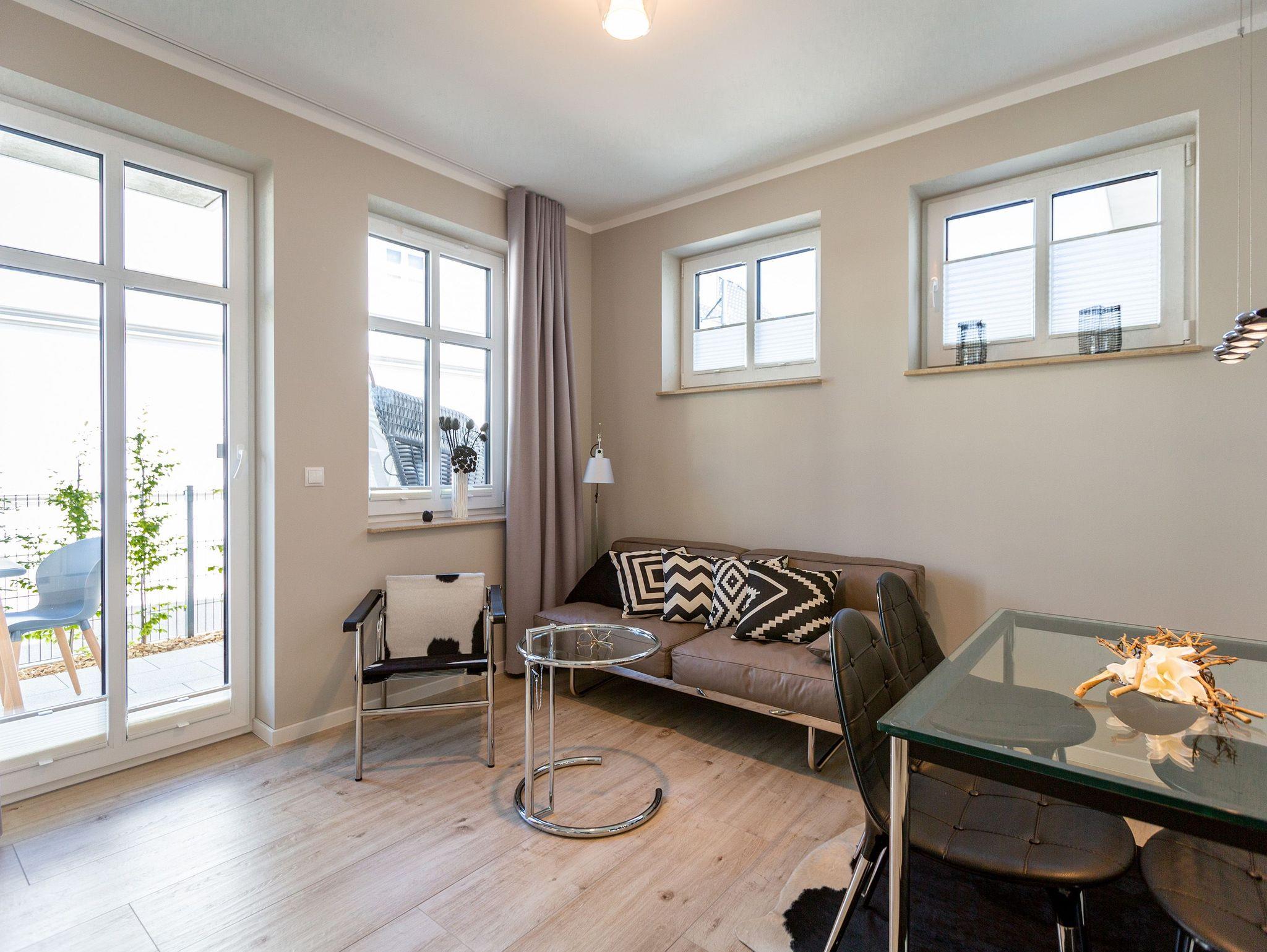 Mitten im Herzen von Ahlbeck sorgt dieses stylische Appartement für zwei Personen und ein Kleinkind (im Kinderreisebett) für viel Erholung und Entspannung. Das 46 Quadratmeter große Urlaubsparadies befindet sich im Erdgeschoss des Quartiers Frohsinn, hat eine kuschelig urige Terrasse und zwei Zimmer. Bringen Sie ihren geliebten Vierbeiner hier ruhig mit. Er oder sie ist herzlich willkommen. Das Innere des Appartements besticht mit schlichter Eleganz und ausgesuchten Design-Möbeln. Die Cassina-Reihe von Le Corbusier ist hier durchgehend vertreten. Selbst der berühmte LC1 mit Kuhfell fehlt nicht. Aber ganz gleich, ob Sofa oder bequemer Essplatz, Couchtisch oder die Kunst an der Wand ? das Appartement wurde mit viel Geschmack eingerichtet. Leder in Kombination mit Glas und Chrome verleihen Ihrem Wohlfühlreich ein besonderes Flair. Das Wohnzimmer verfügt zudem über einen Elektrokamin mit Fernbedienung und einen großen Flat-TV (50 Zoll) mit Blue-Ray-Player. Eine offene Küchenzeile ist mit allem Notwendigen ausgestattet. Die Küche enthält qualitativ hochwertige Geräte wie einen Induktionsherd, eine Mikrowelle, einen Geschirrspüler, eine Senseo Kaffeemaschine, gutes Kochgeschirr sowie ein edles Service. Das Wohnzimmer hat Zugang zur Terrasse (6 Quadratmeter), einer kleinen Rückzugsecke unter freiem Himmel mit Gartenmöbeln und Strandkorb. Das Schlafzimmer wartet mit einem komfortablen Boxspringdoppelbett (1,80 m x 2,00 m) auf. Der große Einbauschrank ist geräumig und bietet viel Ablagefläche. Das Bad ist mit Dusche und WC versehen. Das WLAN für Musik- und Internetgenuss ist kostenfrei. Handtücher und Bettwäsche sind inklusive und bereits vor Ort, wenn Sie anreisen. Im Keller befindet sich ein separater Fahrradraum. Ein Außenstellplatz gehört zur Ferienwohnung dazu.