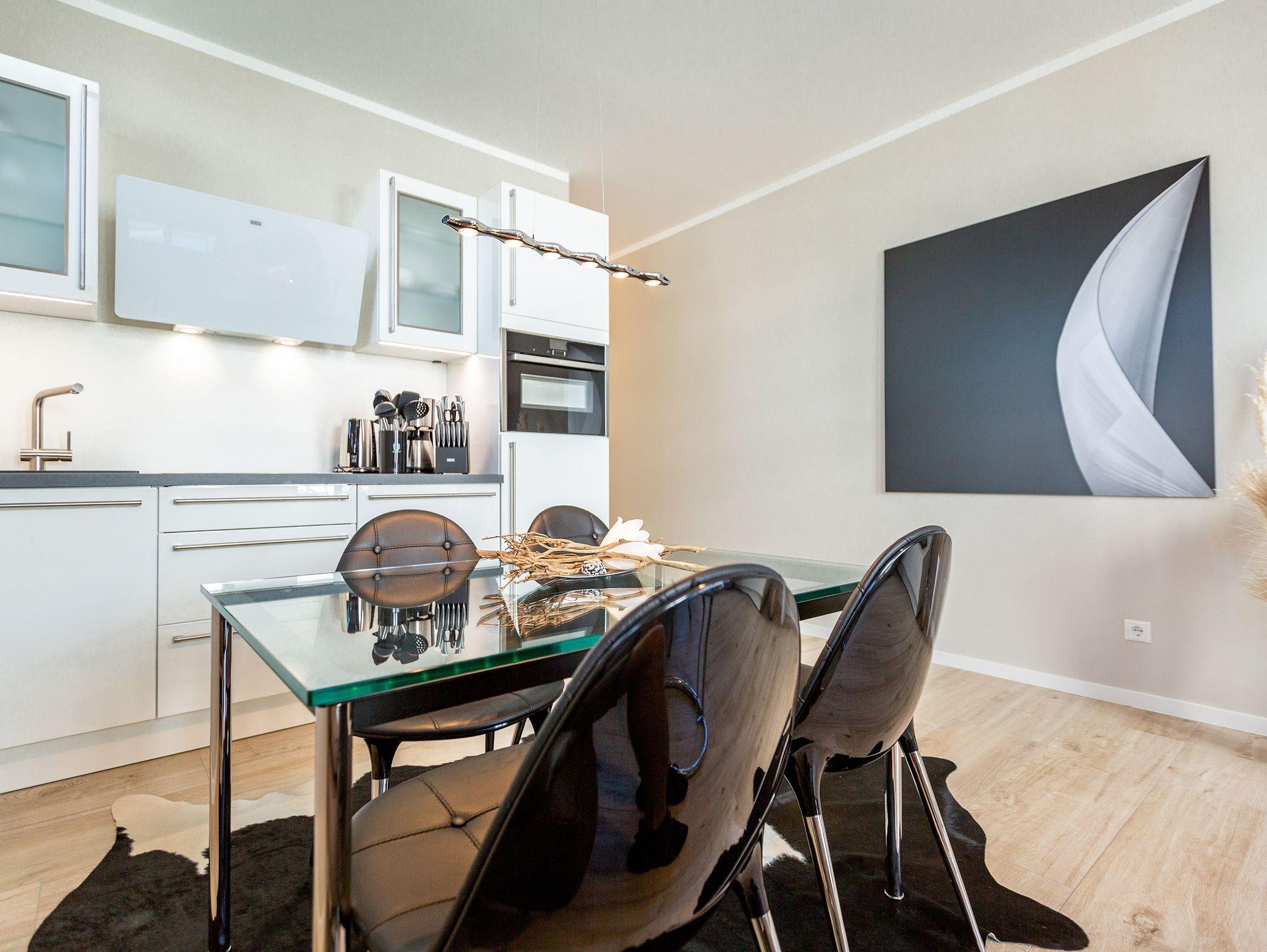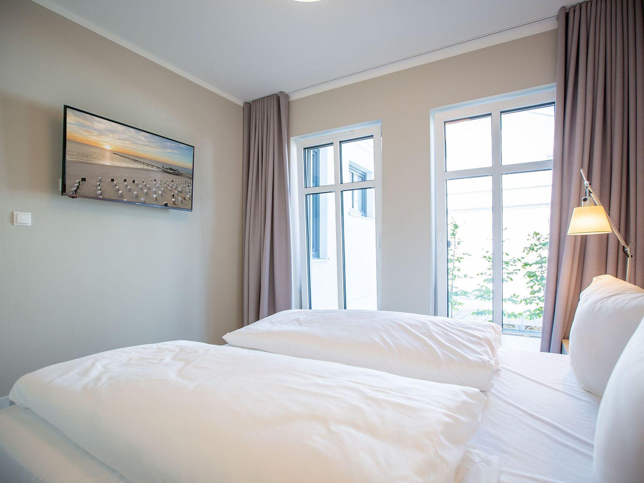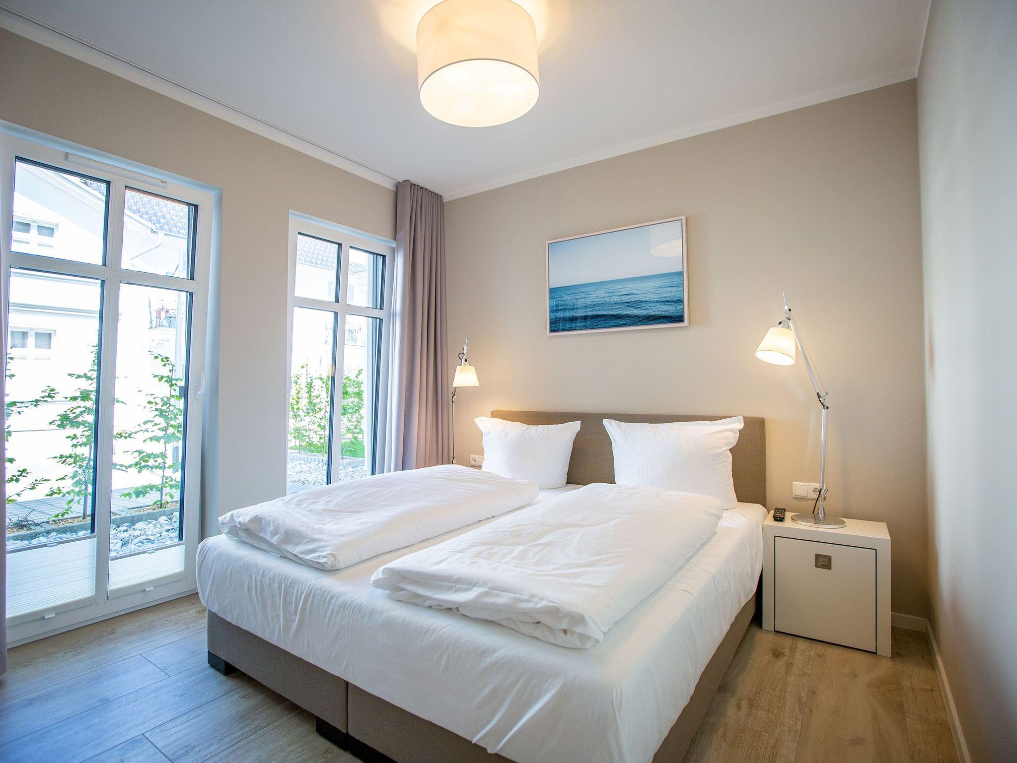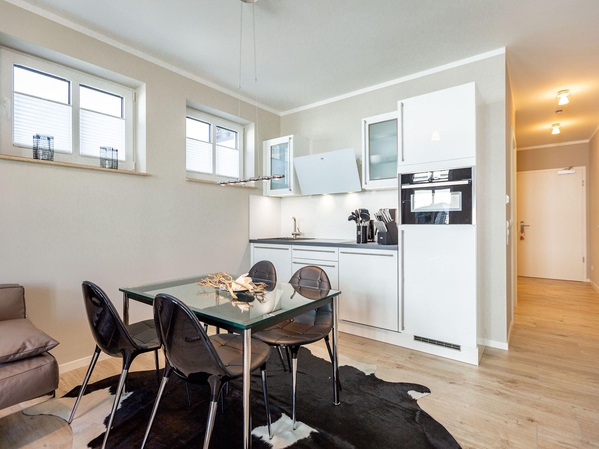 Mitten im Herzen von Ahlbeck sorgt dieses stylische Appartement für zwei Personen und ein Kleinkind (im Kinderreisebett) für viel Erholung und Entspannung. Das 46 Quadratmeter große Urlaubsparadies befindet sich im Erdgeschoss des Quartiers Frohsinn, hat eine kuschelig urige Terrasse und zwei Zimmer. Bringen Sie ihren geliebten Vierbeiner hier ruhig mit. Er oder sie ist herzlich willkommen. Das Innere des Appartements besticht mit schlichter Eleganz und ausgesuchten Design-Möbeln. Die Cassina-Reihe von Le Corbusier ist hier durchgehend vertreten. Selbst der berühmte LC1 mit Kuhfell fehlt nicht. Aber ganz gleich, ob Sofa oder bequemer Essplatz, Couchtisch oder die Kunst an der Wand ? das Appartement wurde mit viel Geschmack eingerichtet. Leder in Kombination mit Glas und Chrome verleihen Ihrem Wohlfühlreich ein besonderes Flair. Das Wohnzimmer verfügt zudem über einen Elektrokamin mit Fernbedienung und einen großen Flat-TV (50 Zoll) mit Blue-Ray-Player. Eine offene Küchenzeile ist mit allem Notwendigen ausgestattet. Die Küche enthält qualitativ hochwertige Geräte wie einen Induktionsherd, eine Mikrowelle, einen Geschirrspüler, eine Senseo Kaffeemaschine, gutes Kochgeschirr sowie ein edles Service. Das Wohnzimmer hat Zugang zur Terrasse (6 Quadratmeter), einer kleinen Rückzugsecke unter freiem Himmel mit Gartenmöbeln und Strandkorb. Das Schlafzimmer wartet mit einem komfortablen Boxspringdoppelbett (1,80 m x 2,00 m) auf. Der große Einbauschrank ist geräumig und bietet viel Ablagefläche. Das Bad ist mit Dusche und WC versehen. Das WLAN für Musik- und Internetgenuss ist kostenfrei. Handtücher und Bettwäsche sind inklusive und bereits vor Ort, wenn Sie anreisen. Im Keller befindet sich ein separater Fahrradraum. Ein Außenstellplatz gehört zur Ferienwohnung dazu.