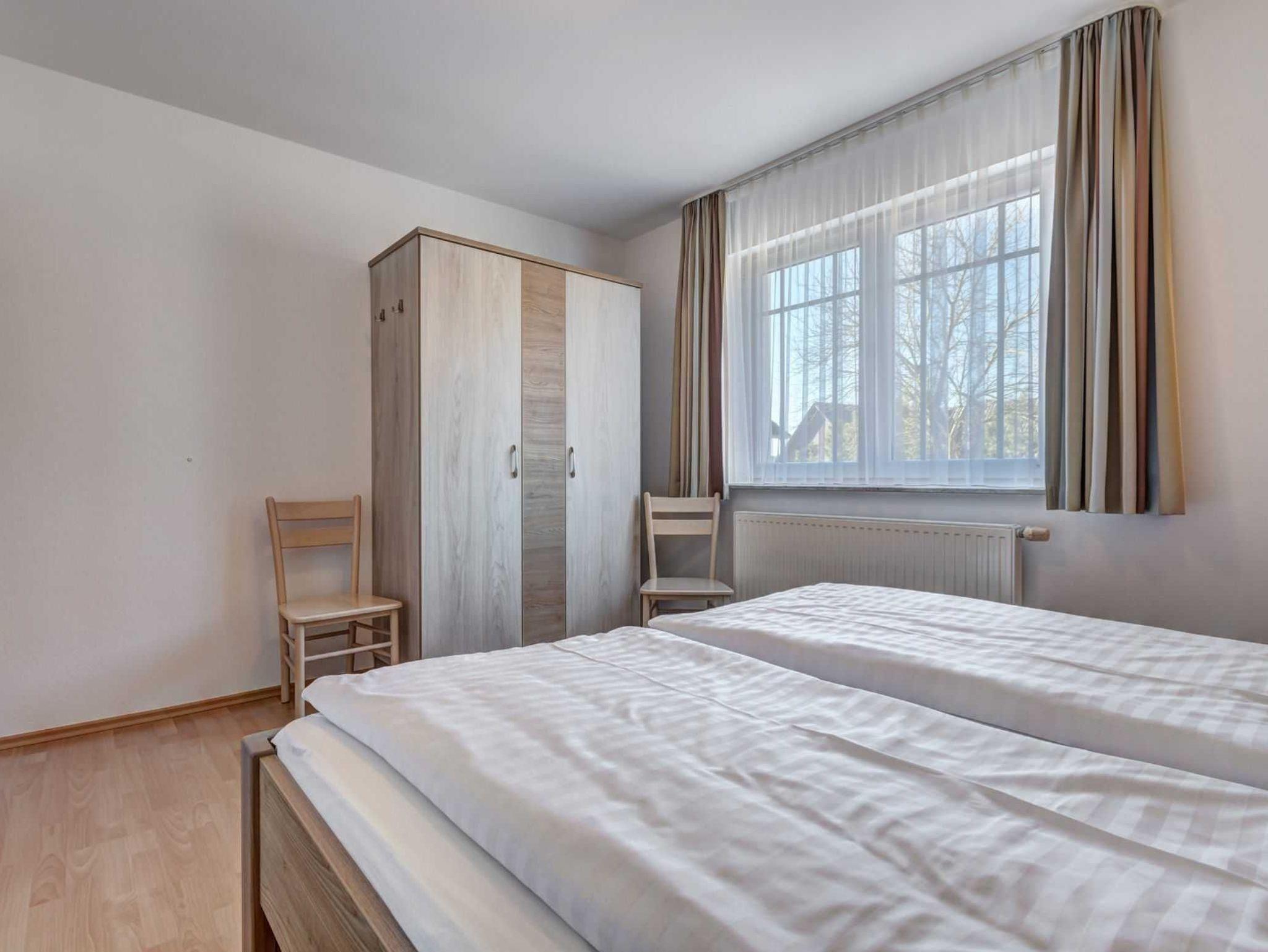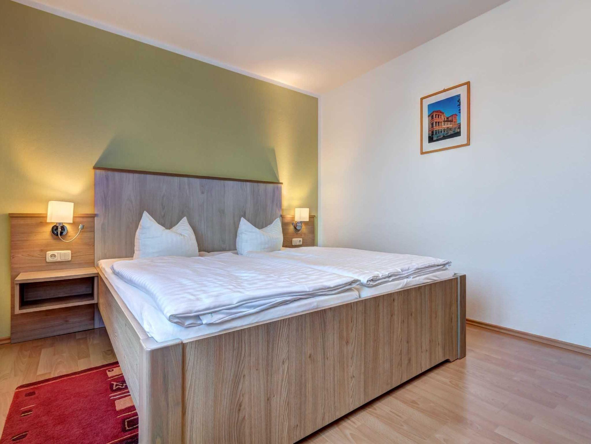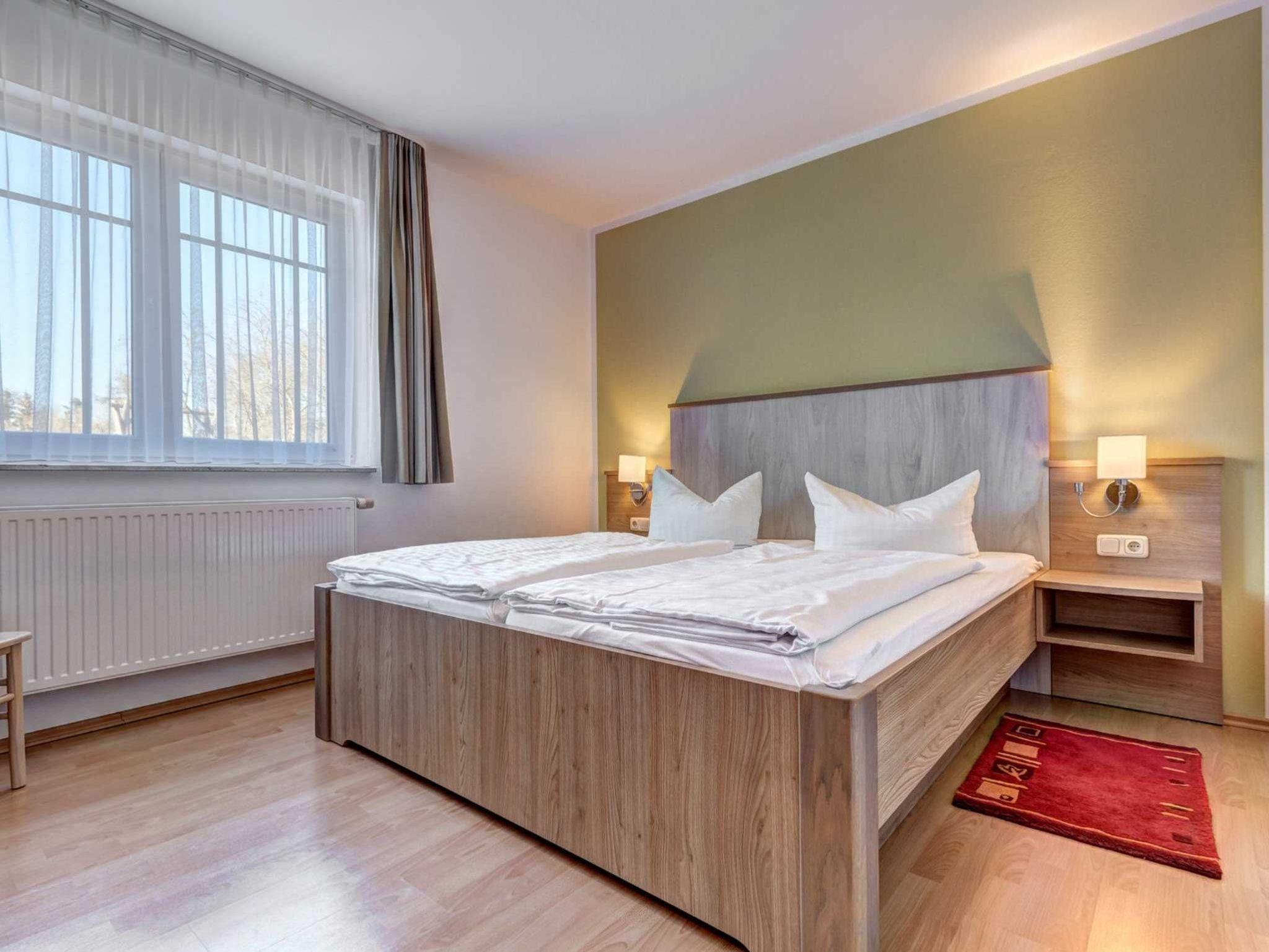 Die moderne 2-Raum NICHTRAUCHER-Ferienwohnung ist ca. 52 qm groß und befindet sich im Erdgeschoss eines Appartementhauses. Sie Wohnung verfügt über einen Schlafraum mit Doppelbett, Kleiderschrank und 2 Stühlen), einen kombinierten Wohn-u. Schlafraum mit einer Schlafcouch (1,60 x 2,00 m), Flachbild-TV, Radio mit CD-Player, Couchtisch & ein Sessel, Esstisch + 4 Stühle sowie einer Terrasse zur Südseite (morgens bis nachmittags Sonne). Die separate Küche ist ausgestattet mit einem Geschirrspüler, 4-Platten-Ceranherd, Backofen, Kühl-/Gefrierkombination, Kaffeemaschine, Toaster, Wasserkocher, Mikrowelle und Geschirr. Das Badezimmer verfügt über DU/WC sowie eine Fußbodenheizung und einen beleuchteten Kosmetikspiegel. Die gesamte Wohnung ist mit Fliesen und Laminat ausgestattet. Die Erstausstattung Bettwäsche und Handtücher ist inklusive. Auf Anfrage kann eine weitere Person auf dem Schlafsofa für 15 Euro pro Übernachtung zugebucht werden.