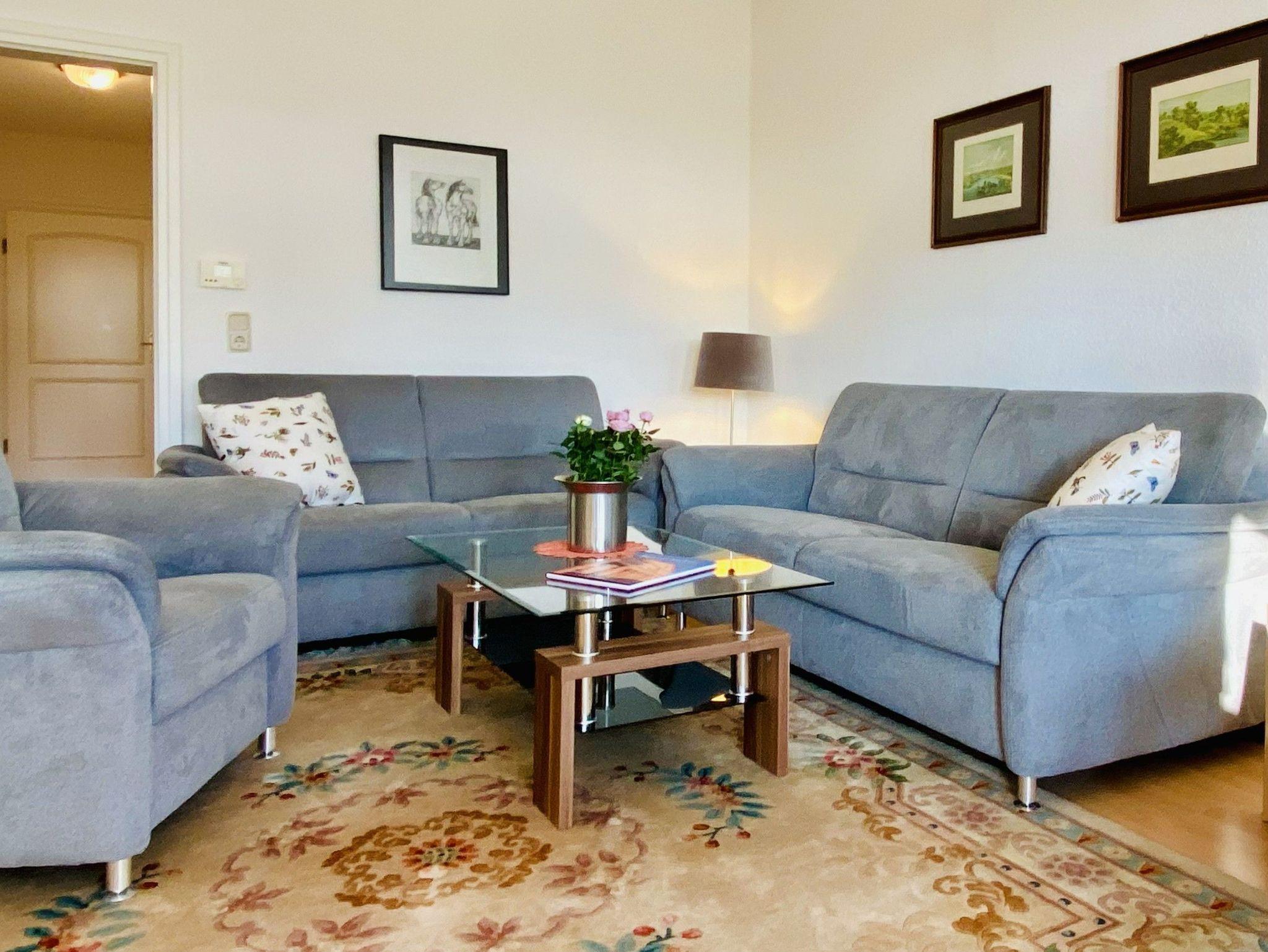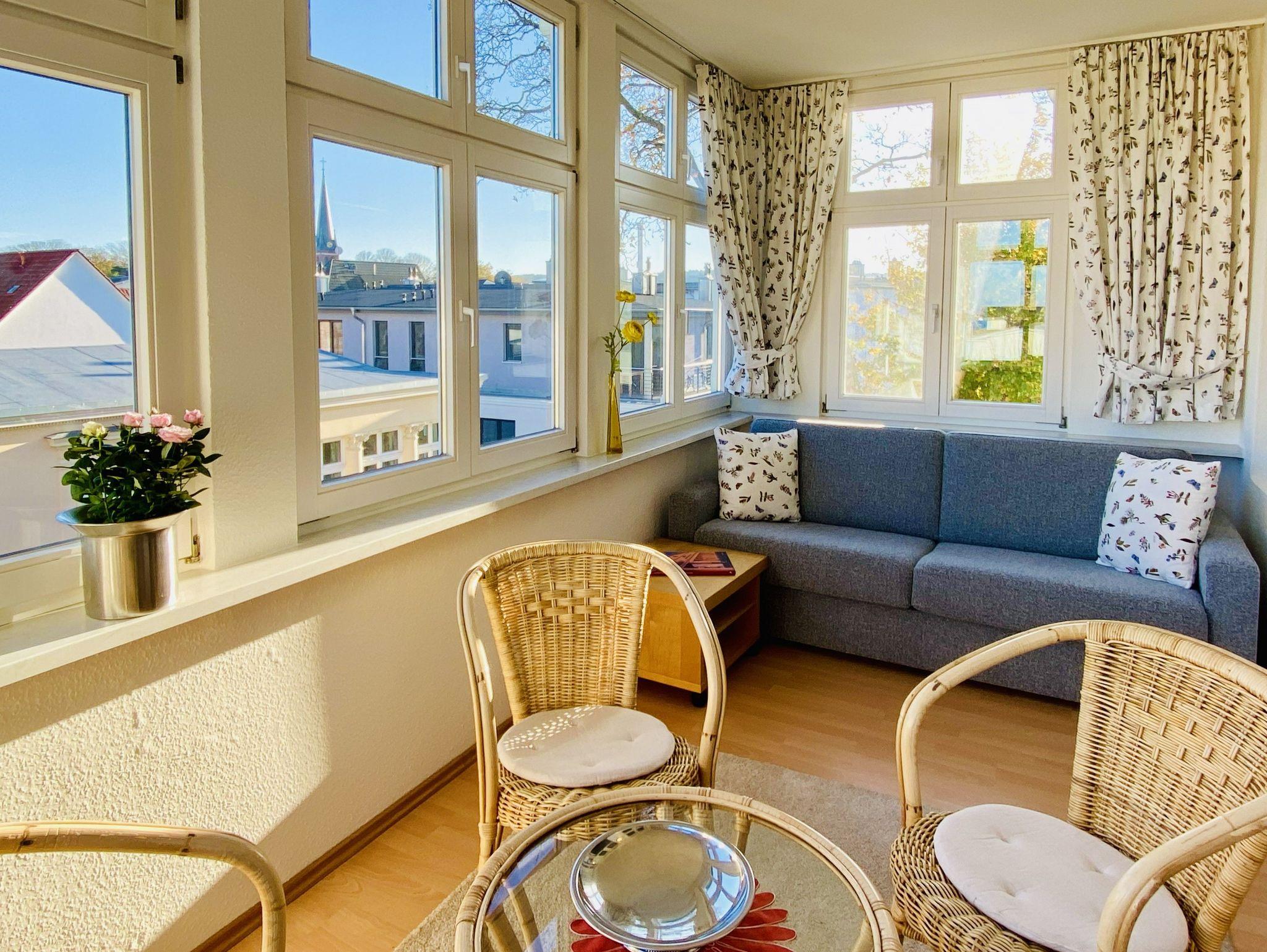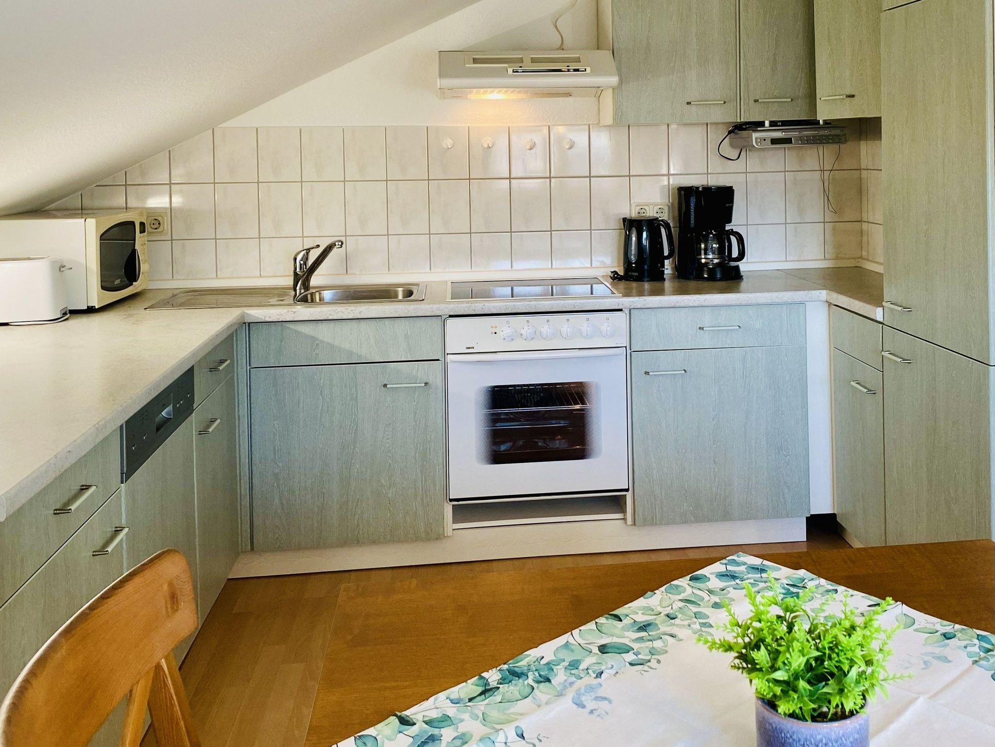 Genießen Sie Ihren Urlaub in dieser schönen 2,5-Raumwohnungim Dachgeschoss mit Blick von der Veranda auf die Ostsee. Der Wohnraum bietet durch eine funktionale Aufteilung genug Platz für die gesamte Familie. In der abgeschlossenen Küche stehen Geschirrspüler, Backofen/Herd, Mikrowelle, ein Kühlschrank mit Gefrierteil sowie ein Esstisch zur Verfügung. Zur Wohnung gehört ein Schlafzimmer mit Doppelbett sowie eine Veranda mit Schlafsofa. Es gibt ein Badezimmer mit Dusche und Badewanne.