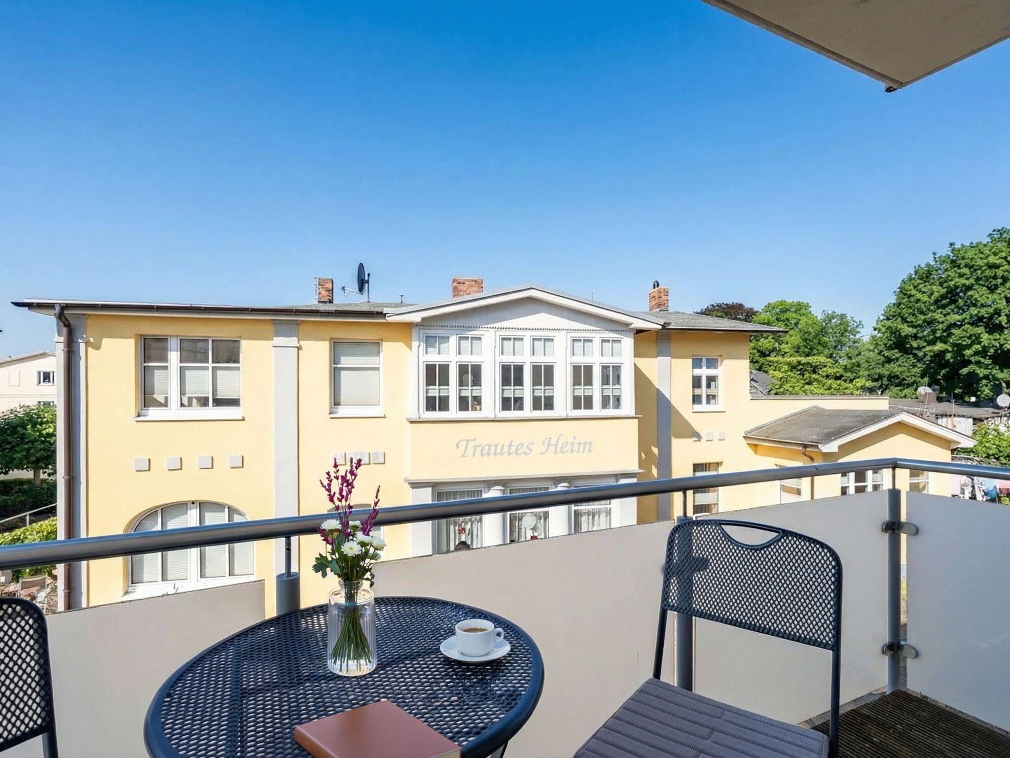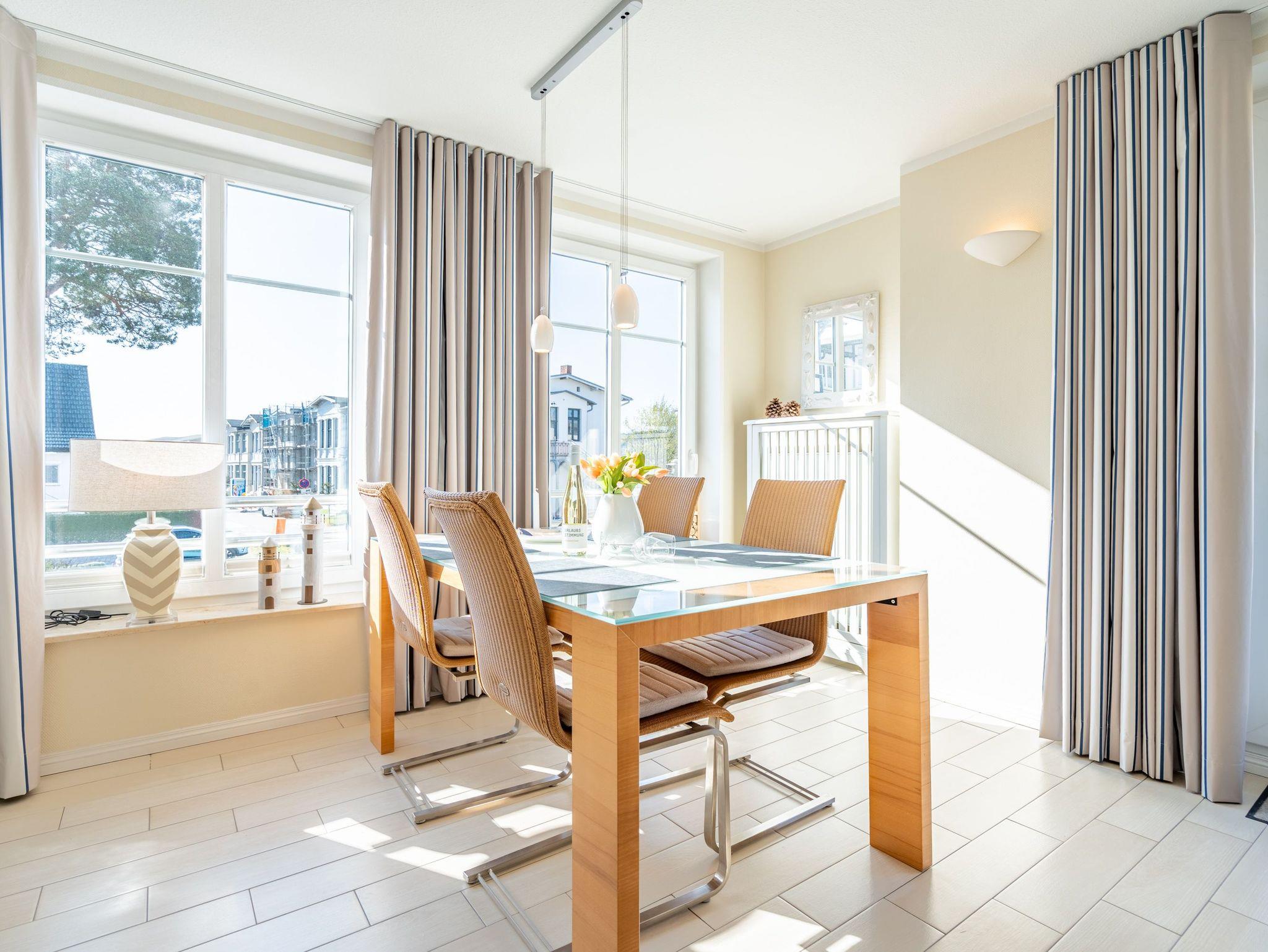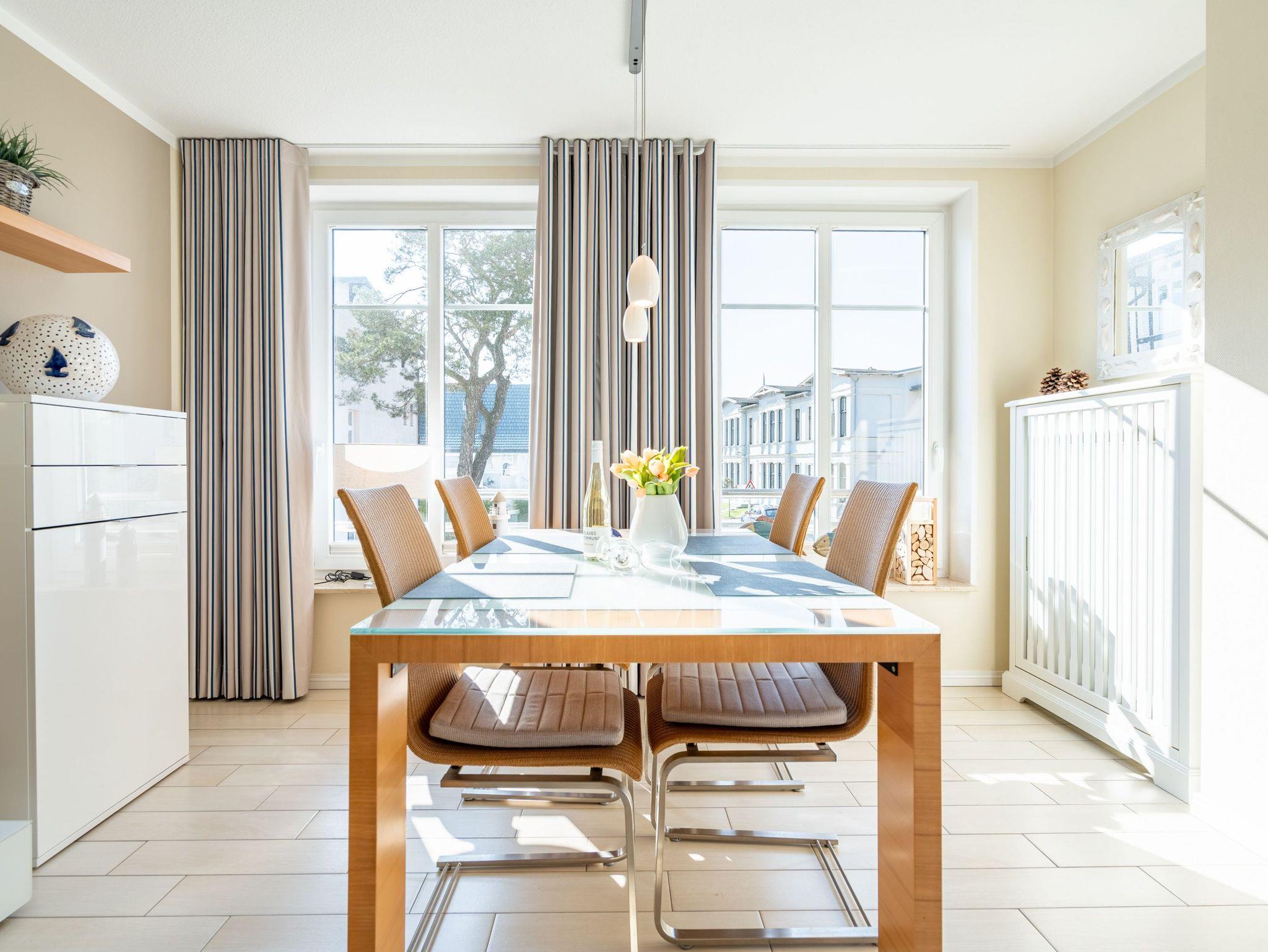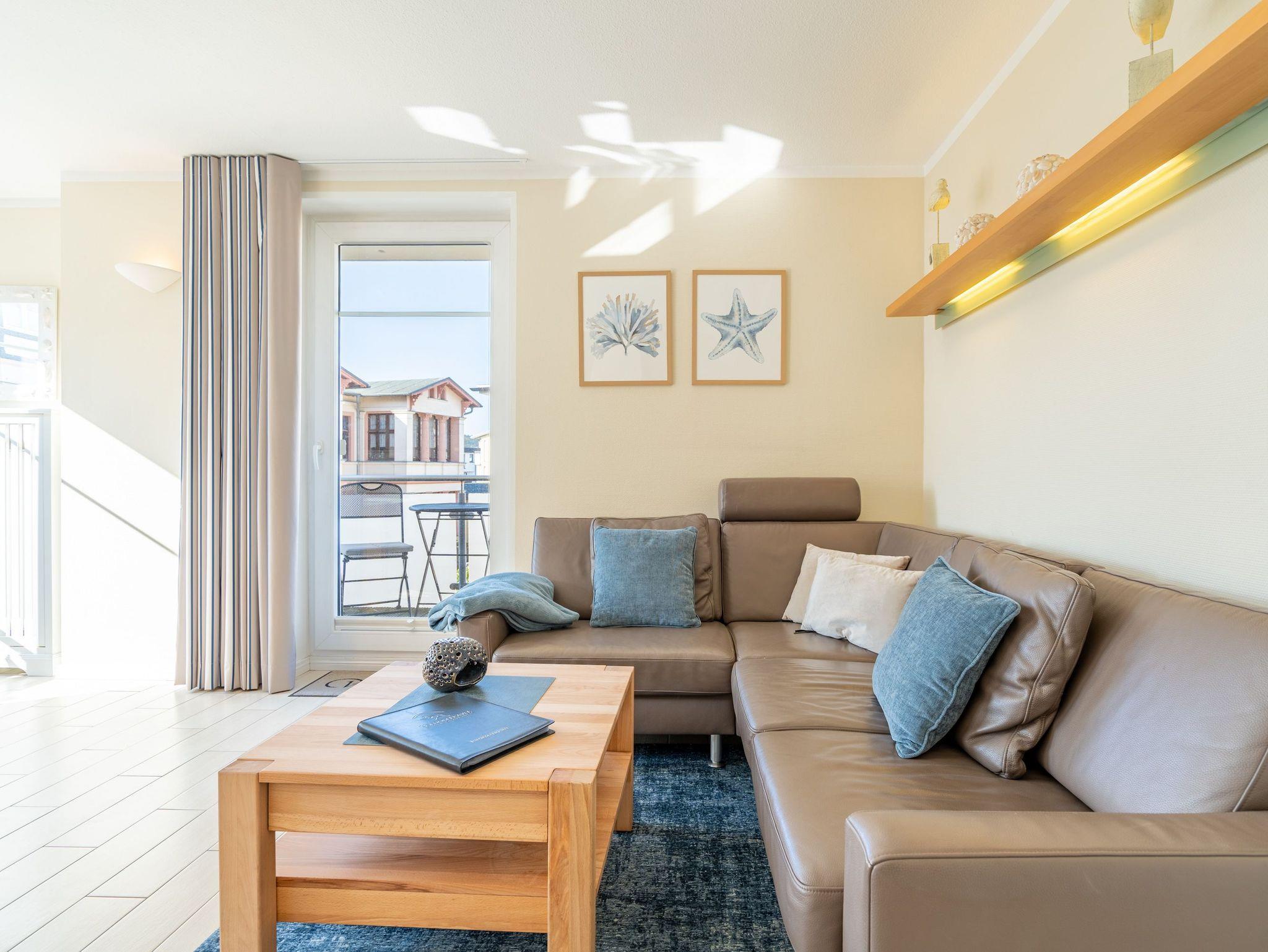 Modern. Lichtdurchflutet. Stilsicher ? so empfängt Sie die Ferienwohnung 5 im 1. Obergeschoss des neuen Hauses. Warme, an Strand und Meer erinnernde Farben, ausgesuchte Materialien und stilvolle Dekorationen verleihen dem komplett mit hellen italienischen Fliesen ausgelegten Appartement Finesse und Leichtigkeit. Der Wohnbereich ist mit einer bequemen Ledercouch und technischen Feinheiten (Flat-TV, Bose Sound Speaker 300 und Küchenradio) ausgestattet, von hier aus haben Sie Zugang zum sonnigen Südbalkon. Vom schönen Essplatz am Fenster genießen Sie den Ausblick auf die renovierten Villen in der Vinetastraße. Eine offene, komplett ausgestattete Küche mit Granitarbeitsplatte, ein gemütliches Schlafzimmer mit Doppelbett (1,80 m x 2 m) und Flat-TV sowie ein großzügiges Duschbad mit Fenster ergänzen die Wohnung und bieten Platz für 2 Personen. Als kleines Sommer-Highlight stellen wir Ihnen in den warmen Monaten (je nach Witterung) einen Strandkorb am Strand zur Verfügung ? genießen Sie die Auszeit! Das WLAN-Netz ist kostenfrei nutzbar. Zur Wohnung gehört außerdem der Tiefgaragenstellplatz Nr. 5 ? bequem, sicher und direkt am Haus. Ankommen, abschalten, Urlaub genießen.