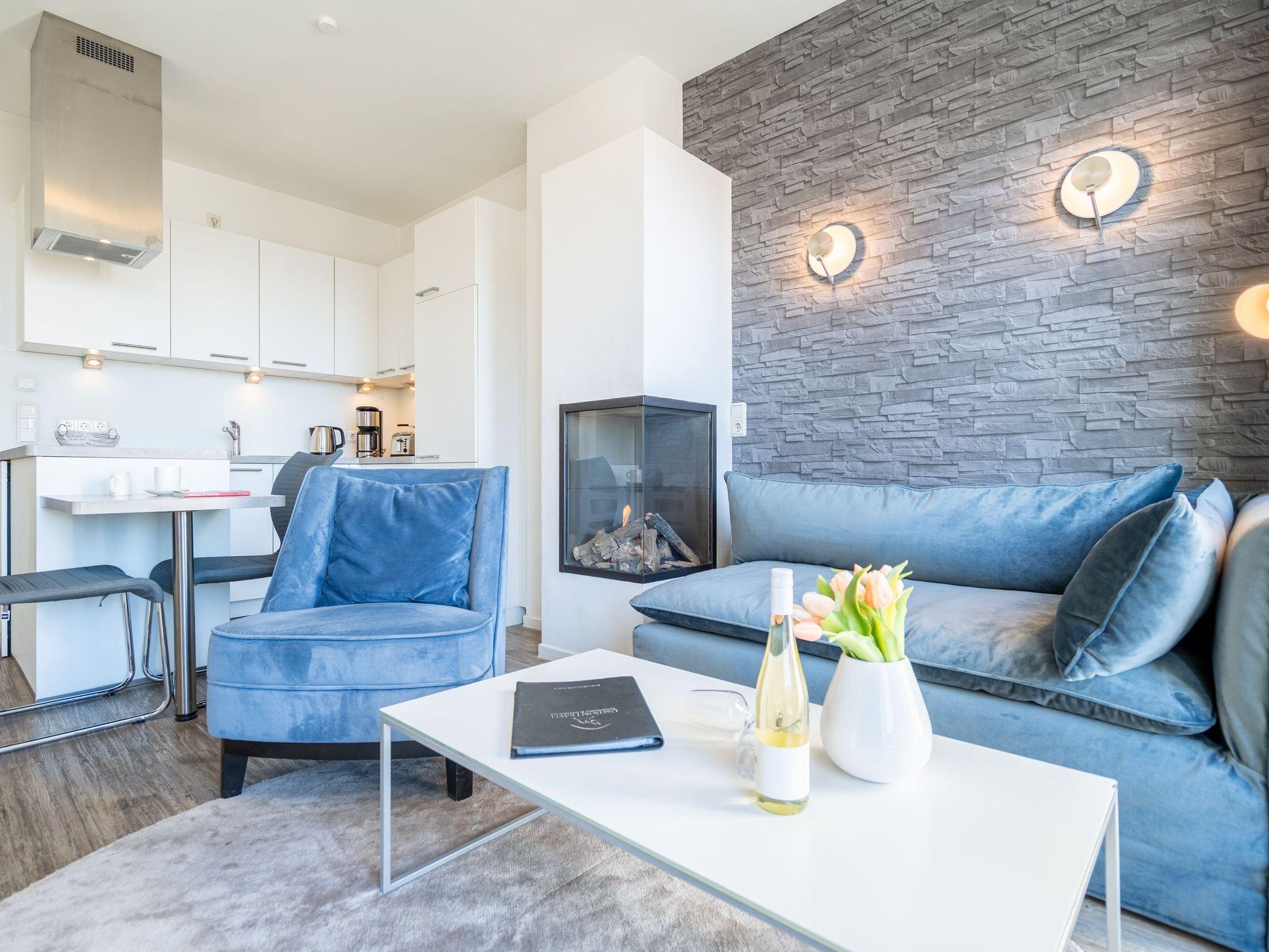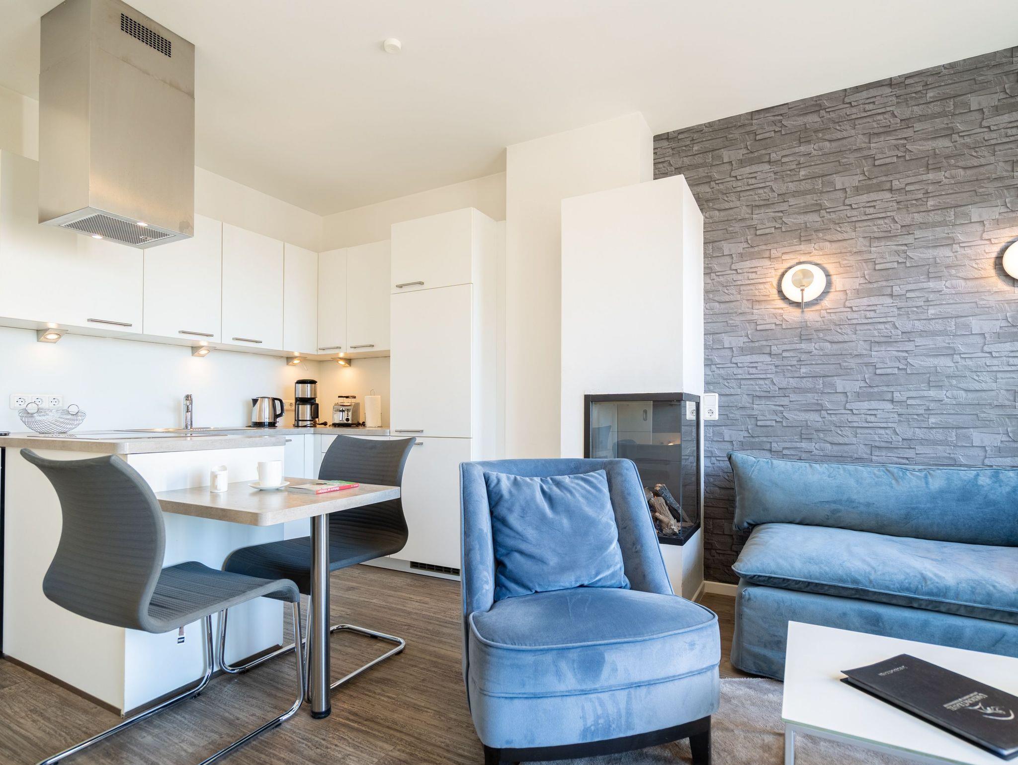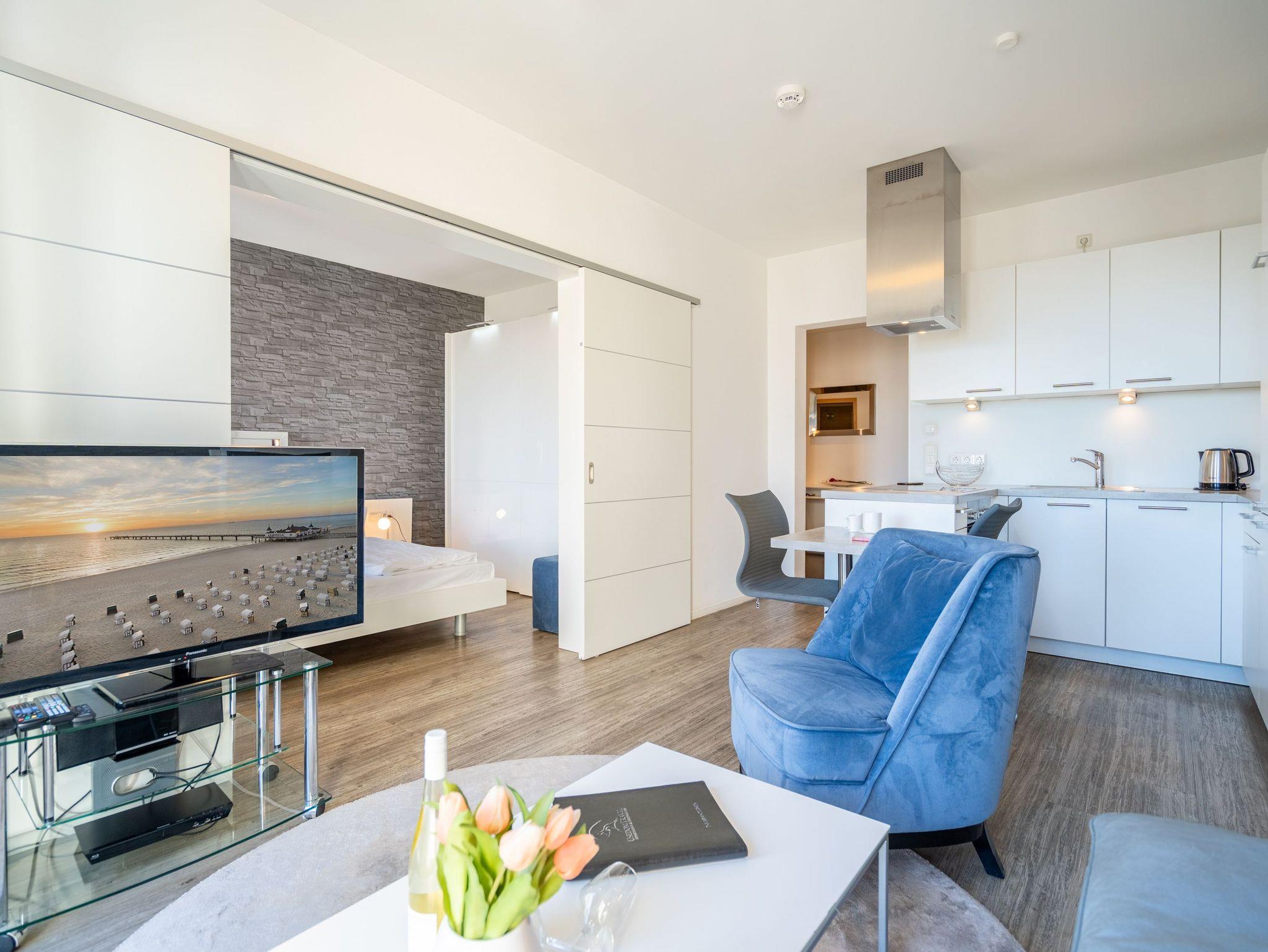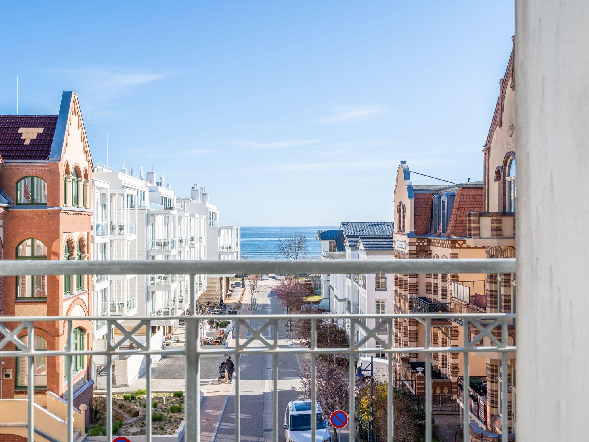 Im 2. Obergeschoss des Vorderhauses empfängt Sie die Ferienwohnung 16. Modern, exklusiv, stylisch, aber dennoch gemütlich mit Kuschelsofa und Gaskamin, der per Fernbedienung ganz einfach zu benutzen ist. Das 2-Raum-Appartement ist für 2 Personen und ein Kleinkind (bis 3 Jahre im Kinderreisebett) eingerichtet. Der Wohnbereich mit Flat-TV wird durch die offene, komplett ausgestattete Küche ergänzt. Der Schlafbereich mit bequemem Doppelbett ist durch eine Schiebetür getrennt. Von hier hat man (wie auch aus dem Wohnbereich) Zugang auf den schönen Balkon, der zur Meerseite ausgerichtet ist. Über die Bäume an der Promenade und die Goethestraße hinweg, kann man sogar die Ostsee sehen. Ein besonderes Highlight ist die wohnungseigene Sauna, die gegen eine Gebühr von 2,00 EUR / Stunde zu nutzen ist. Gleich daneben liegt das Bad mit Echtglasdusche und WC. Auf Wunsch stellen wir für unsere kleinen Gäste ein Kinderreisebett (ohne zusätzliche Matratze [&] Bettzeug) und einen Kinderhochstuhl ( gegen einen Aufpreis) zur Verfügung. Für Ihren Komfort sind die Betten bei der Anreise bezogen und Handtücher liegen bereit. Ein PKW-Stellplatz steht in der Tiefgarage am Haus zur Verfügung.