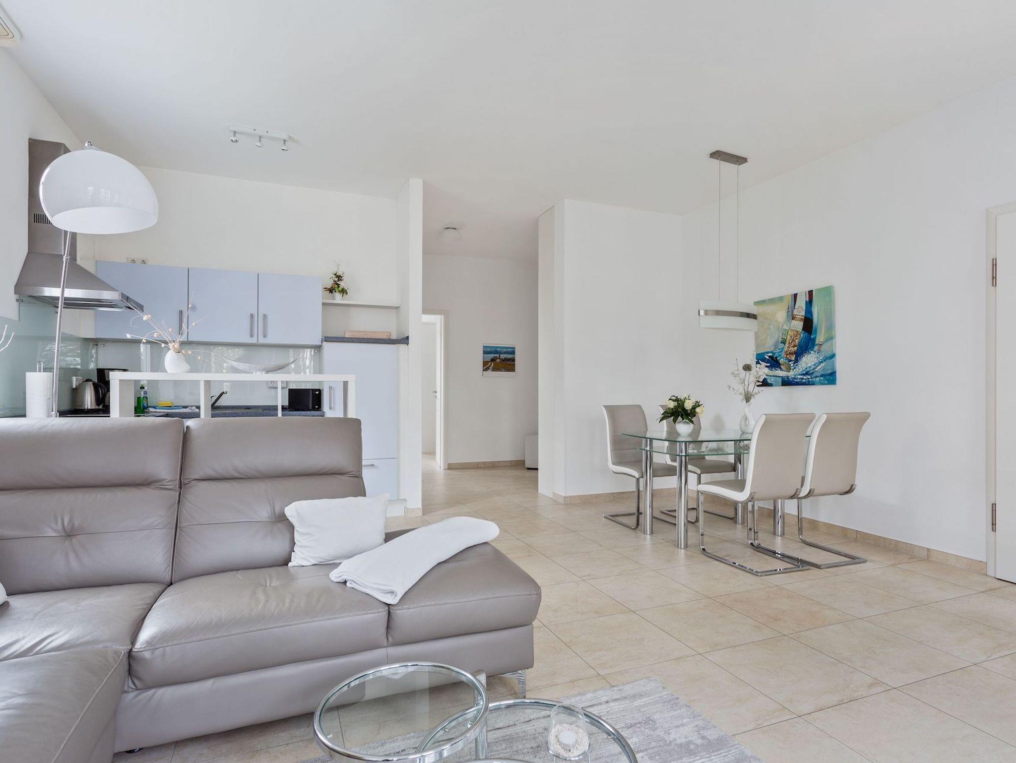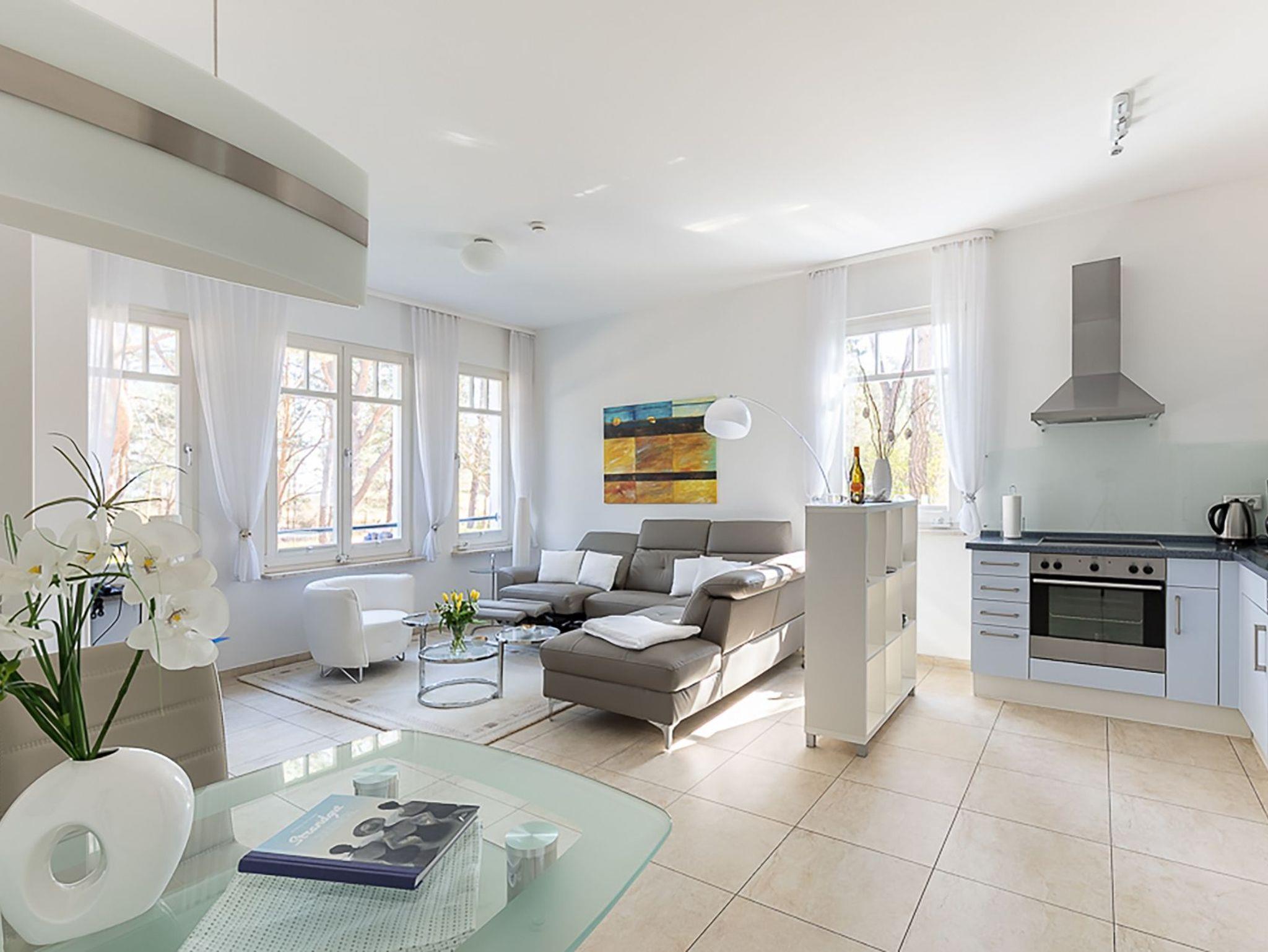 Das 60 m² große 2-Raum-Apartment Düne bietet Ihnen lichtdurchflutete Räume dank vieler Fenster und liegt im gemütlichen Hochparterre ? perfekt für 2 Erwachsene und 1 Kind bis 16 Jahre. Vom Wohnbereich genießen Sie durch die begrünte Düne einen Blick auf die Ostsee. Im Wohnraum erwarten Sie eine elegante sandgraue Ledercouch, stilvolle Essstühle, ein moderner UHD-LED-TV sowie eine offene, voll ausgestattete Küche. Das Schlafzimmer verwöhnt Sie mit einem komfortablen Boxspringbett (2,00 m x 1,80 m) und einem beleuchteten, 2 m breiten Kleiderschrank. Für Kinder bis 16 Jahre steht hier eine gemütliche Recamiere als zusätzliche Schlafgelegenheit bereit. Da sich unter dem Schlafzimmer der ebenerdige Wellnessbereich befindet, schlafen Sie angenehm erhöht ? wie im ersten Stock ? und blicken aus dem Fenster auf einen kleinen Park. Das Badezimmer verfügt über Dusche, Waschtisch, WC, Fenster und praktische Ablagen. Alle Fenster zur Ost- und Südseite sind mit außenliegenden, wärmereflektierenden Sonnenschutzrollos ausgestattet. Das schwellenfreie Apartment bietet durchgehend Fußbodenheizung, zwei gemütliche Außensitzplätze sowie einen PKW-Stellplatz direkt am Haus.