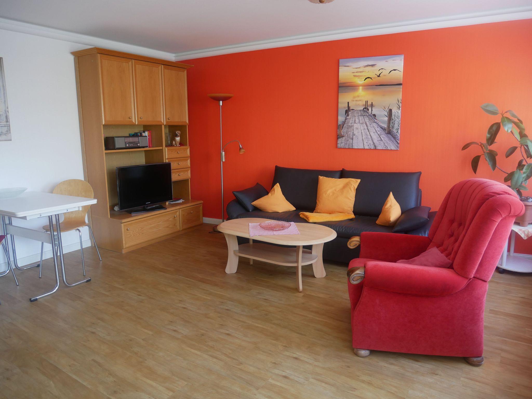Die 2-Raum-Wohnung Orange befindet sich im Erdgeschoss und ist ca. 50 m² groß. Das Wohnzimmer ist mit einer gemütlichen Couch, Sessel und Flachbildfernseher ausgestattet. Im Wohnzimmer befindet sich die offene Küche und der Essbereich. Die Küche verfügt über ein 2er-Cerankochfeld, Kühlschrank mit Gefriermöglichkeit, Kaffeemaschine, Wasserkocher, Toaster und Mikrowelle. Das Schlafzimmer ist ausgestattet mit einem gemütlichen Doppelbett, Fernseher und Kleiderschrank. Das Badezimmer verfügt über eine Dusche und einen Haartrockner. Vor der Wohnung befindet sich eine möblierte Terrasse mit Esstisch, Holzbänken und einem Strandkorb.
