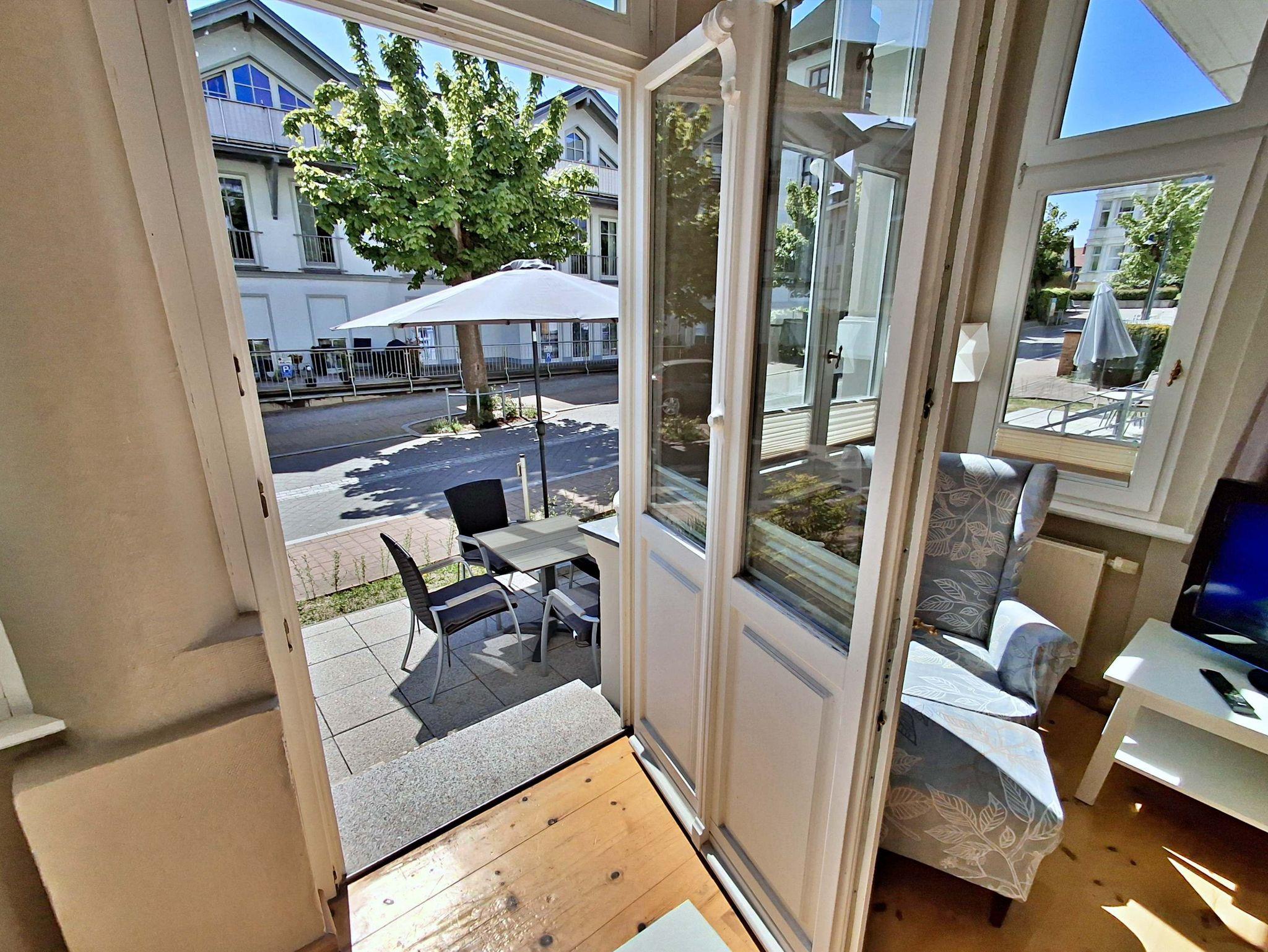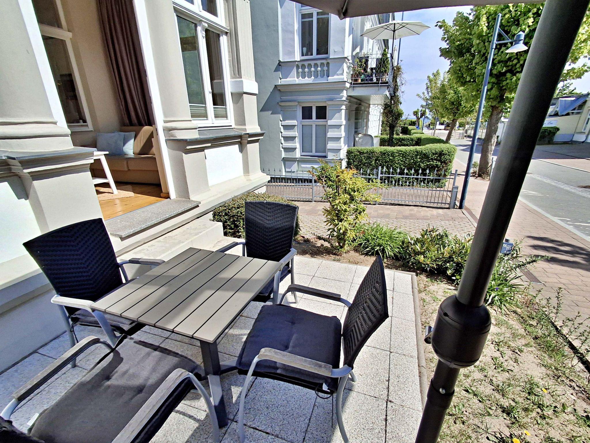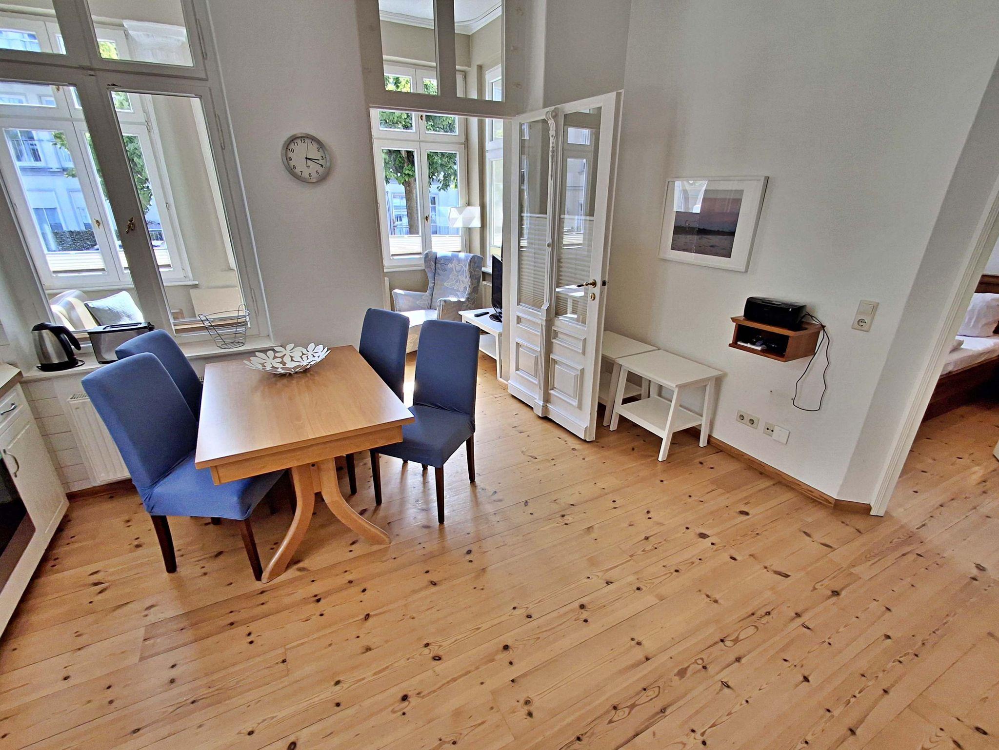 Die gemütliche 2,5 Zimmer-Wohnung Boltenhagen mit Terrasse für max. 3 Erwachsene und 1 Kleinkind bis 3 Jahre befindet sich in der stilvoll restaurierten Villa Ahlbeck - nur wenige Schritte von der Promenade und dem Strand entfernt. Die moderne Küchenzeile mit Ceranherd, Backofen, Geschirrspüler, Mikrowelle, Kaffeemaschine, Wasserkocher und Toaster lässt keine Wünsche offen. Bei schlechtem Wetter bietet der Esstisch mit 4 Stühlen genügend Platz für das Frühstück. Die absoluten Highlights der Wohnung sind die Veranda mit Couch (Aufbettungsmöglichkeit für 2 Personen) sowie die angrenzende Terrasse mit Süd-Ost-Ausrichtung. Auf der Terrasse können Sie bei herrlichstem Wetter schon morgens Ihren Kaffee genießen oder den Abend bei einem Glas Wein ausklingen lassen. Für die Unterhaltung sorgen ein Flachbild-TV, Radio-CD-Player und kostenfreies W-LAN. Das Schlafzimmer verfügt über ein Doppelbett und das Badezimmer hat DU/WC.