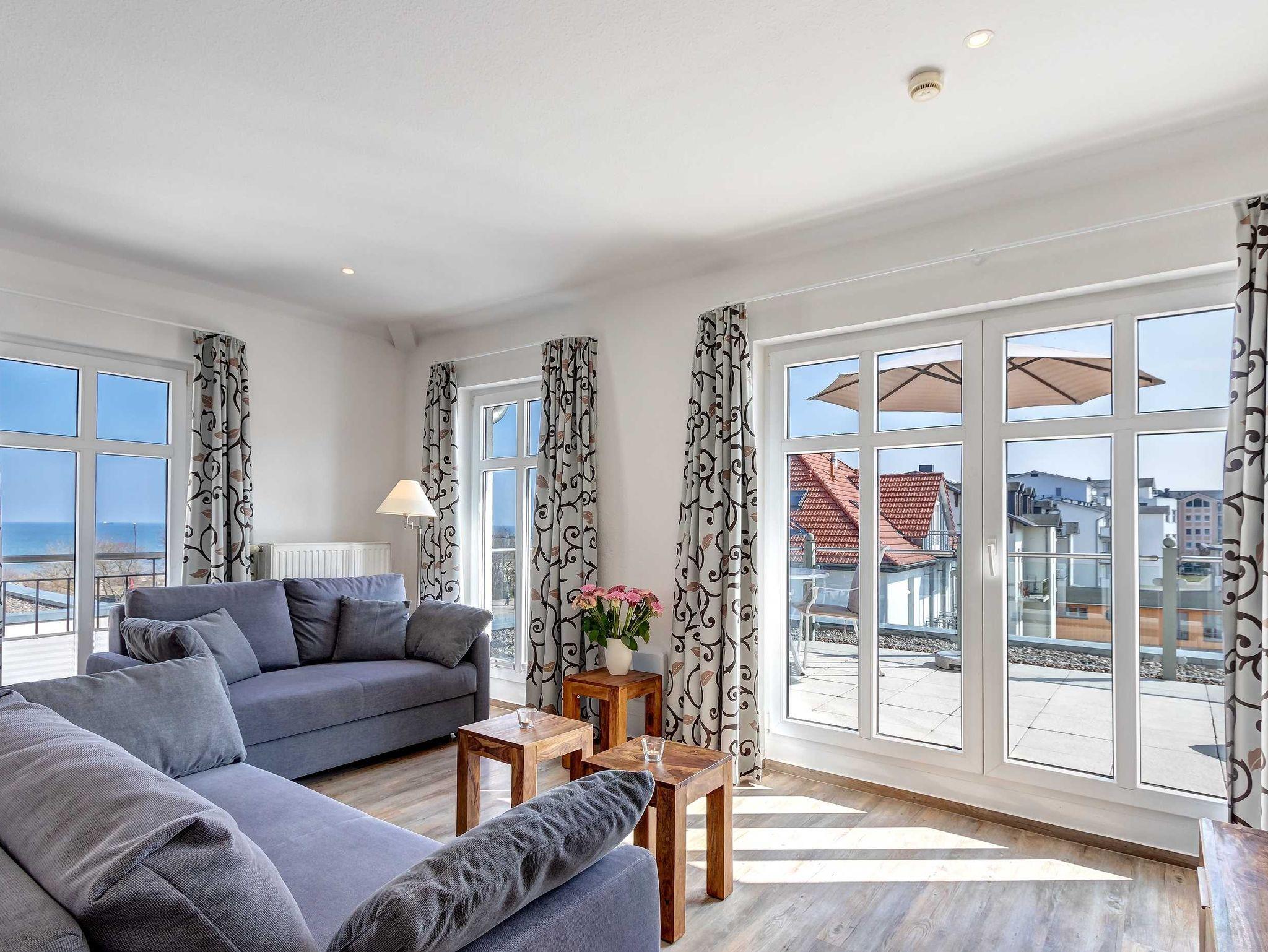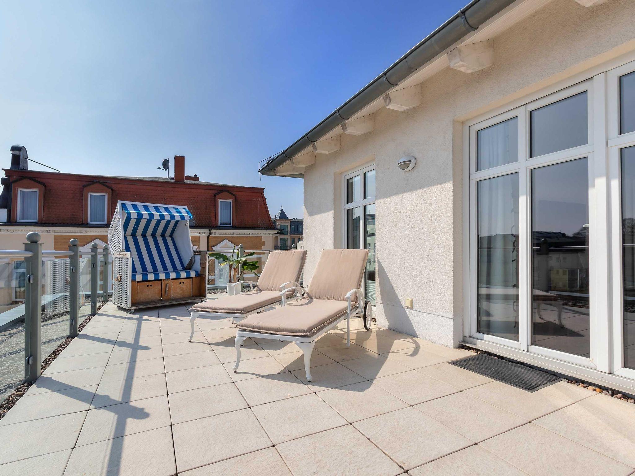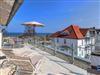 1. Reihe, PENTHOUSE direkt an der Strandpromenade mit SEEBLICK, DACHTERRASSE und FAHRSTUHL im Haus! Chices geräumiges 3-Zimmer-Apartment (ca. 55 m²) mit moderner hochwertiger Ausstattung. Zwei separate Schlafzimmer, Wohnzimmer mit Küchenbereich und Essplatz, Duschbad, 45 qm Dachterrasse über Eck nach Osten und Süden mit Sonne von morgens bis abends und herrlichem Seeblick. Die Wohnung verfügt über einen Tiefgaragen-Pkw-Stellplatz. In der Garage können auch Fahrräder und ähnliches untergestellt werden. In unserer Villa Germania nebenan gibt es eine Sauna. Von der Villa Aquamarina sind es zum Ortszentrum und der Seebrücke ca. 3 Minuten zu Fuß. Zum Strand sind es 50 m.