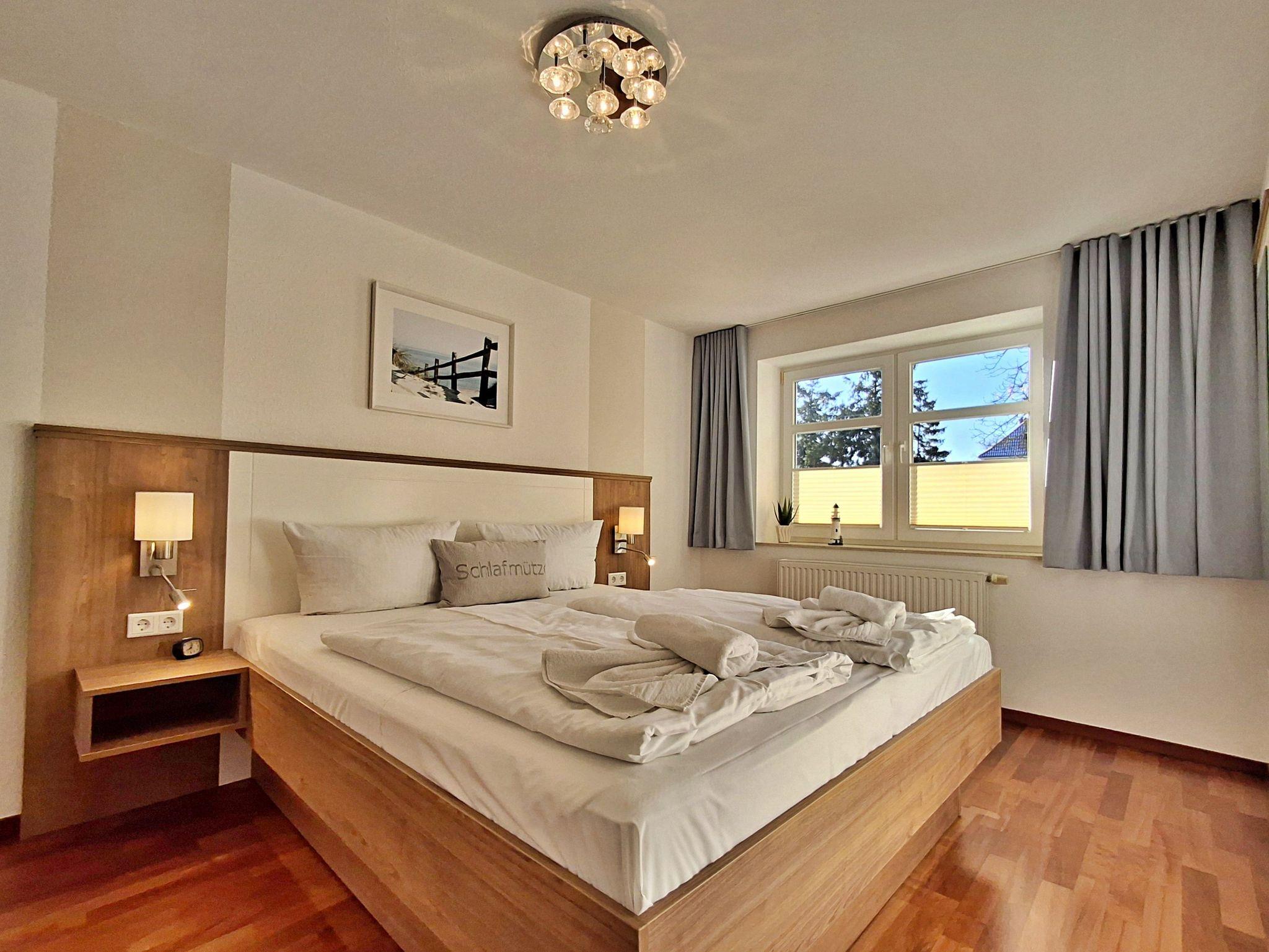 Das separate Schlafzimmer ist mit einem komfortablen Doppelbett ausgestattet. Das Badezimmer verfügt über Dusche und WC.