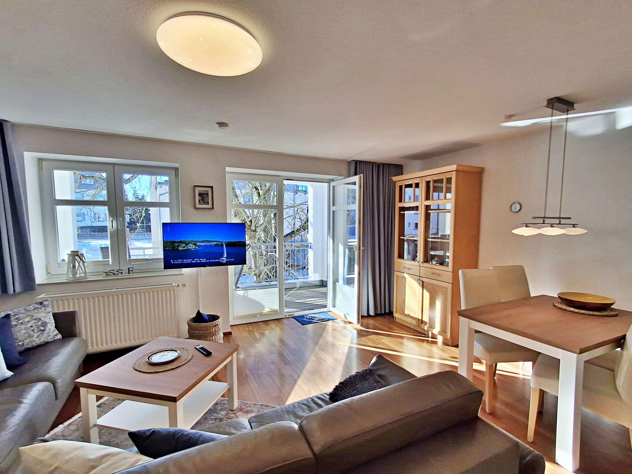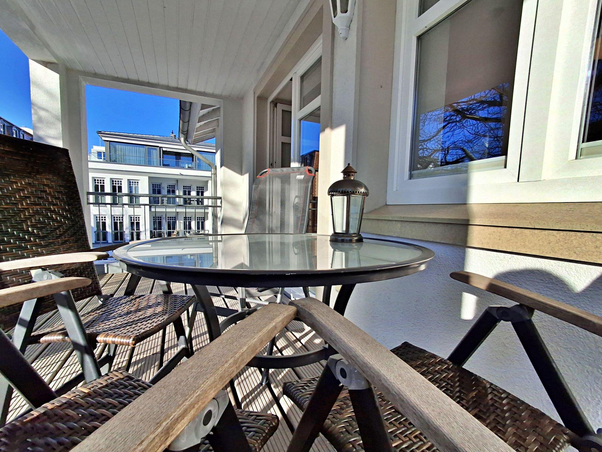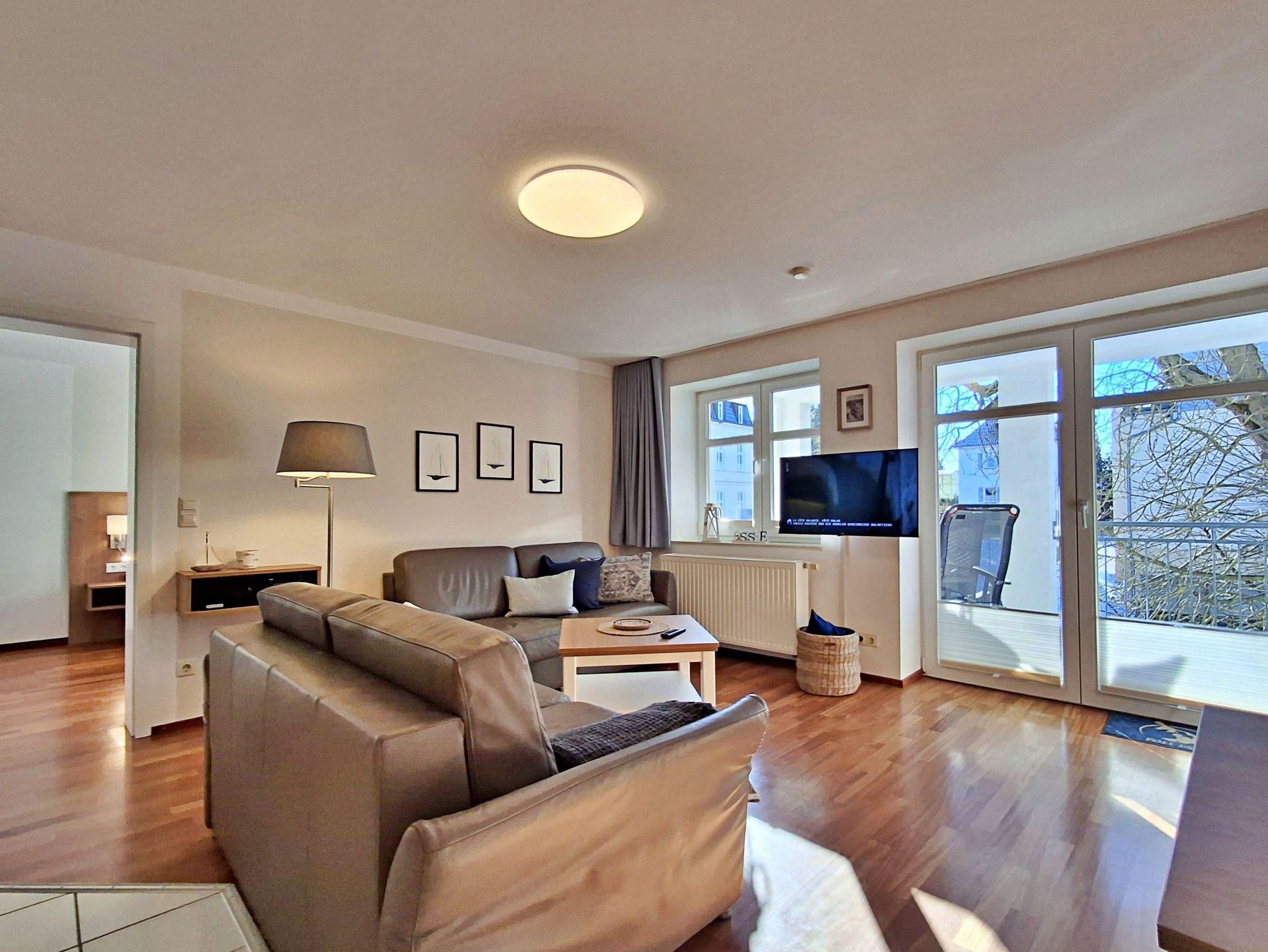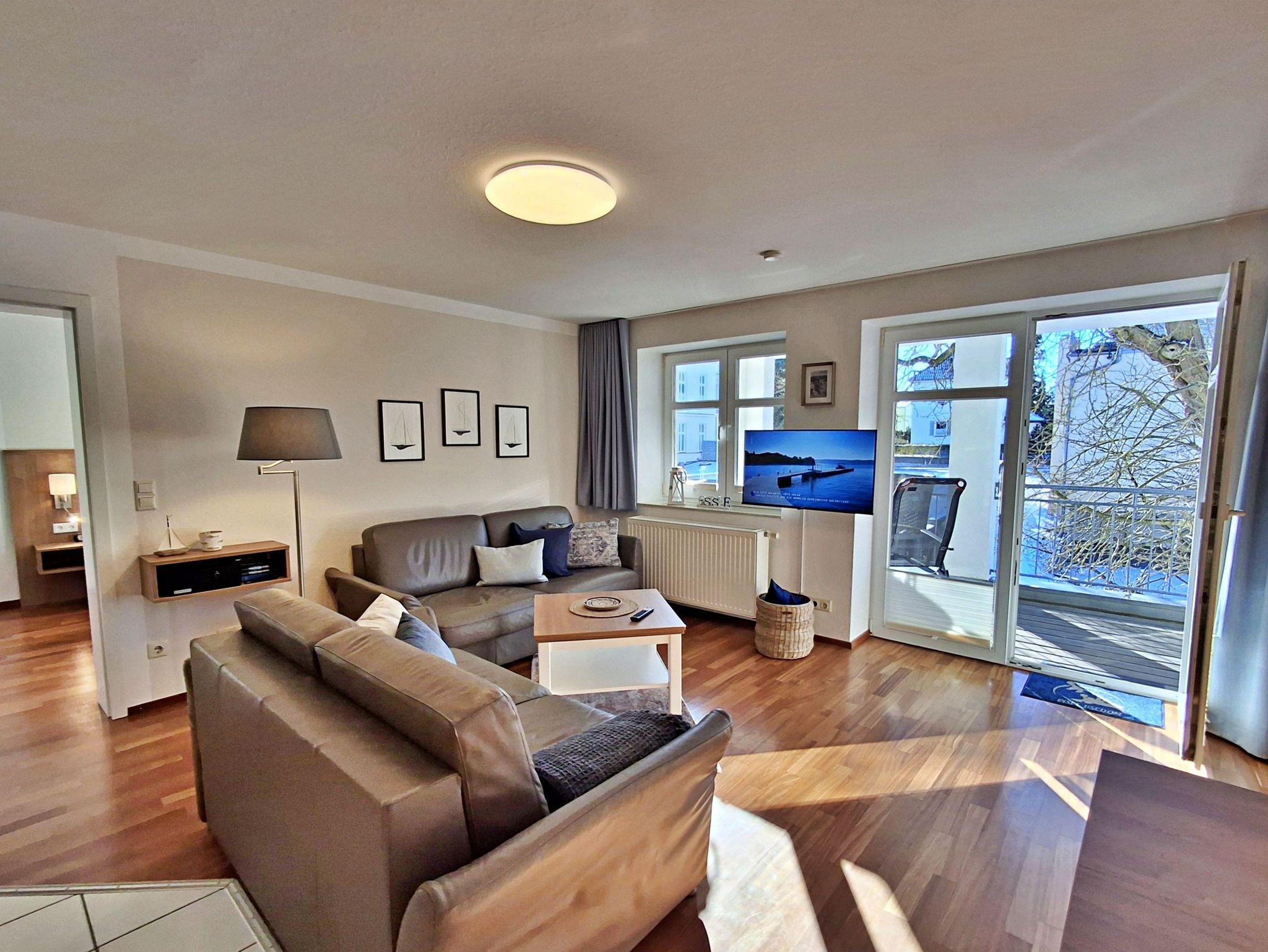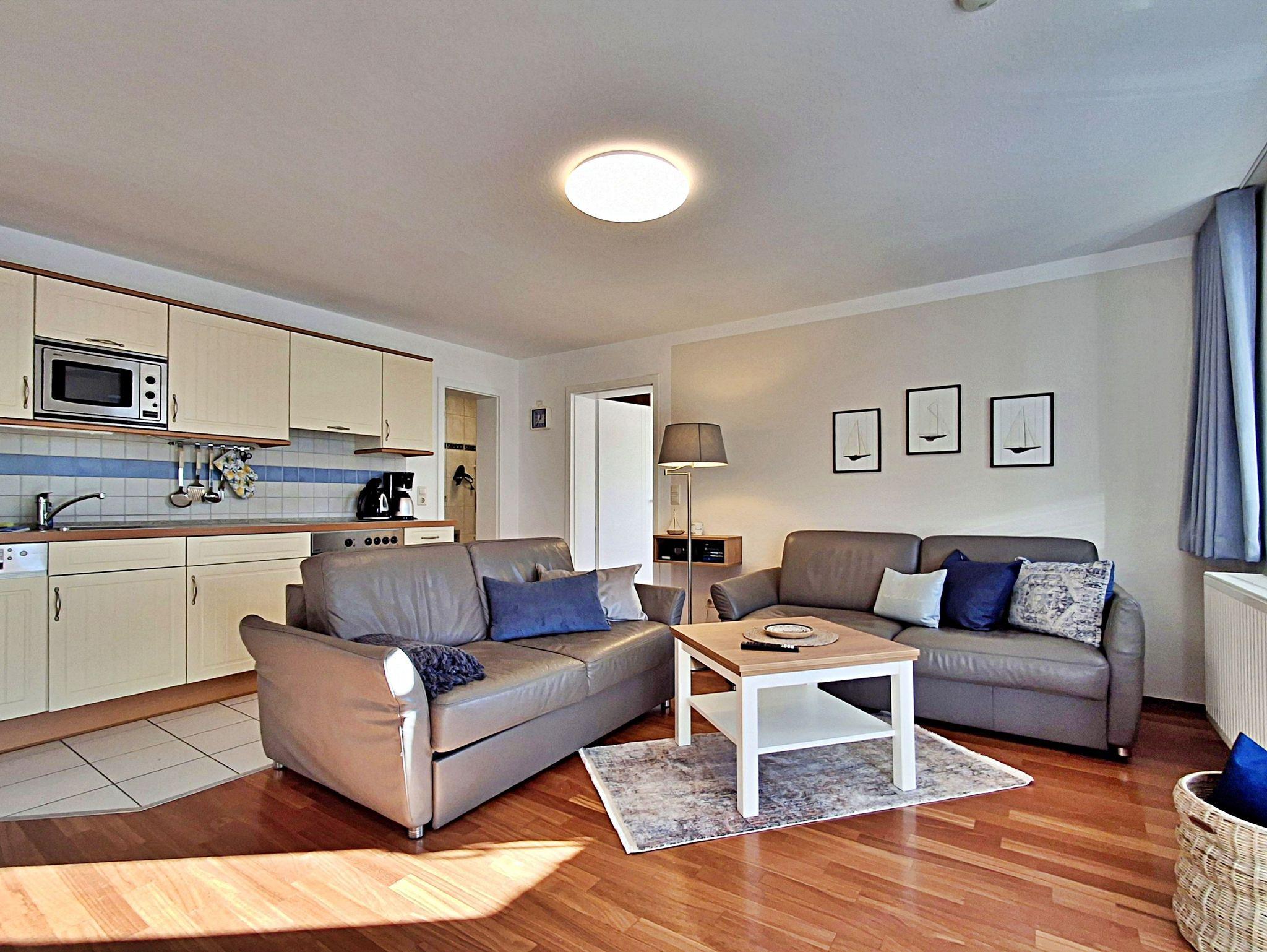 Der helle Wohnbereich ist komfortabel eingerichtet und verfügt über zwei gemütliche Sofas sowie einen Esstisch mit vier Stühlen, der ausreichend Platz für gemeinsame Mahlzeiten bietet. Ein besonderes Highlight ist der großzügige Westbalkon, auf dem Sie bei schönem Wetter bereits am Morgen Ihren Kaffee genießen oder den Abend entspannt bei einem Glas Wein ausklingen lassen können.