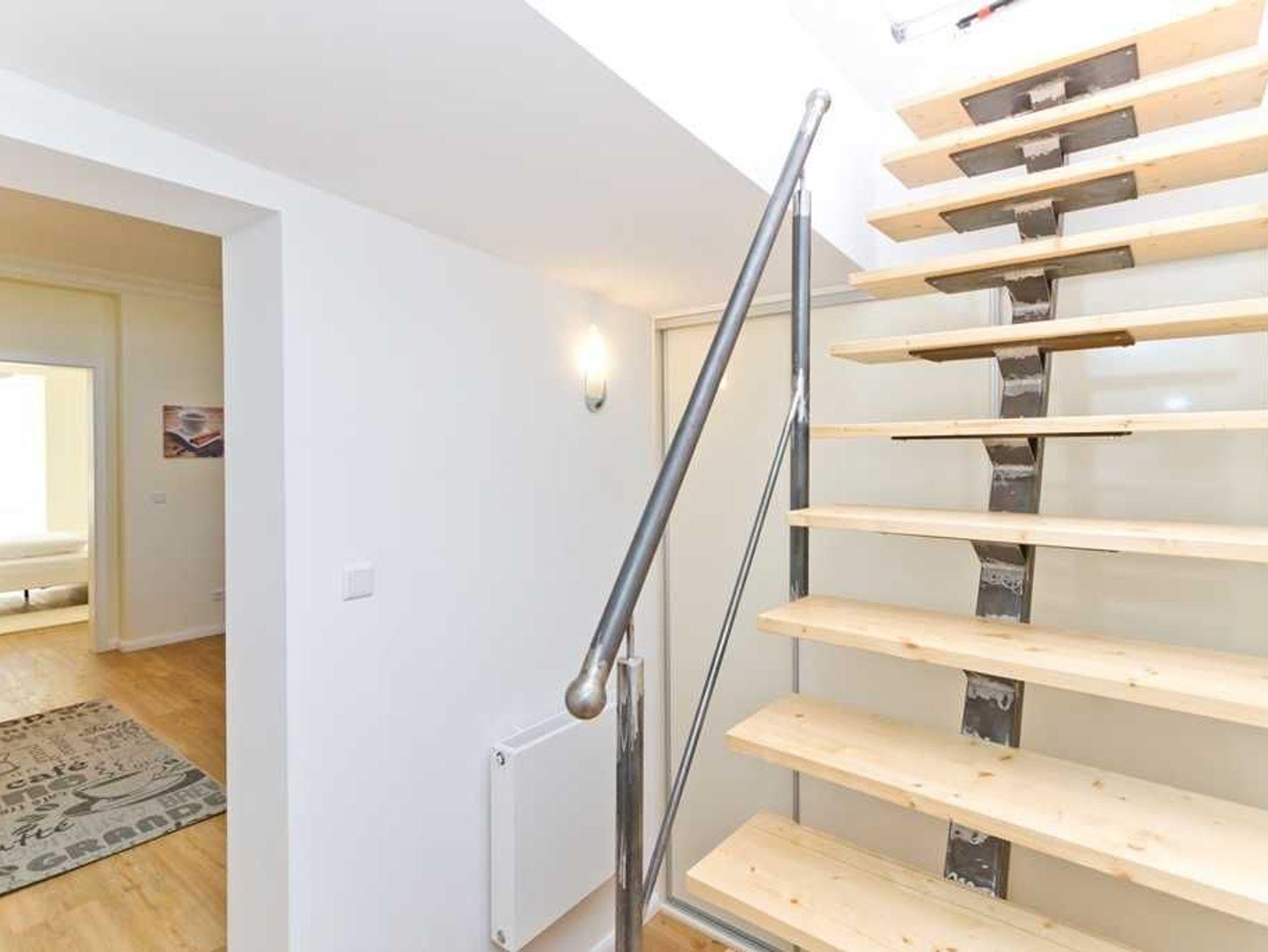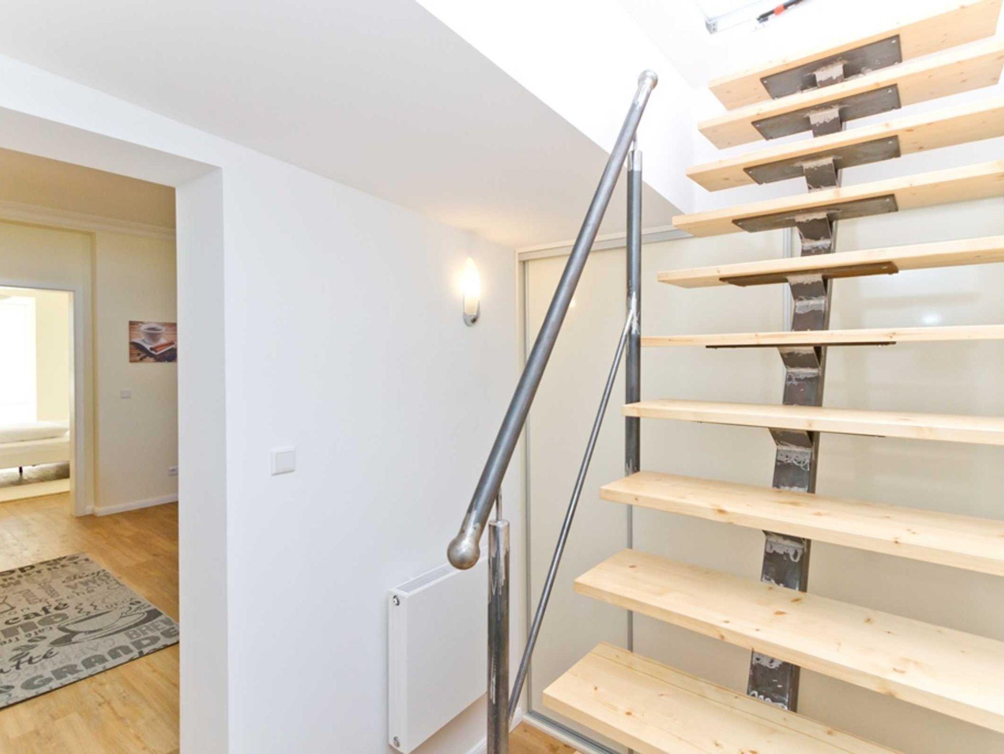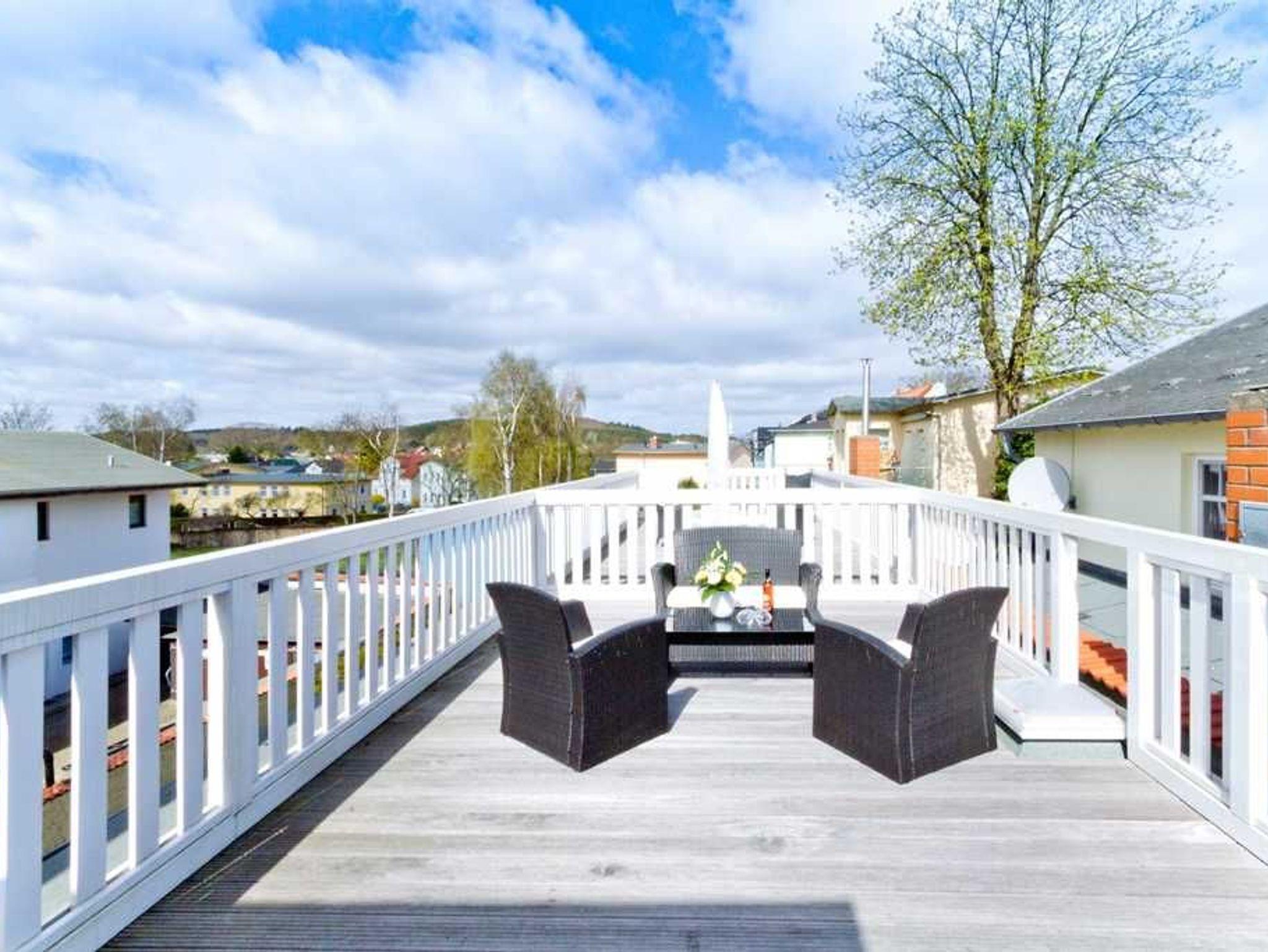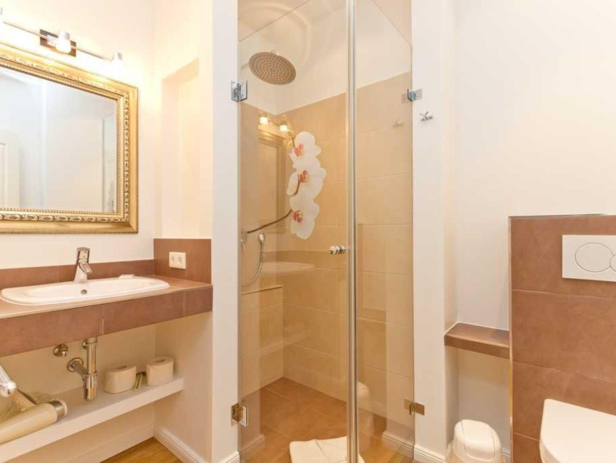 Die Dachterrasse erreichen Sie über eine kleine offene Treppe auf dem Flur der Wohnung. Hier genießen Sie das Frühstück unter freiem Himmel oder das Gläschen Wein am Abend. Das Badezimmer mit WC und Walk-in-Dusche trägt ebenfalls zum Urlaubsvergnügen bei.