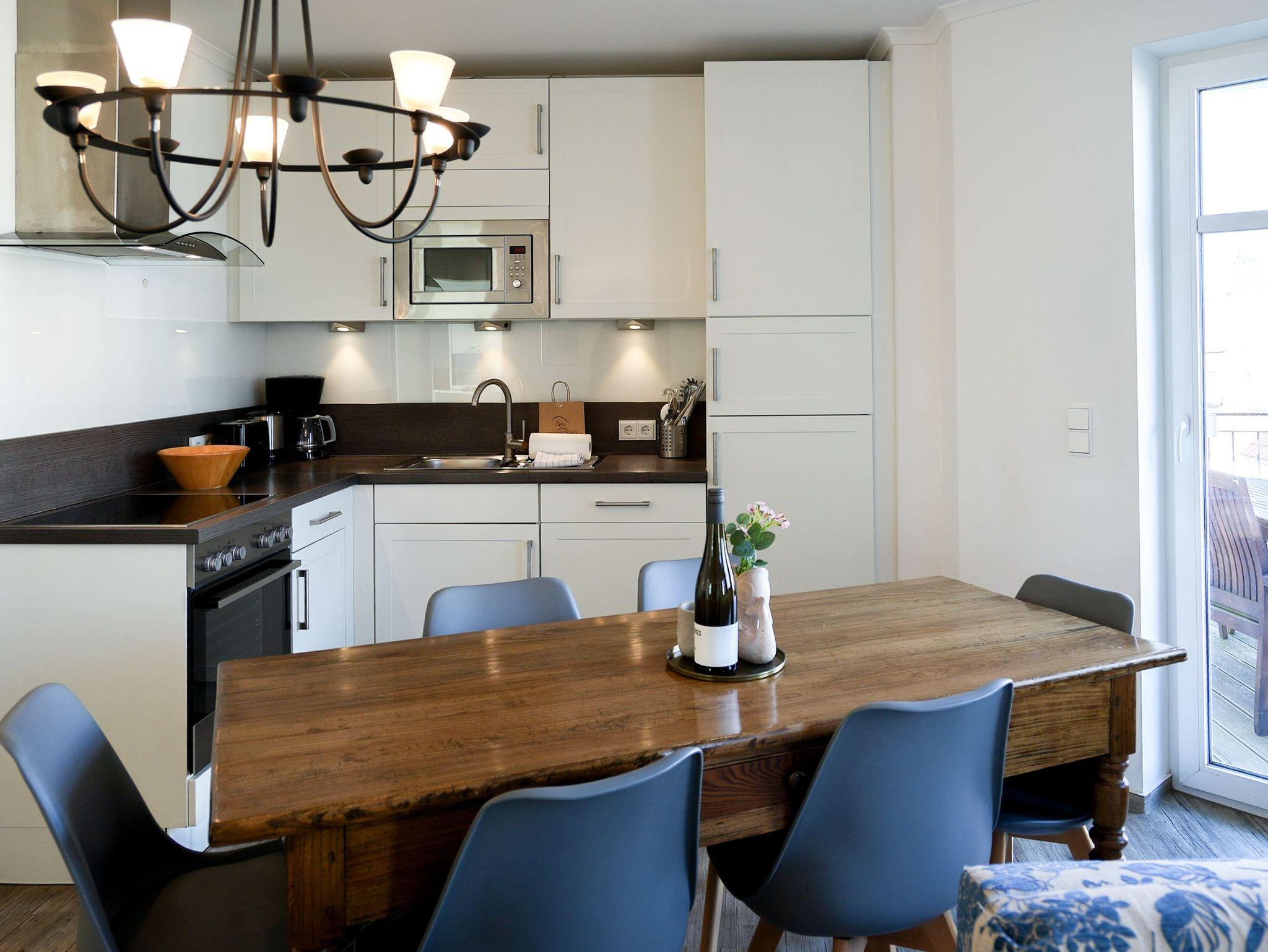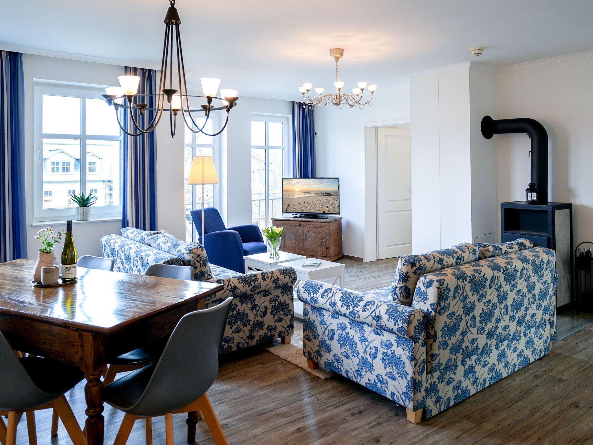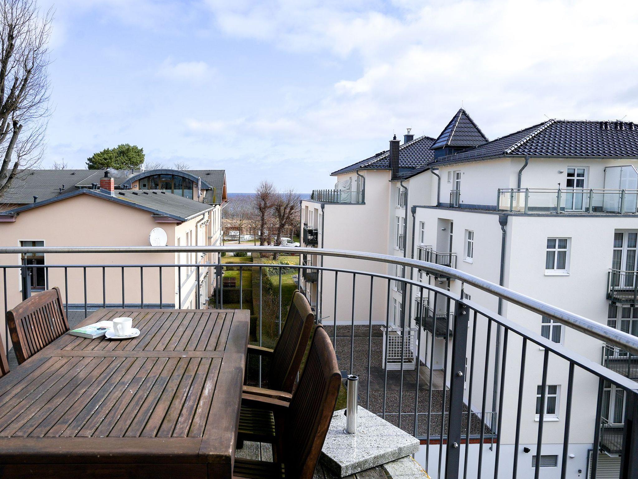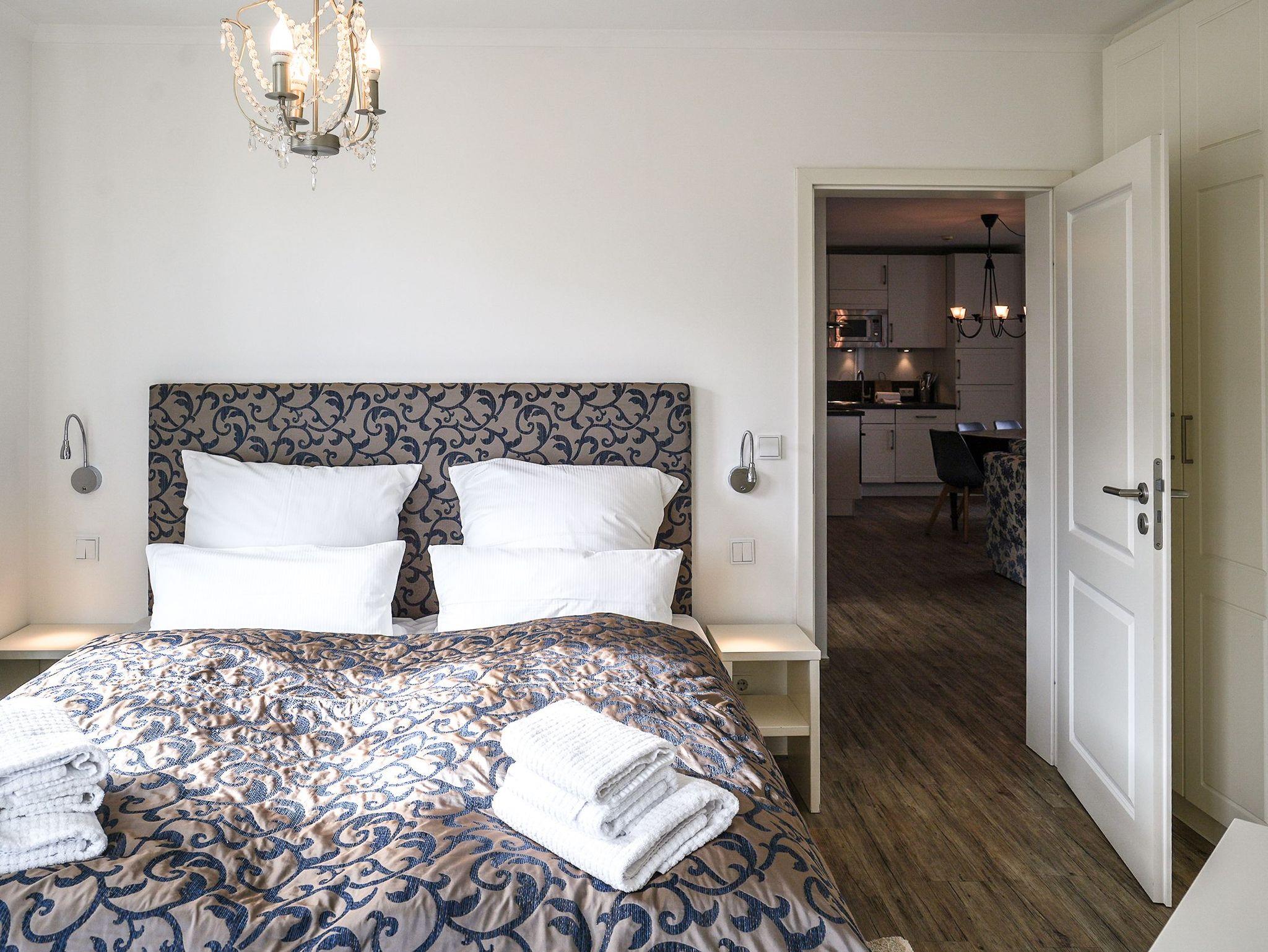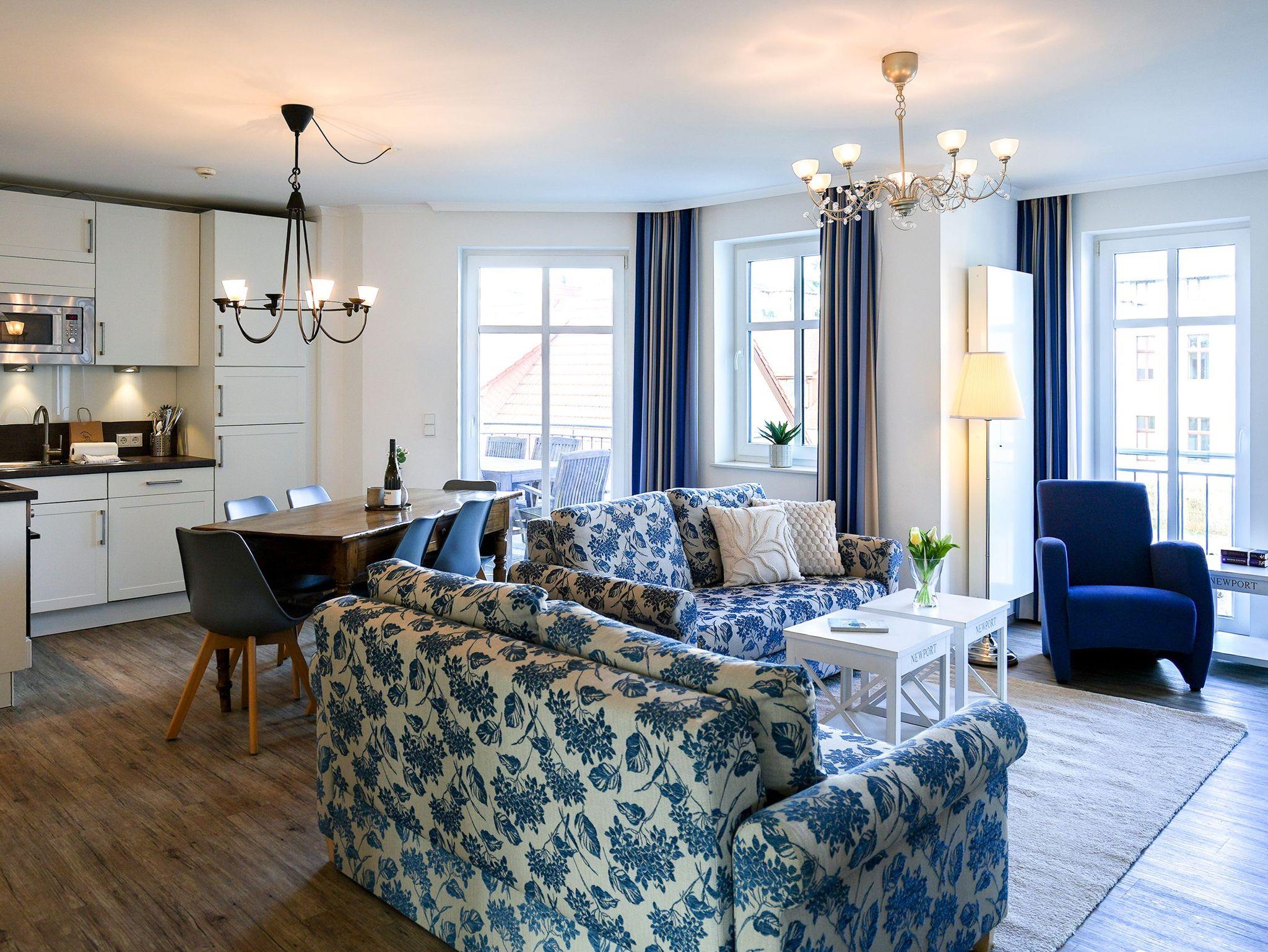 Diese großzügige 4-Raum-Ferienwohnung im 2. Obergeschoss bietet auf rund 97 m² viel Platz für bis zu sechs Personen und ist ideal für einen entspannten Urlaub am Meer. Herzstück der Wohnung ist der offene Wohn- und Essbereich mit integrierter Küchenzeile. Die Küche ist komplett ausgestattet und verfügt unter anderem über Backofen, Mikrowelle, Geschirrspüler und ein Gefrierfach, sodass Sie sich auch im Urlaub bequem selbst versorgen können. Am großen Esstisch finden bis zu sechs Personen Platz. Die gemütliche Sitzgruppe mit Kaminofen und Flat-TV lädt zu entspannten Abenden ein. Drei separate Schlafzimmer sind jeweils mit komfortablen Boxspringdoppelbetten (1,80 m x 2,00 m) und Kleiderschrank eingerichtet. Zwei der Schlafzimmer verfügen zusätzlich über einen eigenen Flat-TV. Besonders komfortabel sind die drei modernen Badezimmer mit Dusche, Waschtisch und WC. Eines der Bäder bietet zusätzlich eine Badewanne. Zwei der Bäder sind direkt an ein Schlafzimmer angeschlossen (ensuite) und bieten einen schönen Blick zum Meer. Für sonnige Stunden im Freien stehen Ihnen zwei Balkone mit Bestuhlung zur Verfügung. Einer ist nach Osten ausgerichtet und eignet sich perfekt für ein Frühstück in der Morgensonne, der andere zeigt nach Westen und lädt dazu ein, den Tag bei Abendsonne ausklingen zu lassen. Ein PKW-Stellplatz (Nr. 10) in der teilüberdachten Tiefgarage gehört zur Wohnung. Außerdem steht eine gemeinschaftliche Fahrradabstellfläche zur Verfügung. Münzwaschmaschine- und Wäschetrockner können im Untergeschoss gemeinschaftlich genutzt werden.