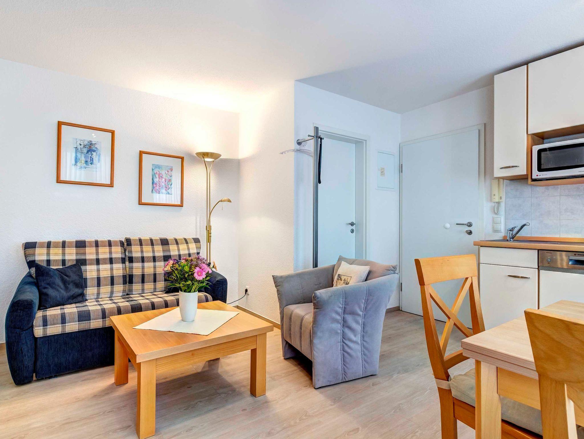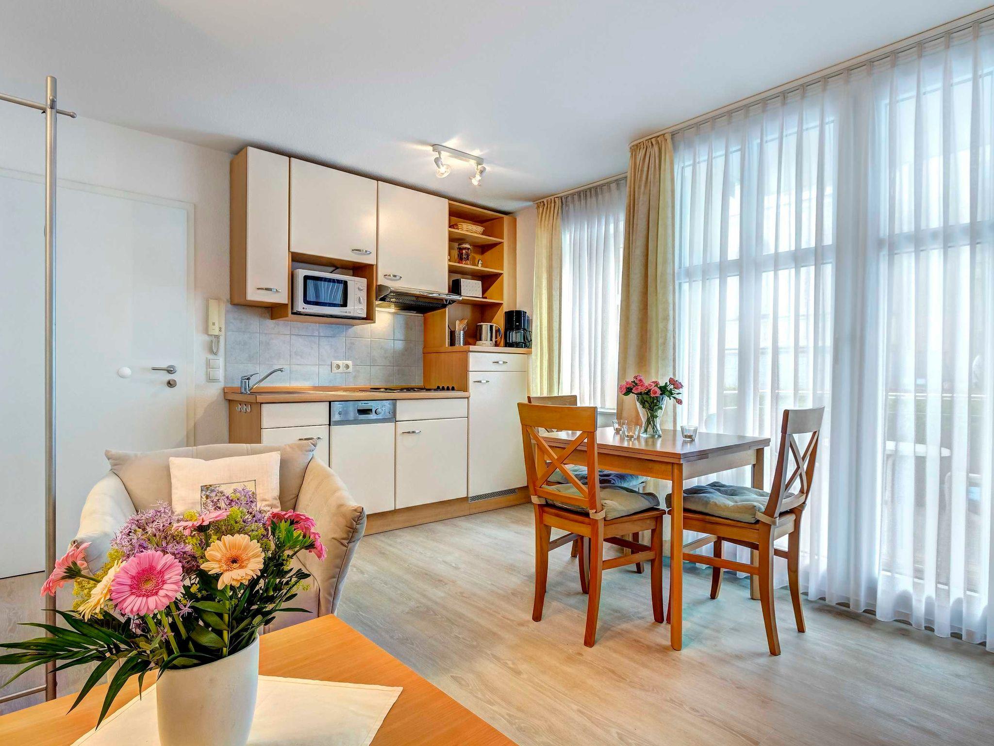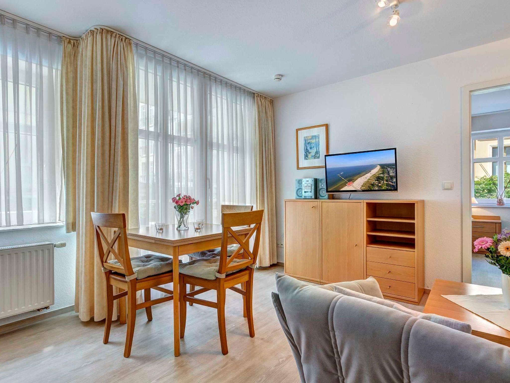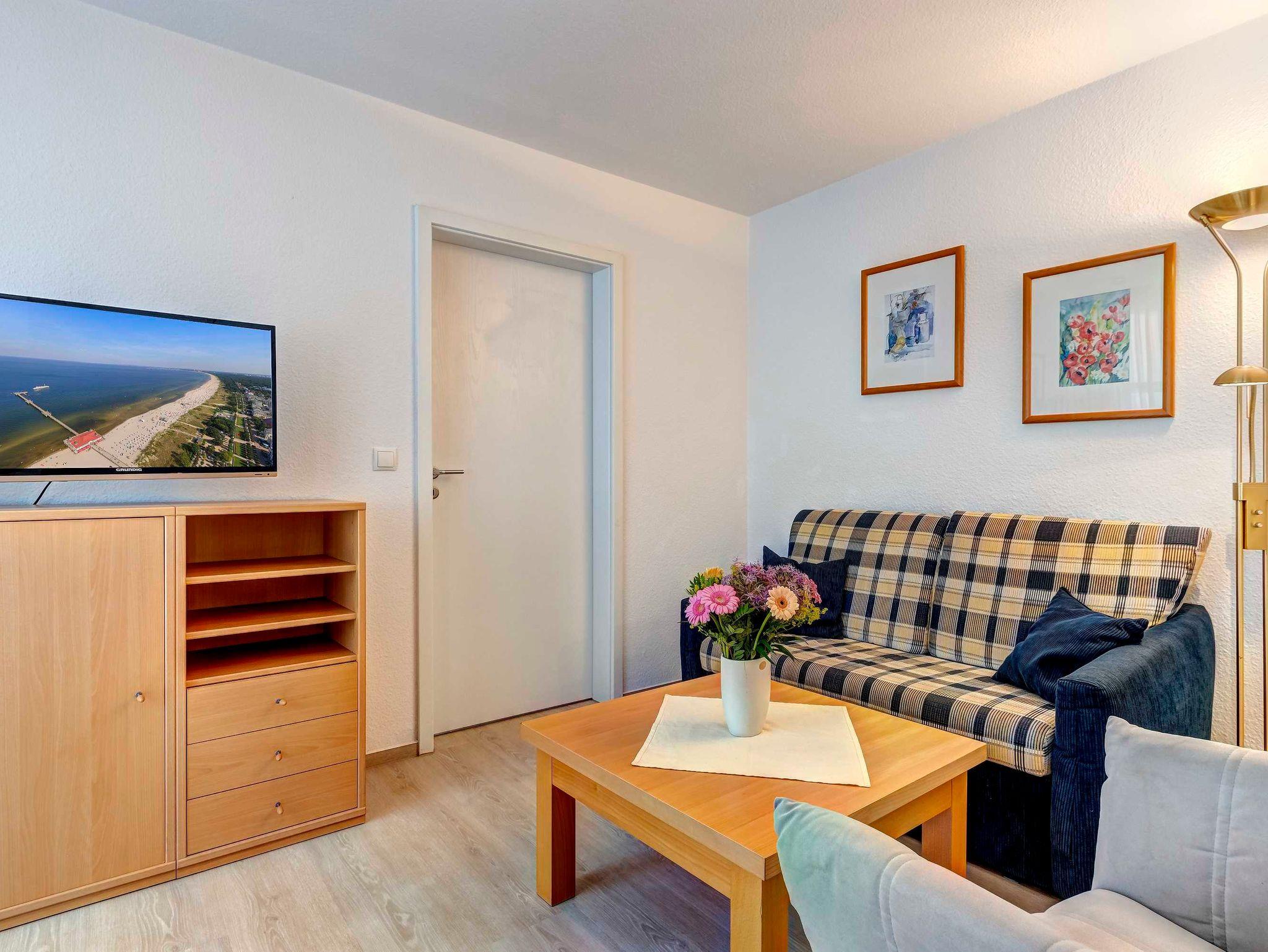Schönes 2-Zimmer-Apartment (ca. 34 m²) mit moderner guter Ausstattung. Separates Schlafzimmer (mit Fernseher), Wohnzimmer mit Küchenzeile mit Essplatz, Duschbad, Balkon zur Südseite mit Sonne bis abends. Die Wohnung verfügt über einen Pkw-Stellplatz. In der Garage können auch Fahrräder und ähnliches untergestellt werden. Von der Villa Aquamarina aus können Sie das Ortszentrum und die bekannte Ahlbecker Seebrücke in ca. 3 Minuten zu Fuß erreichen. Zum Strand sind es 50 m.