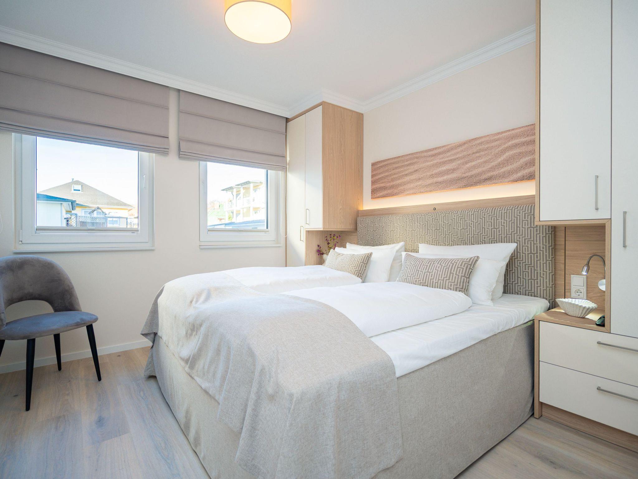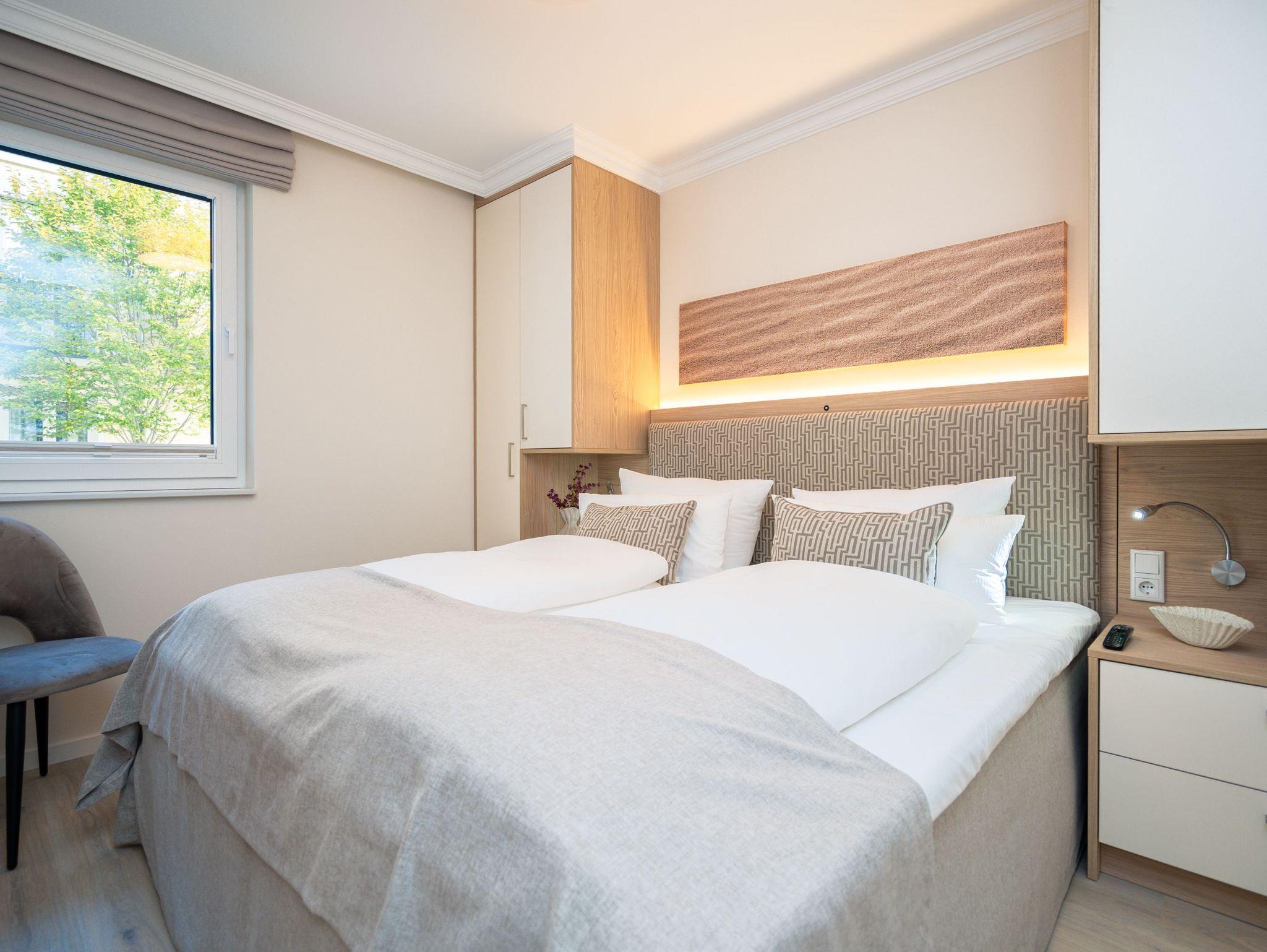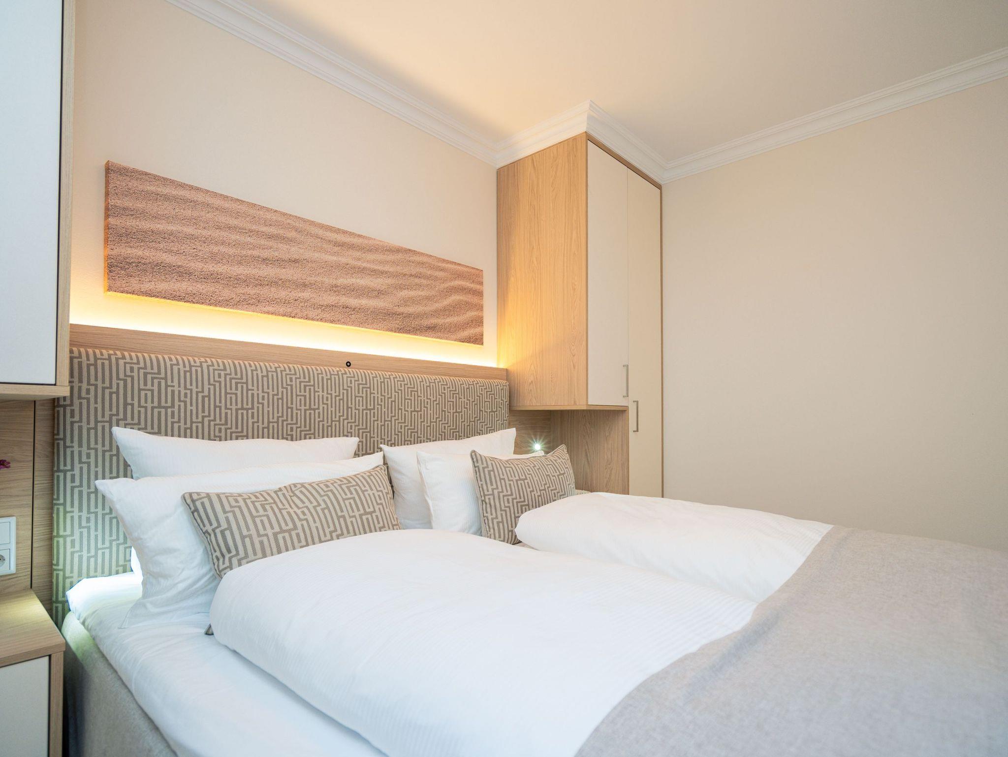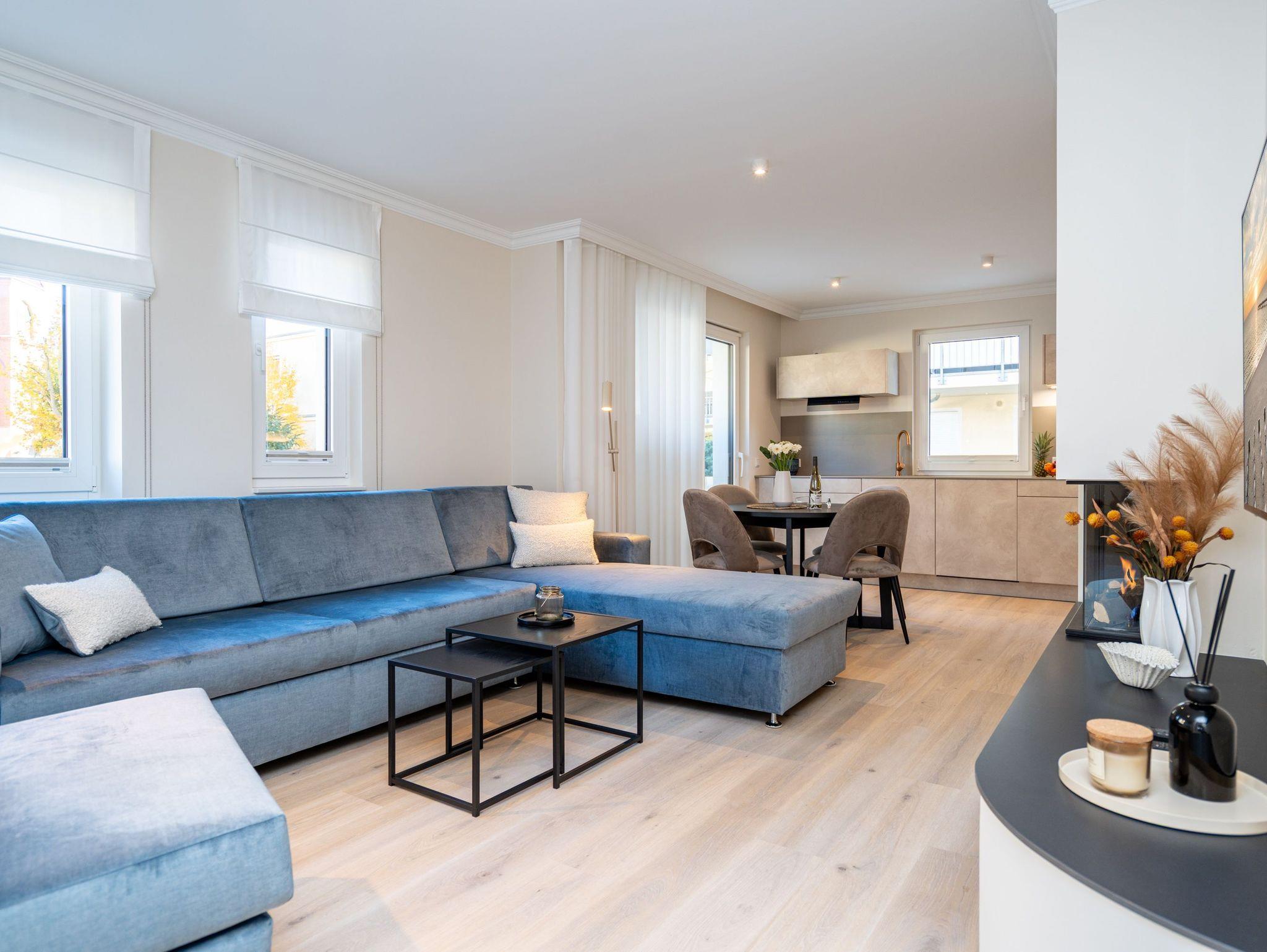 Die Wohnung bietet auf 67 Quadratmetern einen klar strukturierten Grundriss und eine angenehme Atmosphäre. Der Wohnbereich ist offen gestaltet, hell und aufgeräumt. Die Sitzgruppe, der Kamin mit Fernbedienung und der Fernseher schaffen einen Bereich, in dem man sich ohne viel Aufwand wohlfühlt. Die Küche ist vollständig ausgestattet und eignet sich auch für längere Aufenthalte. Backofen, Induktionsfeld, Mikrowelle, Spülmaschine und ein Kühlschrank mit Gefrierfach sind vorhanden. Der Essplatz schließt direkt an. Von hier aus geht es auf die große Terrasse nach Südost. Fünfzig Quadratmeter bieten genug Fläche für ein ruhiges Frühstück, ein Buch oder ein Glas Wein am Nachmittag. Gartenmöbel stehen bereit. Beide Schlafzimmer sind mit Boxspringbetten (1,80 m x 2,00 m) eingerichtet. Dazu gibt es jeweils einen Kleiderschrank und einen Fernseher. Die beiden Bäder sind modern gehalten und jeweils mit Dusche, Waschtisch und WC ausgestattet. In einem der Bäder befindet sich eine finnische Sauna für zwei Personen, die an kühleren Tagen eine echte Wohlfühloase ist. Ein Stellplatz in der Tiefgarage (Durchfahrthöhe 1,85m) gehört zur Wohnung. WLAN steht ohne Zusatzkosten zur Verfügung.