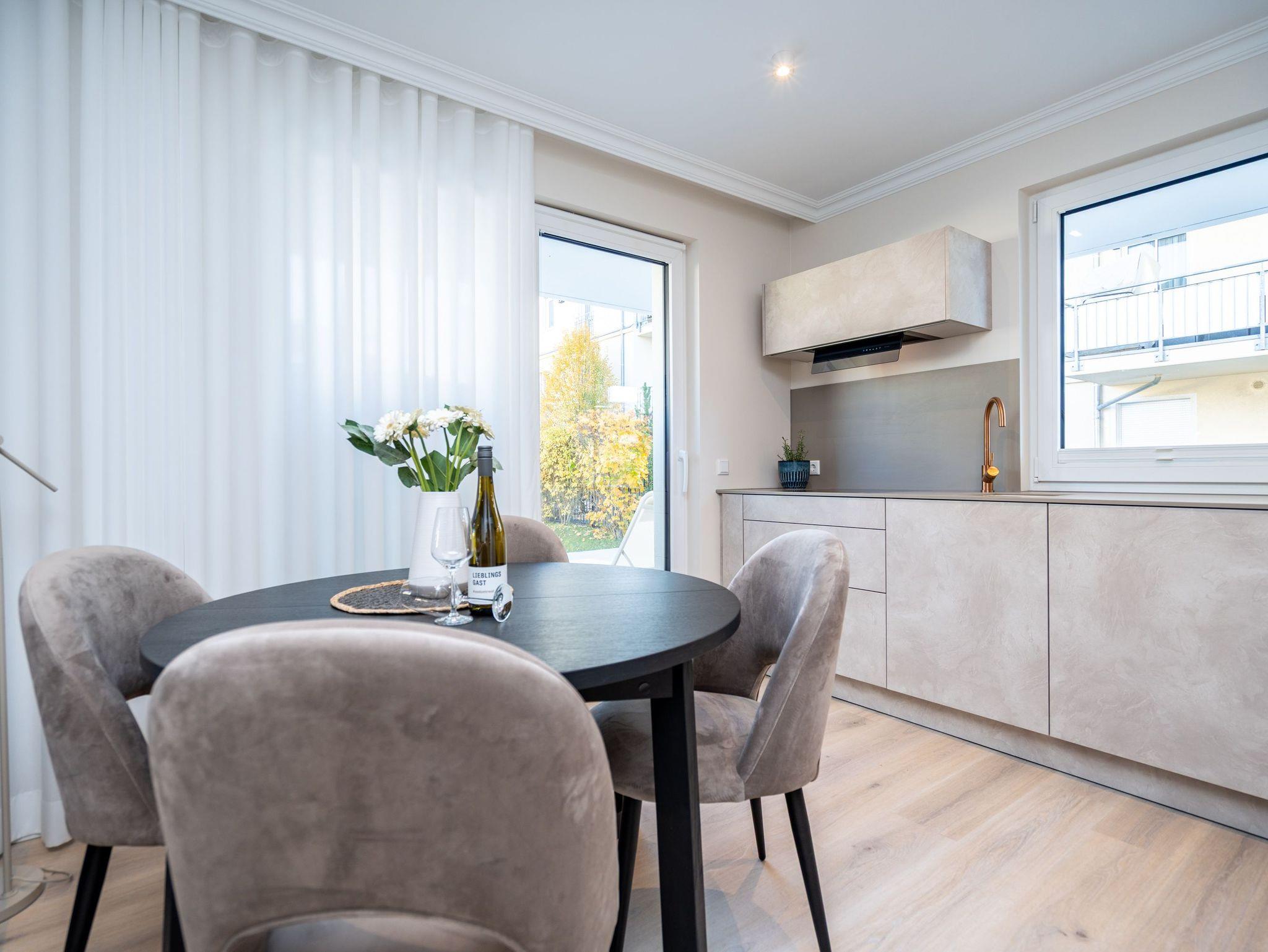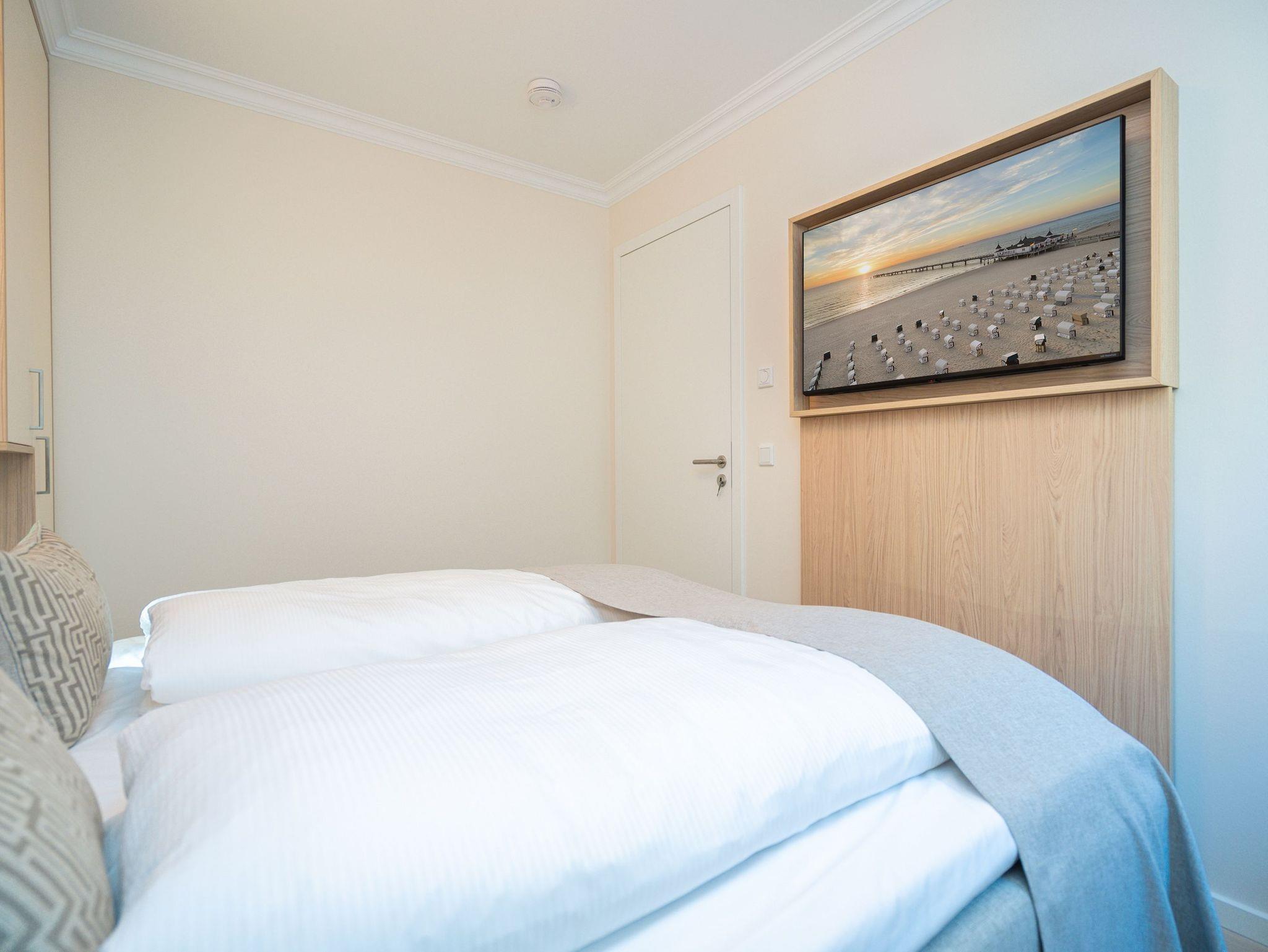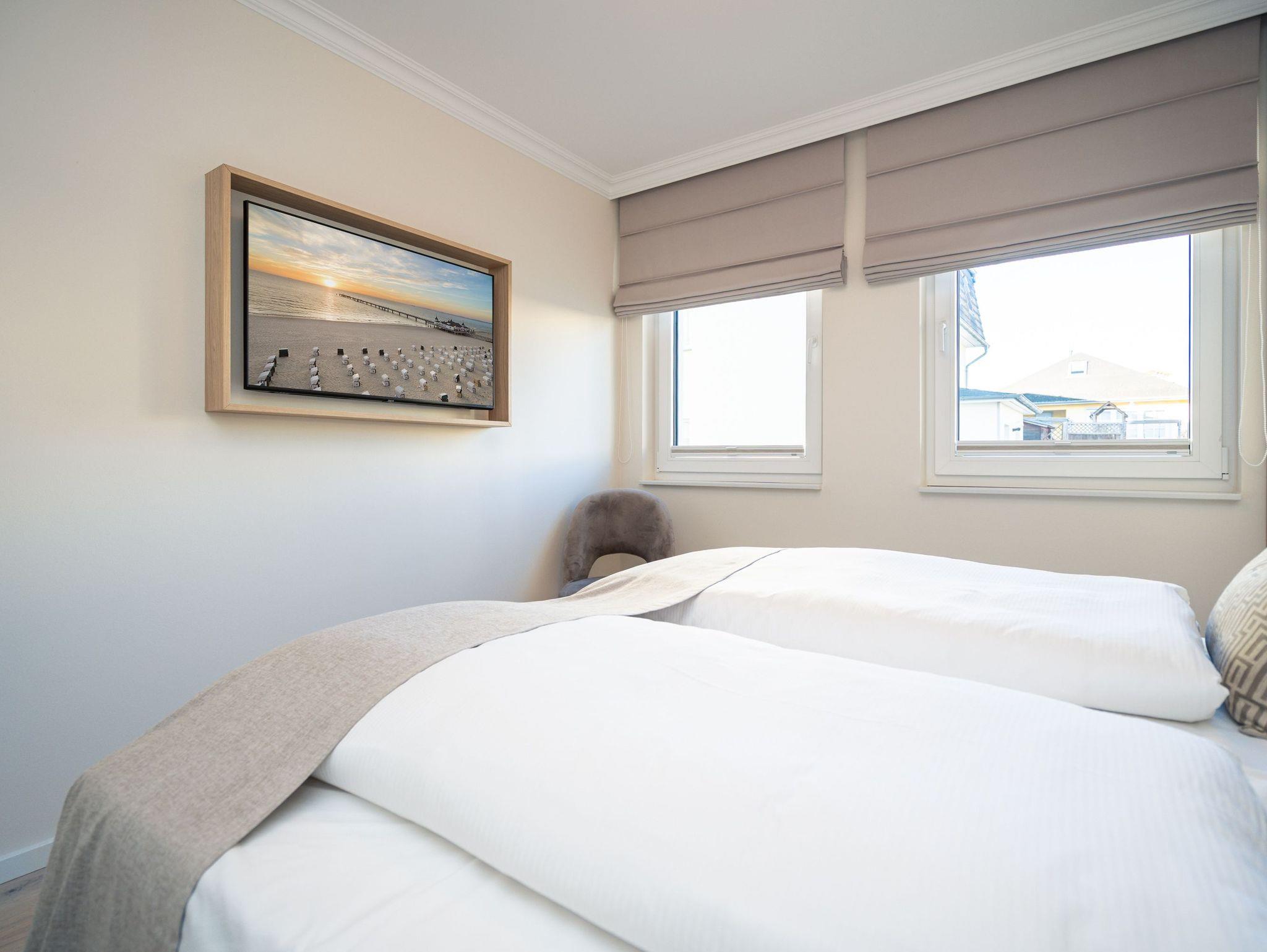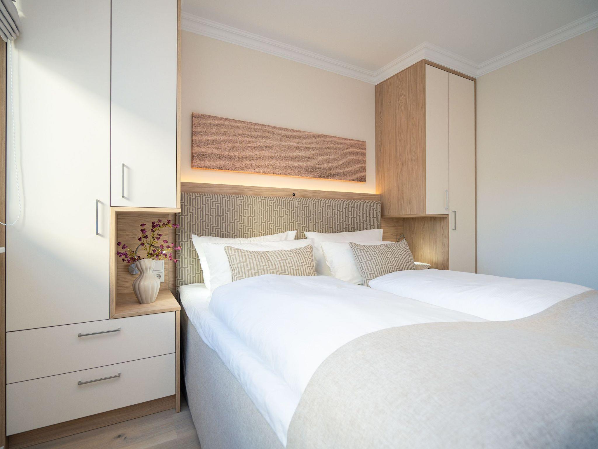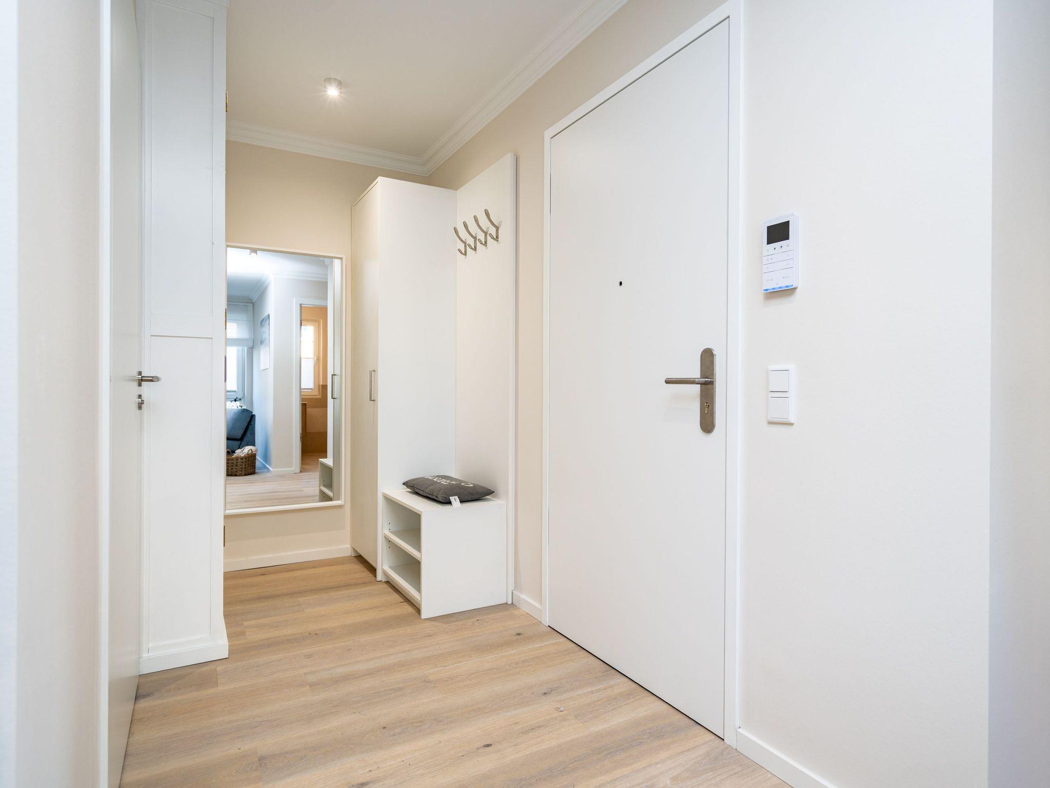 Die Wohnung bietet auf 67 Quadratmetern einen klar strukturierten Grundriss und eine angenehme Atmosphäre. Der Wohnbereich ist offen gestaltet, hell und aufgeräumt. Die Sitzgruppe, der Kamin mit Fernbedienung und der Fernseher schaffen einen Bereich, in dem man sich ohne viel Aufwand wohlfühlt. Die Küche ist vollständig ausgestattet und eignet sich auch für längere Aufenthalte. Backofen, Induktionsfeld, Mikrowelle, Spülmaschine und ein Kühlschrank mit Gefrierfach sind vorhanden. Der Essplatz schließt direkt an. Von hier aus geht es auf die große Terrasse nach Südost. Fünfzig Quadratmeter bieten genug Fläche für ein ruhiges Frühstück, ein Buch oder ein Glas Wein am Nachmittag. Gartenmöbel stehen bereit. Beide Schlafzimmer sind mit Boxspringbetten (1,80 m x 2,00 m) eingerichtet. Dazu gibt es jeweils einen Kleiderschrank und einen Fernseher. Die beiden Bäder sind modern gehalten und jeweils mit Dusche, Waschtisch und WC ausgestattet. In einem der Bäder befindet sich eine finnische Sauna für zwei Personen, die an kühleren Tagen eine echte Wohlfühloase ist. Ein Stellplatz in der Tiefgarage (Durchfahrthöhe 1,85m) gehört zur Wohnung. WLAN steht ohne Zusatzkosten zur Verfügung.