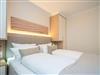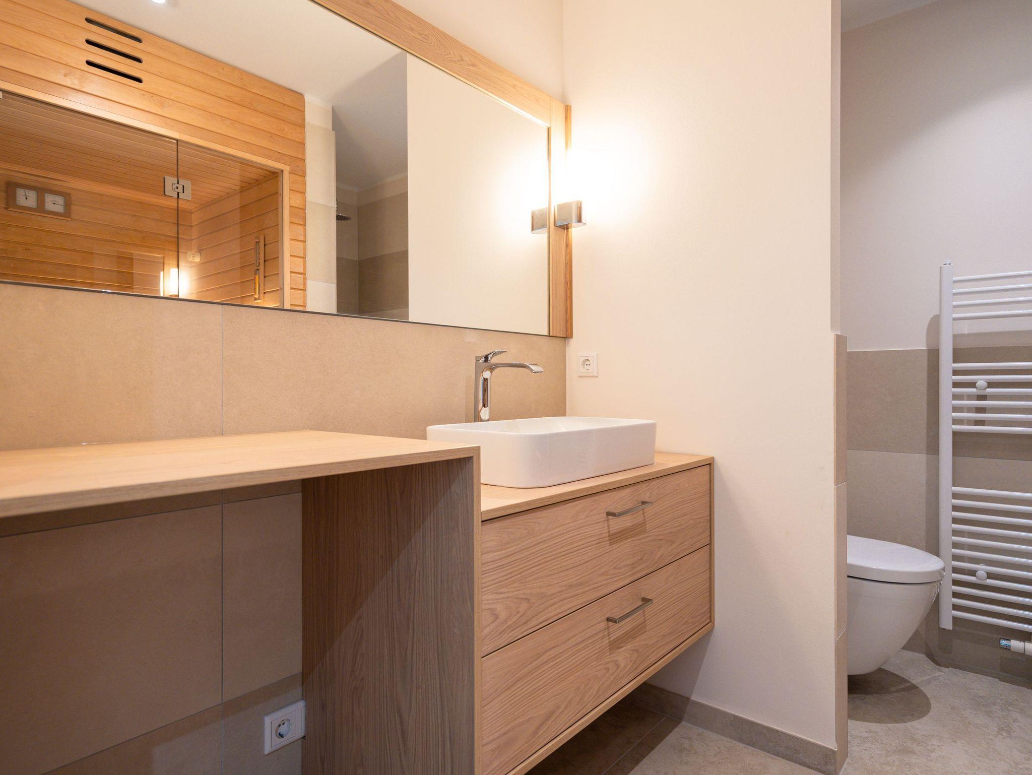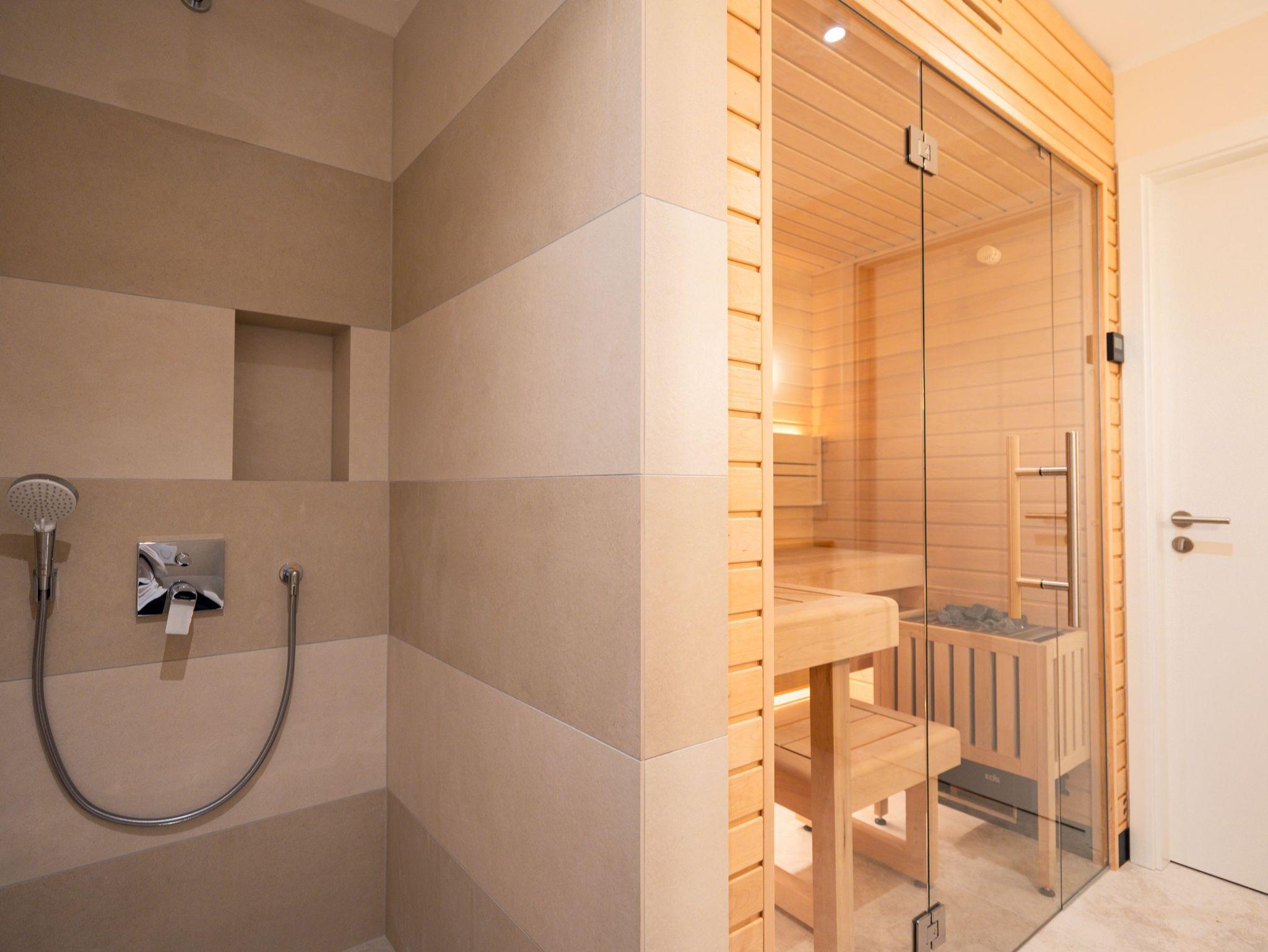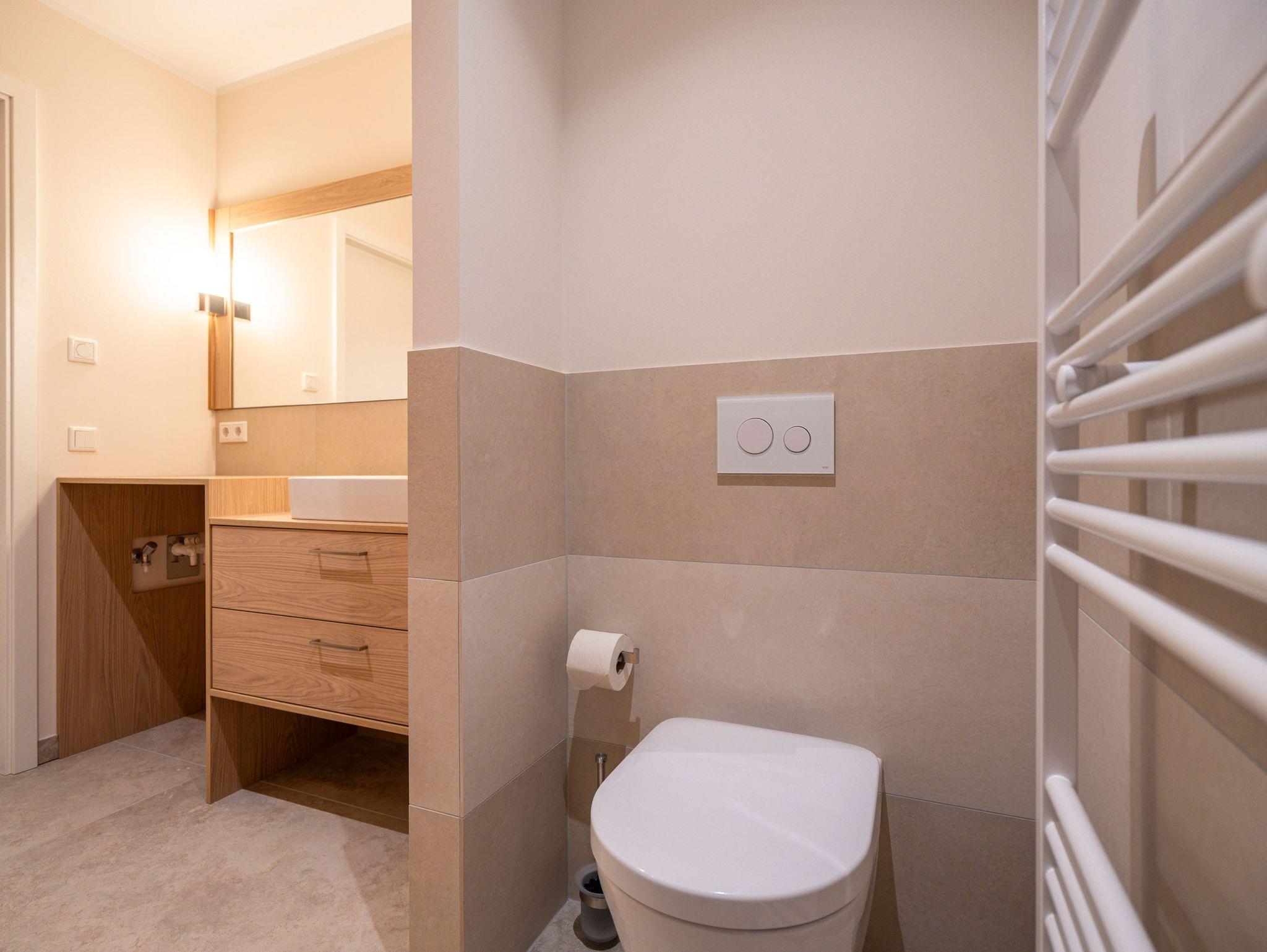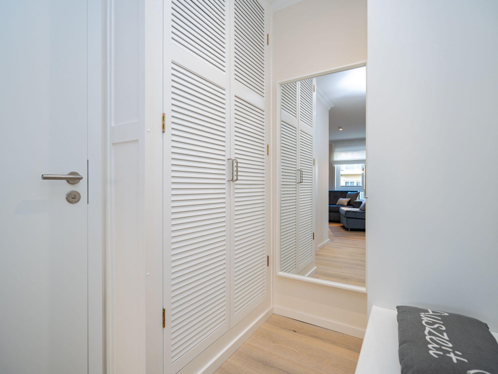 Die Wohnung bietet auf 67 Quadratmetern einen klar strukturierten Grundriss und eine angenehme Atmosphäre. Der Wohnbereich ist offen gestaltet, hell und aufgeräumt. Die Sitzgruppe, der Kamin mit Fernbedienung und der Fernseher schaffen einen Bereich, in dem man sich ohne viel Aufwand wohlfühlt. Die Küche ist vollständig ausgestattet und eignet sich auch für längere Aufenthalte. Backofen, Induktionsfeld, Mikrowelle, Spülmaschine und ein Kühlschrank mit Gefrierfach sind vorhanden. Der Essplatz schließt direkt an. Von hier aus geht es auf die große Terrasse nach Südost. Fünfzig Quadratmeter bieten genug Fläche für ein ruhiges Frühstück, ein Buch oder ein Glas Wein am Nachmittag. Gartenmöbel stehen bereit. Beide Schlafzimmer sind mit Boxspringbetten (1,80 m x 2,00 m) eingerichtet. Dazu gibt es jeweils einen Kleiderschrank und einen Fernseher. Die beiden Bäder sind modern gehalten und jeweils mit Dusche, Waschtisch und WC ausgestattet. In einem der Bäder befindet sich eine finnische Sauna für zwei Personen, die an kühleren Tagen eine echte Wohlfühloase ist. Ein Stellplatz in der Tiefgarage (Durchfahrthöhe 1,85m) gehört zur Wohnung. WLAN steht ohne Zusatzkosten zur Verfügung.