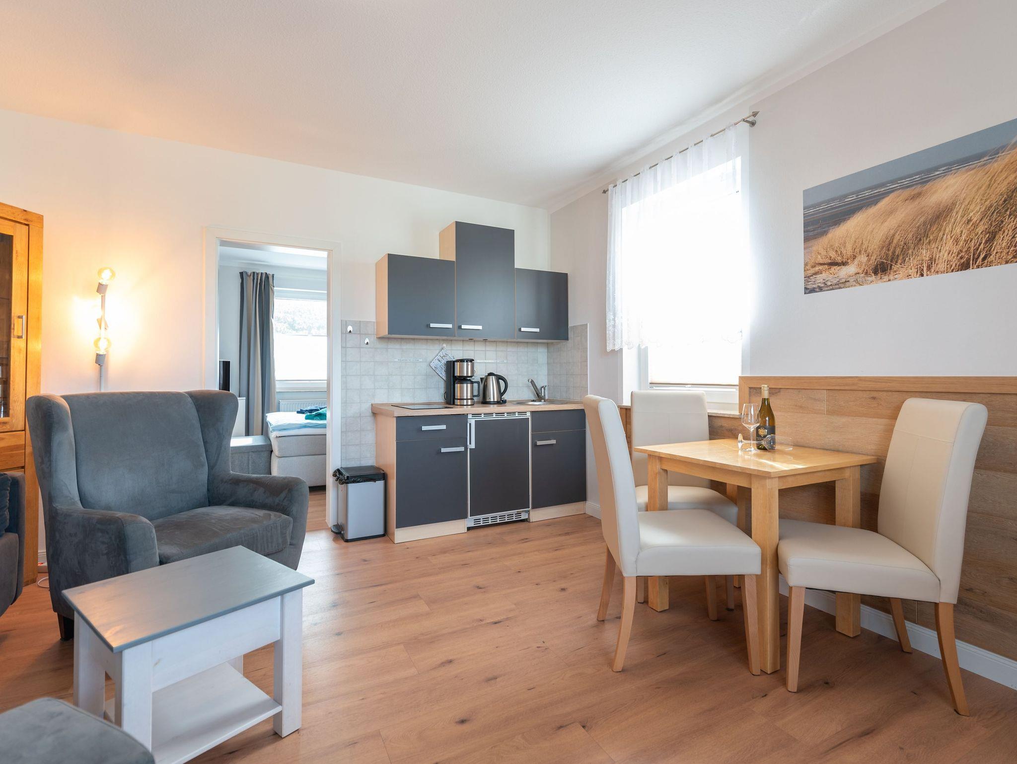 Die FEWO 1 befindet sich im Erdgeschoß unseres Hauses. Unsere komfortabele 2-Raum-Fewo ist eine Nichtraucherwohnung. Die Küche ist zum Wohnraum hin offen und mit einer kleinen Küchenzeile ausgestattet. Hier finden Sie einen Kühlschrank, eine Kaffeemaschine, einen Wasserkocher und Geschirr/Besteck. Alles was Sie für einen erholsamen Urlaub benötigen. Die Fewo ist für max. 3 Personen geeignet. Die Schlafmöglichkeiten verteilen sich wie folgt. Es gibt ein Schlafzimmer mit einem Doppelbett, die Couch im Wohnzimmer kann zu einem Bett umfunktioniert werden.