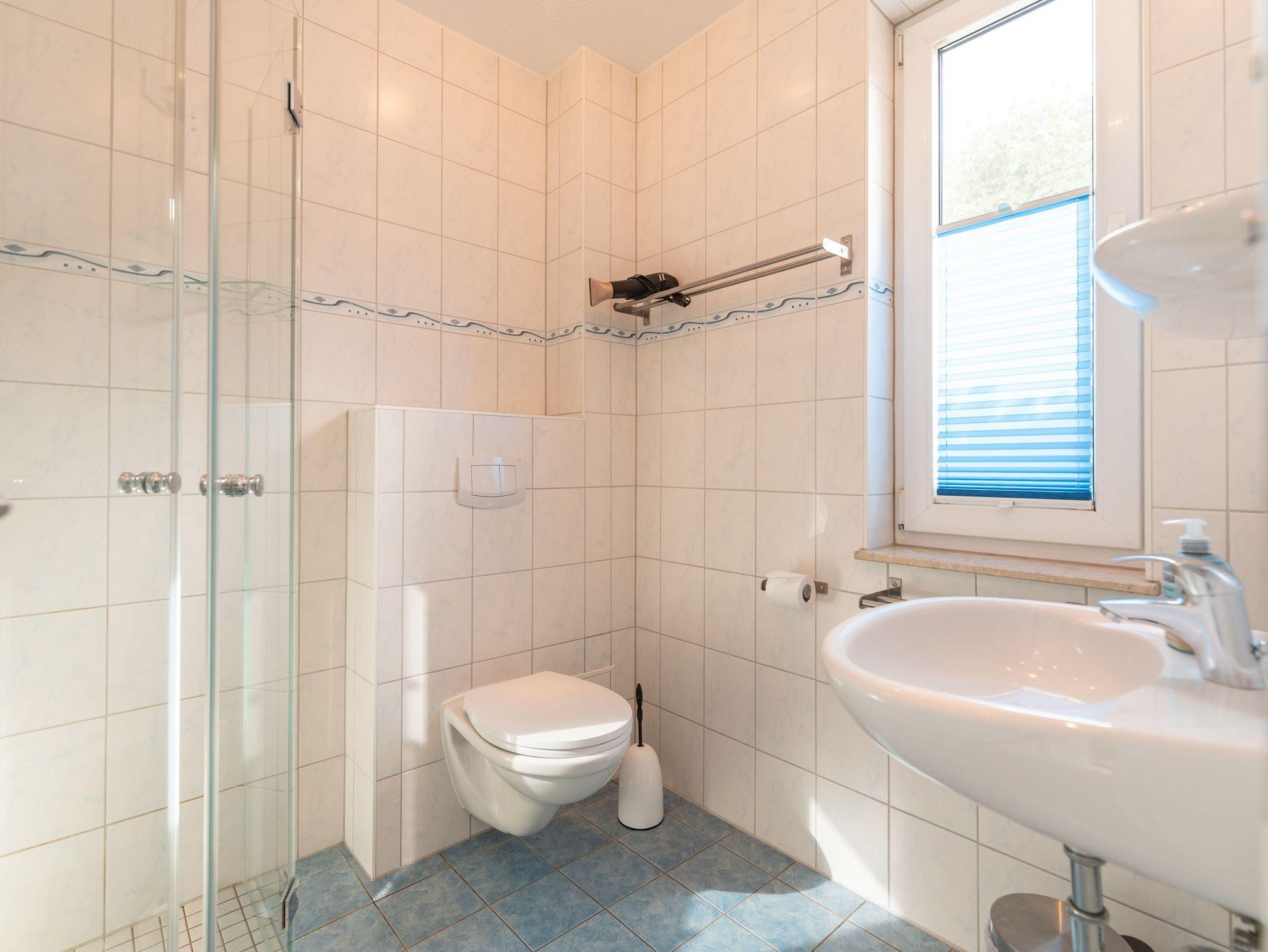 Das Badezimmer verfügt über ein WC und eine Dusche.