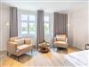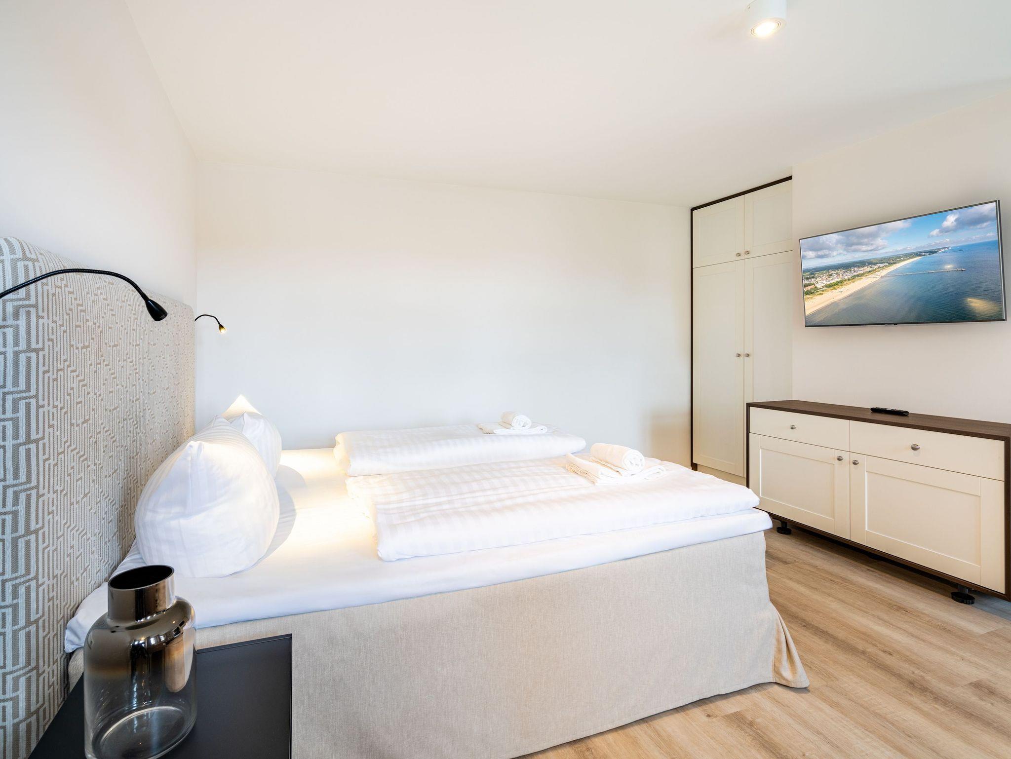 Die Einrichtung wurde liebevoll auf die stillvolle Bäderarchitektur der Villa Albus abgestimmt. Der kombinierte Wohn-, Ess-, Koch- und Schlafbereich verfügt ein komfortables Doppelbett und bietet einen erholsamen Schlaf. Die integrierte Küchenzeile lässt keine Wünsche offen und ist ausgestattet mit einem Herd, Backofen, Kühlschrank mit Tiefkühlfach, Geschirrspülmaschine, Mikrowelle, Kaffeemaschine, Toaster und Wasserkocher. Genießen Sie Ihre Lieblingsspeisen an dem vorhandenen Esstisch oder verbringen Sie einen gemütlichen Fernsehabend vor dem FlatTV. Das Bad ist mit einer Dusche, WC und einem Haartrockner ausgestattet.