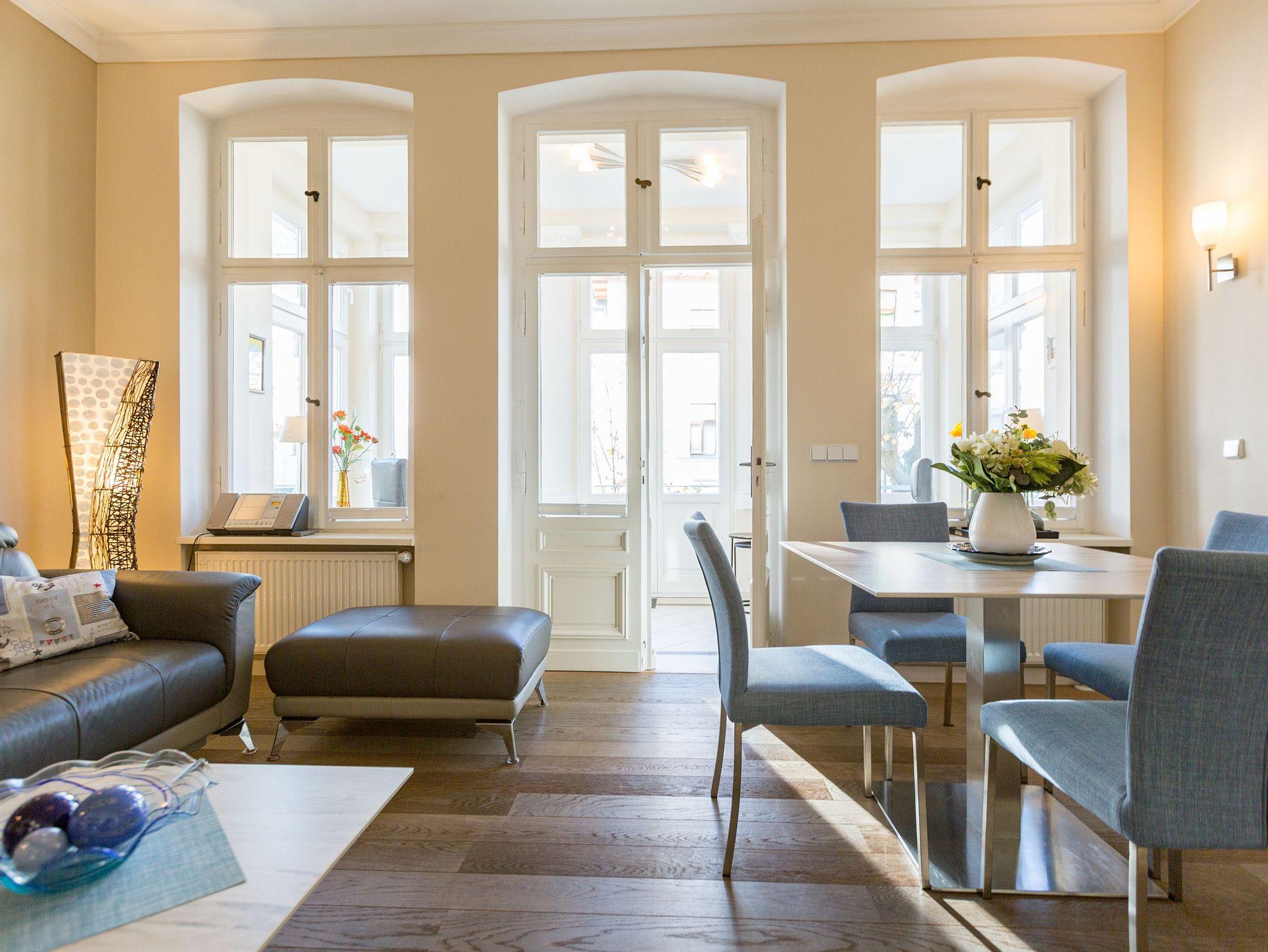 Liebevoll saniert, erstrahlt das Schloss am Meer im neuen alten Glanz. Wunderschön restauriert und exklusiv ausgestattet, bieten Ihnen die Wohnungen ein fantastisches, strandnahes Urlaubsdomizil (nur 80 m) im Seebad Ahlbeck. Stilvoll romantische Bäderarchitektur gepaart mit modernem Komfort. Diese elegante Villa verfügt über einen Fahrstuhl und teilweisen Meerblick, die einzelnen Ferienwohnungen sind mit Balkonen oder Terrassen ausgestattet. Als besonderes Highlight finden Sie in jedem Appartement einen Kaminofen. Im Schwesternhaus, der Residenz Bismarck befindet sich ein Saunabereich (gegen Gebühr). Jede Wohnung verfügt über einen Stellplatz in der Tiefgarage für Fahrzeuge bis 1,90 m Höhe ( Stellplätze relativ eng, eingeschränkte Wendemöglichkeit). Für Ihren Komfort steht die Erstausstattung Wäsche für Sie bereit. Bitte beachten Sie, dass Kaminholz in der Wohnung nicht vorhanden ist. Das WLAN-Netz ist kostenfrei nutzbar.