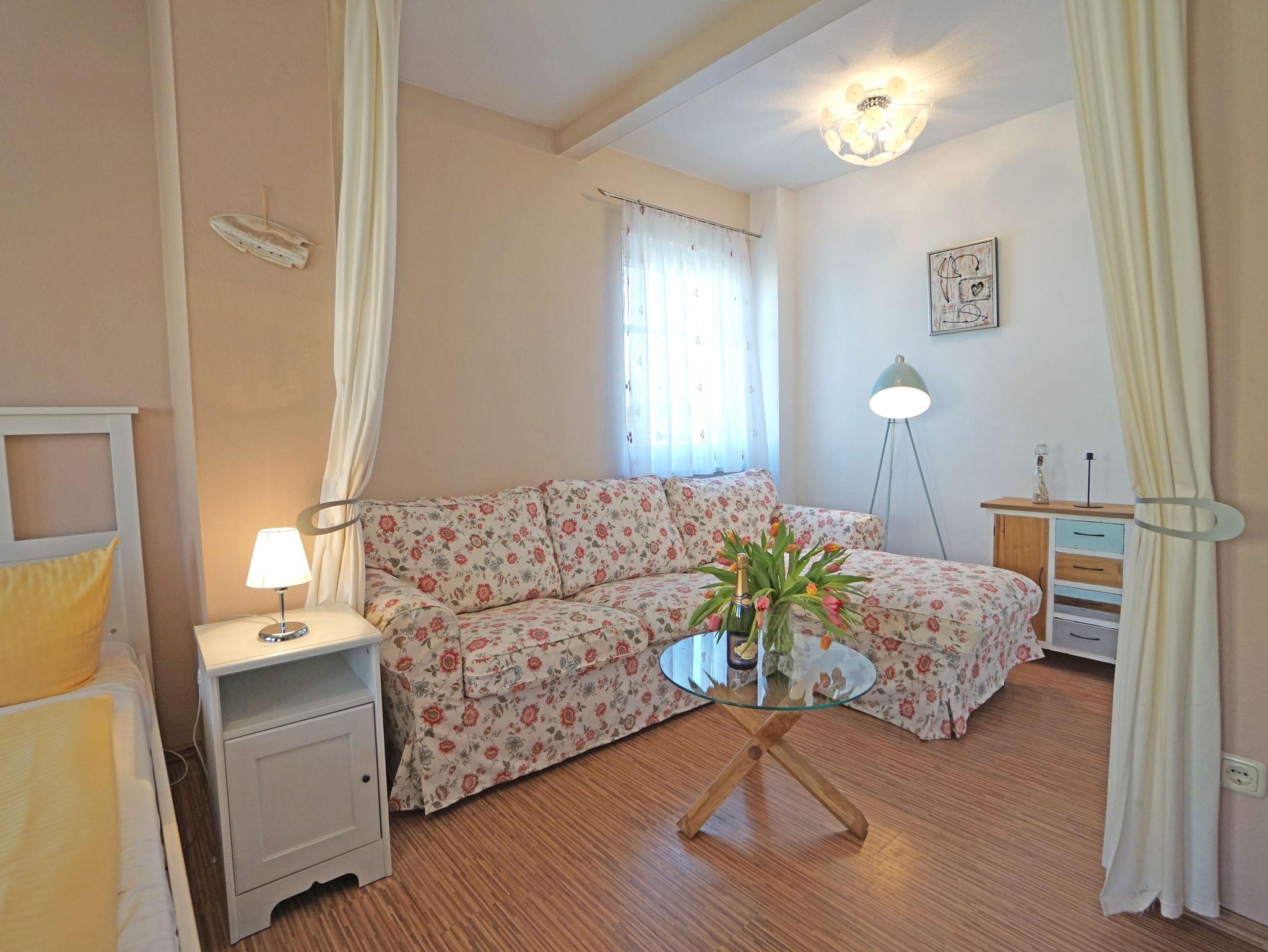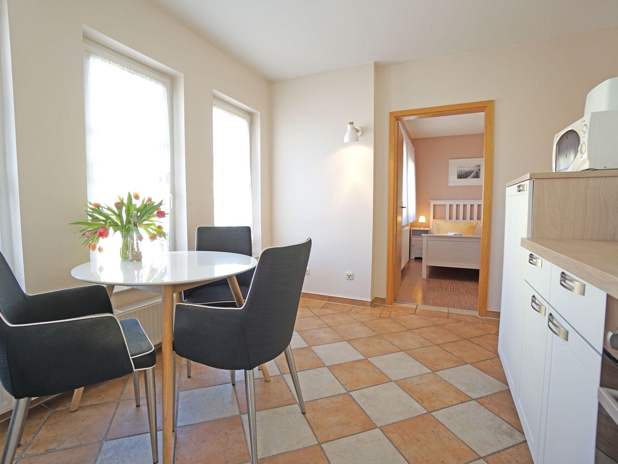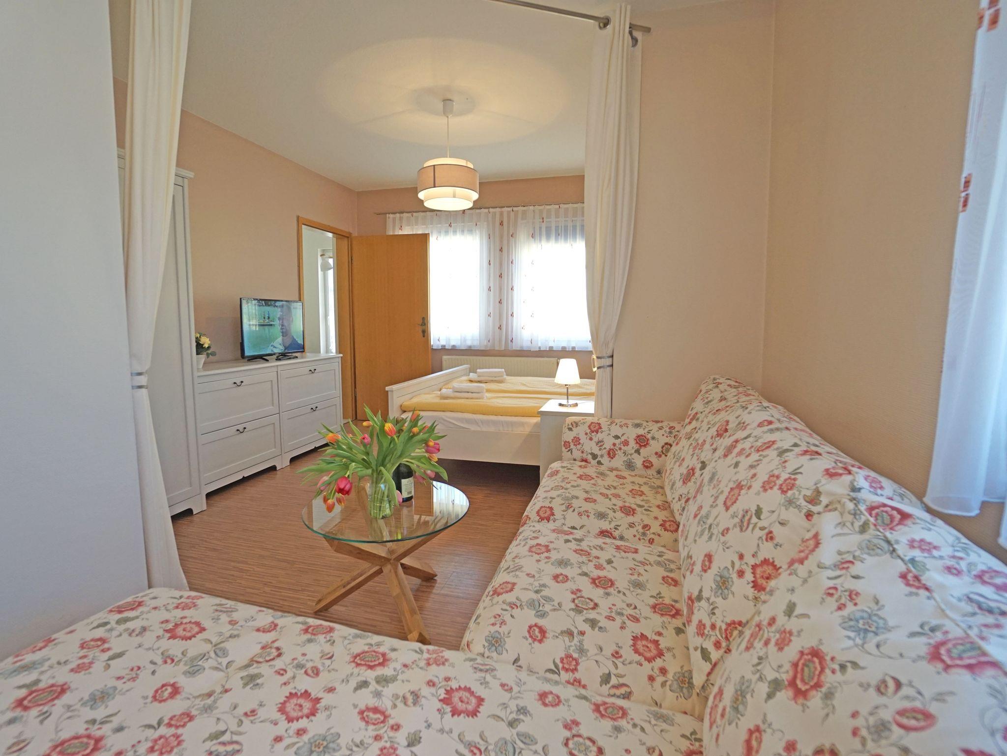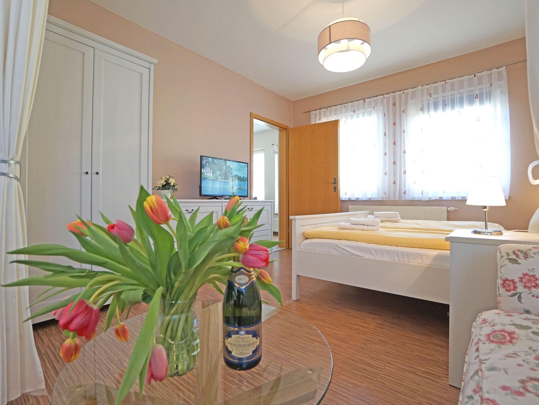 Gemütliche, helle 1,5- Zimmerwohnung im OG mit großem Duschbad, Esszimmer, Wohn-/Schlafbereich mit 2 Fenstern und Küchenzeile (Fenster) mit Herd, Kühlschrank, Mikrowelle, Kaffeemaschine und Toaster. In jedem Zimmer ist ausreichend Stauraum, 2 Kabel- Tv stehen zur Verfügung.