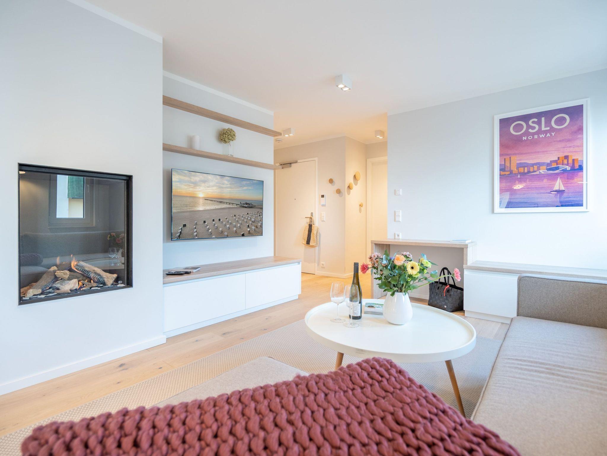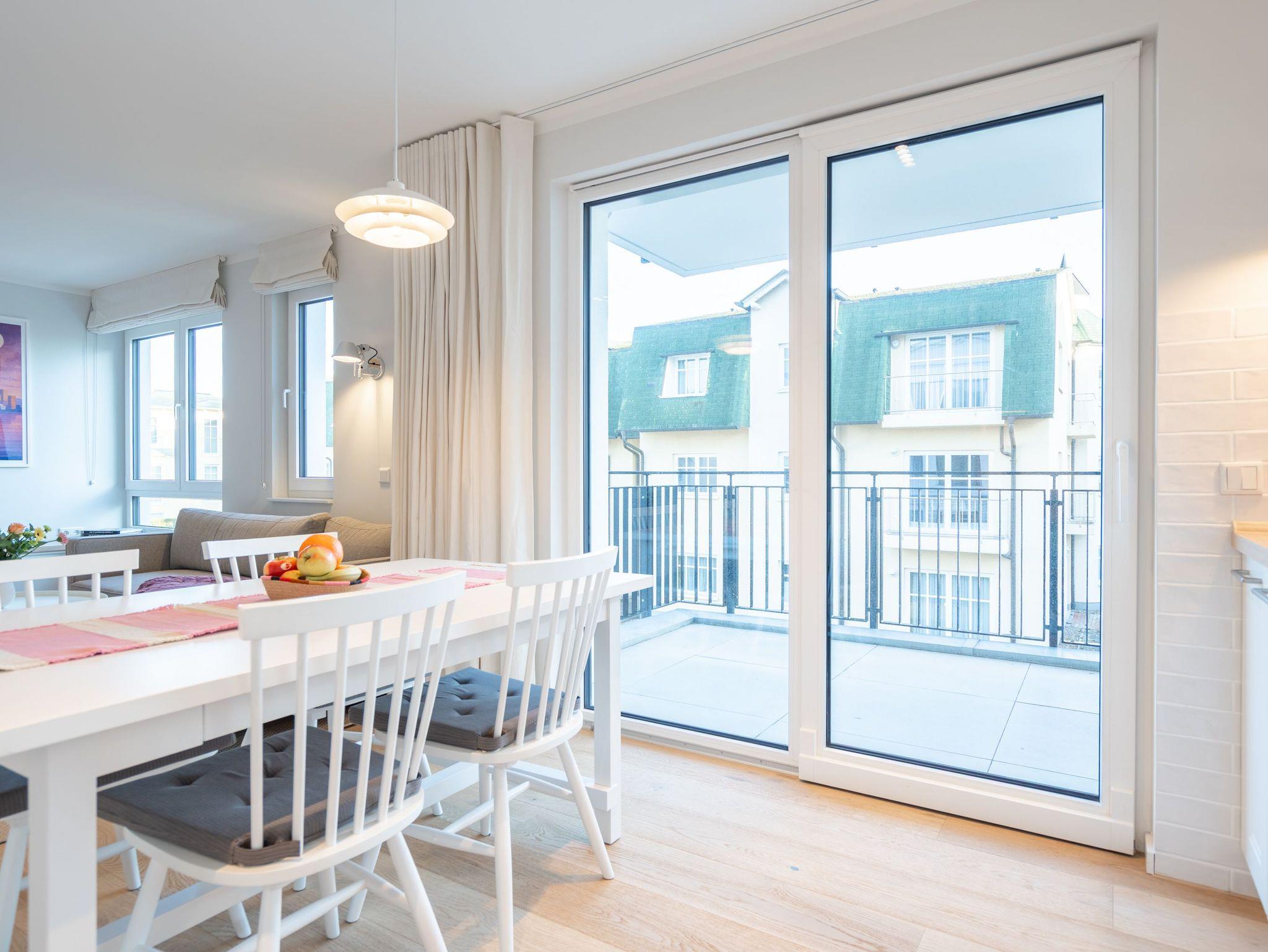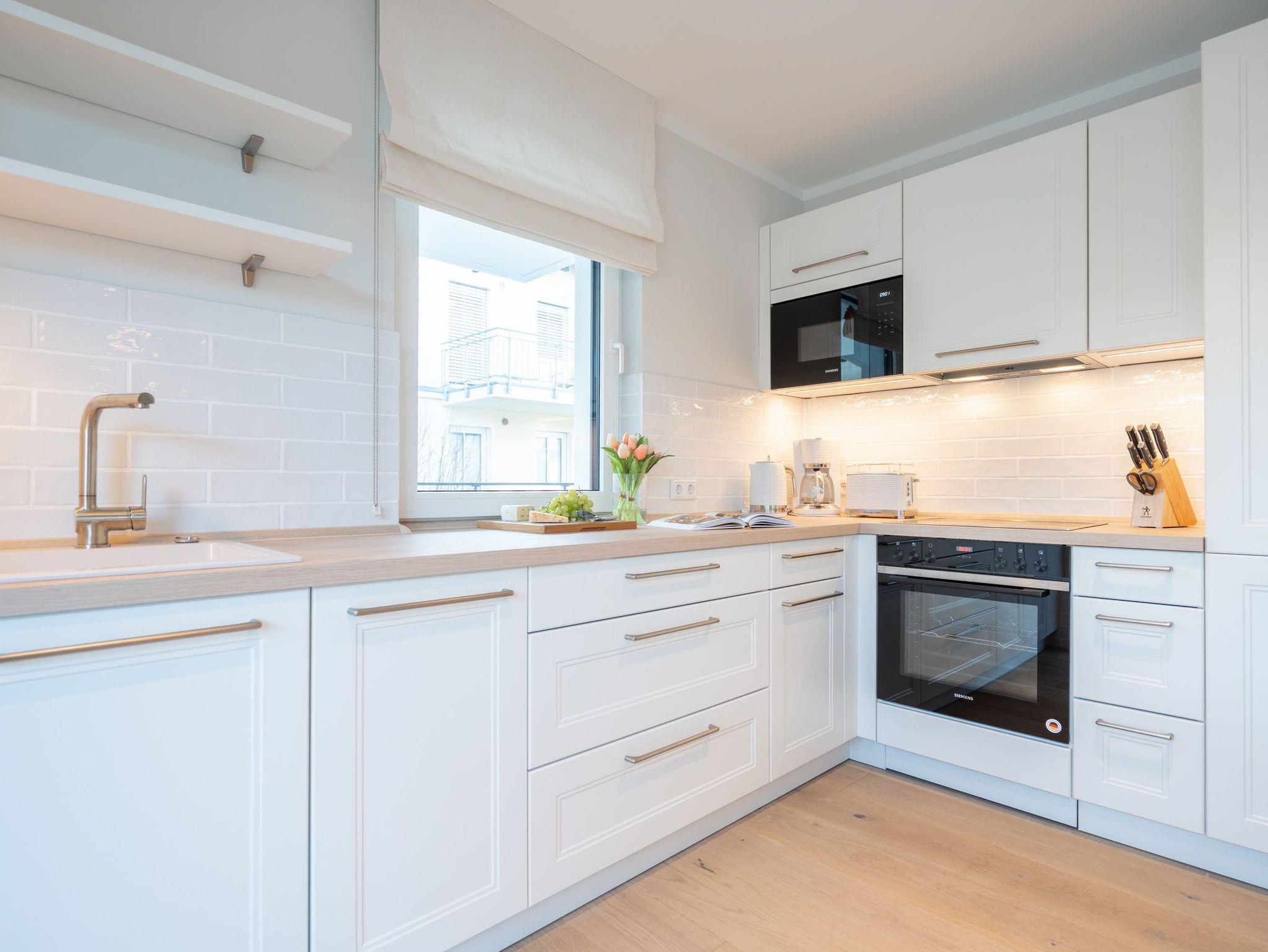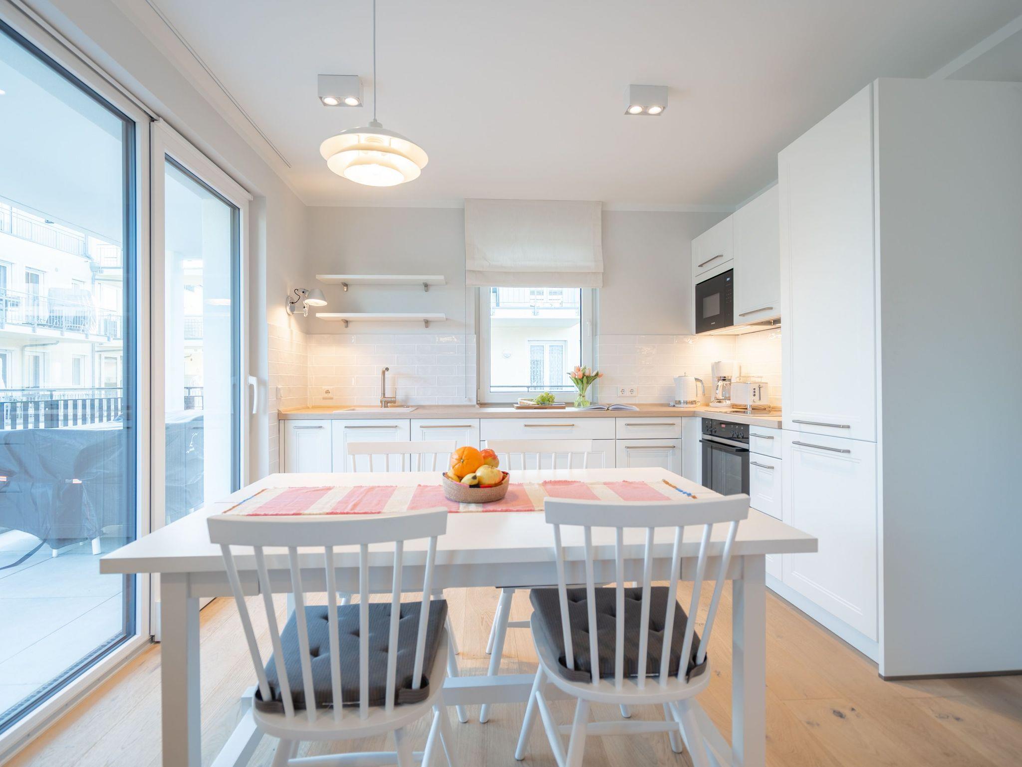 Die 3-Raum-Ferienwohnung Nr. 6 in der Villa Kamadori bietet auf 67 qm ein durchdachtes Raumkonzept für bis zu vier Personen und ein Kleinkind im Kinderreisebett. Der offen gestaltete Wohn- und Essbereich ist hell und einladend. Die moderne Küchenzeile ist vollständig ausgestattet mit Backofen, Induktionskochfeld, Kühlschrank mit Gefrierfach und Geschirrspülmaschine. Der Essplatz bietet bequem Platz für vier Personen. Im Wohnbereich lädt eine gemütliche Sitzgruppe zum Entspannen ein, ergänzt durch einen Flat-TV und einen Gas-Kamin, der per Fernbedienung für angenehme Atmosphäre sorgt. Zwei separate Schlafzimmer sorgen für Ruhe und Komfort. Beide sind mit hochwertigen Boxspring-Doppelbetten ausgestattet. Ein Schlafzimmer verfügt über ein Bettmaß von 1,60 m x 2,00 m, das zweite über ein großzügiges Bett von 1,80 m x 2,00 m sowie einen zusätzlichen Flat-TV. In beiden Räumen stehen Kleiderschränke zur Verfügung. Die Wohnung bietet zwei moderne Bäder mit Dusche, Waschtisch und WC. Ein Bad ist zusätzlich mit einer finnischen Sauna und einer Waschmaschine ausgestattet und macht die Wohnung auch in der kühleren Jahreszeit besonders attraktiv. Der 15 qm große Nord-Ost-Balkon ist möbliert und eignet sich ideal für ein entspanntes Frühstück oder ruhige Stunden an der frischen Luft. Ein fester Stellplatz in der Tiefgarage gehört ebenfalls zur Wohnung. Die maximale Einfahrtshöhe beträgt 1,85 m. Eine komfortable Ferienwohnung mit klarer Aufteilung, hochwertiger Ausstattung und einem Plus an Privatsphäre und Erholung.
