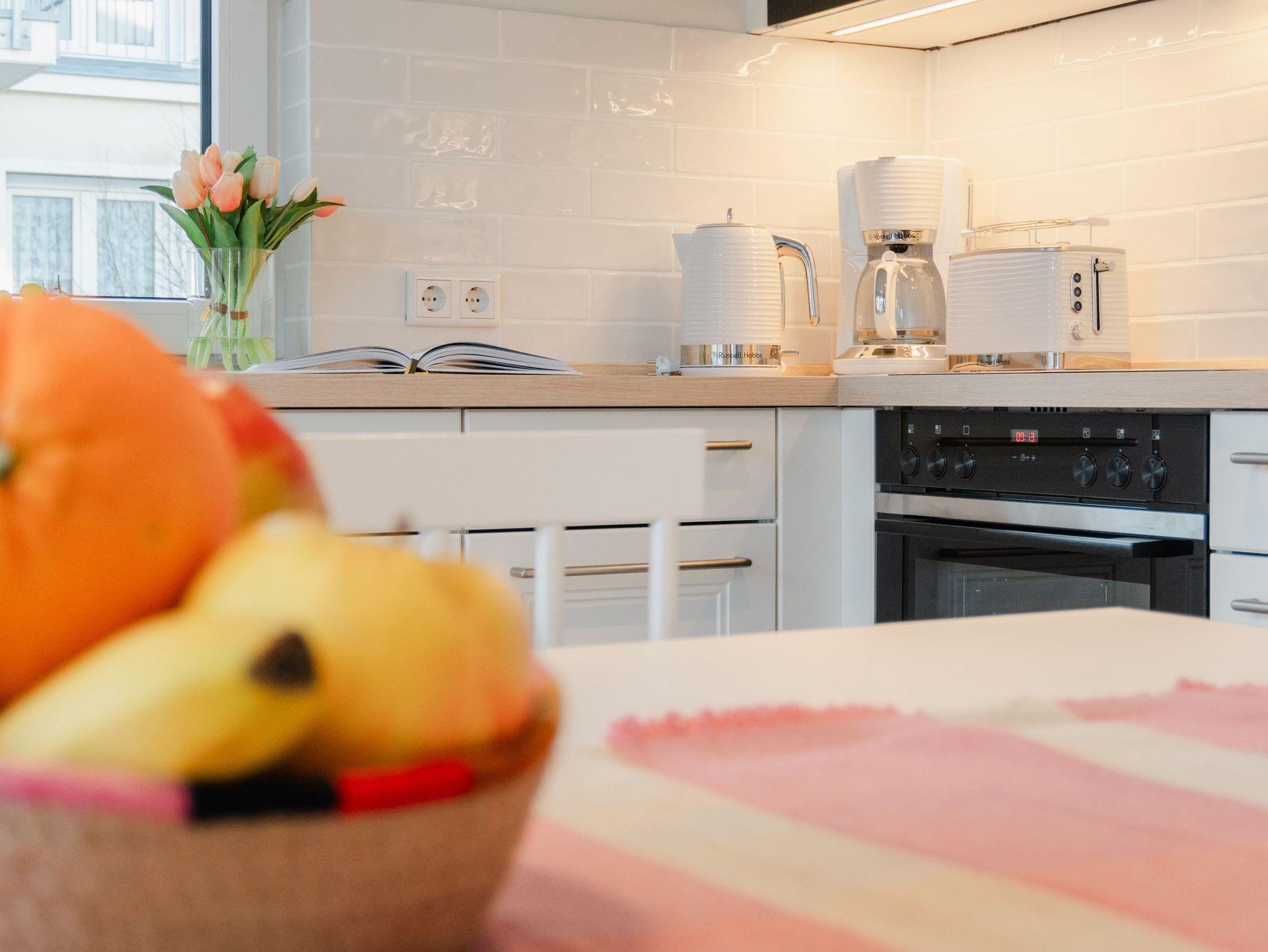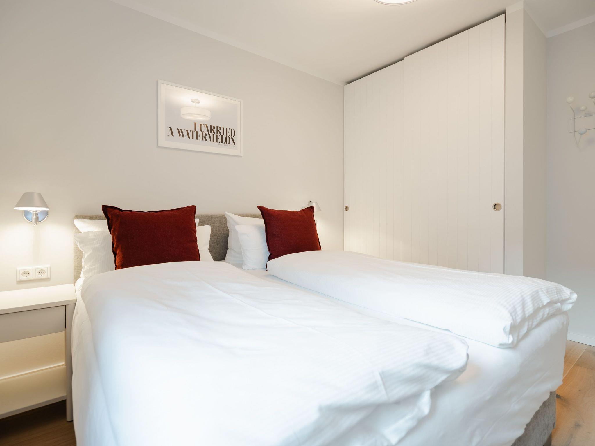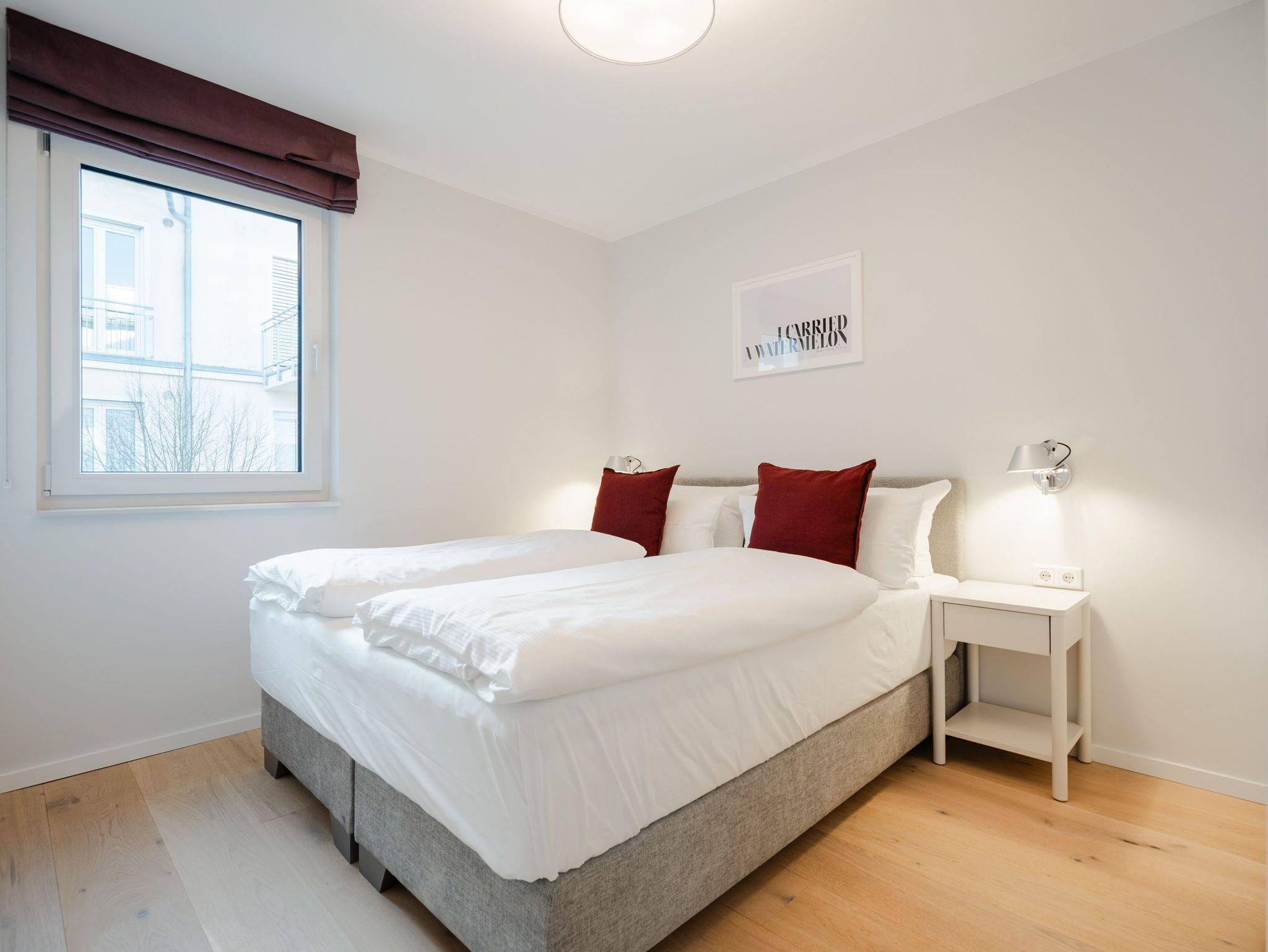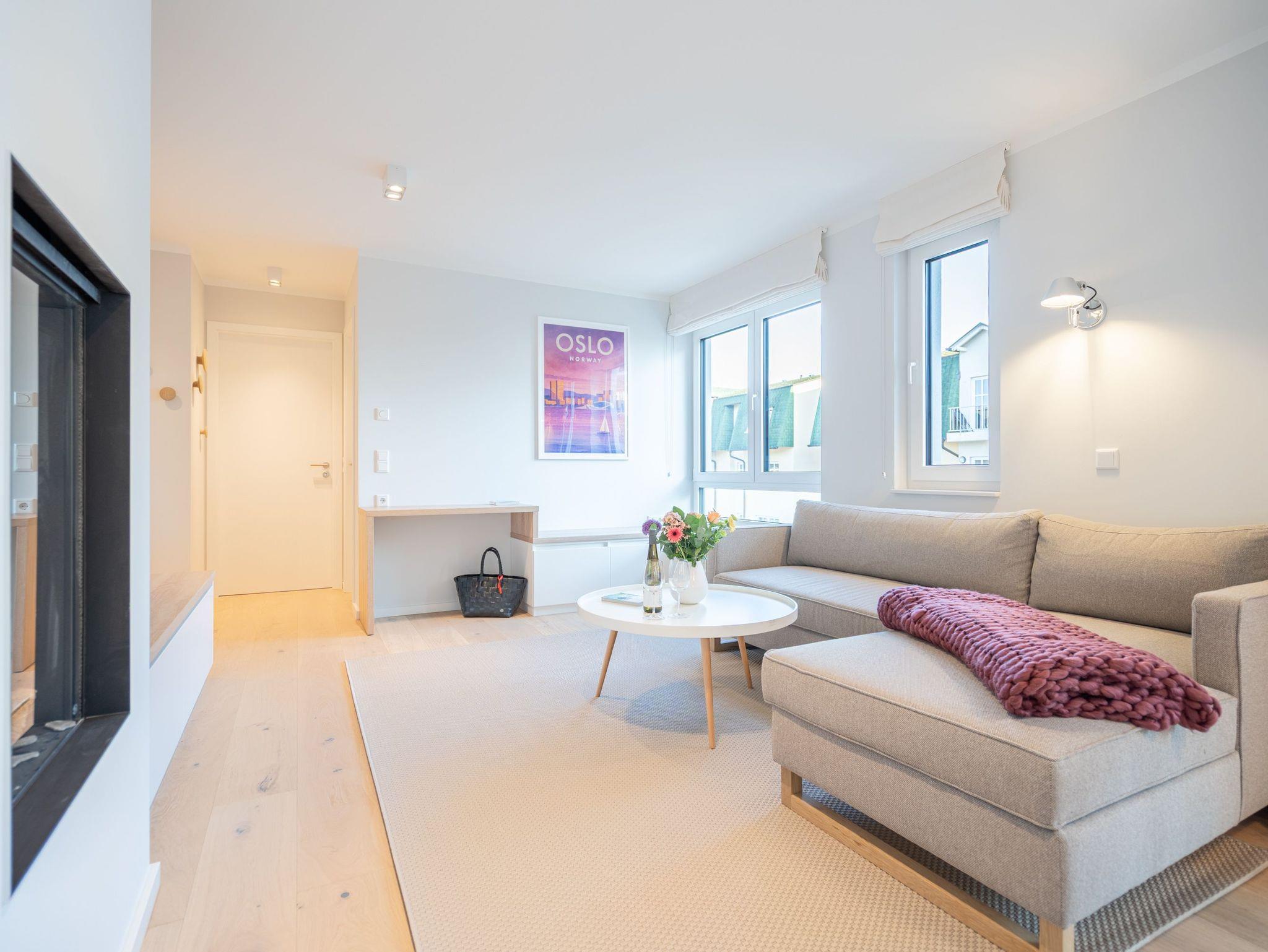 Die 3-Raum-Ferienwohnung Nr. 6 in der Villa Kamadori bietet auf 67 qm ein durchdachtes Raumkonzept für bis zu vier Personen und ein Kleinkind im Kinderreisebett. Der offen gestaltete Wohn- und Essbereich ist hell und einladend. Die moderne Küchenzeile ist vollständig ausgestattet mit Backofen, Induktionskochfeld, Kühlschrank mit Gefrierfach und Geschirrspülmaschine. Der Essplatz bietet bequem Platz für vier Personen. Im Wohnbereich lädt eine gemütliche Sitzgruppe zum Entspannen ein, ergänzt durch einen Flat-TV und einen Gas-Kamin, der per Fernbedienung für angenehme Atmosphäre sorgt. Zwei separate Schlafzimmer sorgen für Ruhe und Komfort. Beide sind mit hochwertigen Boxspring-Doppelbetten ausgestattet. Ein Schlafzimmer verfügt über ein Bettmaß von 1,60 m x 2,00 m, das zweite über ein großzügiges Bett von 1,80 m x 2,00 m sowie einen zusätzlichen Flat-TV. In beiden Räumen stehen Kleiderschränke zur Verfügung. Die Wohnung bietet zwei moderne Bäder mit Dusche, Waschtisch und WC. Ein Bad ist zusätzlich mit einer finnischen Sauna und einer Waschmaschine ausgestattet und macht die Wohnung auch in der kühleren Jahreszeit besonders attraktiv. Der 15 qm große Nord-Ost-Balkon ist möbliert und eignet sich ideal für ein entspanntes Frühstück oder ruhige Stunden an der frischen Luft. Ein fester Stellplatz in der Tiefgarage gehört ebenfalls zur Wohnung. Die maximale Einfahrtshöhe beträgt 1,85 m. Eine komfortable Ferienwohnung mit klarer Aufteilung, hochwertiger Ausstattung und einem Plus an Privatsphäre und Erholung.