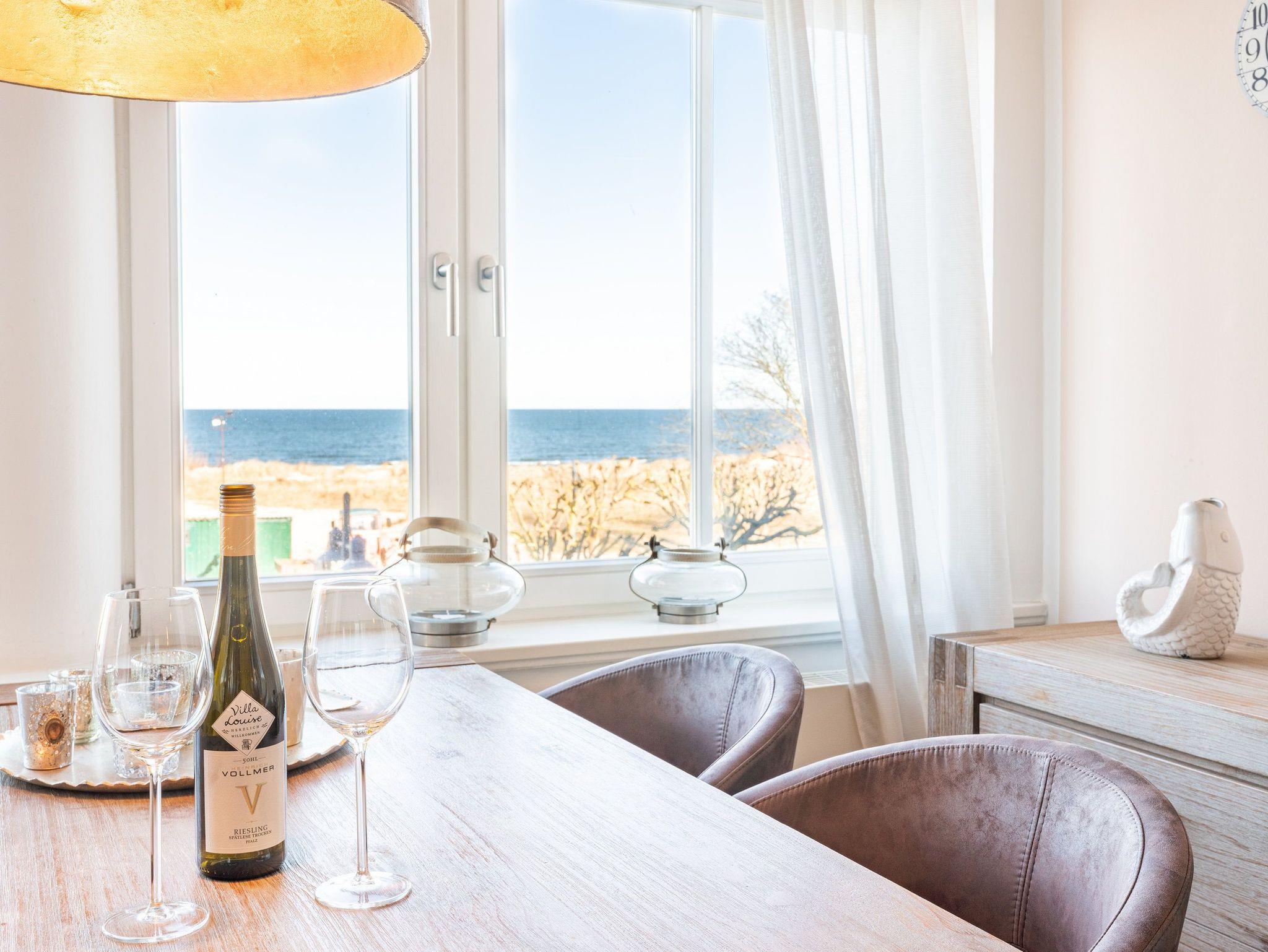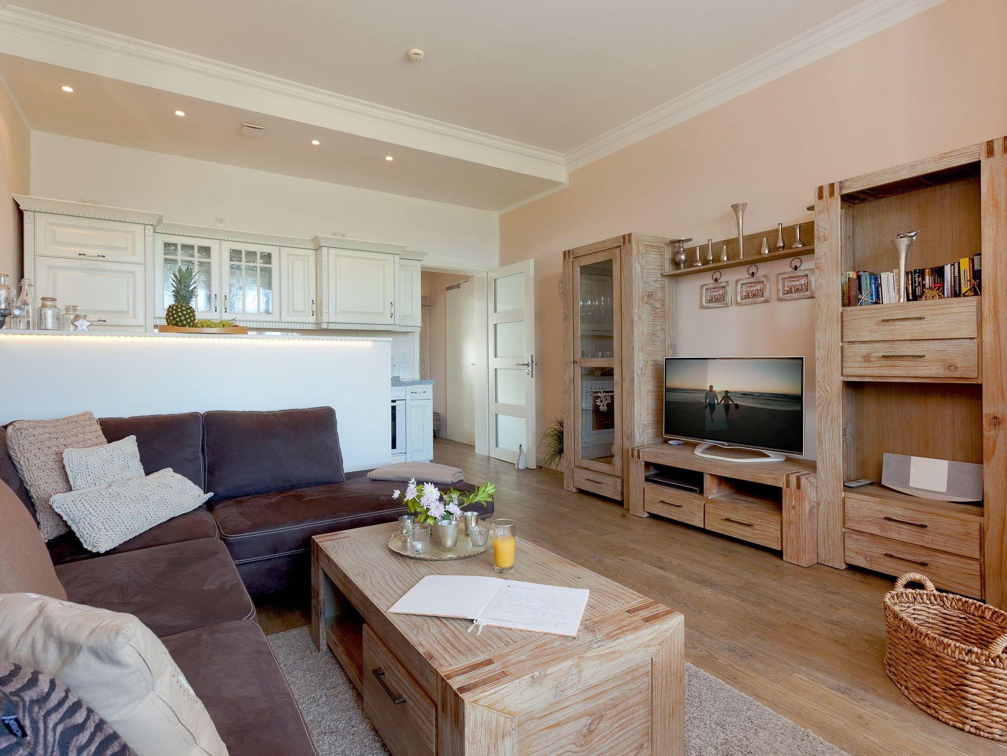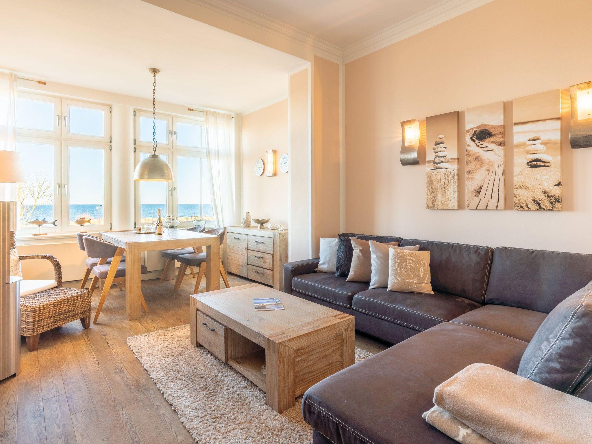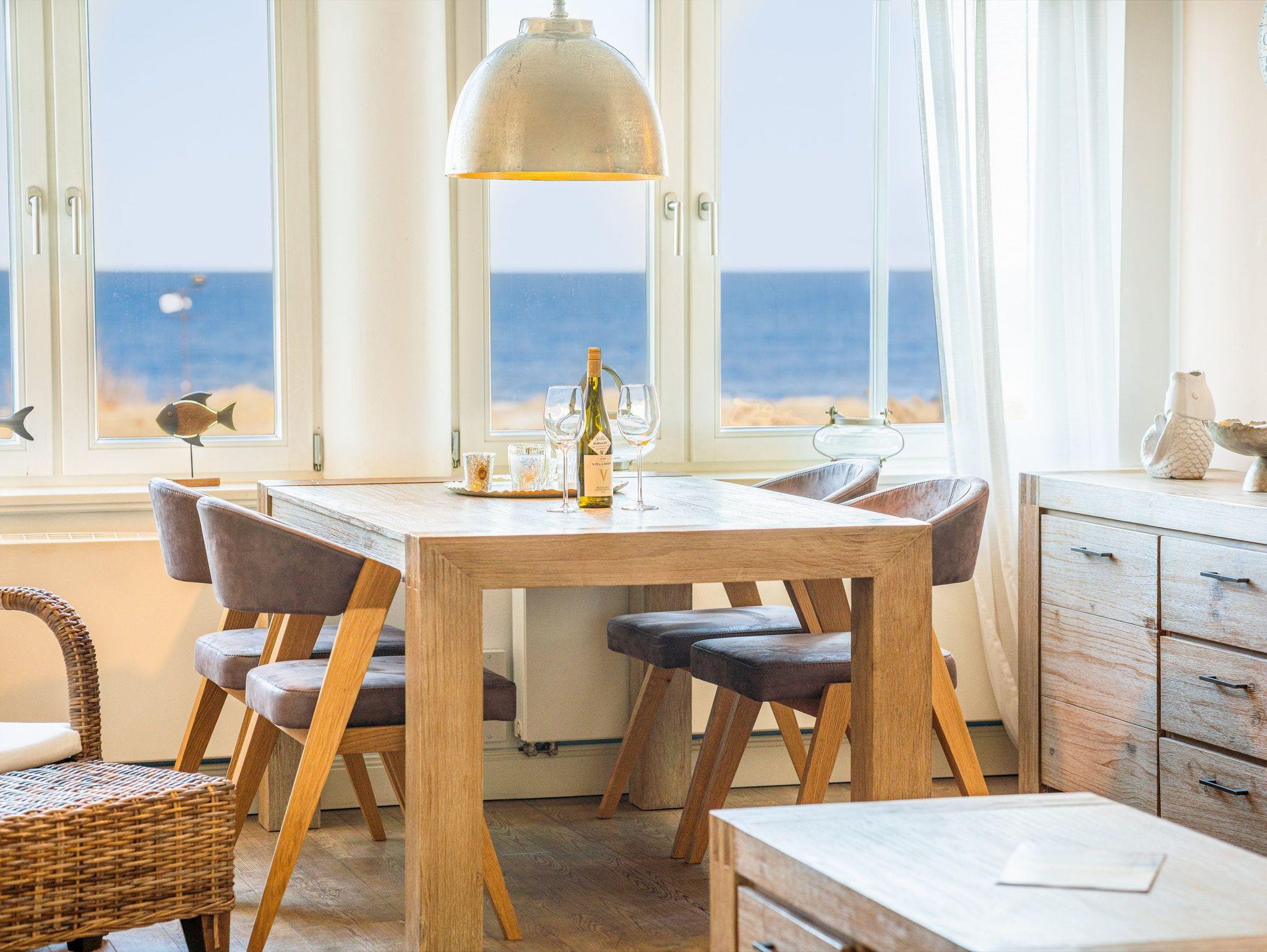 Vom gemütlichen Essplatz können Sie den Blick über die Ostsee und die Strandpromenade von Ahlbeck schweifen lassen. Der stilvolle Wohnbereich verfügt über ein komfortables Ecksofa. Die hochwertige Ausstattung mit Ethanolkamin, Flat TV und DVD Player sorgt nicht nur in der ungemütlichen Jahreszeit für behagliche Stunden nach einem erholsamen Strandspaziergang.