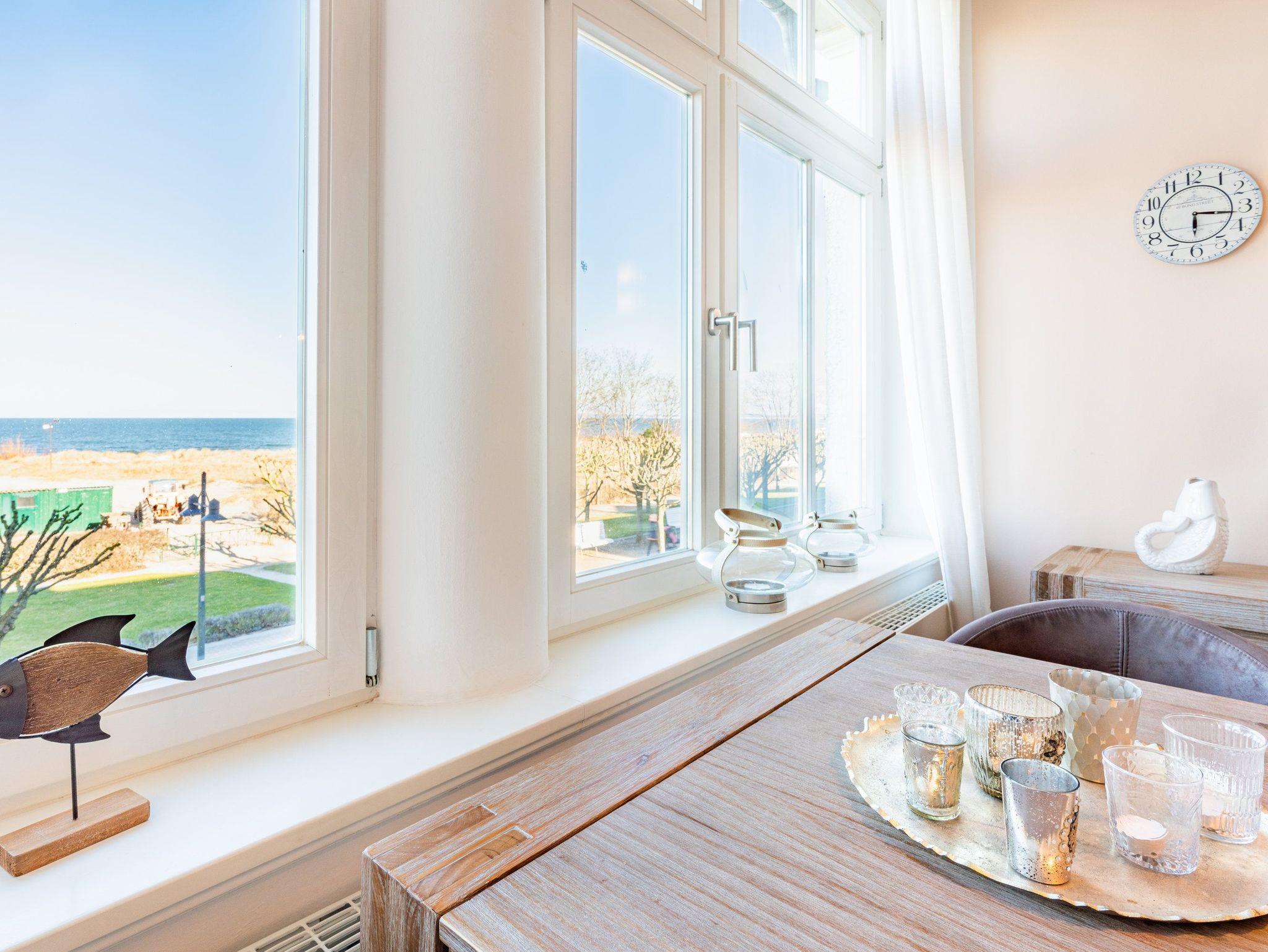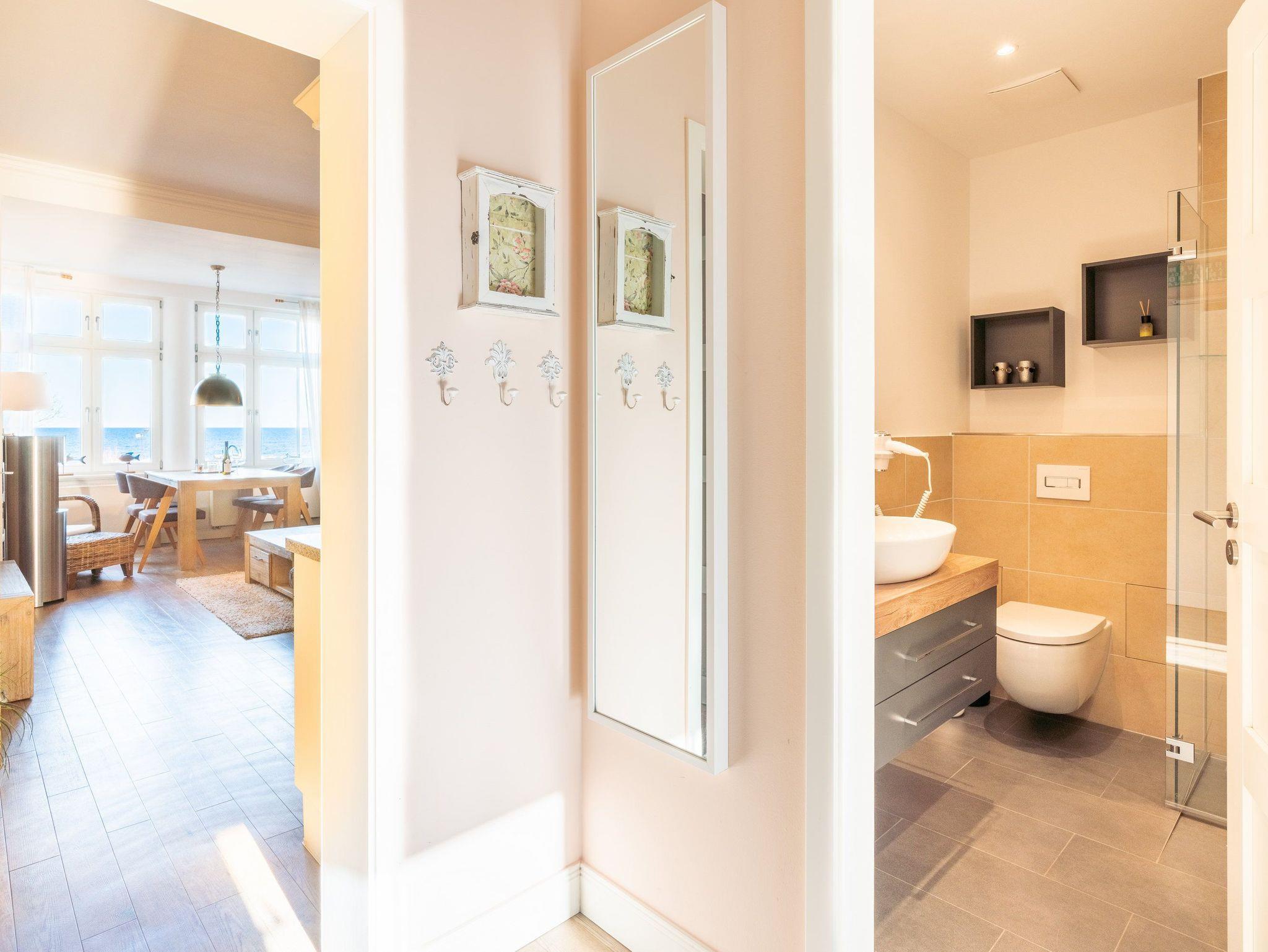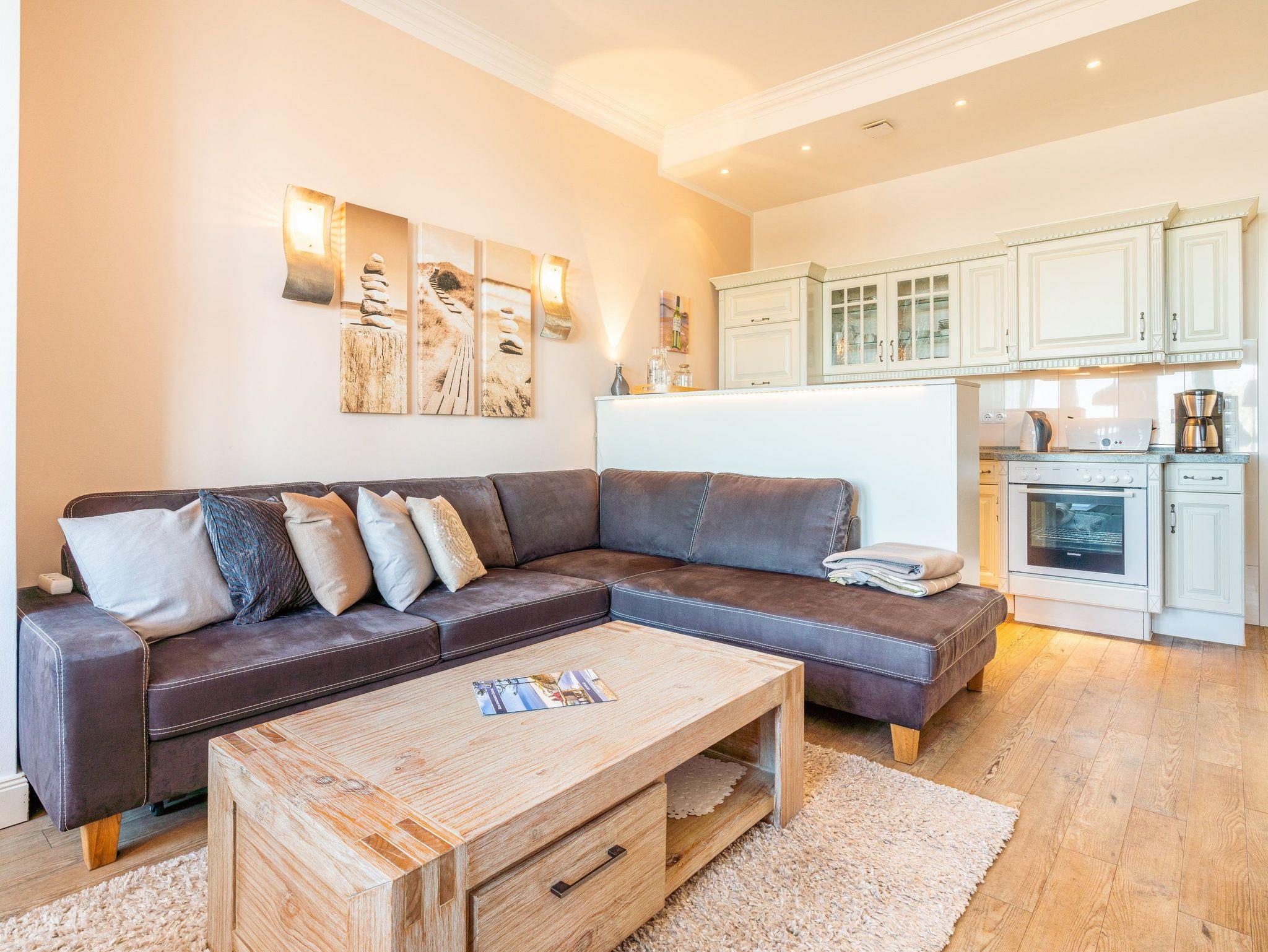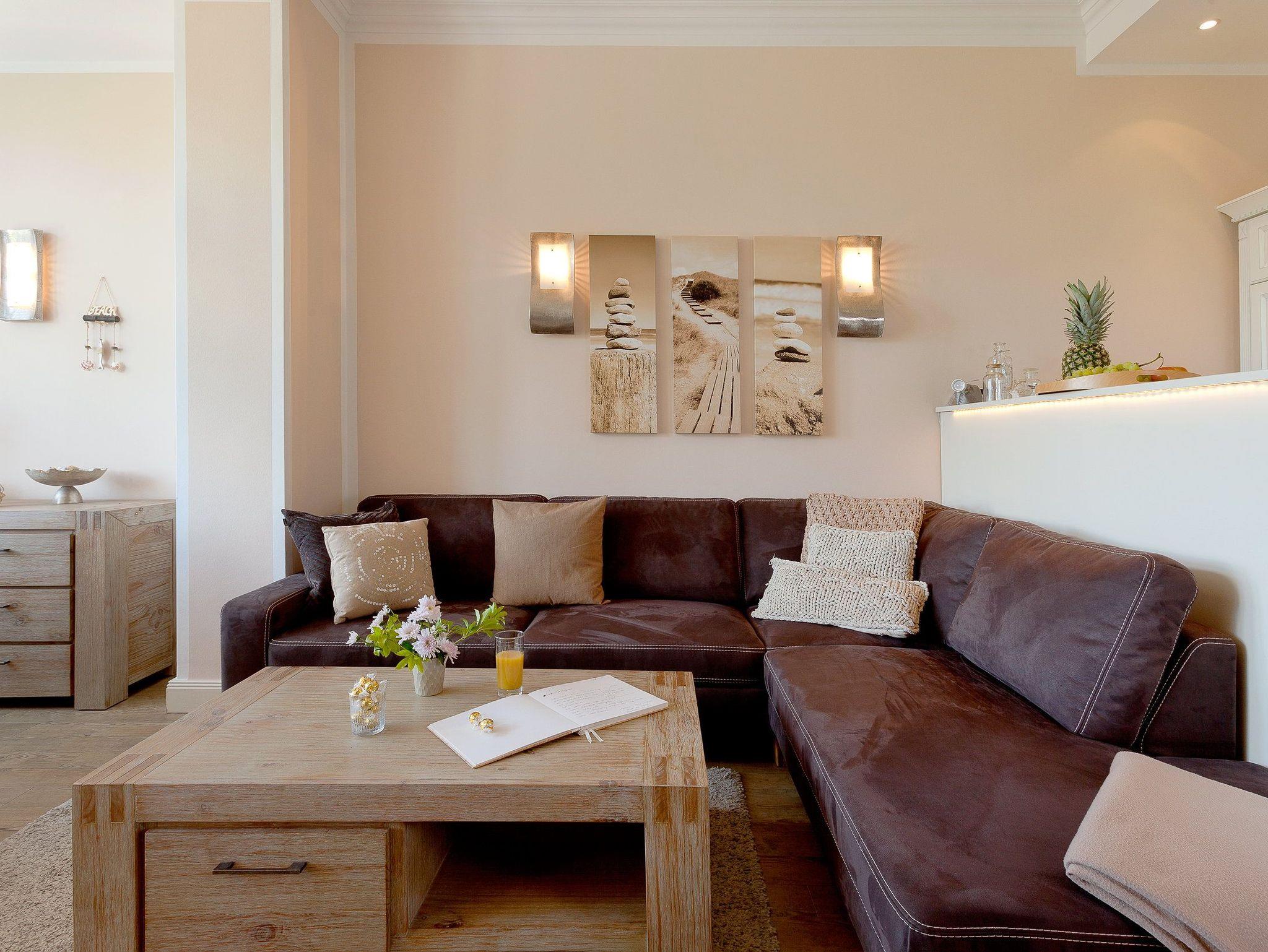 Vom gemütlichen Essplatz können Sie den Blick über die Ostsee und die Strandpromenade von Ahlbeck schweifen lassen. Der stilvolle Wohnbereich verfügt über ein komfortables Ecksofa. Die hochwertige Ausstattung mit Ethanolkamin, Flat TV und DVD Player sorgt nicht nur in der ungemütlichen Jahreszeit für behagliche Stunden nach einem erholsamen Strandspaziergang.