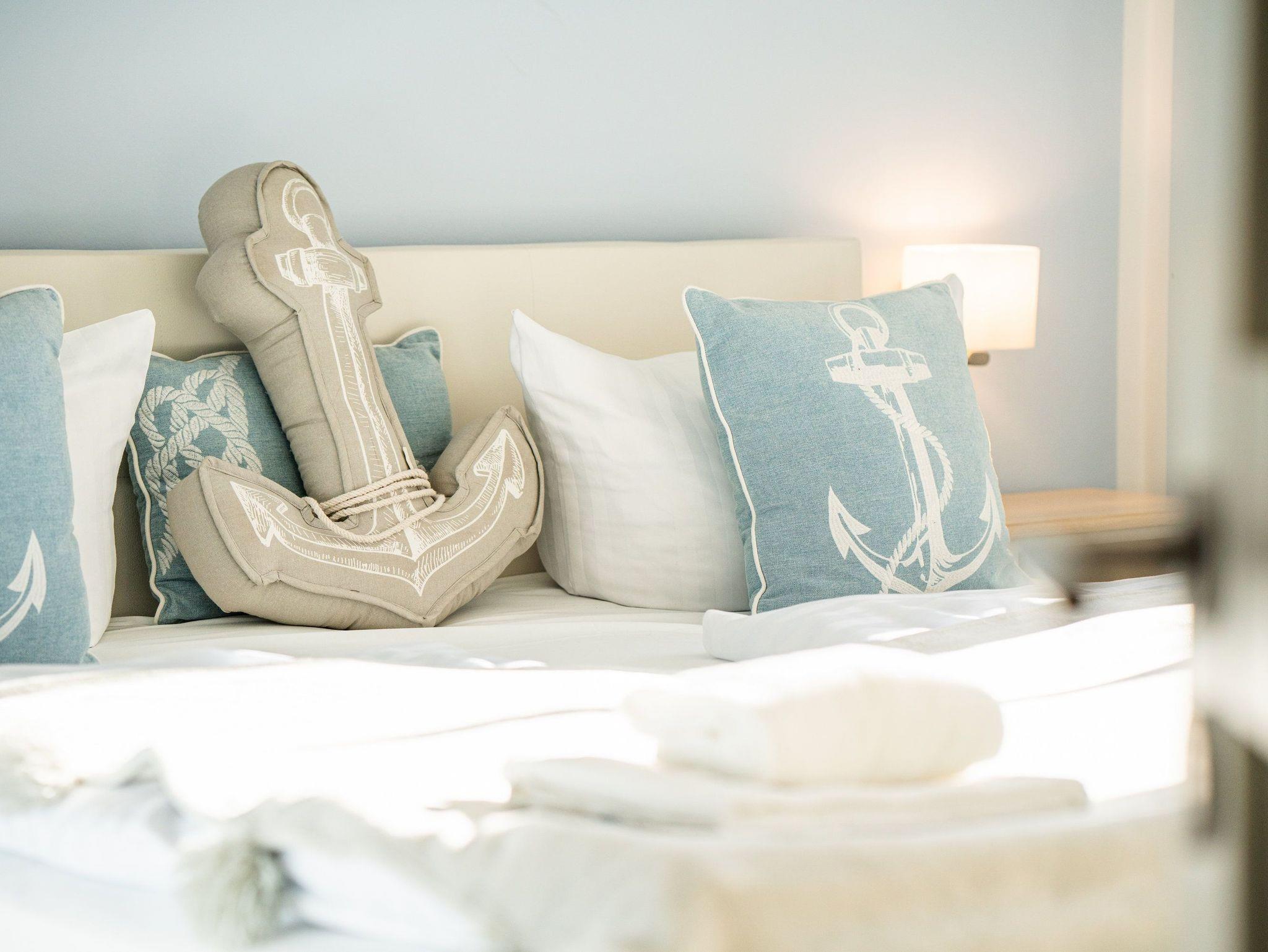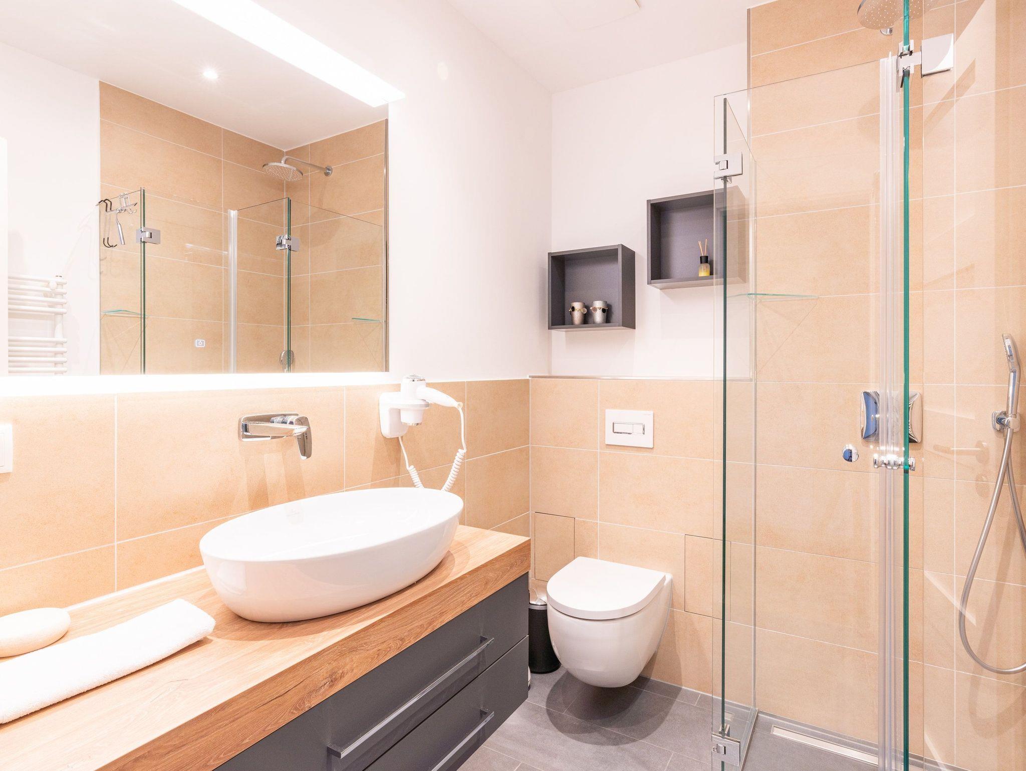 Damit Sie Ihre wohlverdiente Urlaubszeit bereits am Anreisetag in vollen Zügen genießen können, haben wir das Bett für Sie und das für Ihre lieben Mitreisenden bereits bezogen und ein Duschtuch sowie ein kleines Handtuch bereitgelegt. Das moderne Bad mit Echtglas-Dusche und ebenerdiger Duschtasse, WC und Haartrockner ergänzt die Wohnung perfekt.