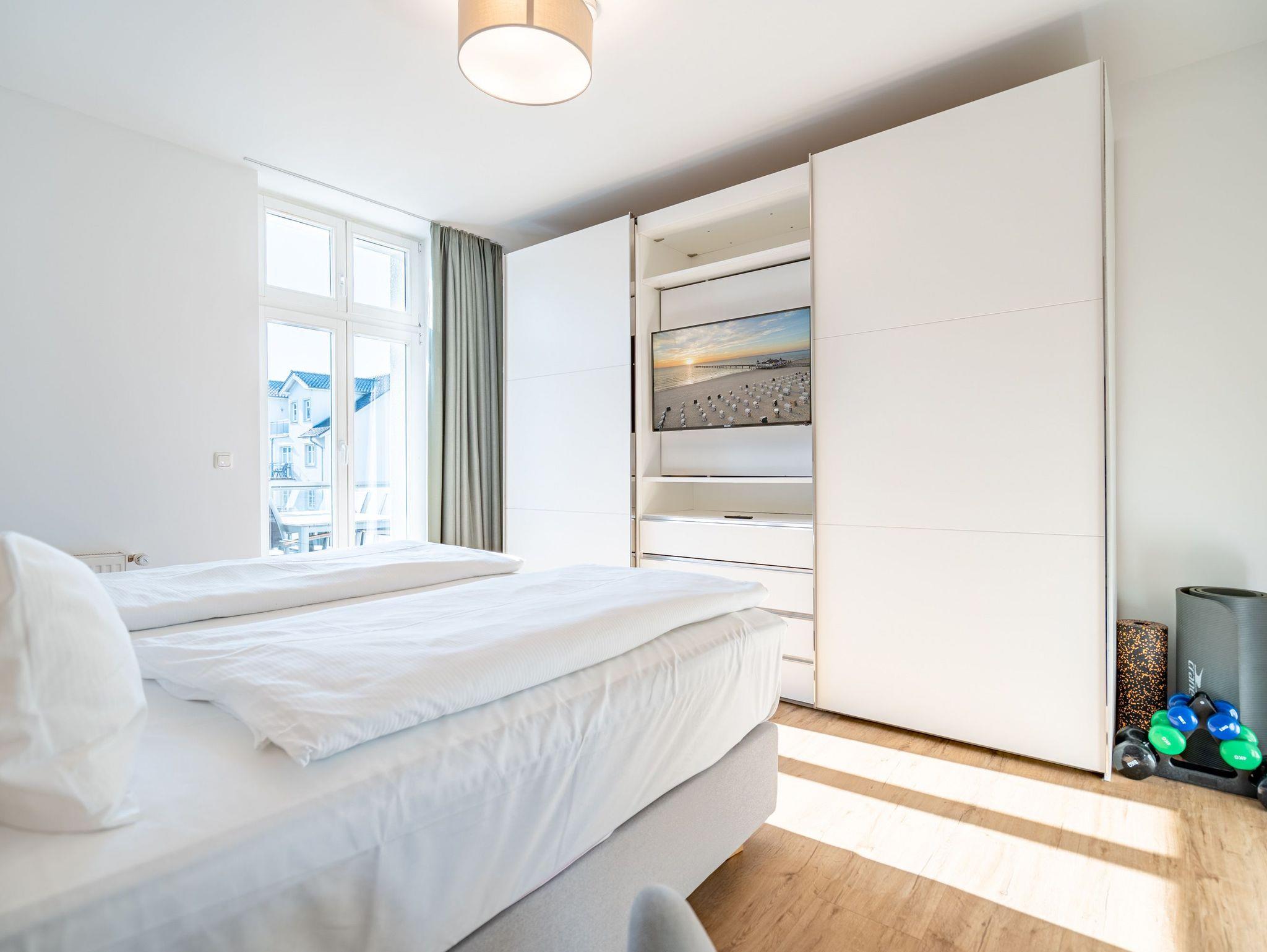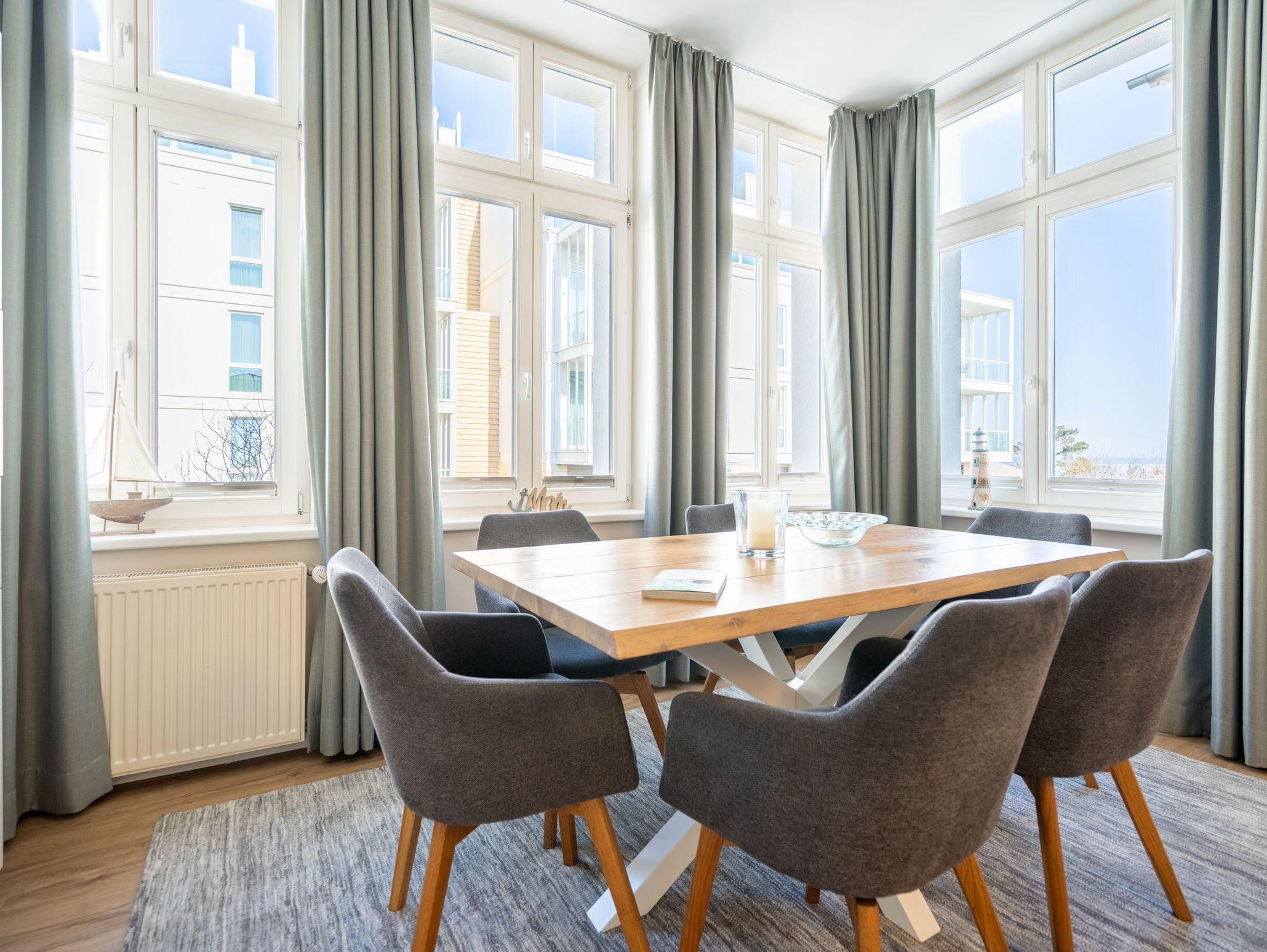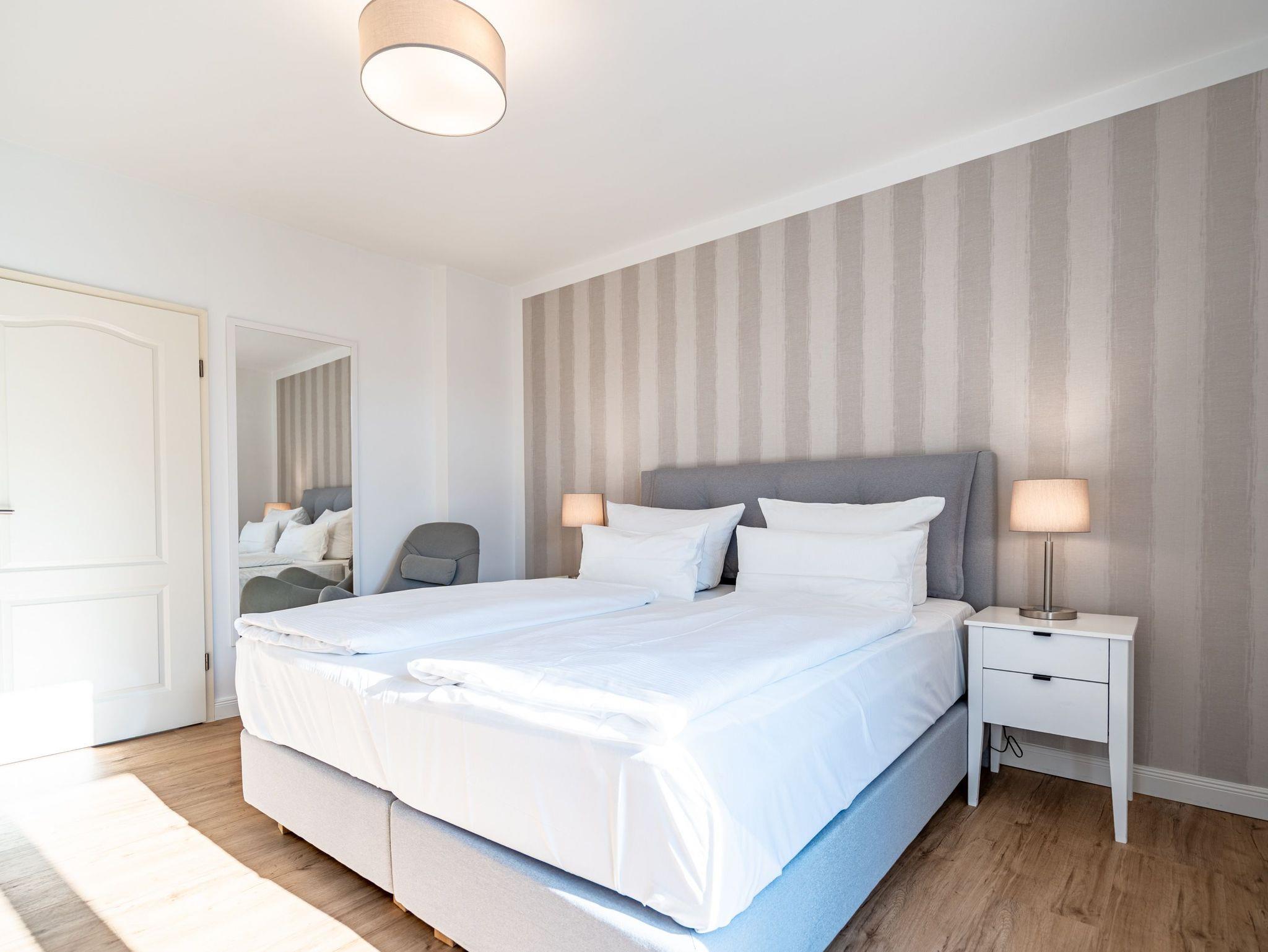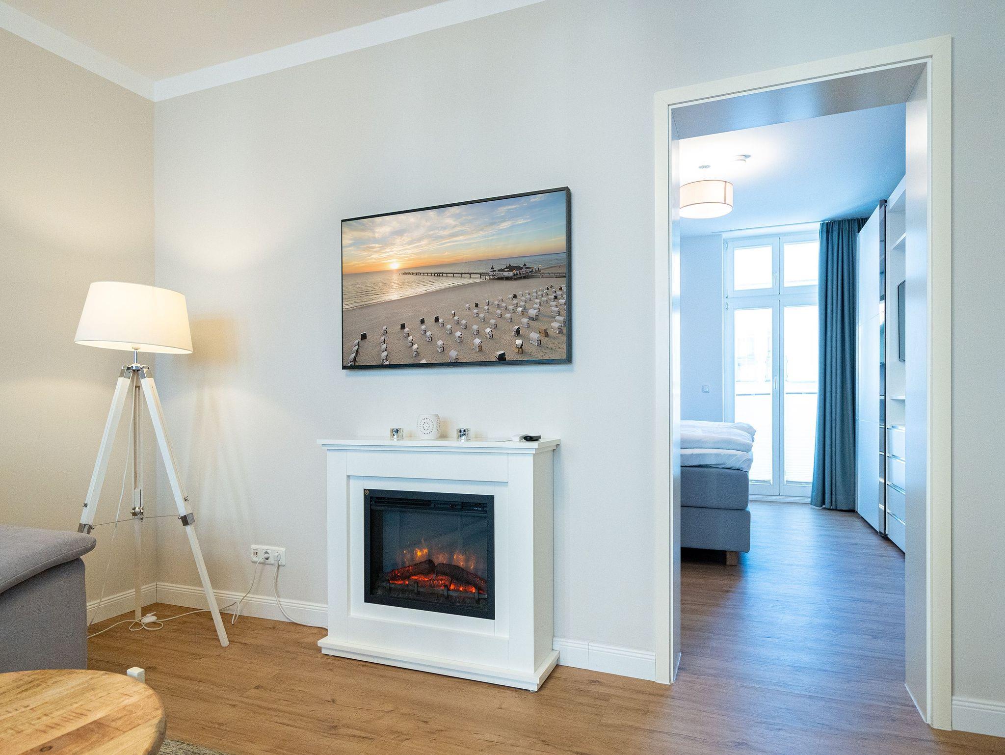 Herzlich Willkommen im Appartement 5 in der schönen Ostseevilla Erika. 2020 vollständig modernisiert und neu gestaltet, hält das geräumige 76qm große Feriendomizil im 1. OG Erholung und Wohlfühlatmosphäre für bis zu 5 Personen bereit. Ein maritimes Flair durchzieht den großzügigen Wohn-Essbereich. Die Usedomer Sonne flutet die angrenzende Veranda, die Platz für bis zu 6 Personen bietet. Genießen Sie von hier aus den seitlichen Blick auf das Meer und haben Sie das bunte Treiben der Strandpromenade sowie die Ostseewellen fest im Blick. Die komplett ausgestattete Küche ist in den Wohnbereich integriert. Neben Backofen, Ceranfeld, Spülmaschine, Mikrowelle, Kühlschrank mit Gefrierfach und Kleinküchengeräten dürfen sich Kaffeeliebhaber neben einer klassischen Kaffeemaschine auf eine zusätzliche Nespresso-Kapselmaschine freuen. Sollte die Küche doch einmal kalt bleiben, befinden sich in der nahe gelegenen Seestraße zahlreiche Restaurants und Einkaufsmöglichkeiten für einen ausgiebigen Shopping-Bummel. Die gemütliche Sitzlandschaft (elektrisch) im Wohnbereich bietet Platz für eine zusätzliche Aufbettung. Ein Elektro-Kamin sowie der 49-Zoll Flat-TV „The Frame“ und eine Bose-Soundanlage runden Ihre Urlaubsabende ab. Bei richtiger Windrichtung und geöffneten Fenstern sollte das Rauschen des Meeres ebenfalls bis in das Appartement 5 gelangen. Auf einen erholsamen Schlaf müssen Sie auch in Ihrem Urlaub nicht verzichten, da beide Schlafzimmer mit bequemen Boxspringbetten (1,80m x 2,00m) und Flat-TVs ausgestattet sind. Ein kleiner Balkon (5,4qm) mit östlicher Ausrichtung befindet sich ebenfalls an einem der Schlafräume. Die Morgensonne sowie ein Tisch mit vier Stühlen verspricht einen guten Start in den Tag. Ein absolutes Highlight ist die Finnische Sauna für bis zu 4 Personen, die ebenfalls von einem der Schlafzimmer zu betreten ist und an kühlen Tagen wohlige Wärme versprüht. Freuen Sie sich darüber hinaus auf eine kleine Fitnessecke mit Yogamatte, Faszienrolle und Hanteln. Das Badezimmer mit Regendusche, Waschtisch und WC wurde ebenfalls rundum erneuert und bietet durch den großzügigen Schnitt ausreichend Platz für Sie und Ihre Urlaubsbegleitung. Ein Stellplatz in der hauseigenen Tiefgarage ist mit der Nr. 14 gekennzeichnet. Für Ihren Fahrradurlaub gibt es einen Fahrradständer am Haus sowie einen Gemeinschaftsraum. Ihre Vierbeiner sind in diesem Appartement herzlich willkommen. Bei Ihrer Anreise sind die Betten bereits bezogen und Handtücher liegen für Sie bereit. Kostenfreies WLAN rundet Ihren Usedomurlaub ab.